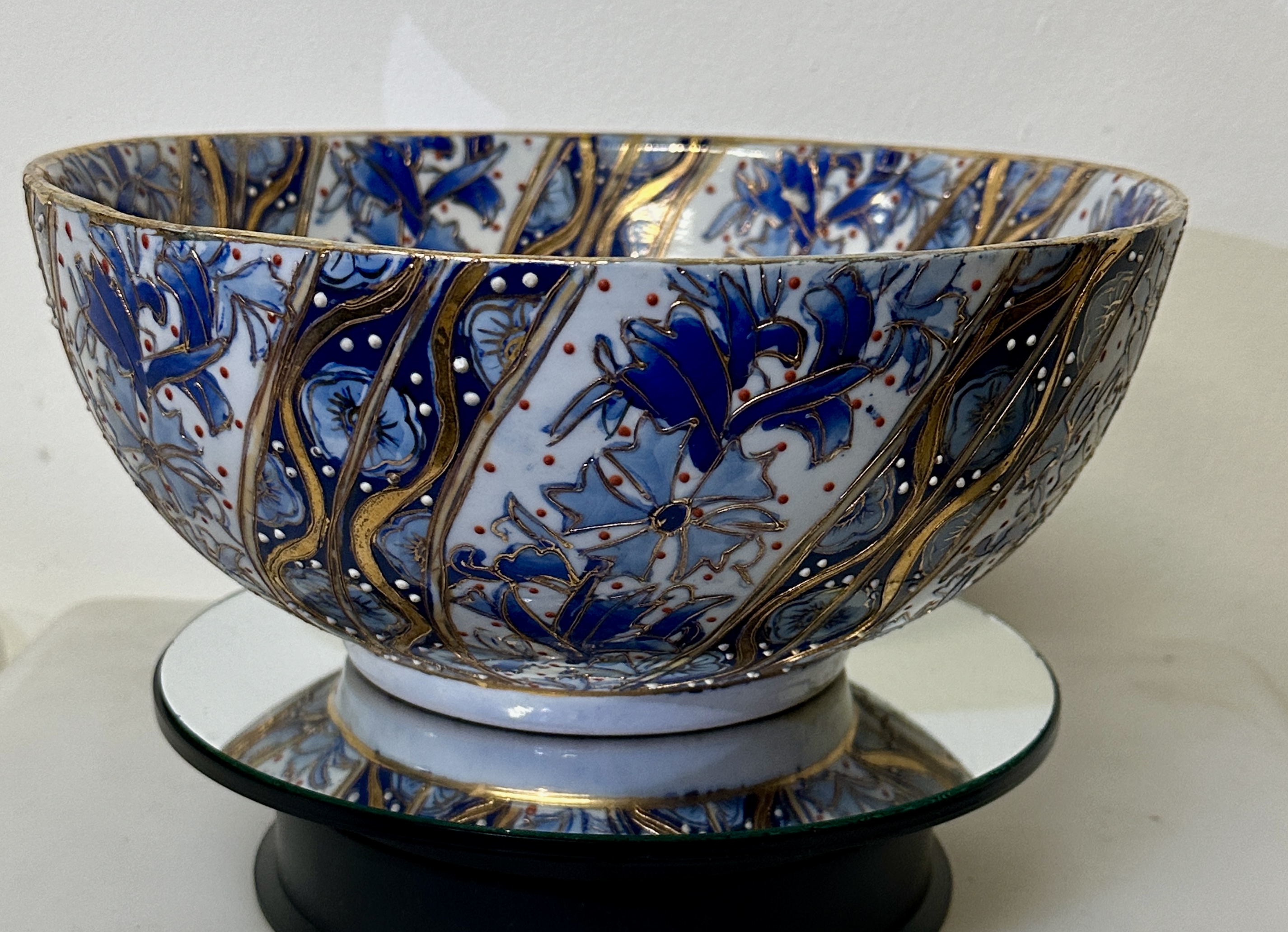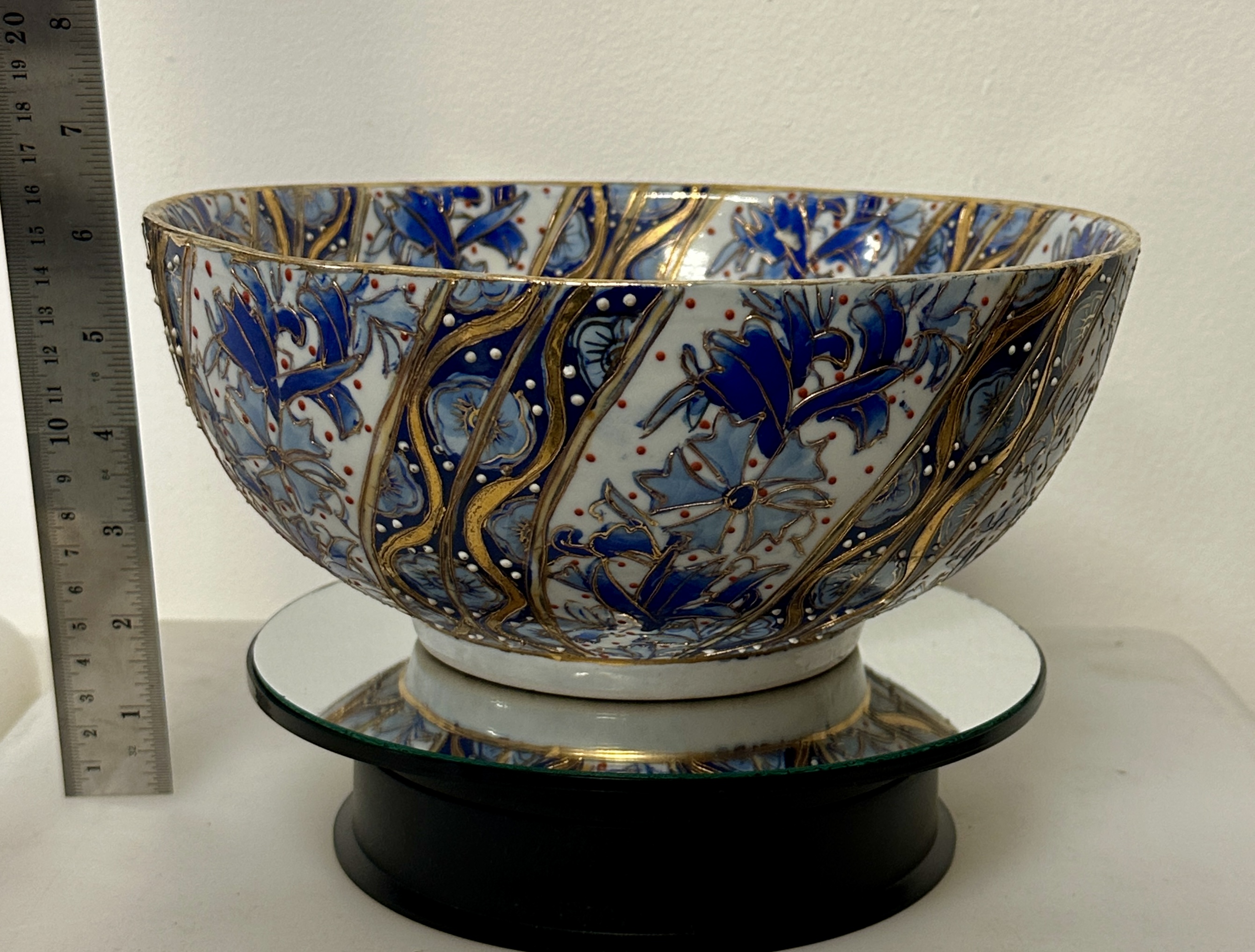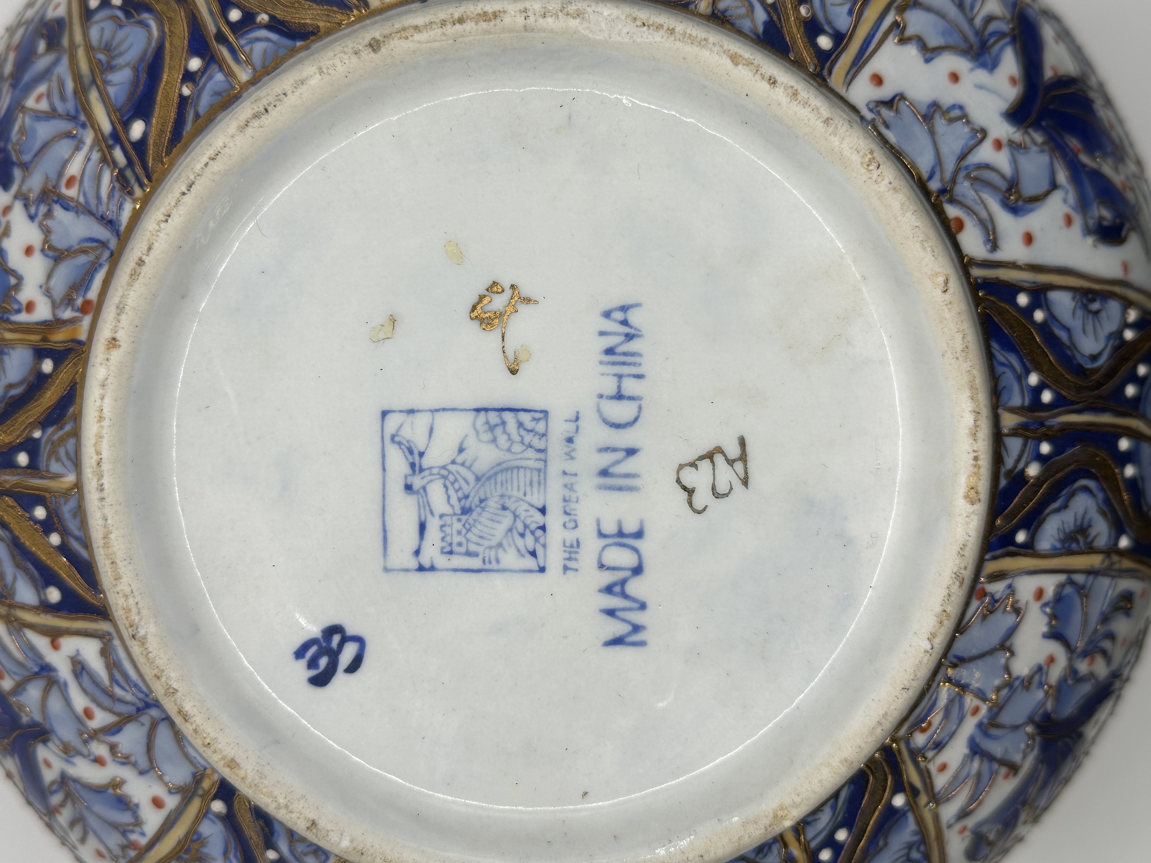 A Late 20th Century Chinese Royal Satsuma style porcelain decorative bowl, featuring an ornate and vibrant polychrome decoration. The exterior and interior are extensively adorned with flowing, dark and light blue floral and foliate motifs, highlighted by elaborate gold gilding and numerous small red and white raised dots against a white ground. The decorative style combines elements reminiscent of traditional Chinese porcelain with a rich, Art Nouveau-like embellishment. The underside bears an underglaze blue mark, which includes a rectangular image of “THE GREAT WALL” above the text “MADE IN CHINA,” along with additional, smaller blue symbols or characters.