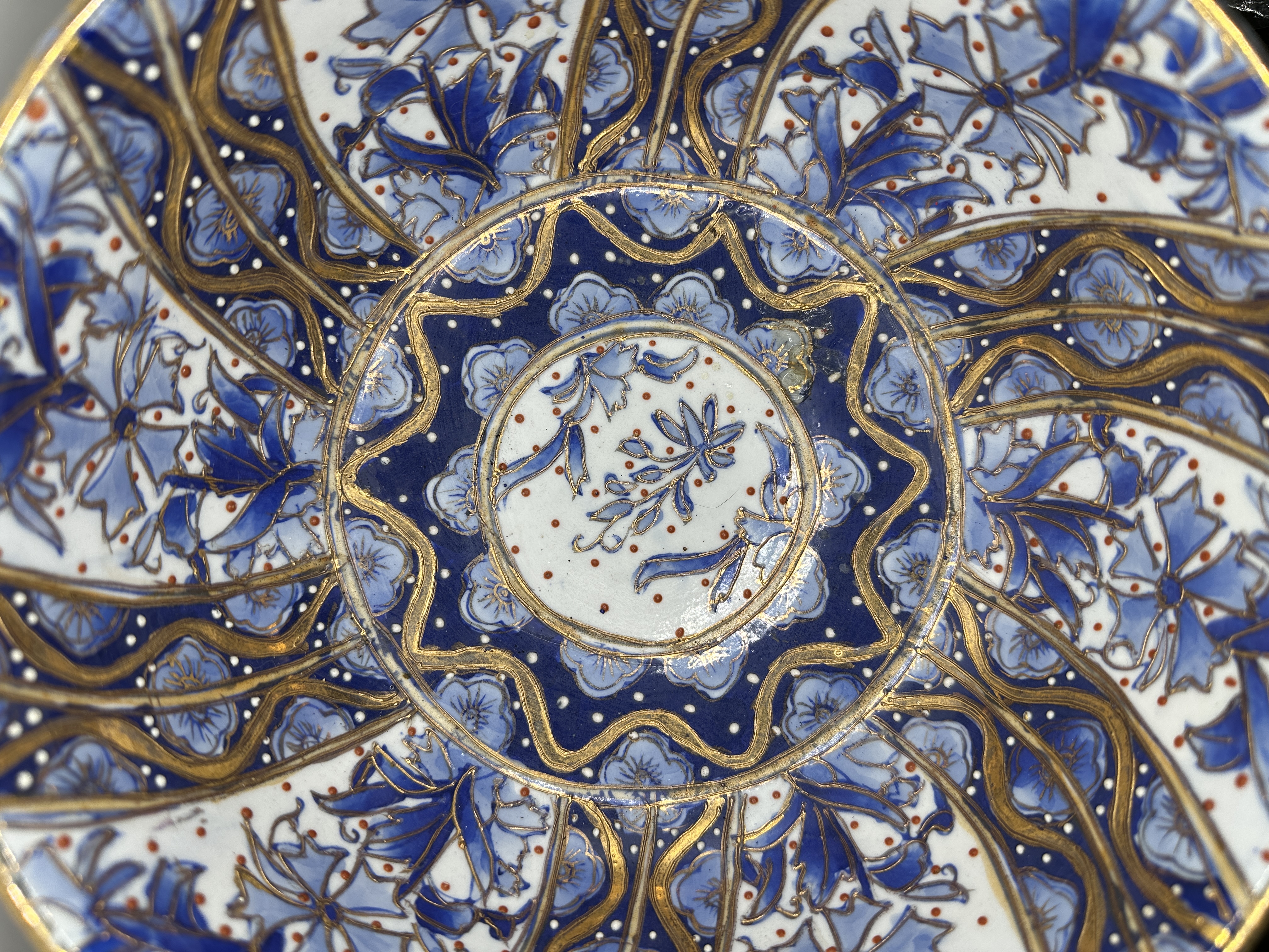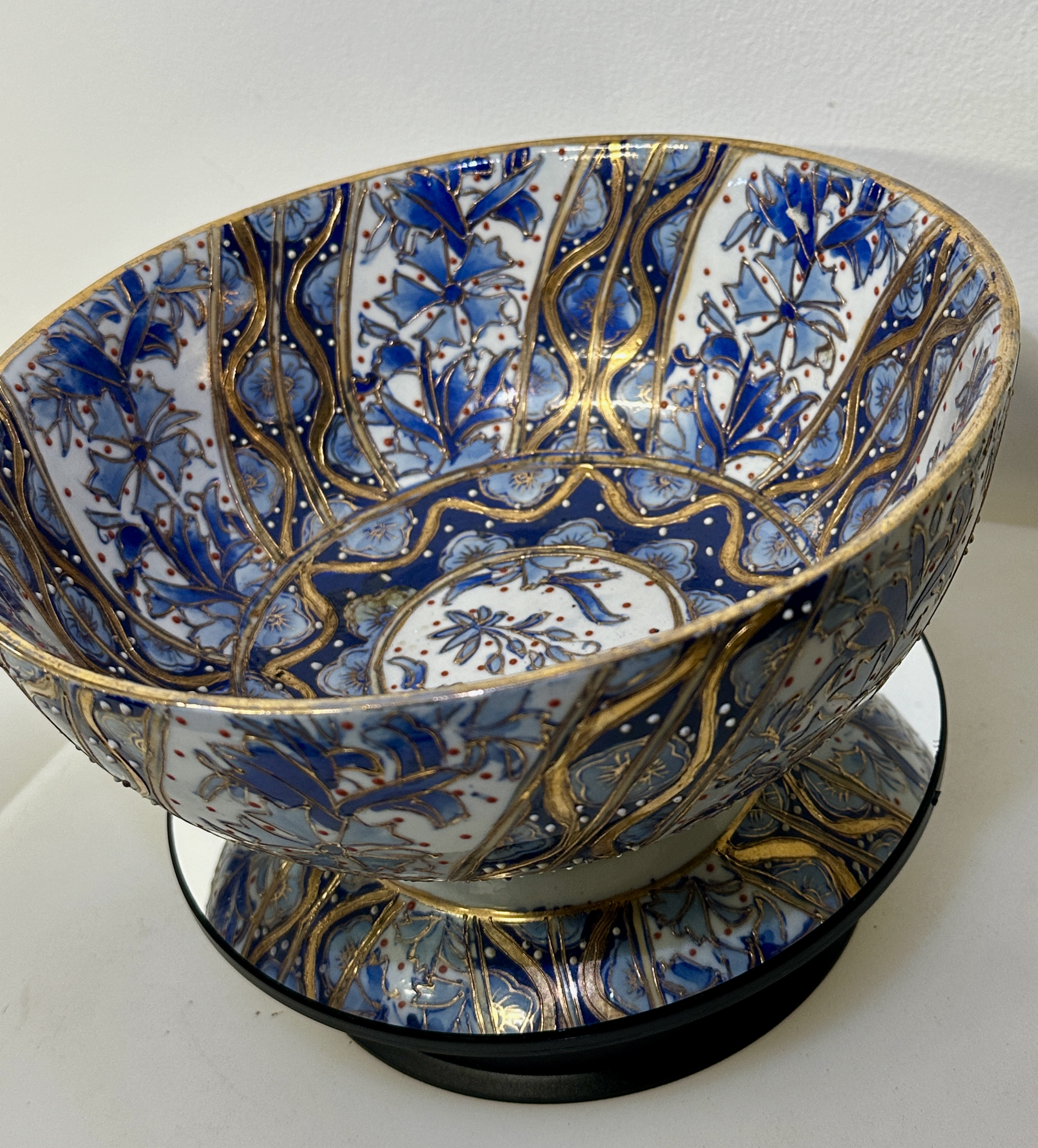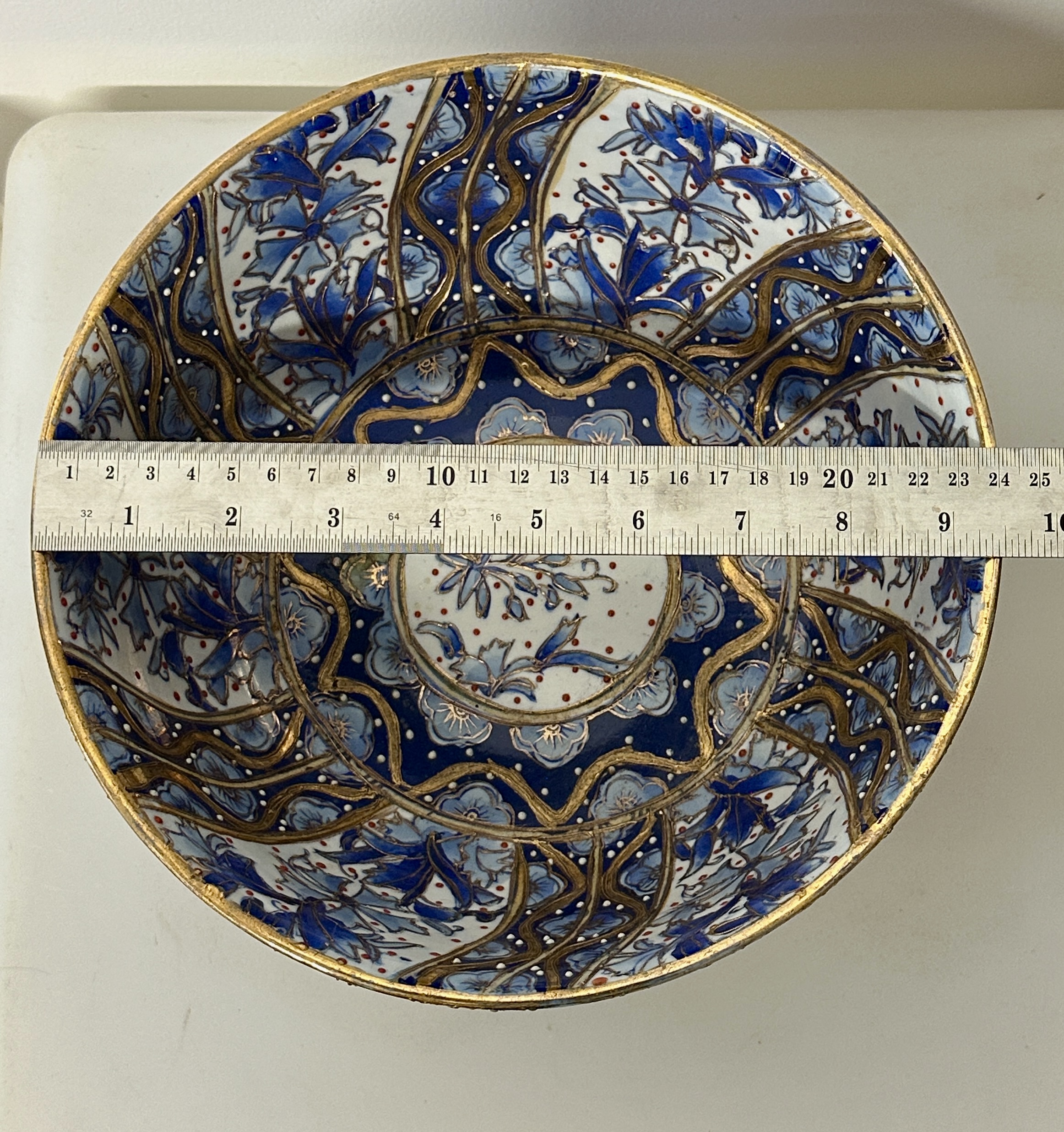 A Late 20th Century Chinese Royal Satsuma style porcelain decorative bowl, featuring an ornate and vibrant polychrome decoration. The exterior and interior are extensively adorned with flowing, dark and light blue floral and foliate motifs, highlighted by elaborate gold gilding and numerous small red and white raised dots against a white ground. The decorative style combines elements reminiscent of traditional Chinese porcelain with a rich, Art Nouveau-like embellishment. The underside bears an underglaze blue mark, which includes a rectangular image of “THE GREAT WALL” above the text “MADE IN CHINA,” along with additional, smaller blue symbols or characters.