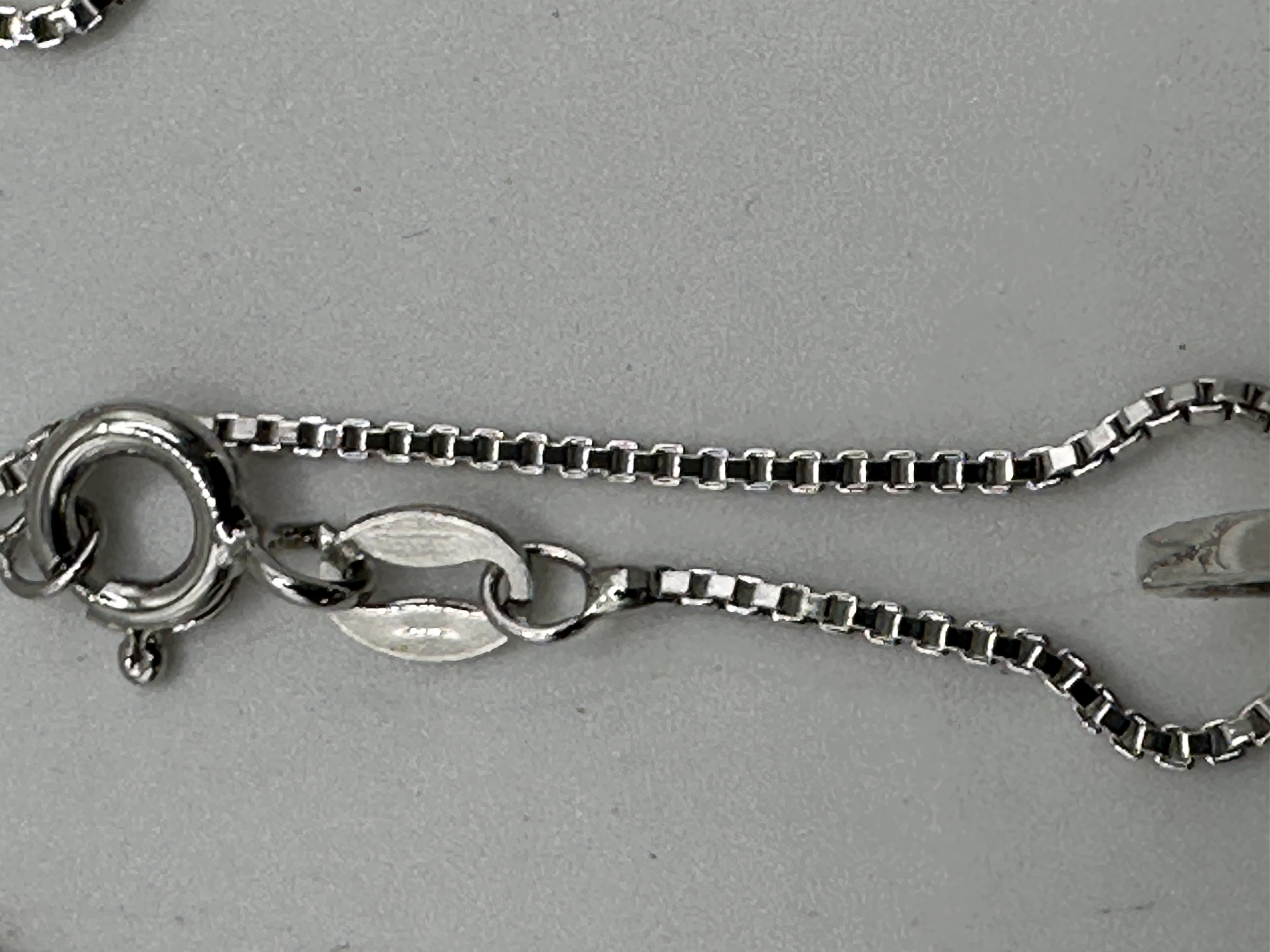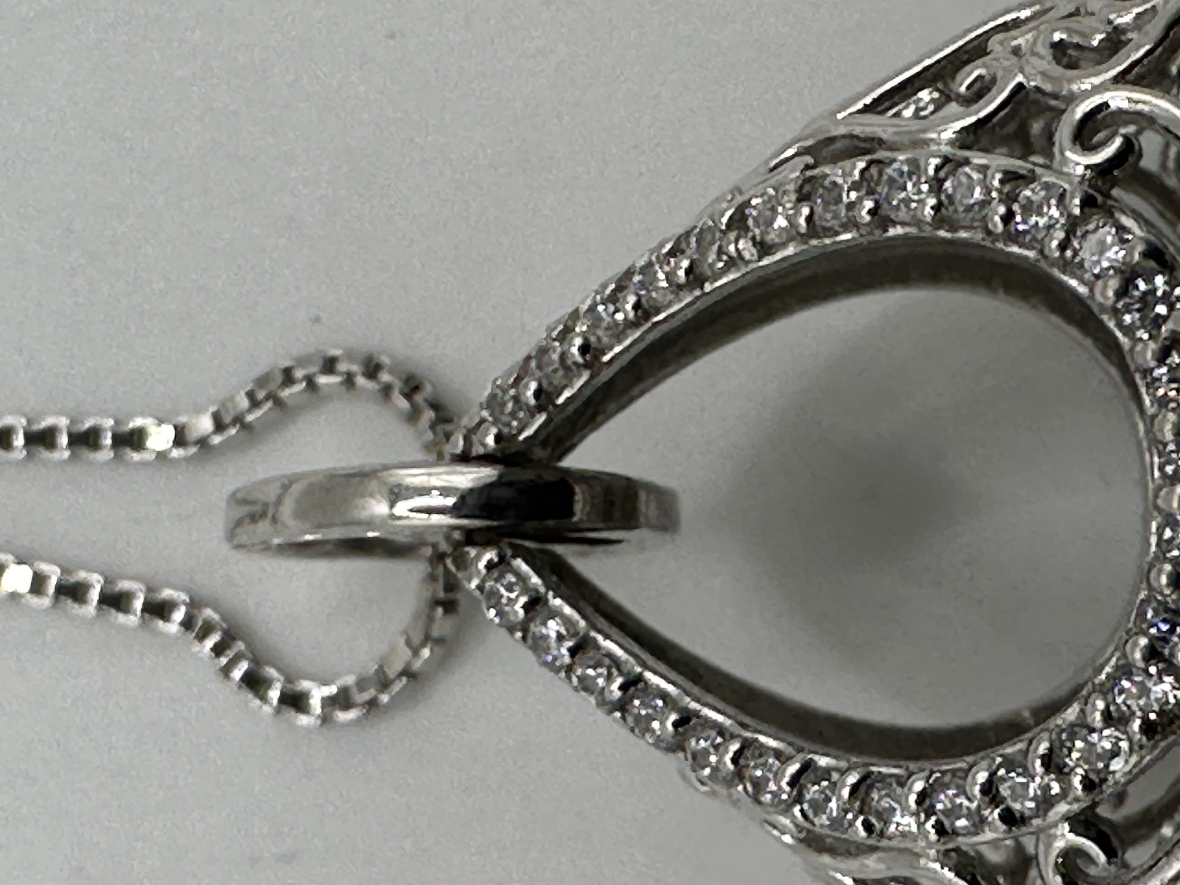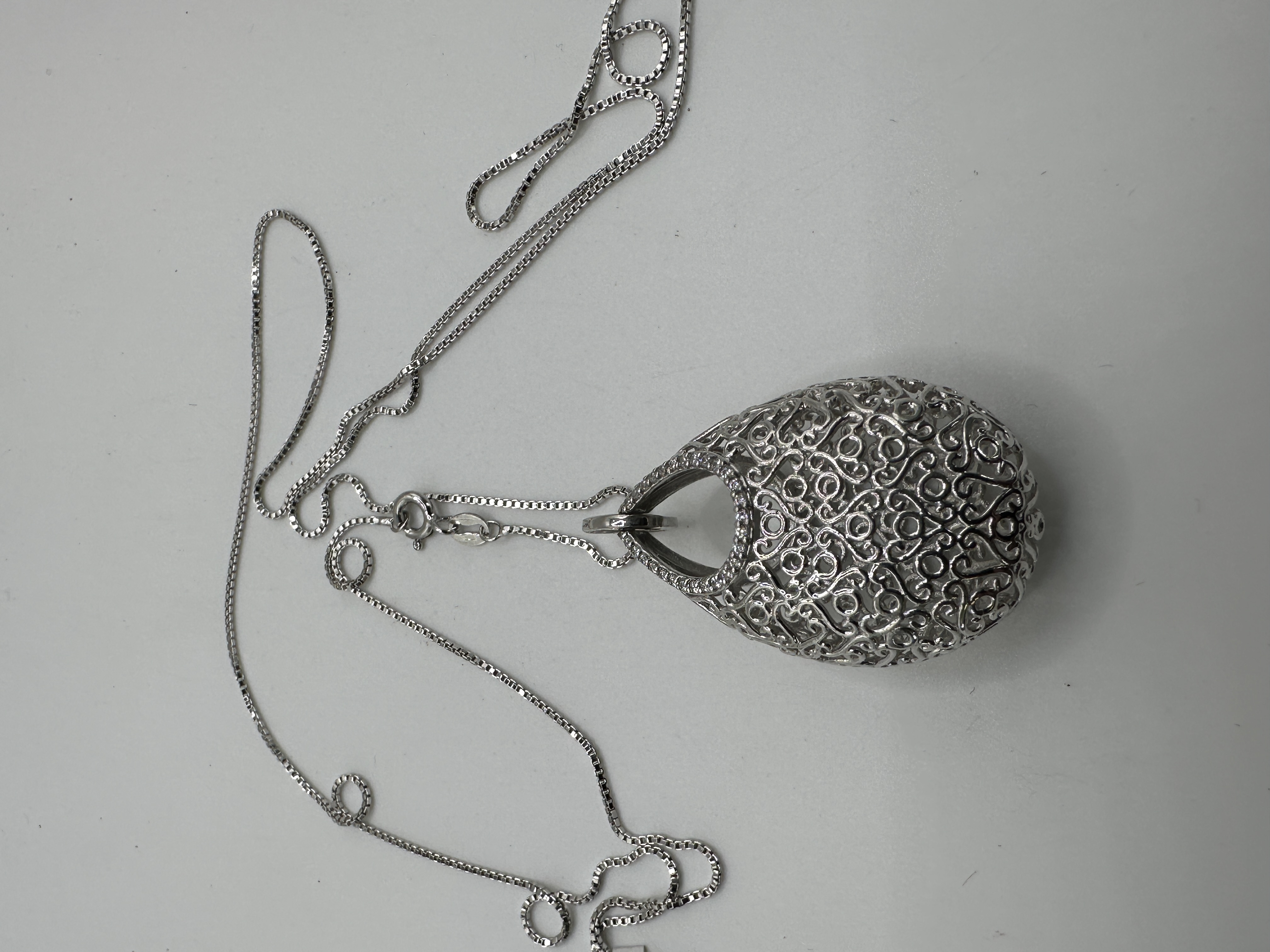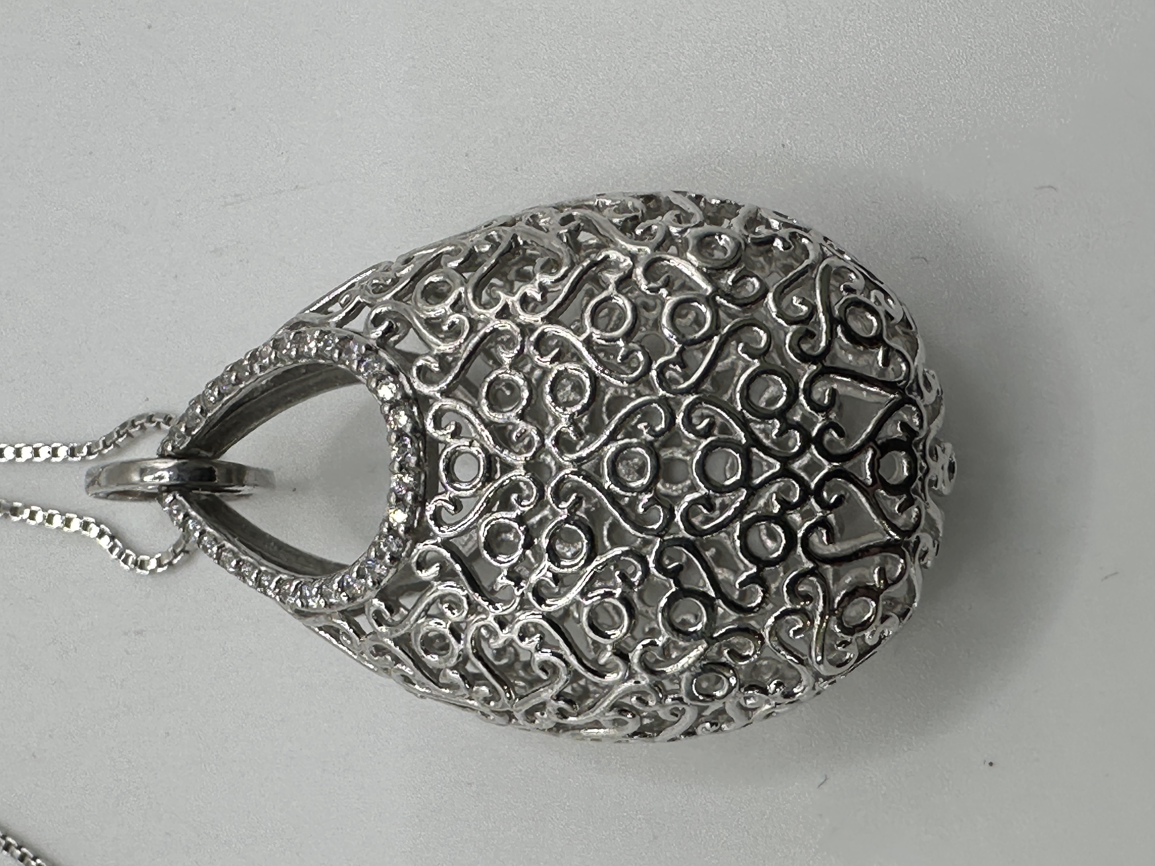 A Brighton Mumtaz Teardrop Crystal Silvertone Necklace, comprising a silver-toned metal chain and a large, teardrop-shaped pendant. The hollow pendant features an intricate openwork filigree design of repeating scrolls and stylized heart motifs, with the upper arch adorned by small, pave-set round colorless stones. The chain is a slender box-link style, secured by a spring-ring clasp, and includes an attached oval tag marked “ITALY” and “925”.