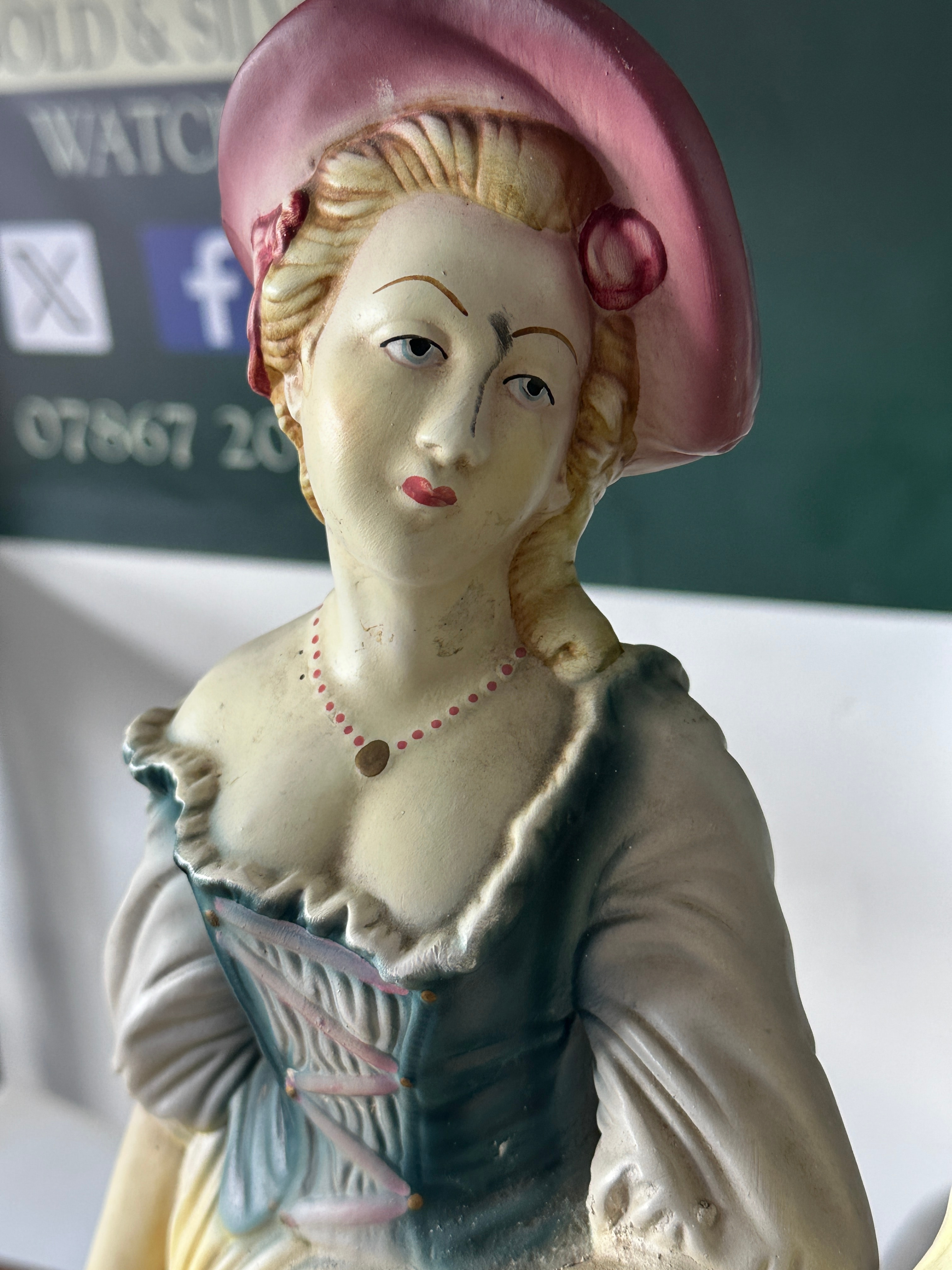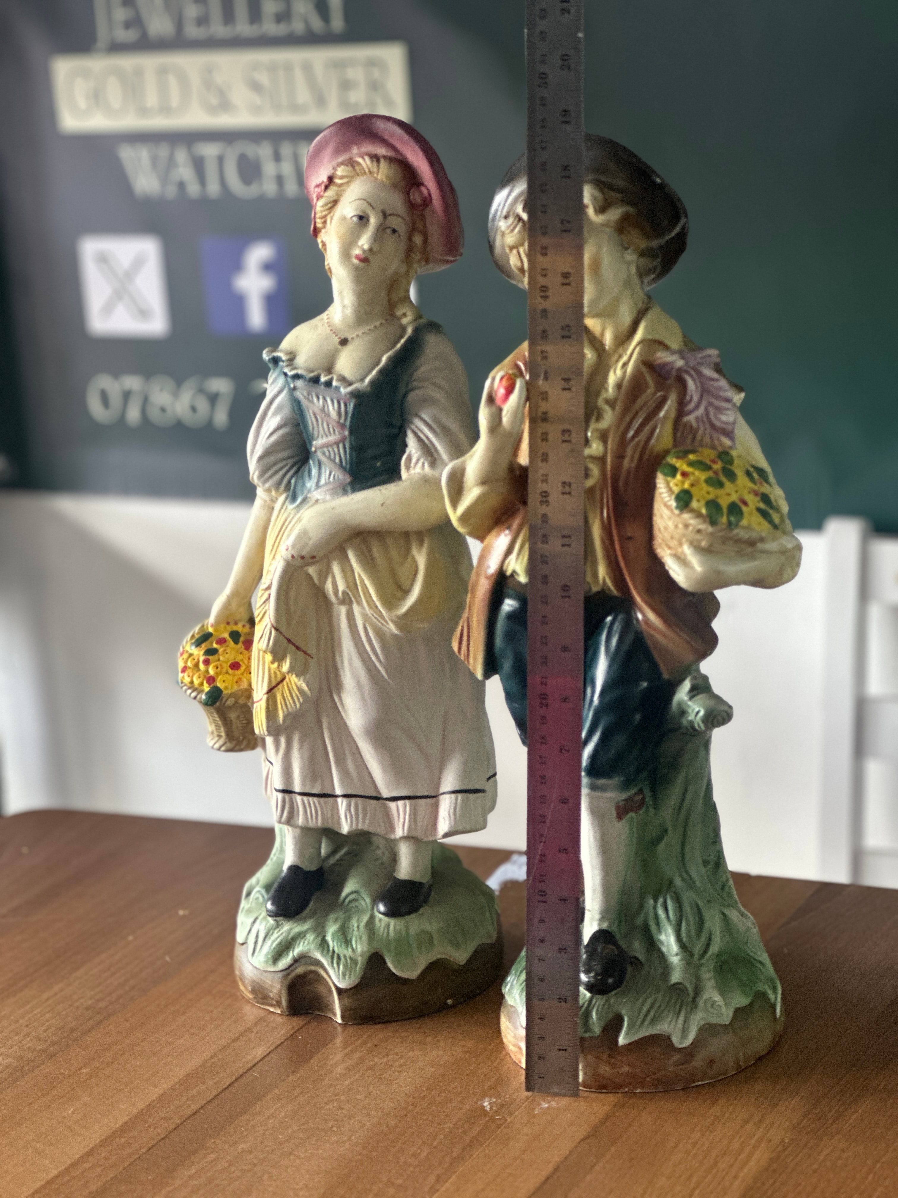 A pair of Andrea by Sadek Colonial-style painted ceramic figurines, each depicting a standing figure in 18th-century Rococo-inspired costume. The female figure wears a pink hat, a blue corset over a white and yellow dress, and holds a basket of yellow flowers. The male figure is similarly attired in a brown hat, yellow ruffled shirt, brown jacket, and blue breeches, holding a red fruit and a basket of yellow flowers. Both figures are mounted on green, textured bases. No manufacturer’s marks or specific text are discernible on the items themselves.