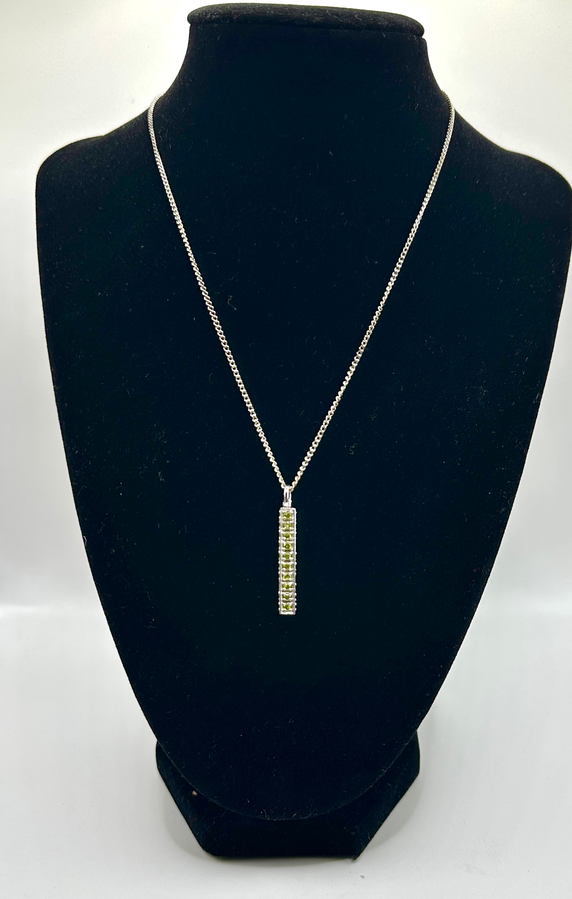 A modern necklace featuring a slender, vertically-oriented bar pendant suspended from a fine, silver-toned link chain. The pendant is crafted from a matching silver-toned metal and is adorned on its visible faces with multiple small, square-cut stones of a uniform light green or chartreuse color, possibly peridot or a simulant, set closely in rows. No discernible text or markings are visible on the piece.