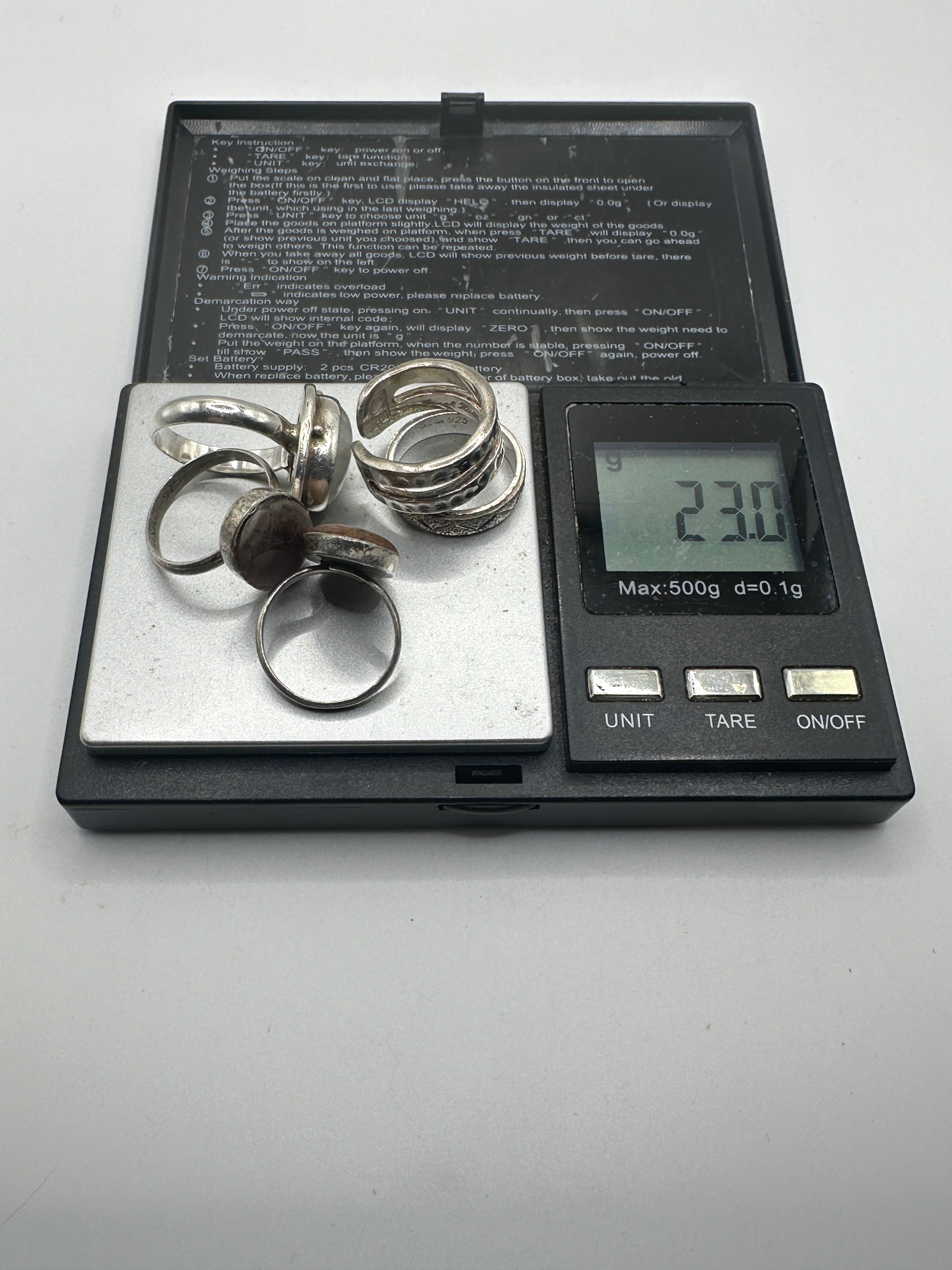 The rings collectively weigh 23.0 grams.