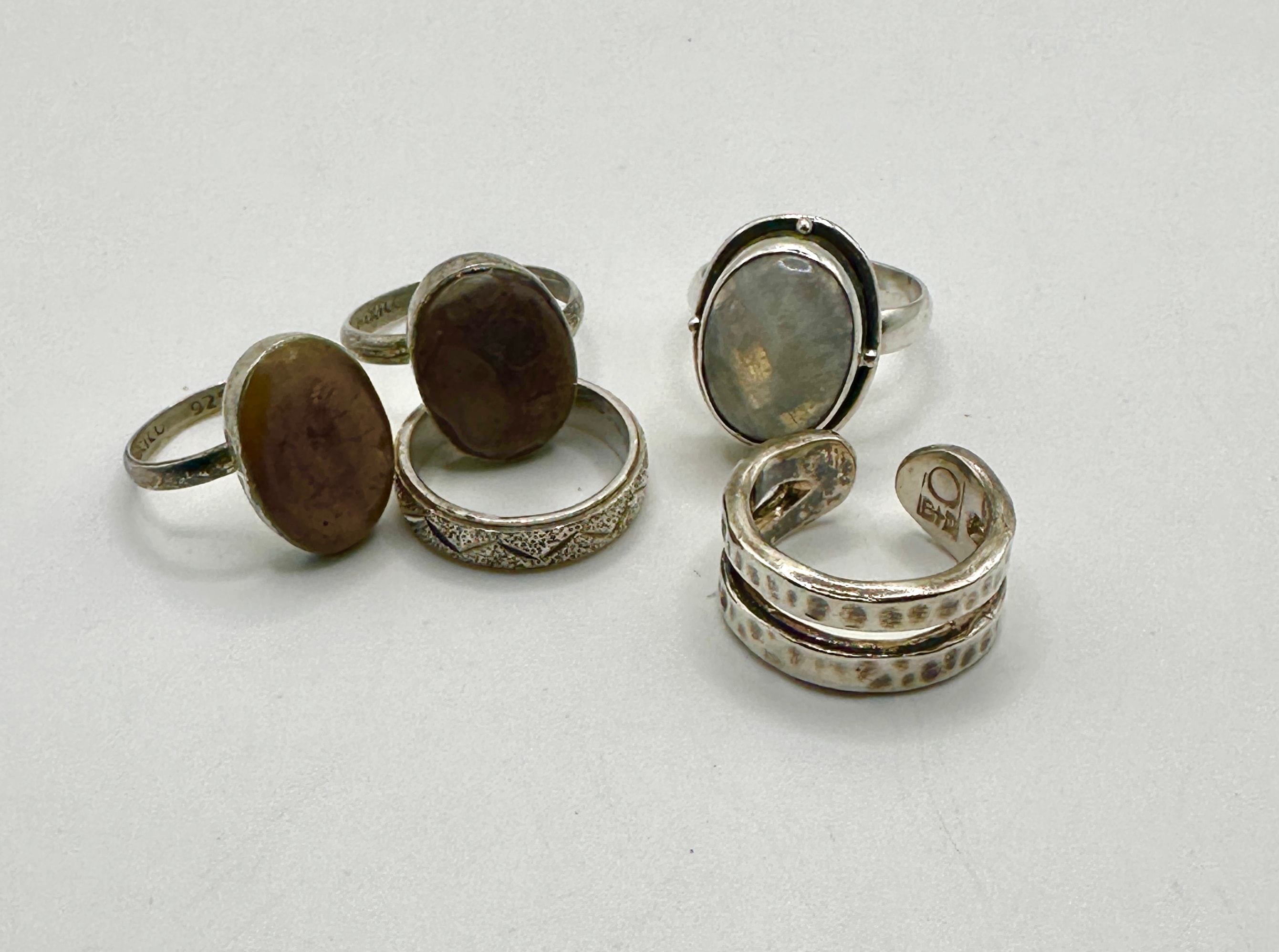 A group of five assorted rings, predominantly crafted from silver-toned metal. One ring is visibly stamped “K & C 925,” indicating sterling silver. The collection includes one large oval cabochon ring exhibiting adularescence, two smaller rings each set with a dark brown oval cabochon, one wide band with an intricate textured pattern, and one adjustable double-band cuff-style ring with a hammered finish and an indistinct maker’s mark.