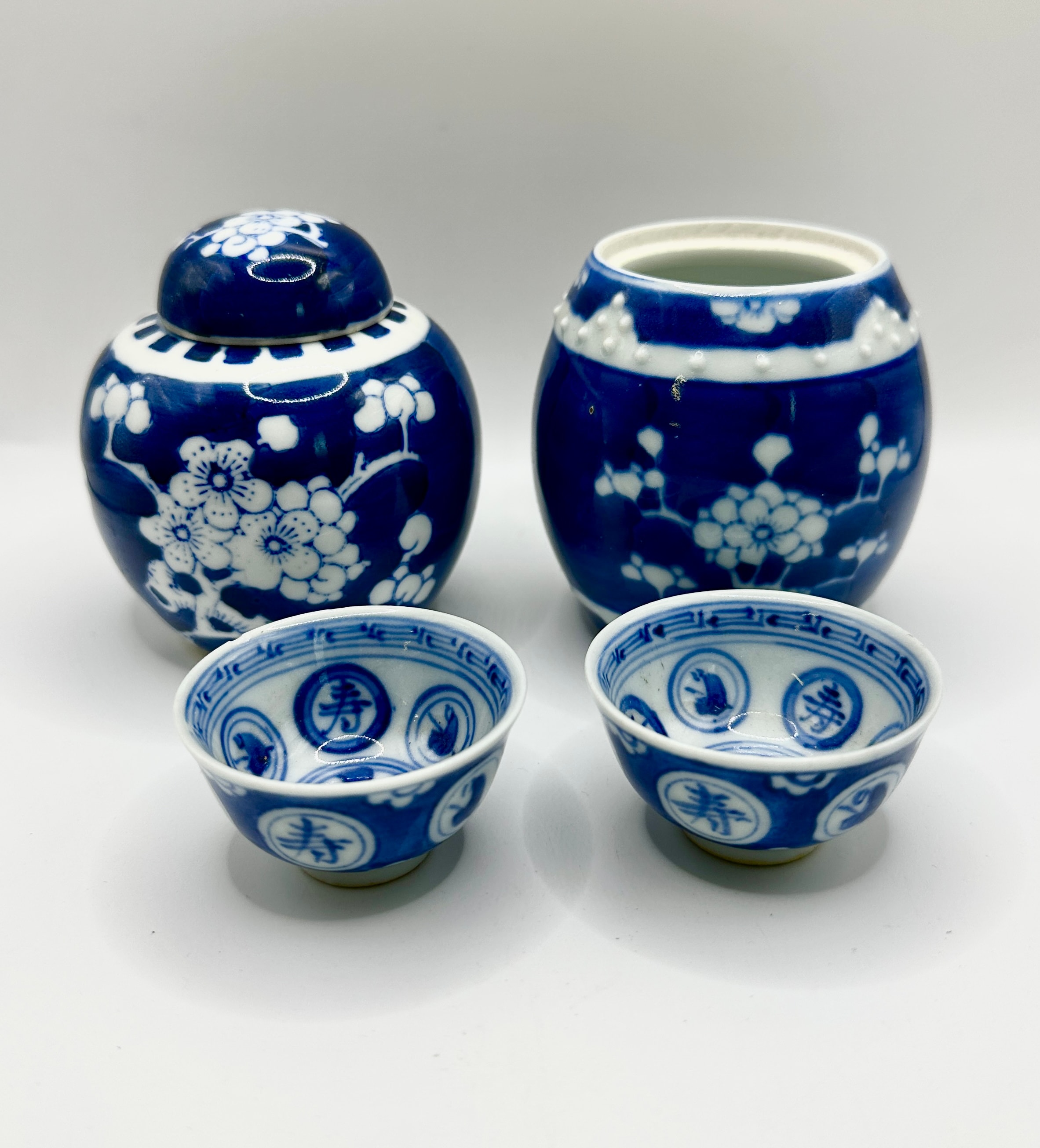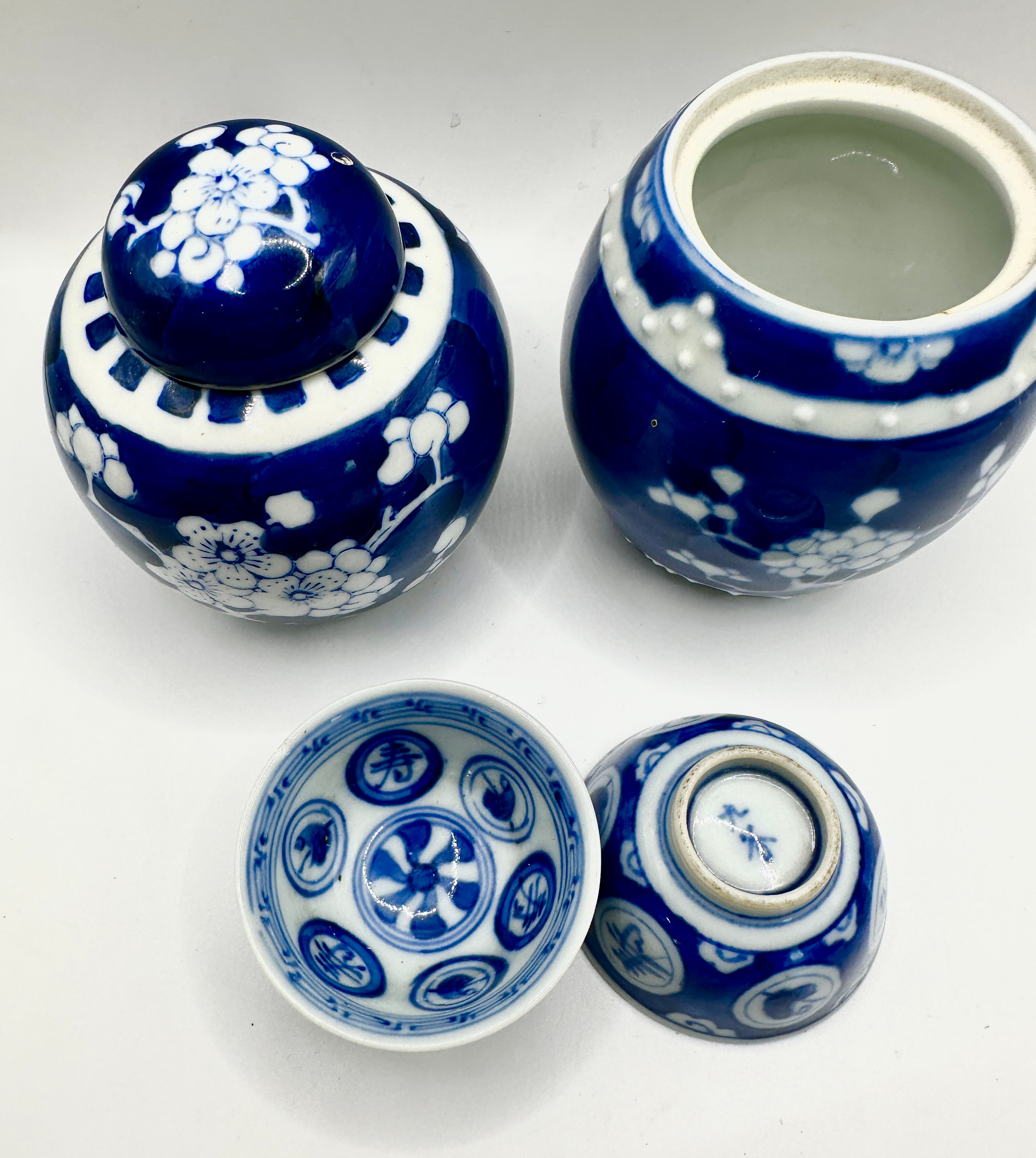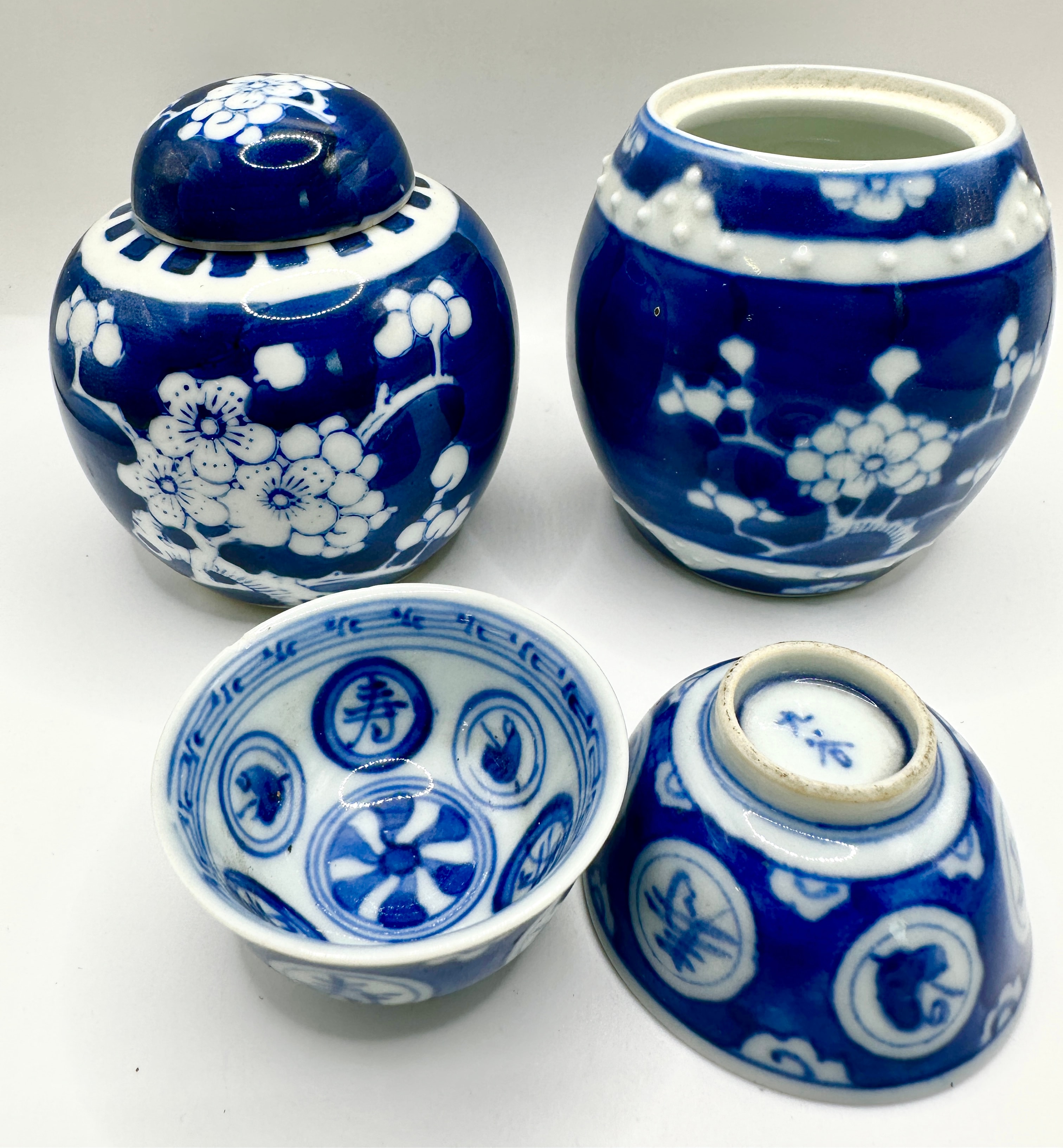 A group of four Chinese blue and white porcelain items, comprising a lidded ginger jar and an open jar, both decorated with white prunus blossoms on a dark blue ground. The open jar additionally features raised white dots. Accompanying these are two small bowls, each with a white ground and blue decoration, including circular medallions prominently displaying the Chinese character “壽” (Shòu), signifying longevity. The inverted base of one bowl reveals a visible blue four-character mark.