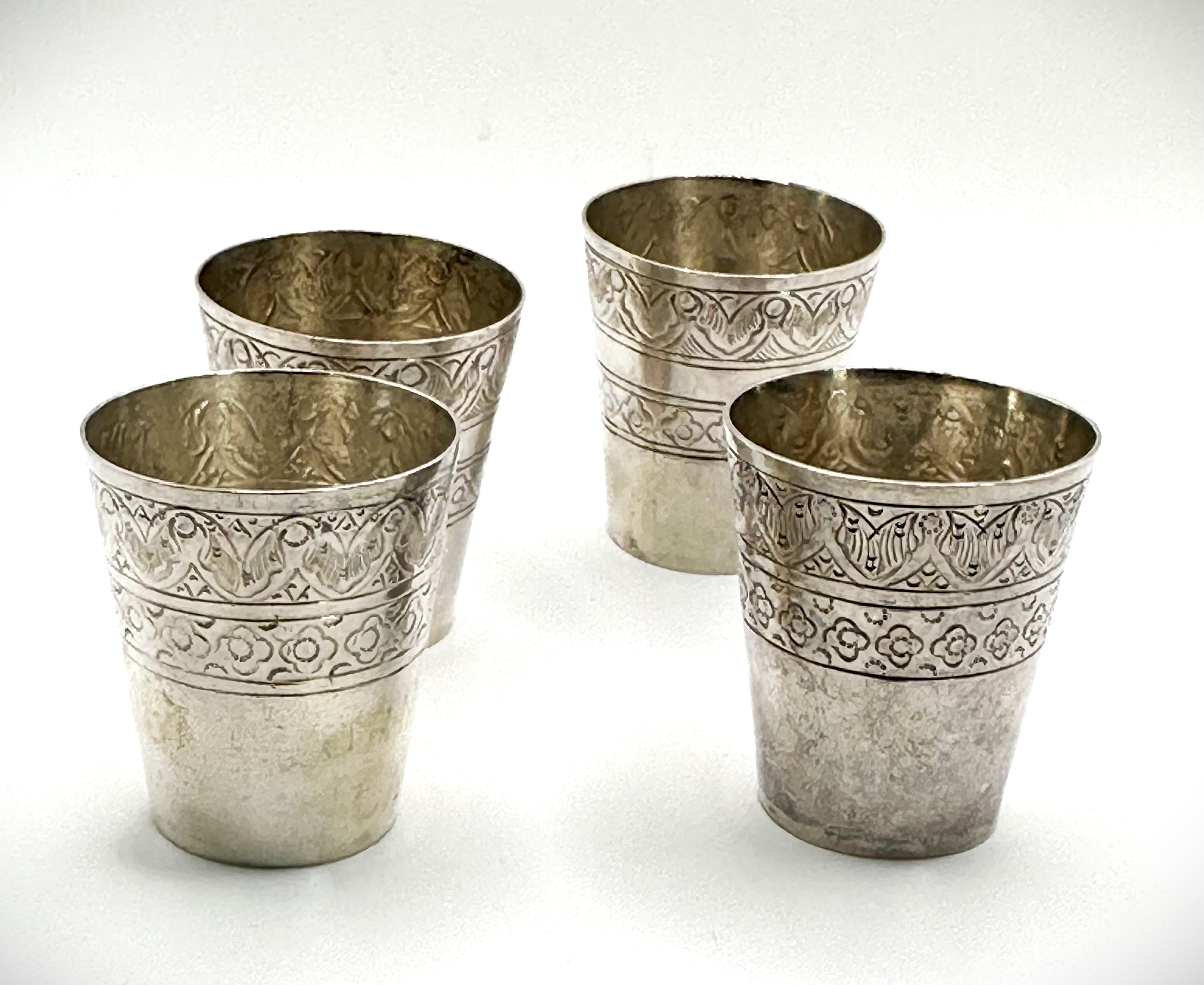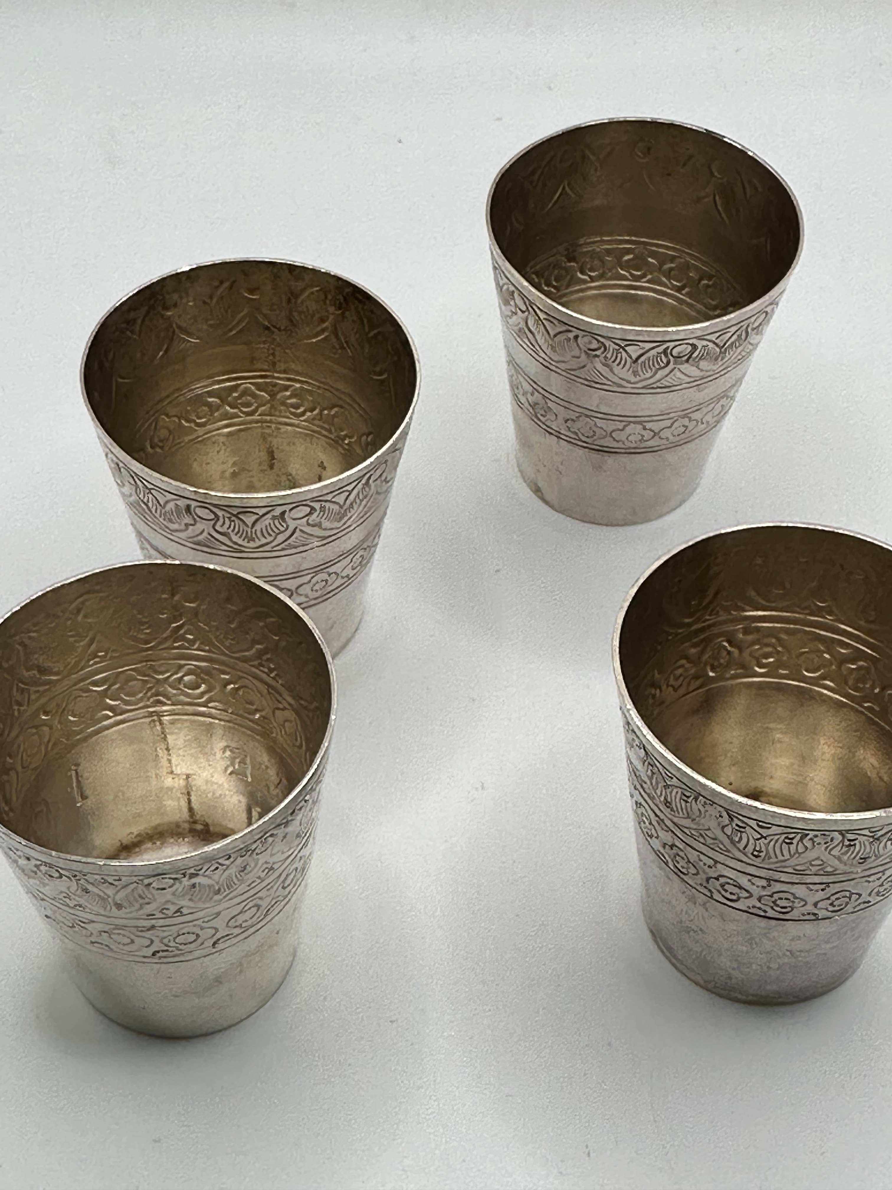 A set of four antique engraved cups, presented in a Middle Eastern or Central Asian style. Each tapered metallic drinking vessel is crafted from silver, exhibiting a tarnished, silver-toned appearance consistent with age. They are adorned with two distinct bands of finely engraved or chased ornamentation: an upper band displaying an intricate, repeating scroll or foliate motif, and a lower band featuring a simpler, repeating geometric or stylized floral pattern. No visible hallmarks or text are discernible.