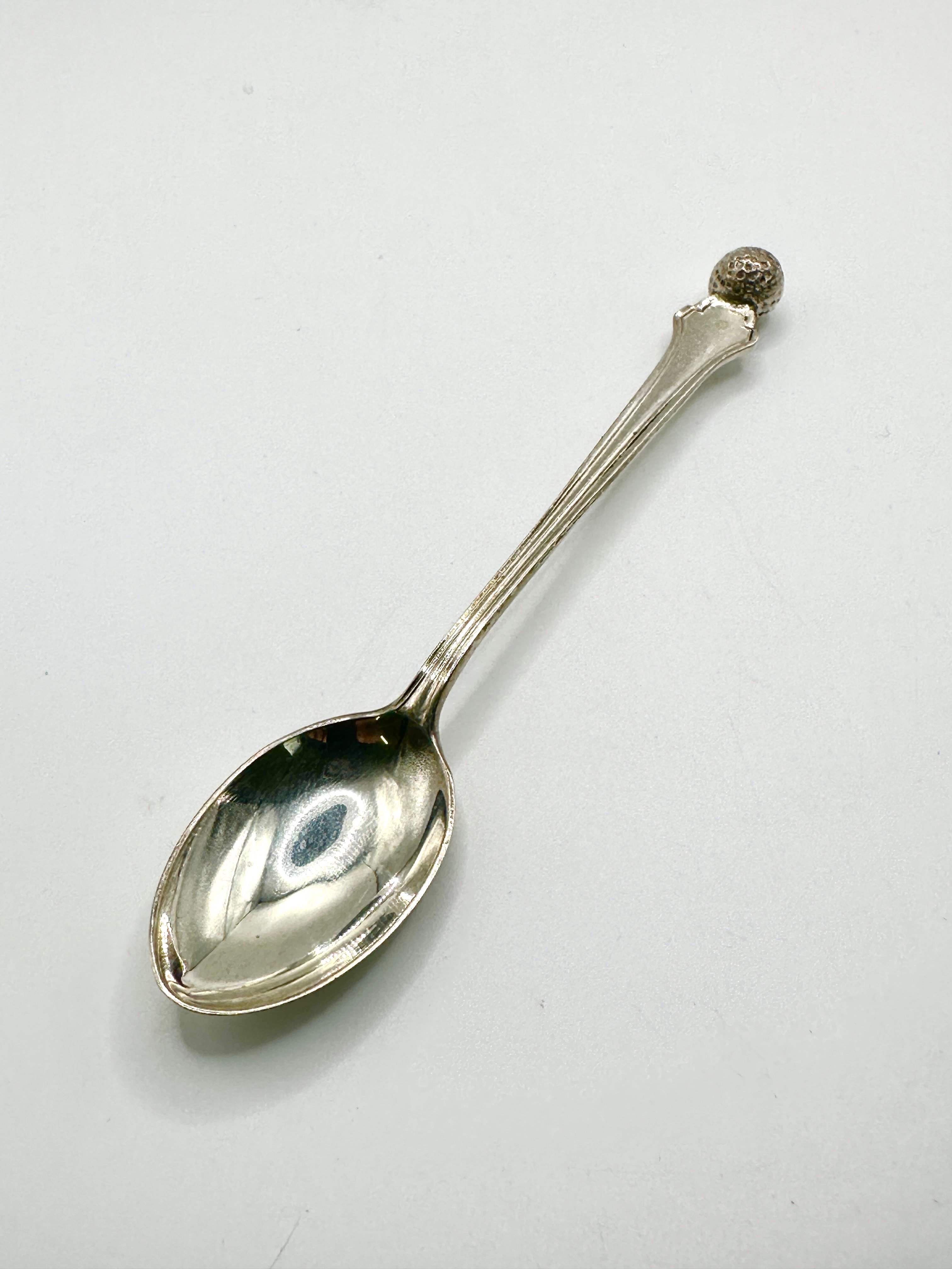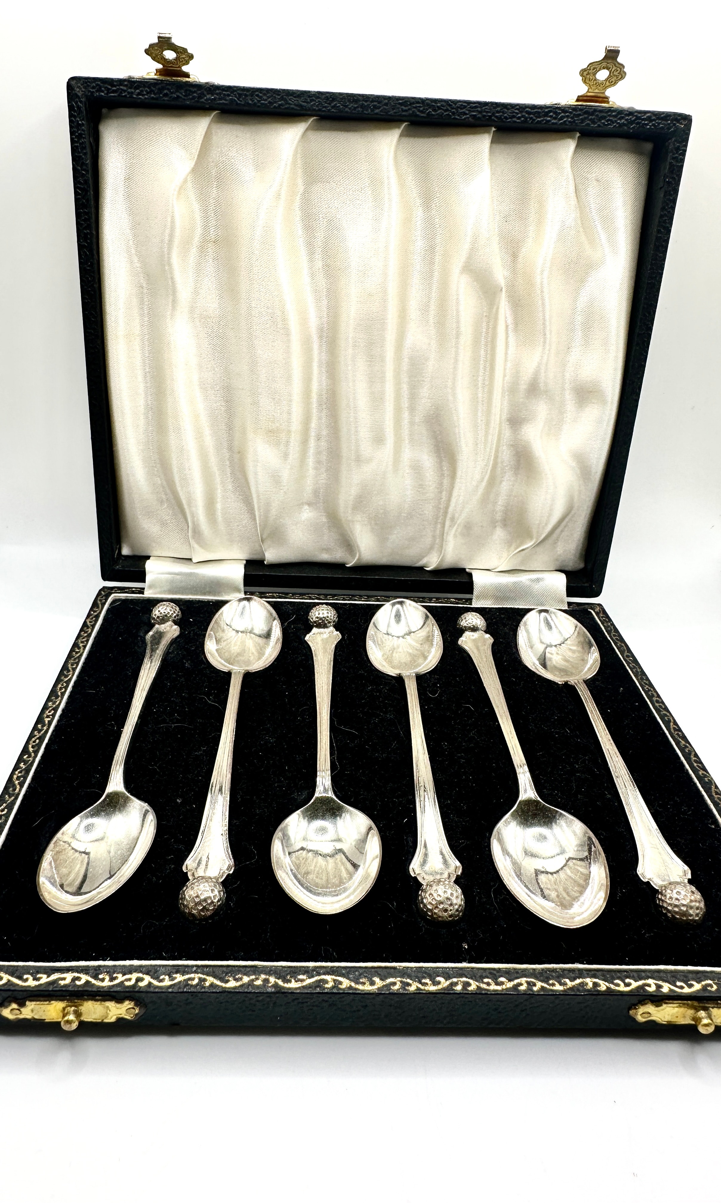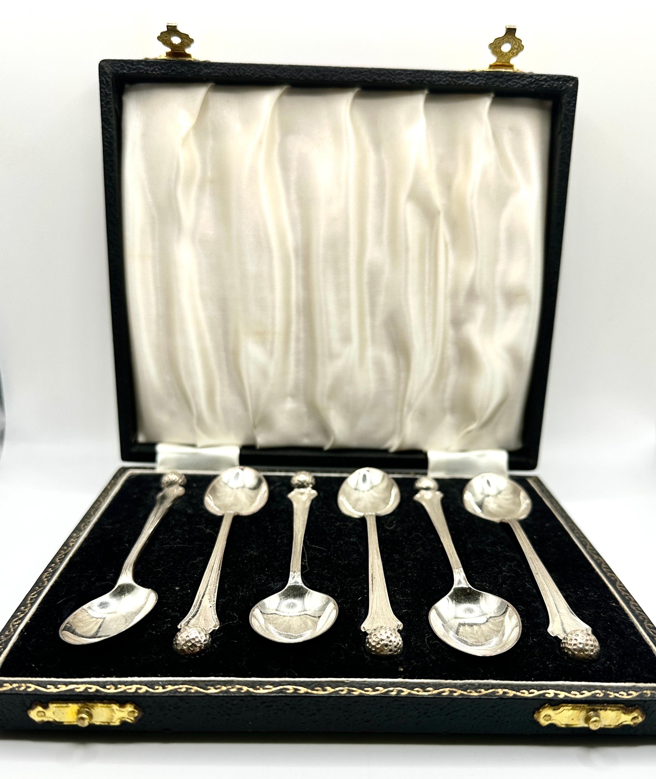 A cased set of six sterling silver coffee spoons, assayed in Birmingham with the date letter ‘c’ for 1952/53, and bearing the maker’s mark ‘BB & S’ (Barker Brothers Silver Ltd.). Each spoon features an oval bowl, a shaped handle, and a spherical, textured finial. The set is presented in a black, textured case with gold-colored decorative tooling and brass-toned clasps, opening to a black velvet base and a white ruched satin-lined lid.