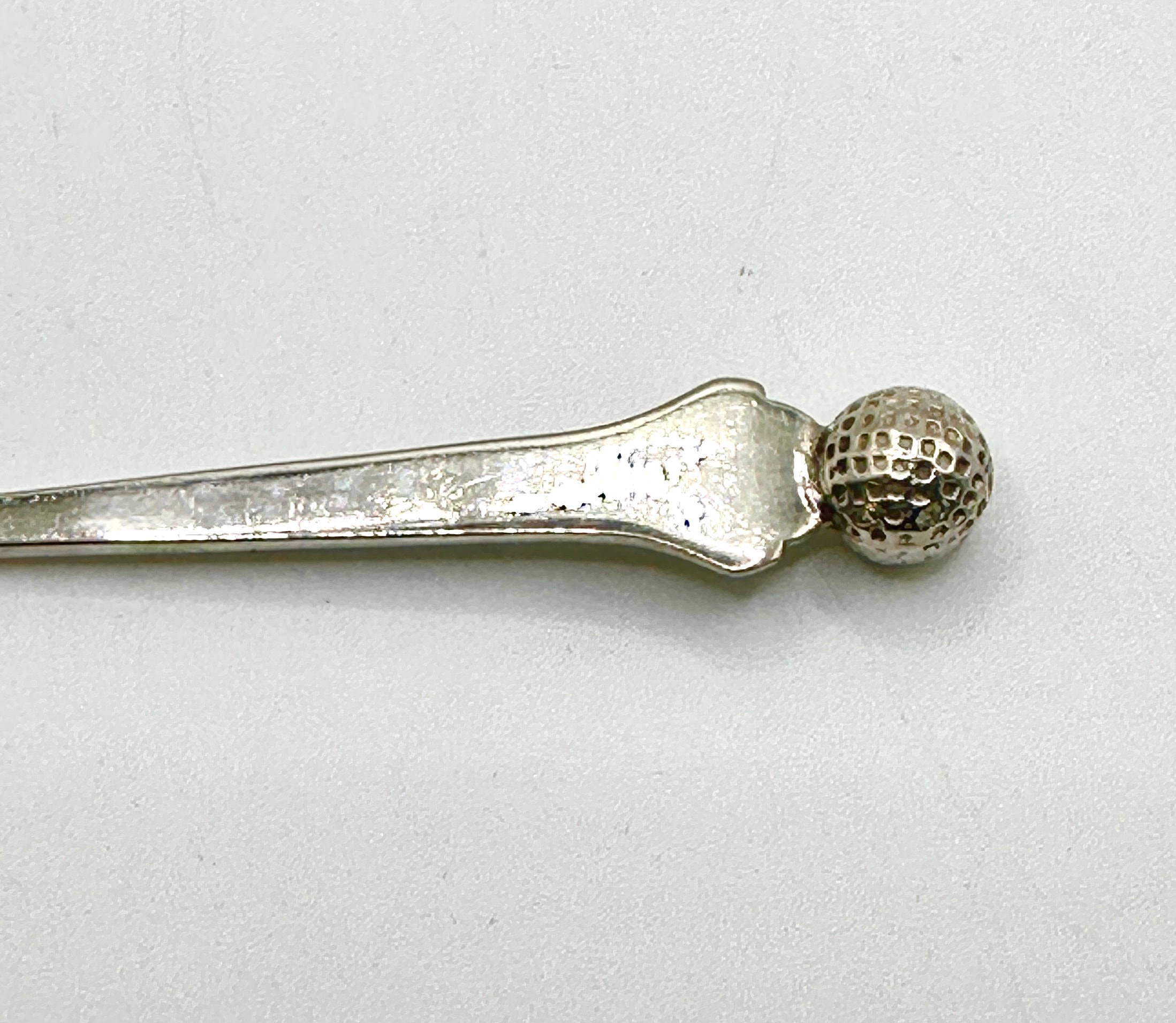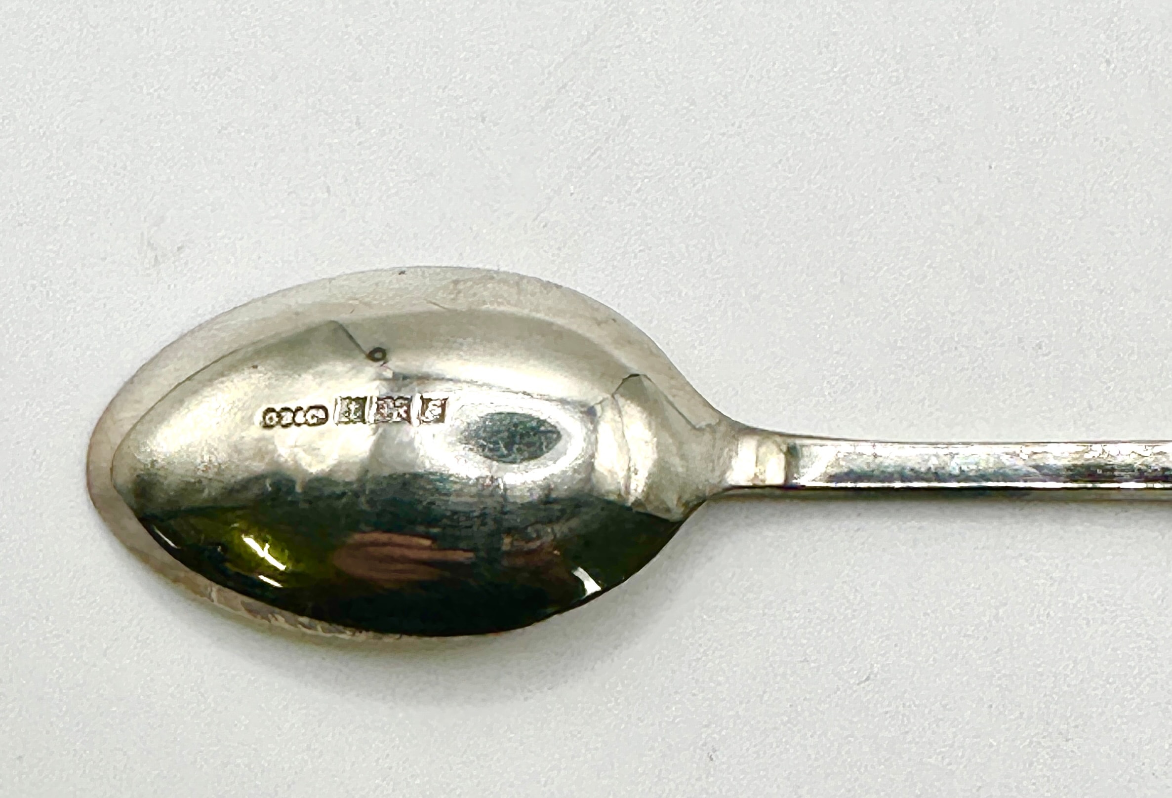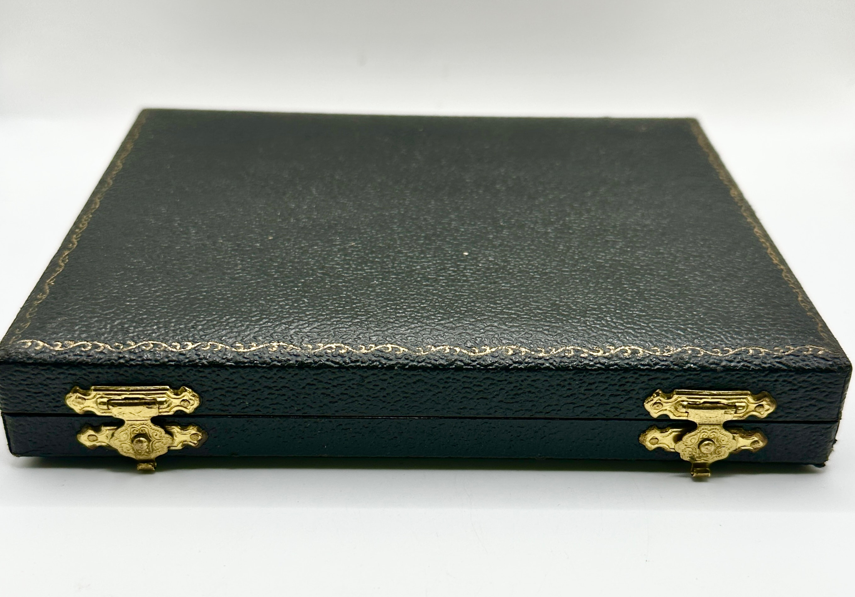 A cased set of six sterling silver coffee spoons, assayed in Birmingham with the date letter ‘c’ for 1952/53, and bearing the maker’s mark ‘BB & S’ (Barker Brothers Silver Ltd.). Each spoon features an oval bowl, a shaped handle, and a spherical, textured finial. The set is presented in a black, textured case with gold-colored decorative tooling and brass-toned clasps, opening to a black velvet base and a white ruched satin-lined lid.