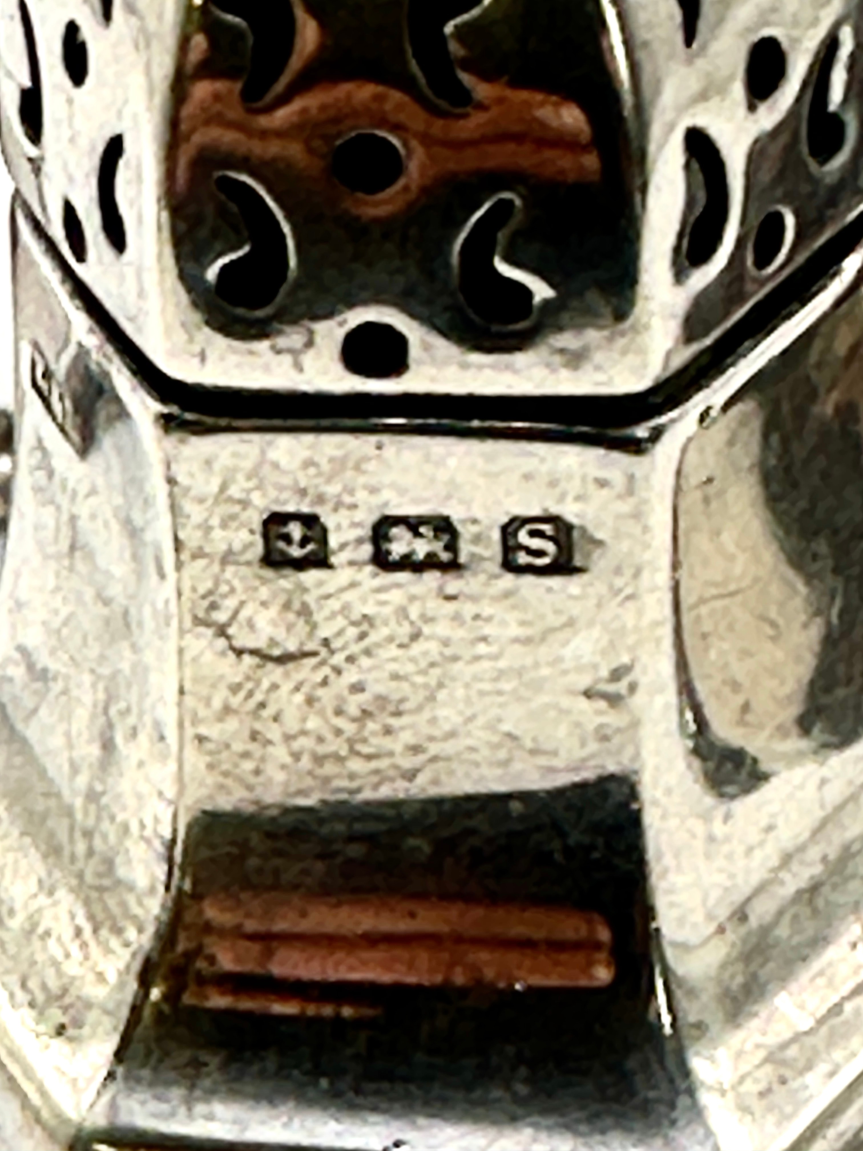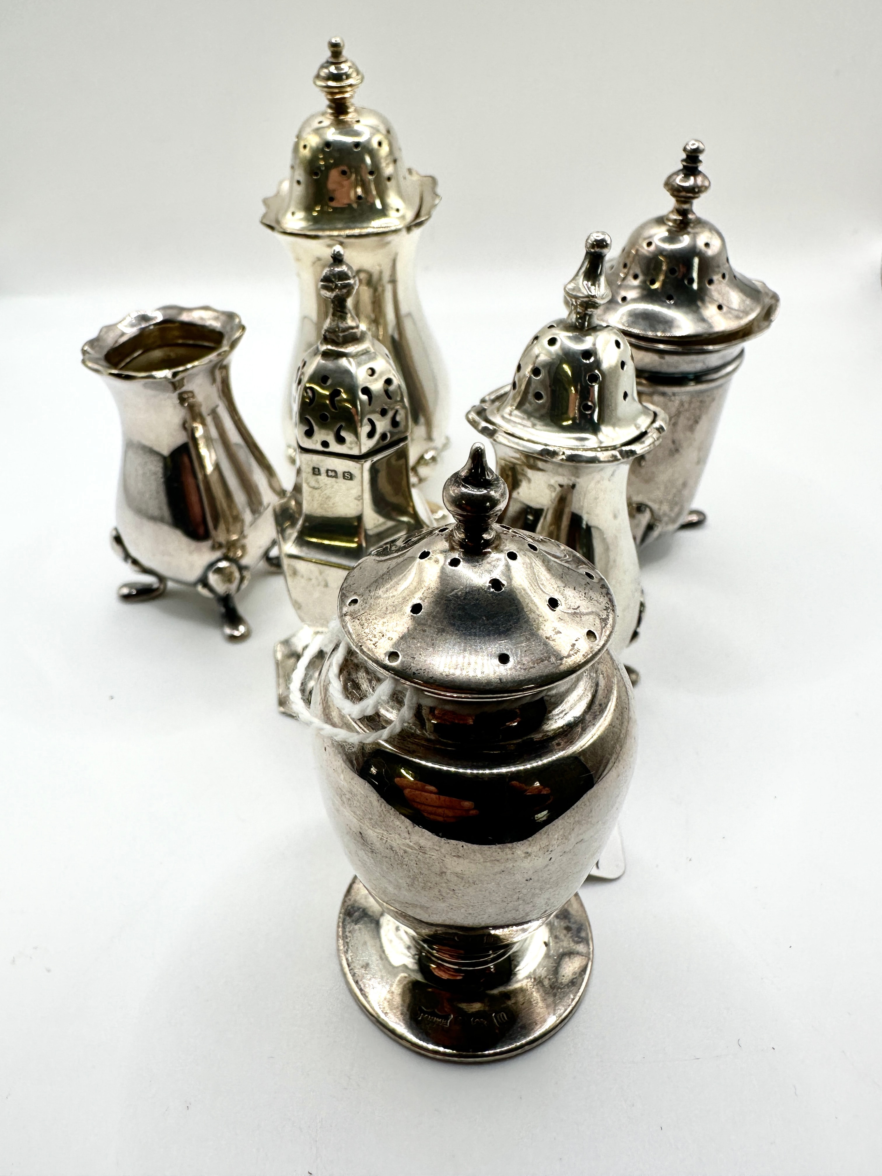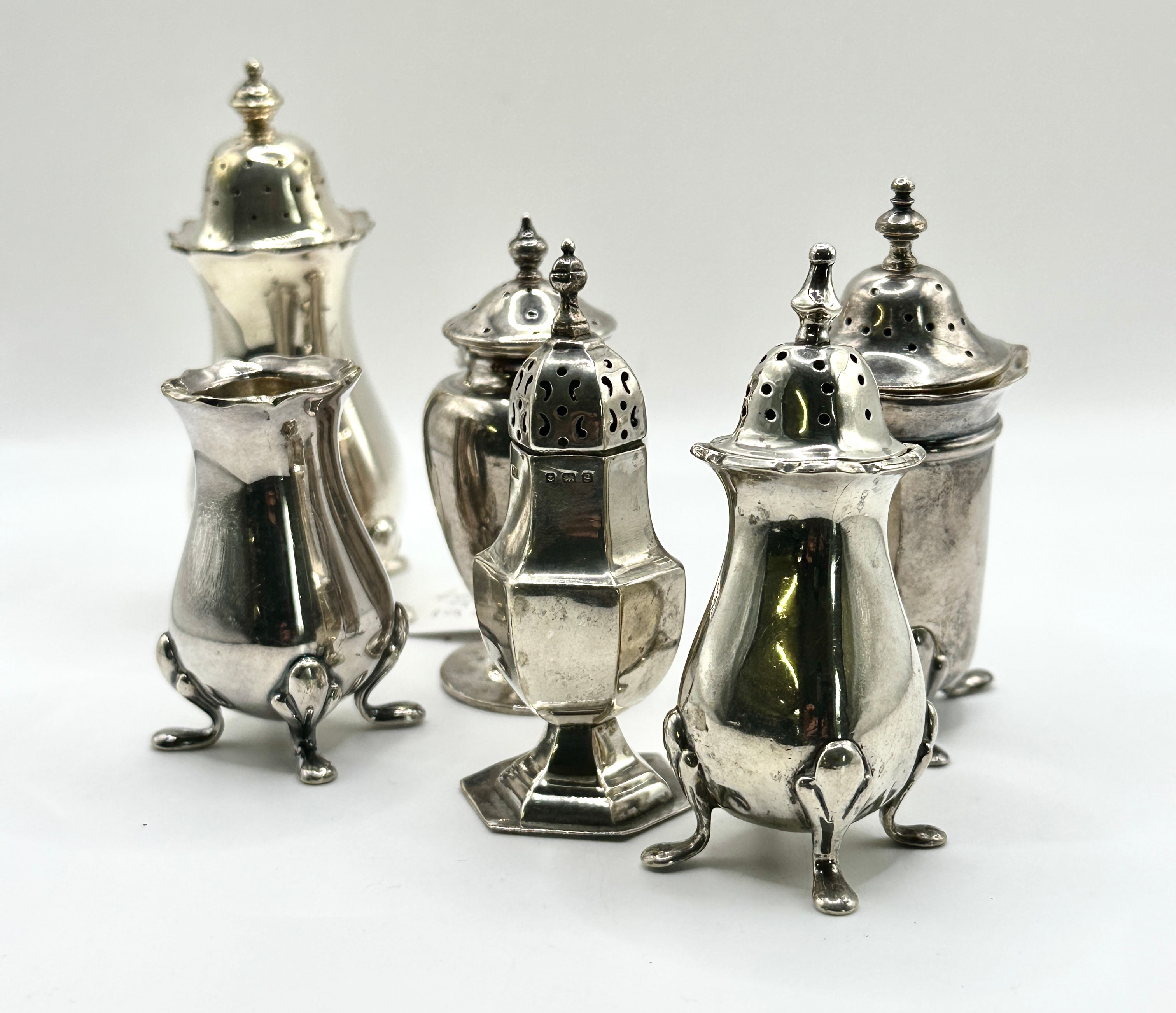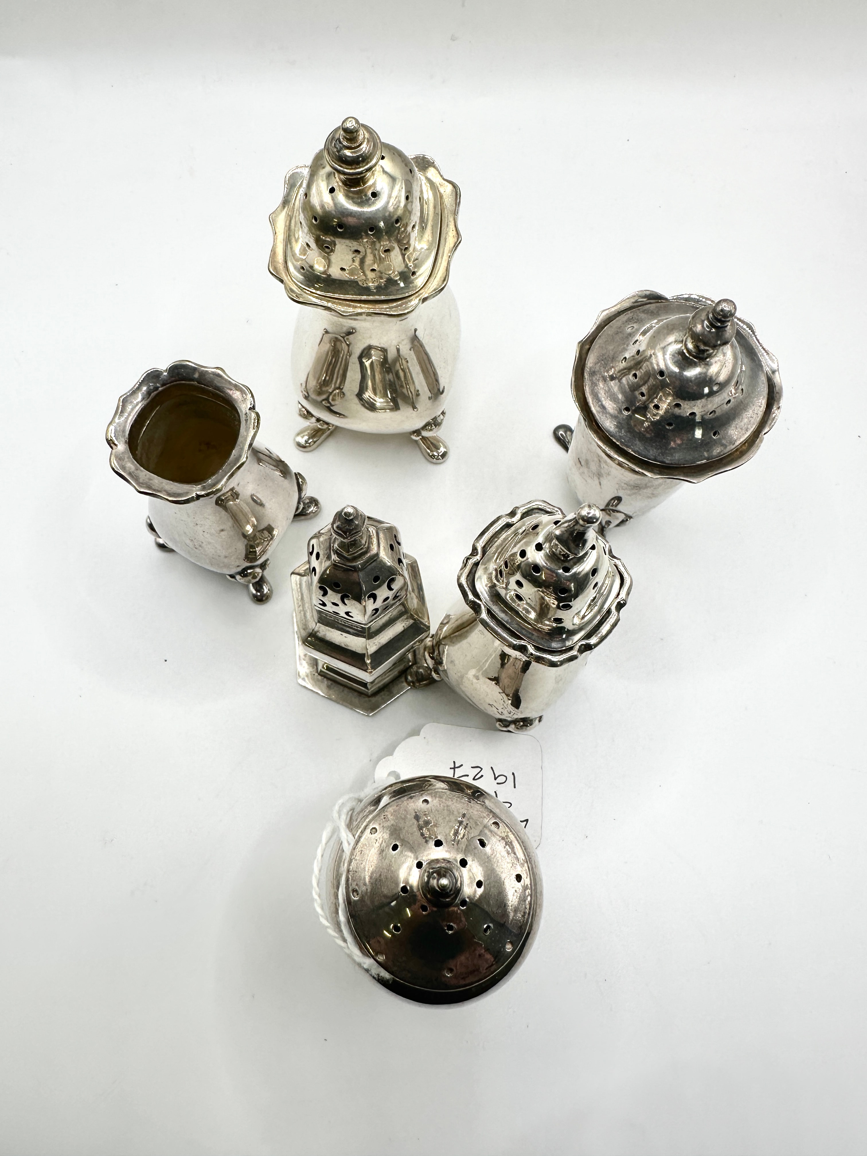 A group of six English sterling silver condiment shakers of varied forms, including baluster, ovoid, and octagonal shapes, some featuring decorative cabriole-style feet. The pieces exhibit styling consistent with the late 19th to early 20th century. The material is confirmed as sterling silver by visible hallmarks on at least two items: one octagonal shaker bears the Lion Passant (sterling standard), an Anchor (Birmingham assay office), and the date letter ‘S’, while another piece displays the maker’s mark ‘MNWE’, the Lion Passant, and the date letter ‘M’. A white paper tag with “1927” is attached to one shaker.