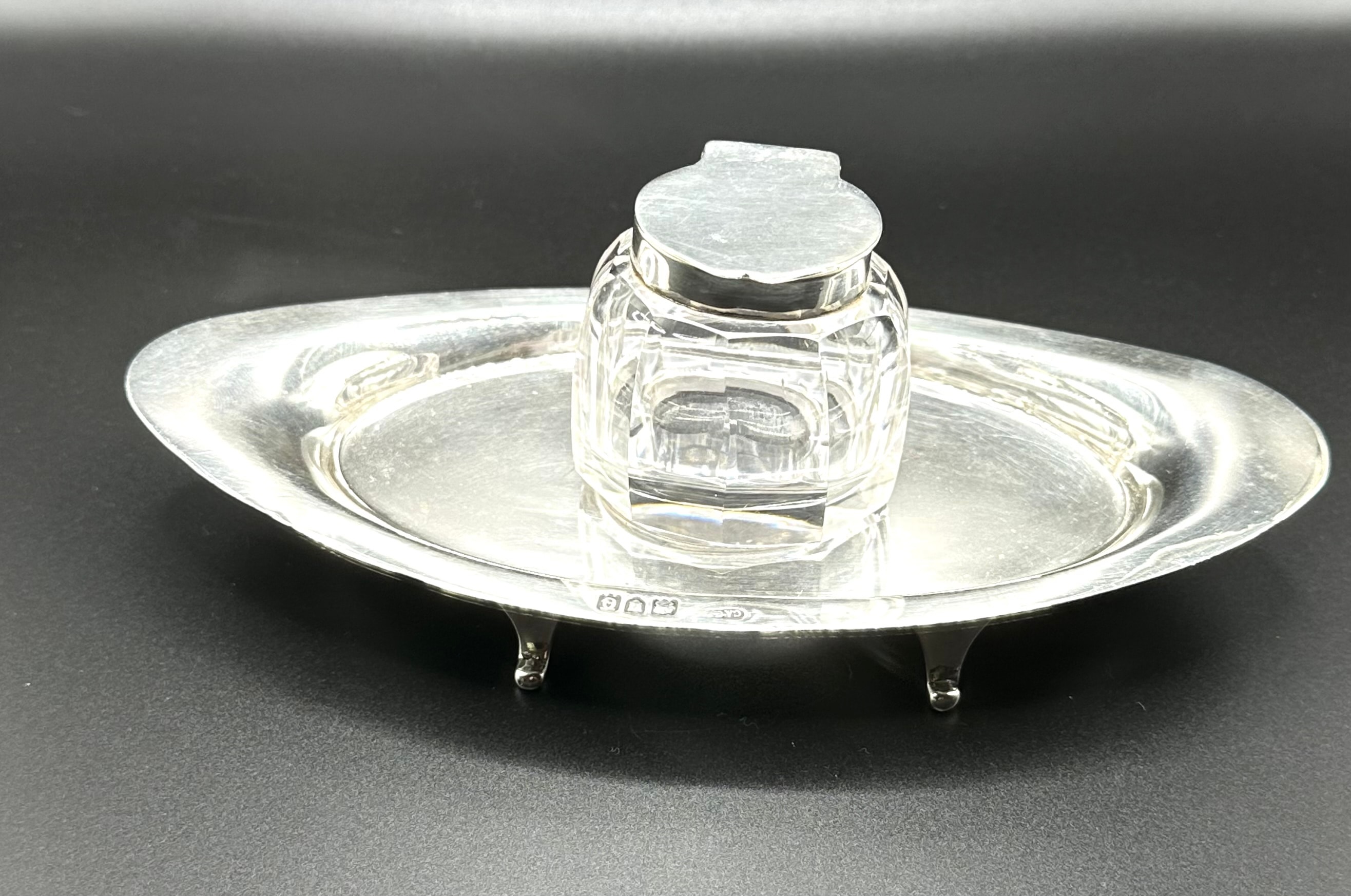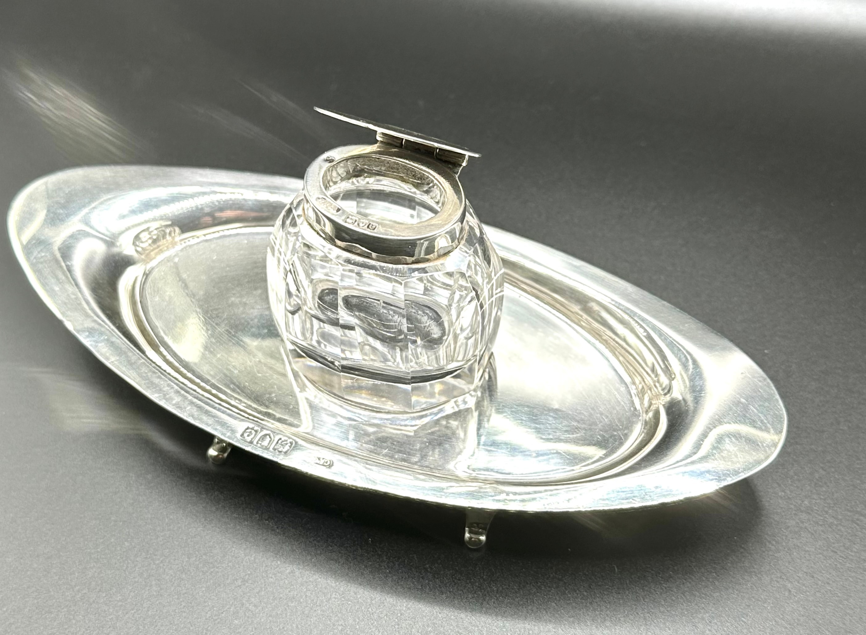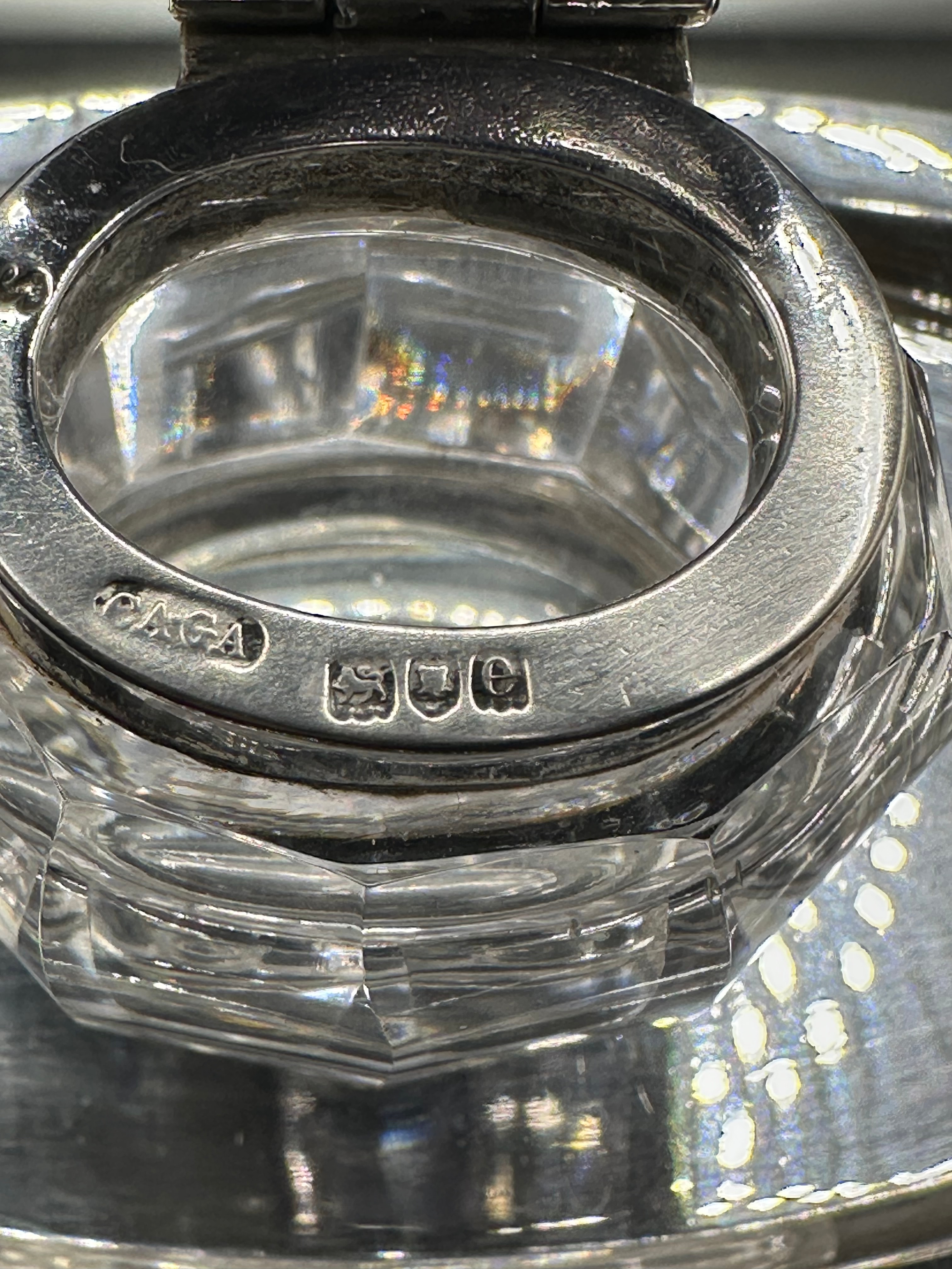 A sterling silver and cut-glass desk inkstand, comprising an oval, footed silver tray supporting a central faceted glass inkwell with a hinged silver lid. Hallmarks visible on both the inkwell collar and the tray confirm sterling silver, identifying the Birmingham assay office, a date letter ‘e’, and a maker’s mark, “CACA” (or similar, partially obscured on the tray). The faceted glass and simple, elegant silver form suggest a late 19th or early 20th-century period.