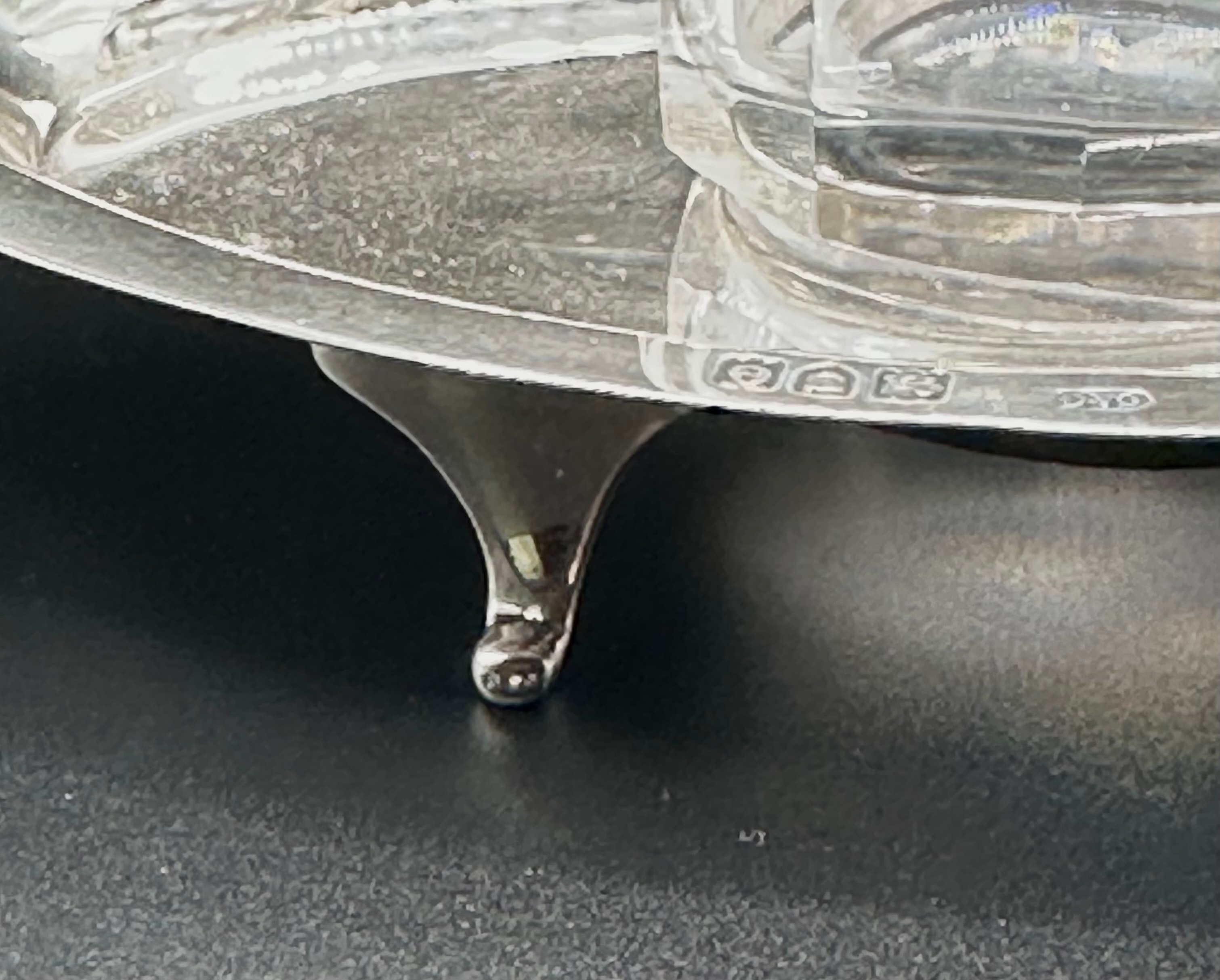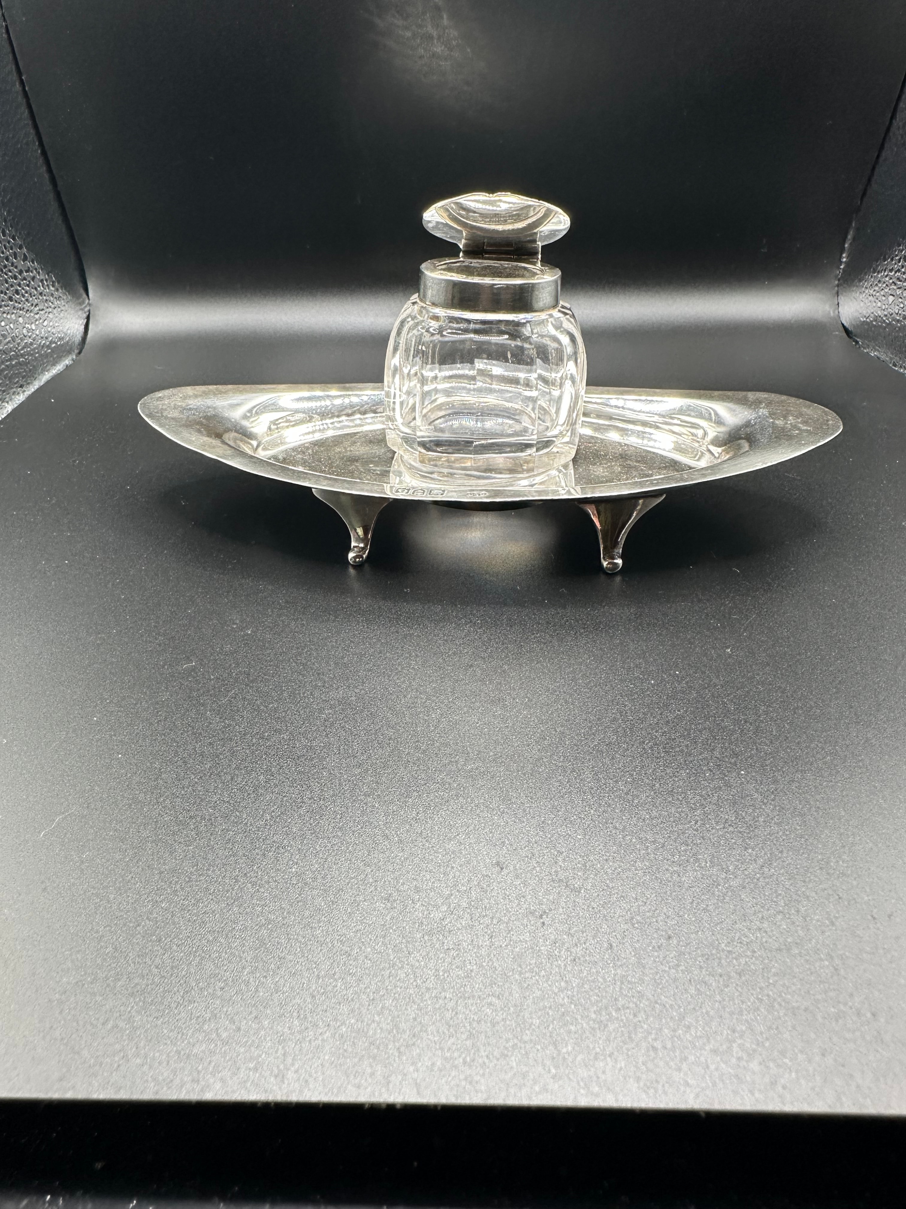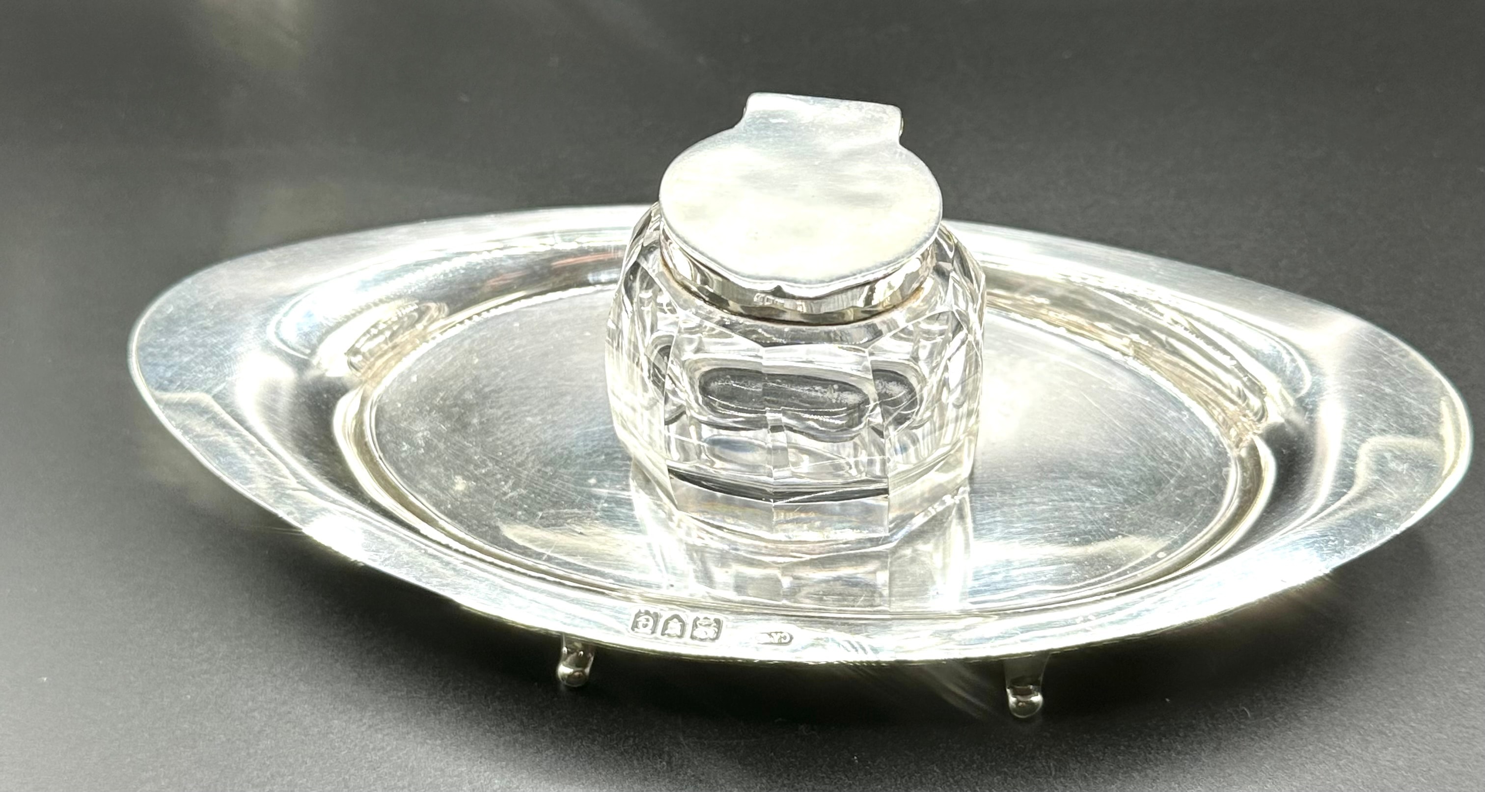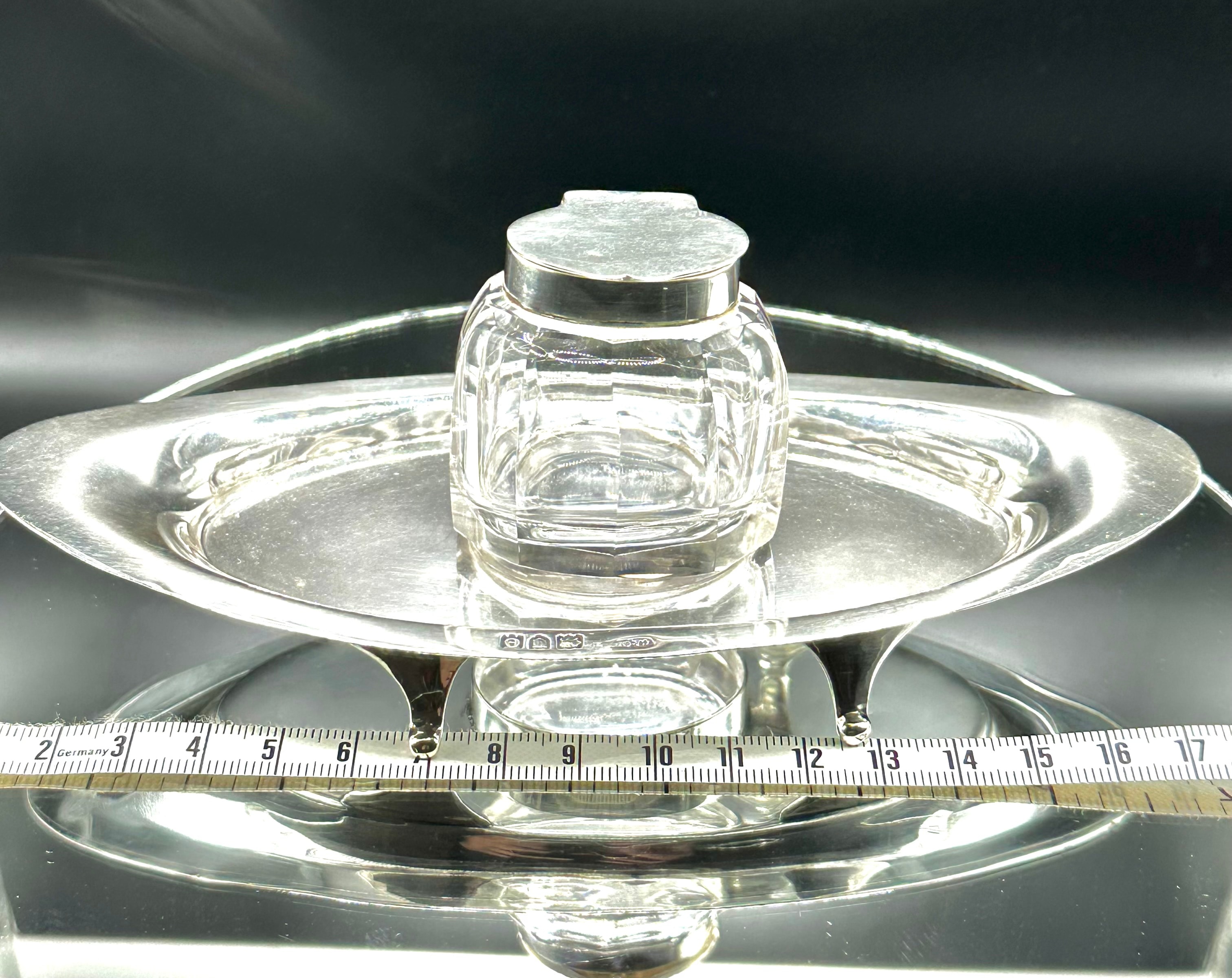 A sterling silver and cut-glass desk inkstand, comprising an oval, footed silver tray supporting a central faceted glass inkwell with a hinged silver lid. Hallmarks visible on both the inkwell collar and the tray confirm sterling silver, identifying the Birmingham assay office, a date letter ‘e’, and a maker’s mark, “CACA” (or similar, partially obscured on the tray). The faceted glass and simple, elegant silver form suggest a late 19th or early 20th-century period.