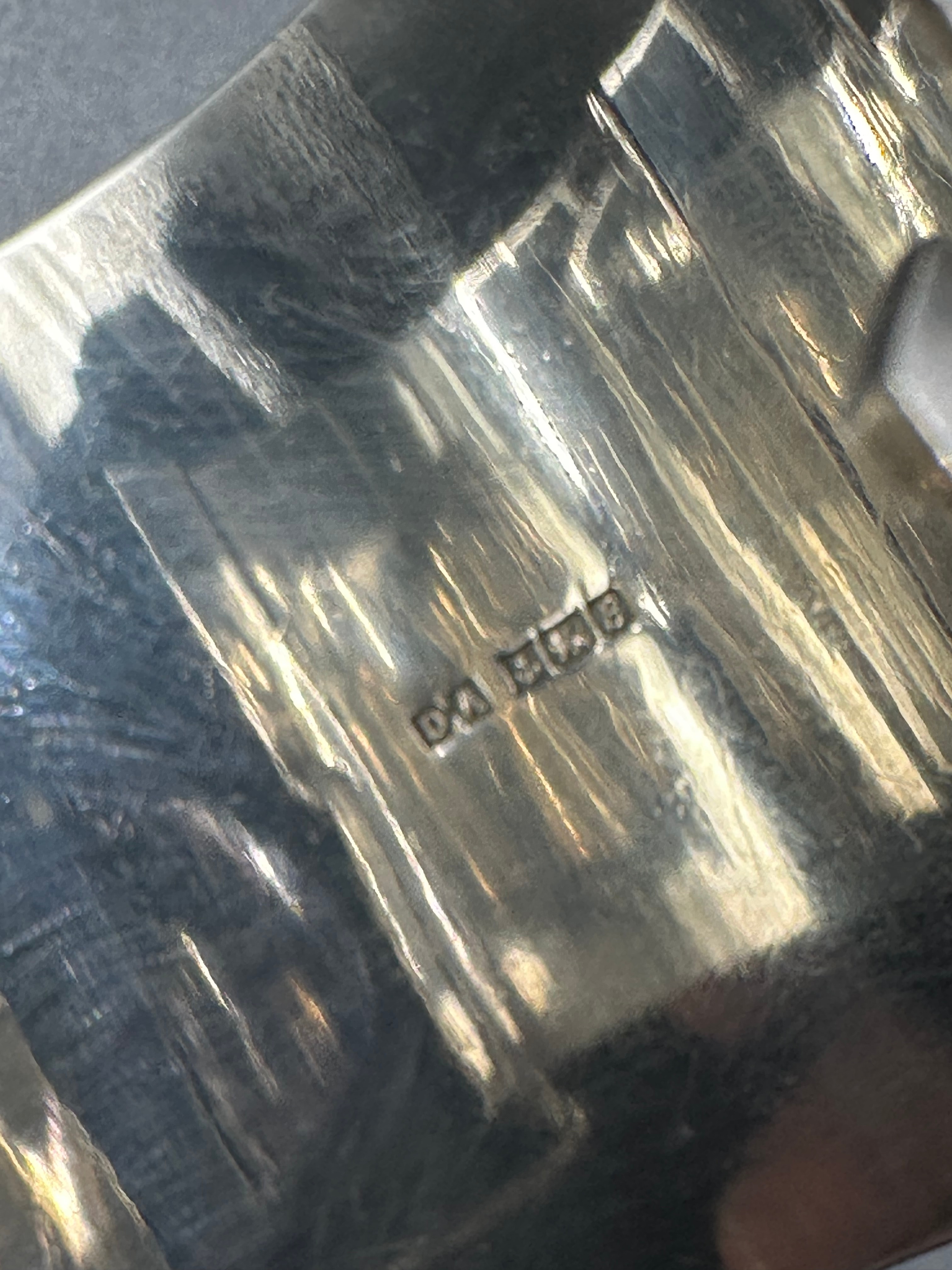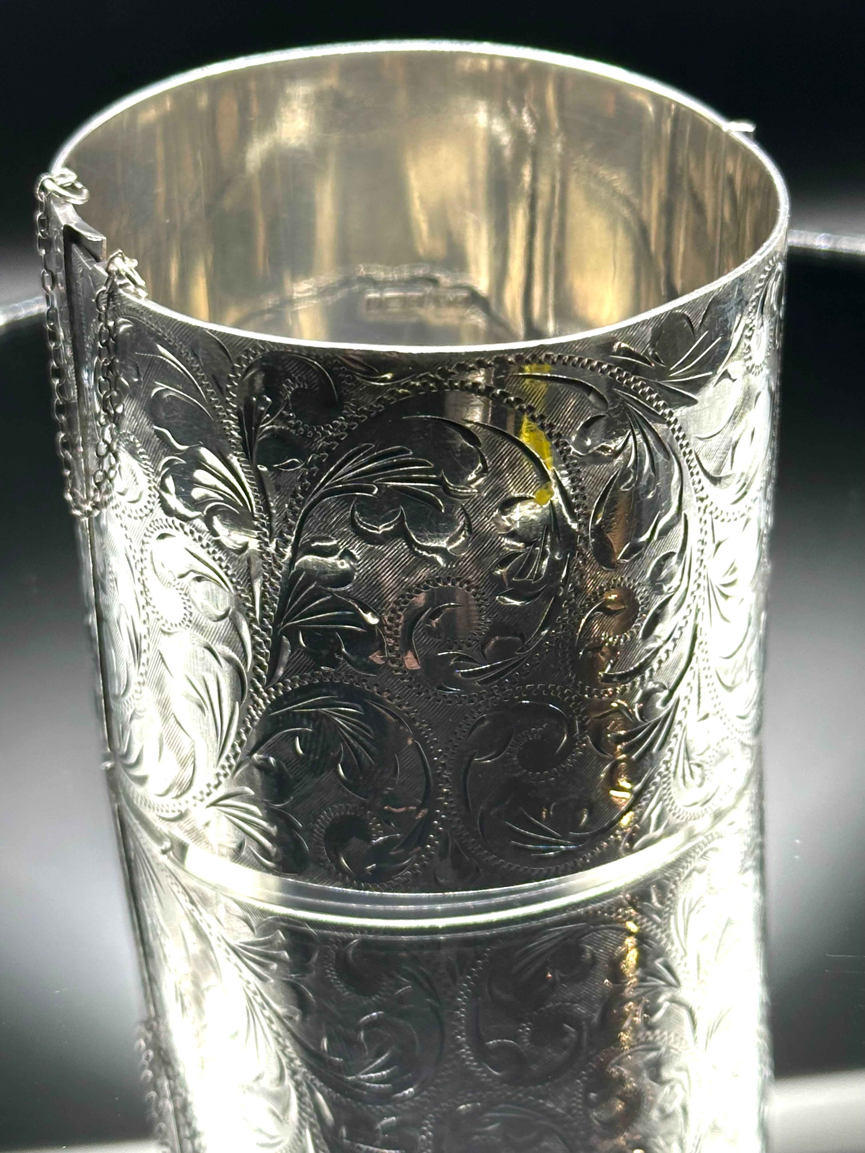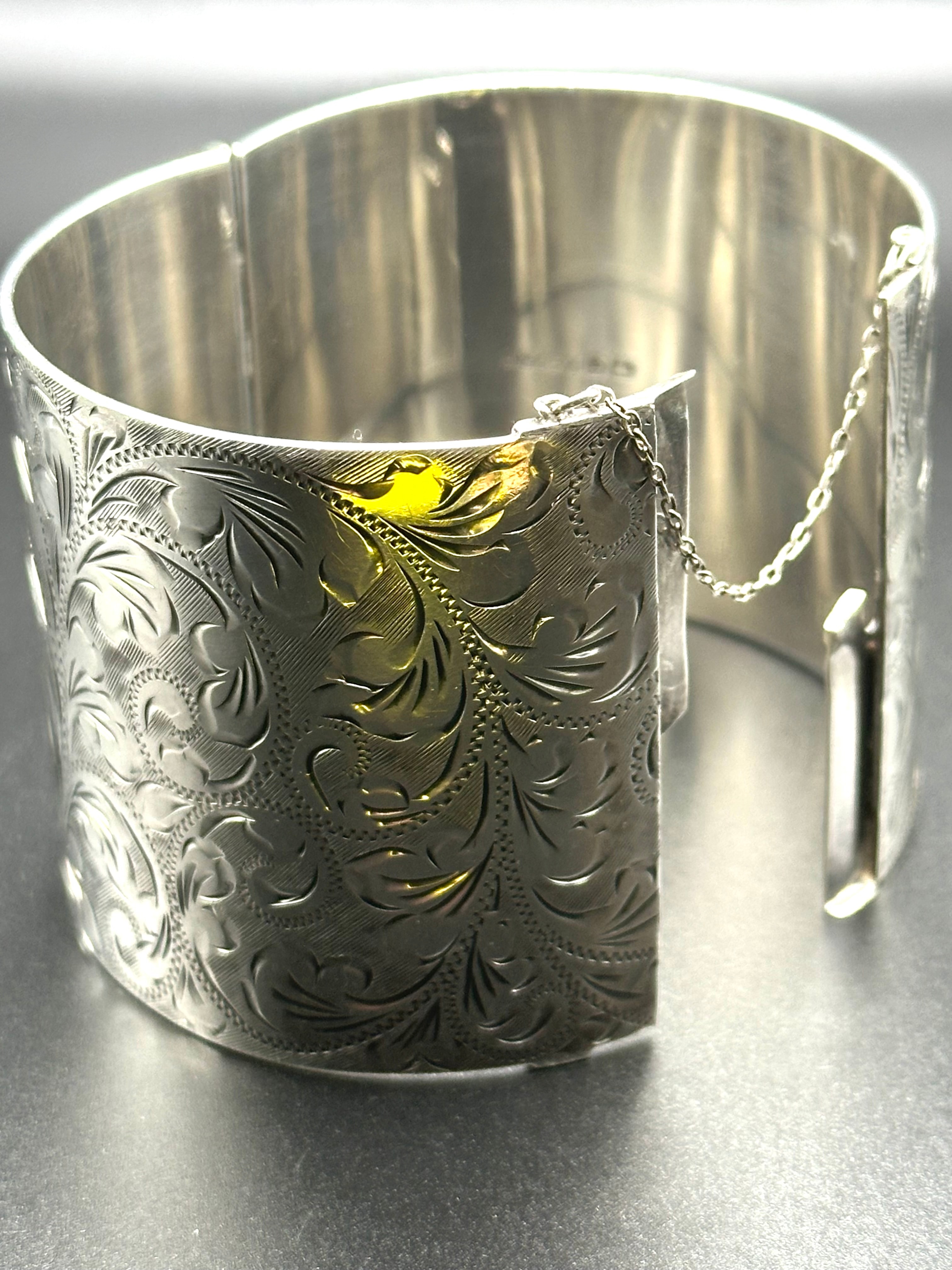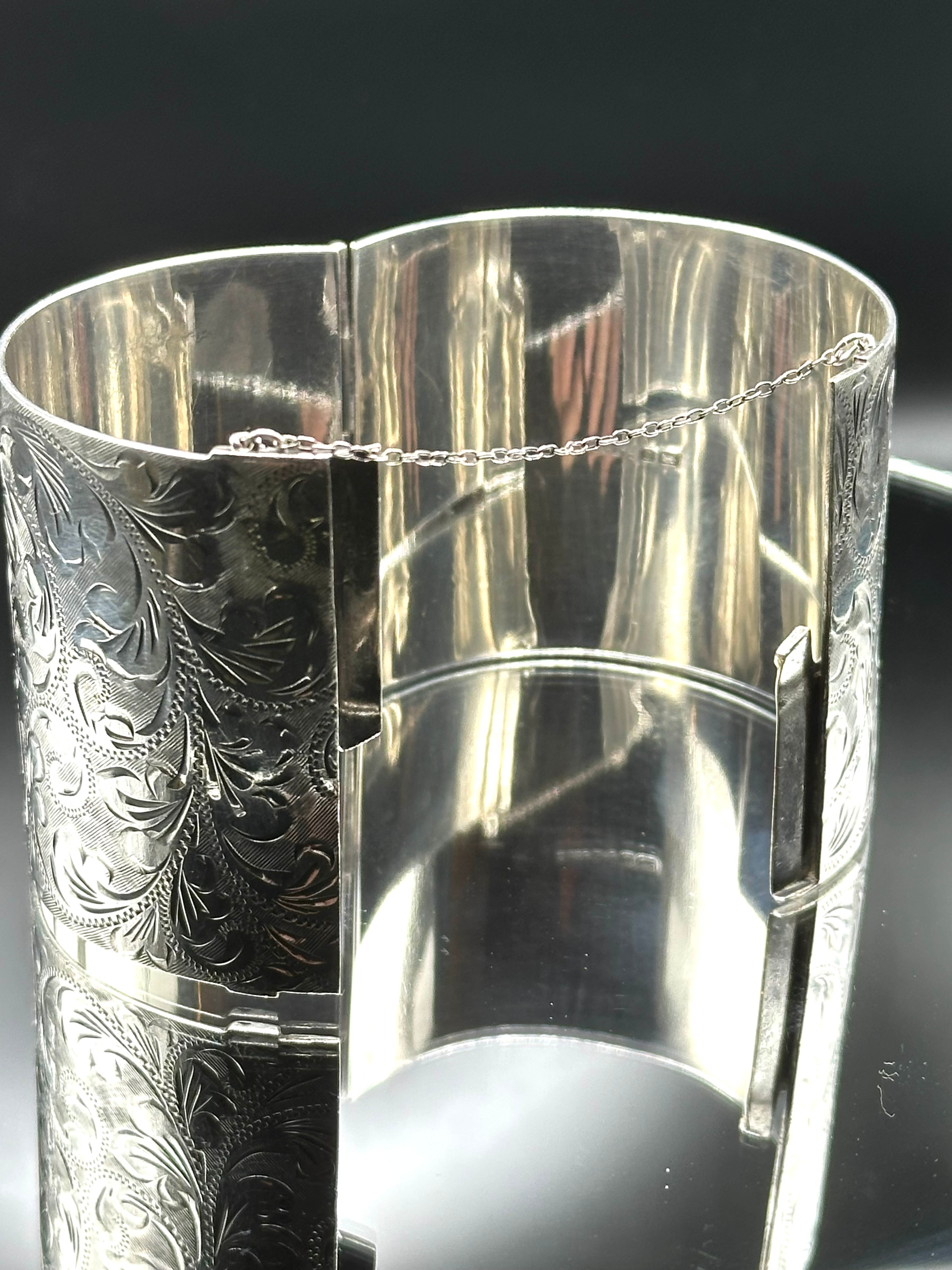 A wide, hinged cuff bangle, likely crafted from silver, featuring an integrated safety chain. Its exterior is fully adorned with elaborate engraved or chased floral and foliate scrollwork, consistent with Victorian or Edwardian stylistic influences. The interior bears stamped hallmarks, prominently featuring ‘DA’ followed by additional partially legible characters and symbols consistent with British hallmarking, including what appears to be a maker’s mark and assay marks.