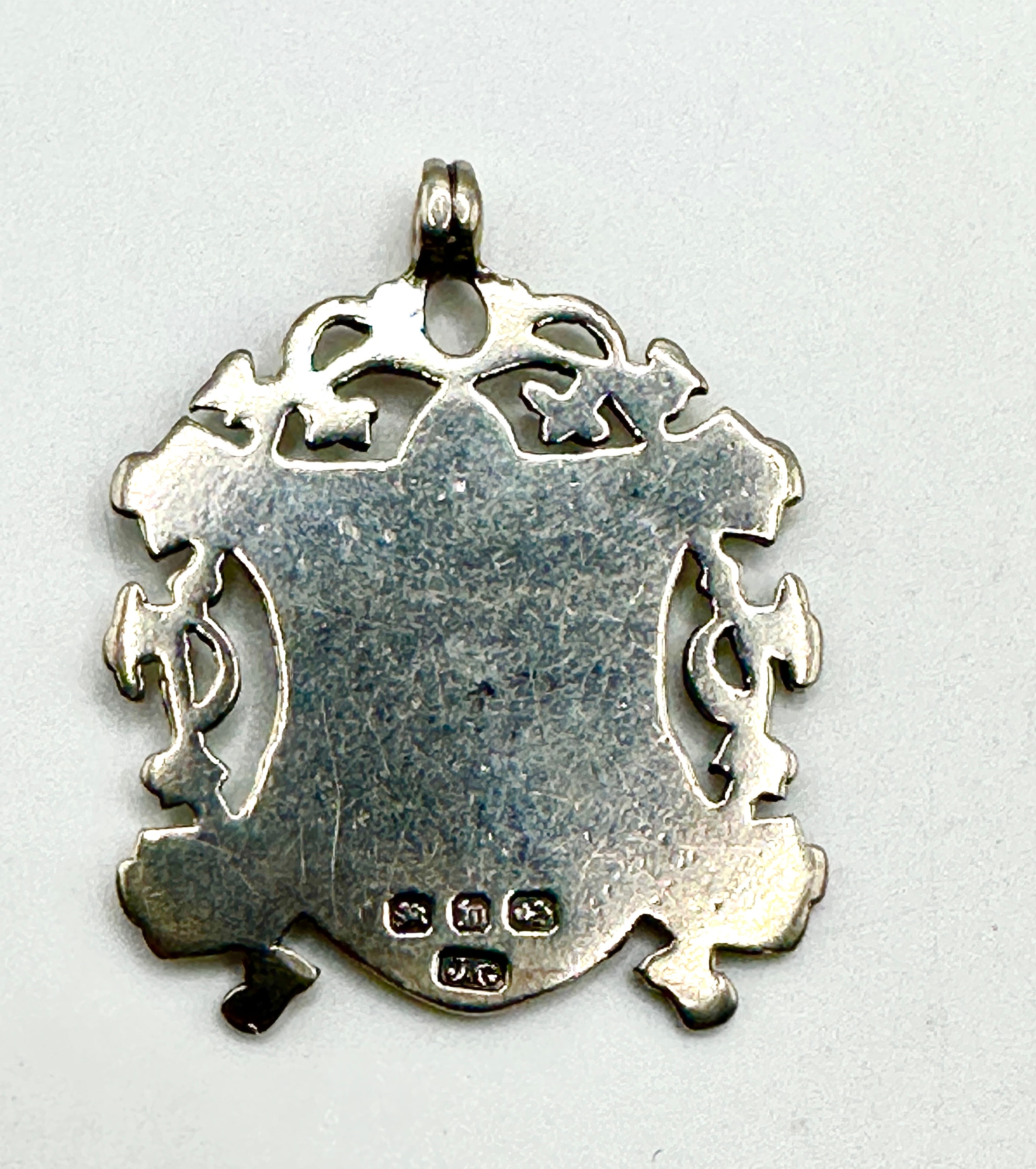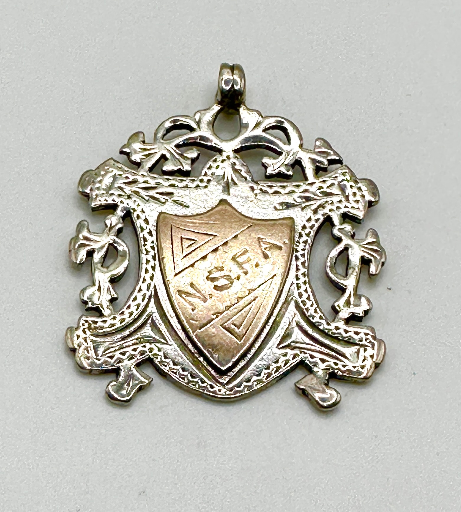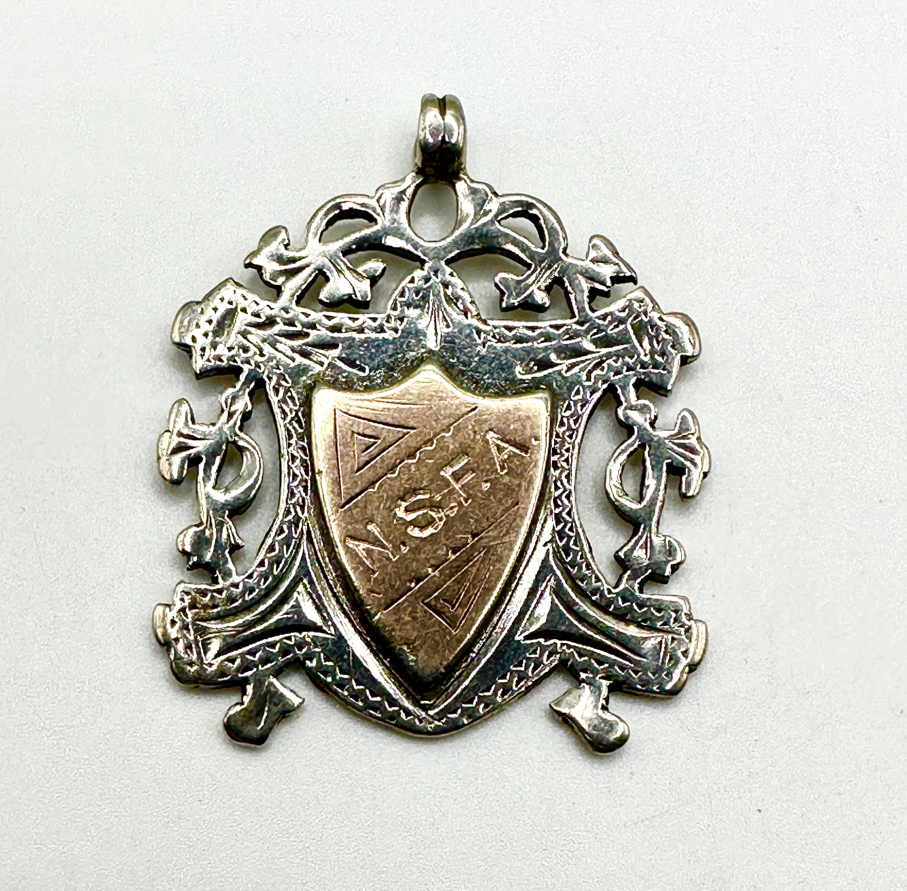 An antique shield-shaped pendant or fob, crafted from sterling silver with an ornate, openwork border of foliate scrolls. The central escutcheon, in a contrasting warmer-toned metal, possibly gold or gold-plated, is engraved with the initials “N.S.F.A.” and two triangular motifs. The reverse displays a cluster of clear hallmarks at the bottom, including a lion passant, an anchor, and a lowercase ‘s’ date letter, confirming it as sterling silver, assayed in Birmingham, and dated to 1917.