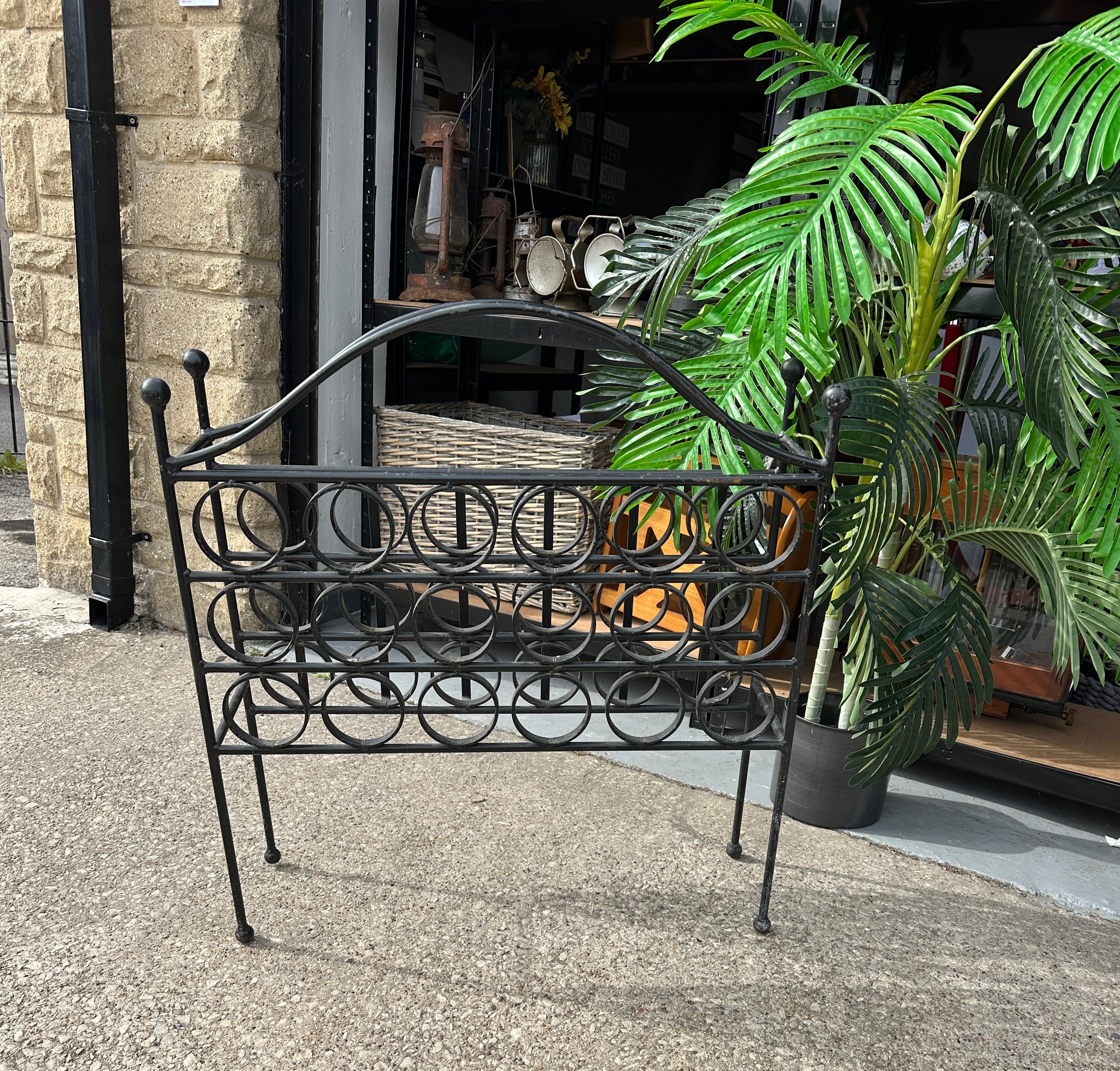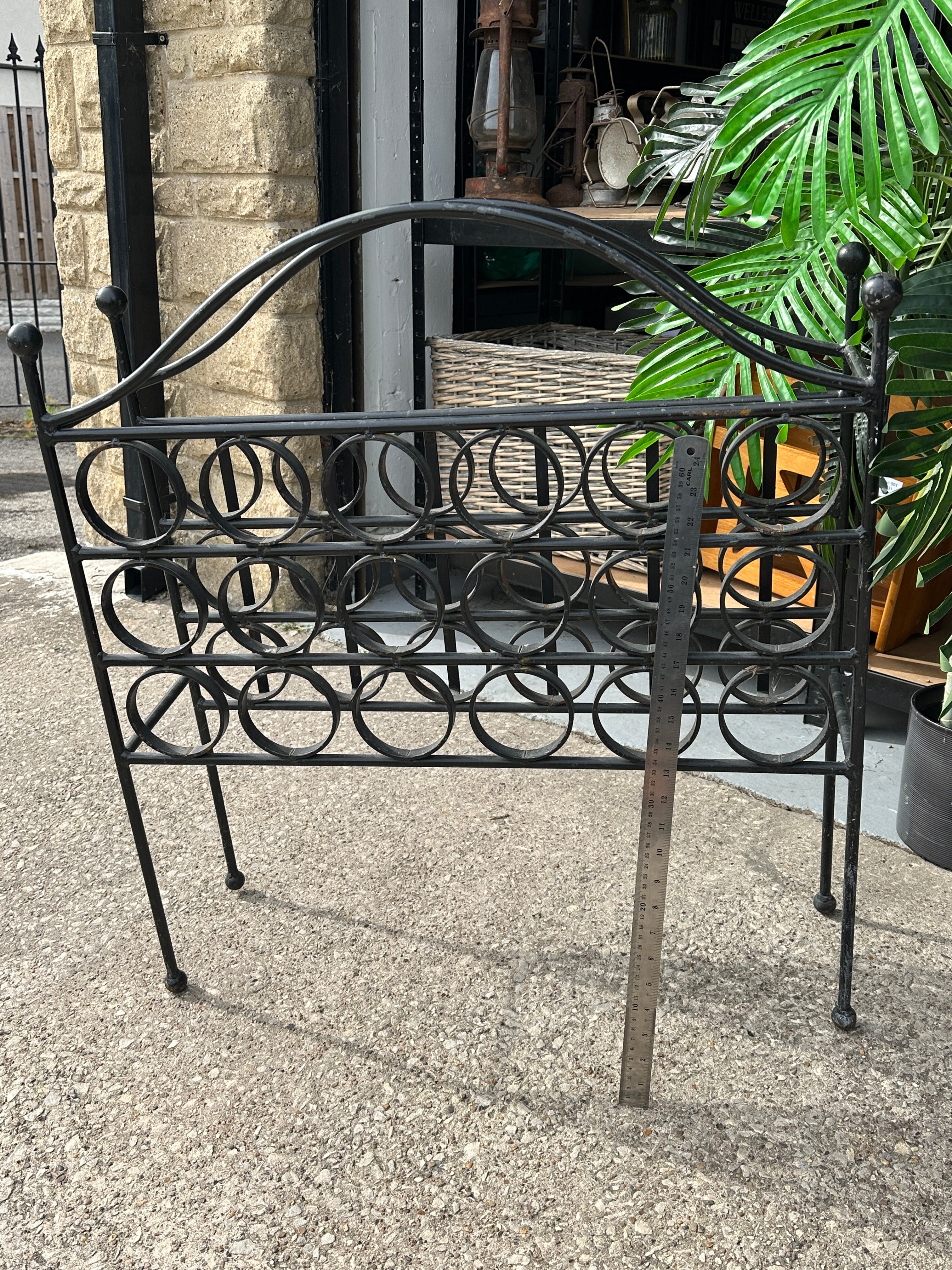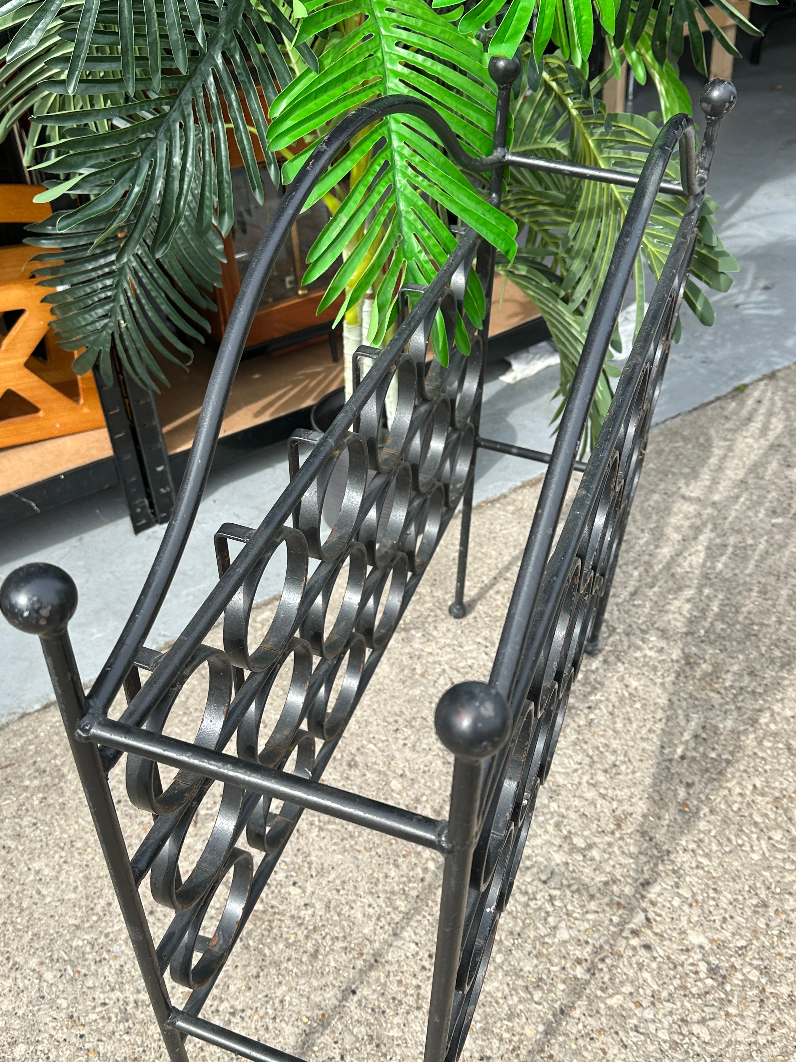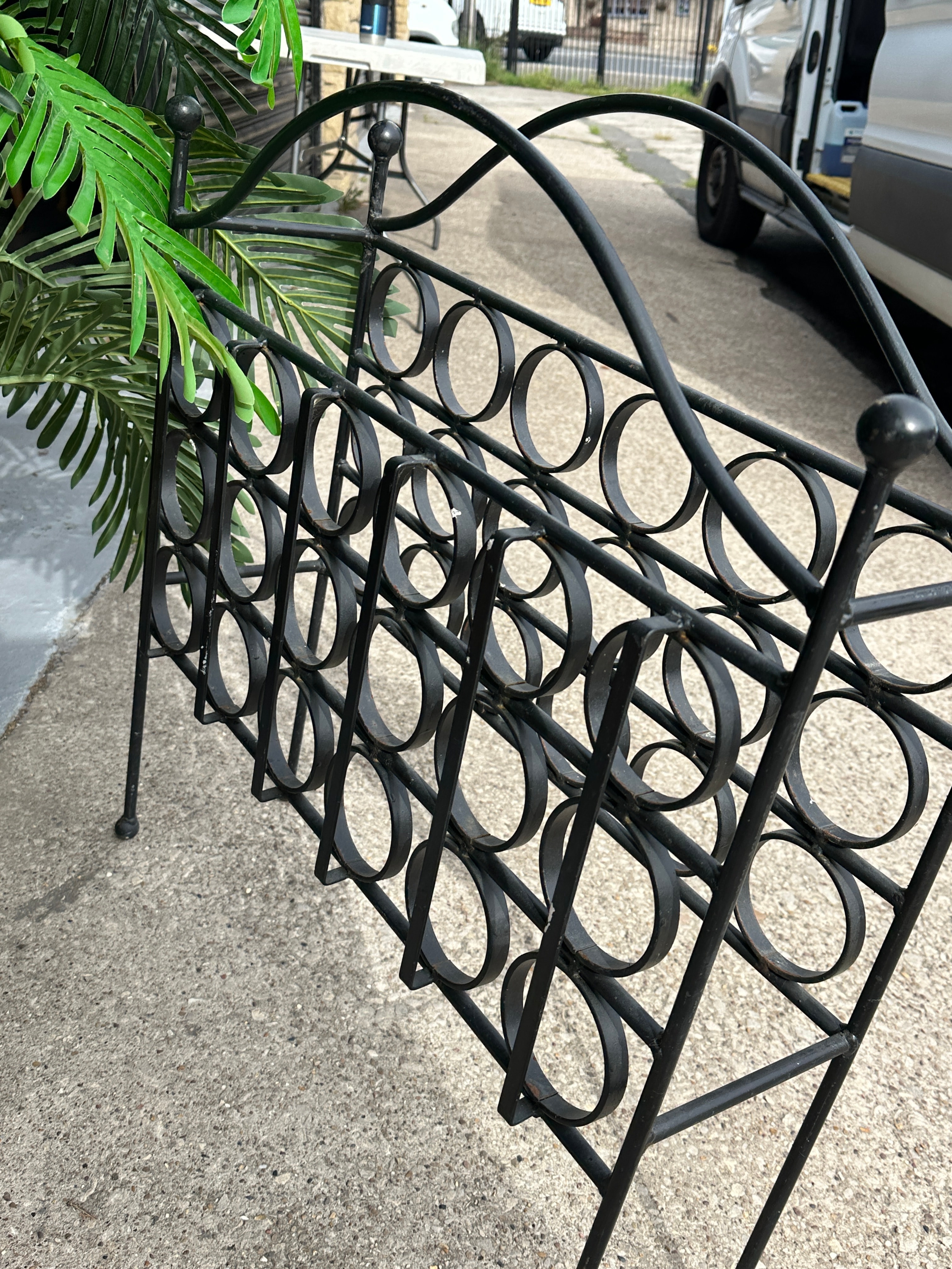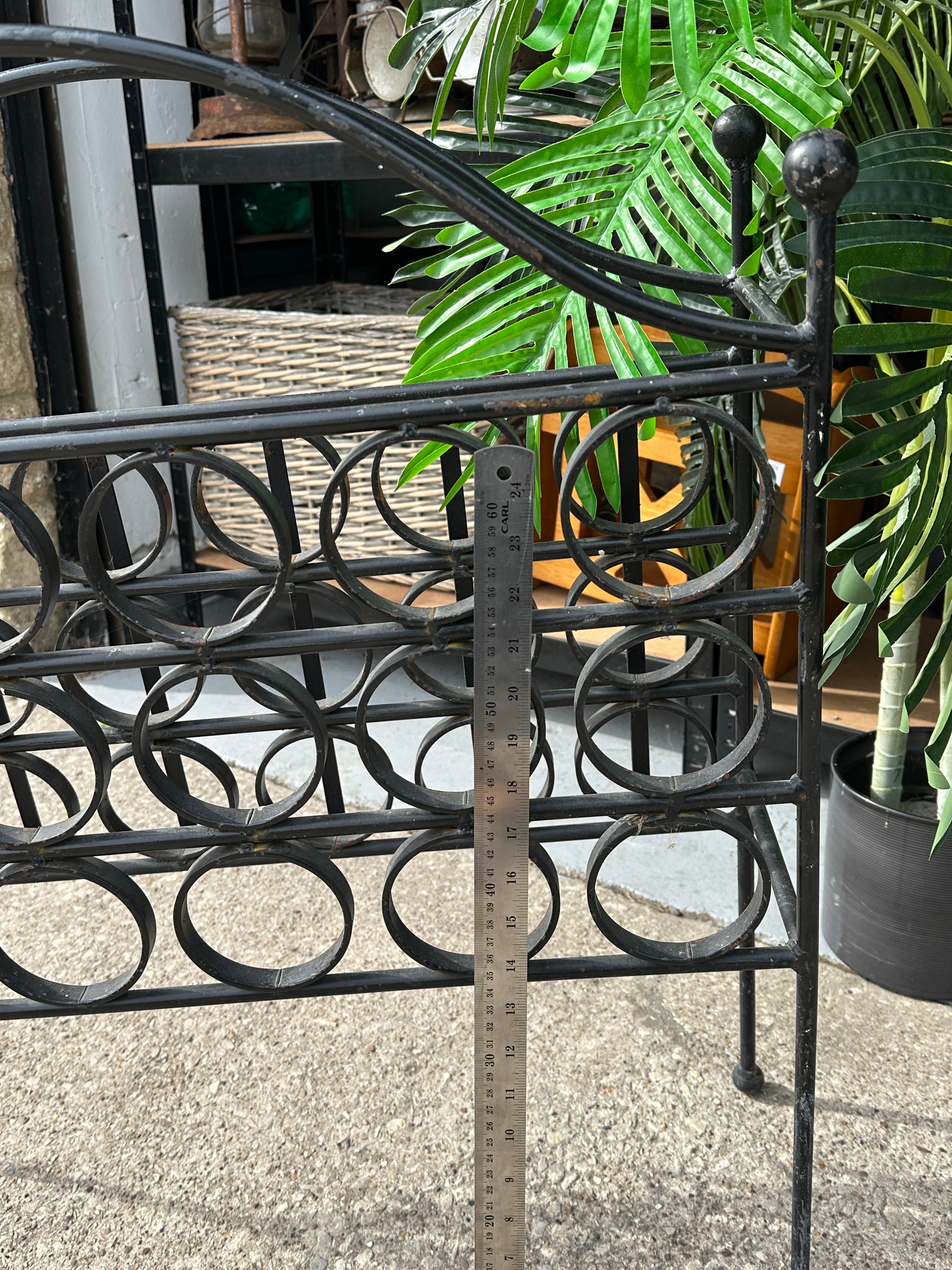 A freestanding wine rack, constructed from black-painted or powder-coated metal rods. The design features a grid of circular compartments, arranged in three tiers, capable of accommodating 24 bottles. It is supported by four slender legs, and a curved handle with spherical finials adorns the top. The item exhibits a functional, possibly vintage-inspired or rustic aesthetic. No visible manufacturer’s marks or identifying text are present.