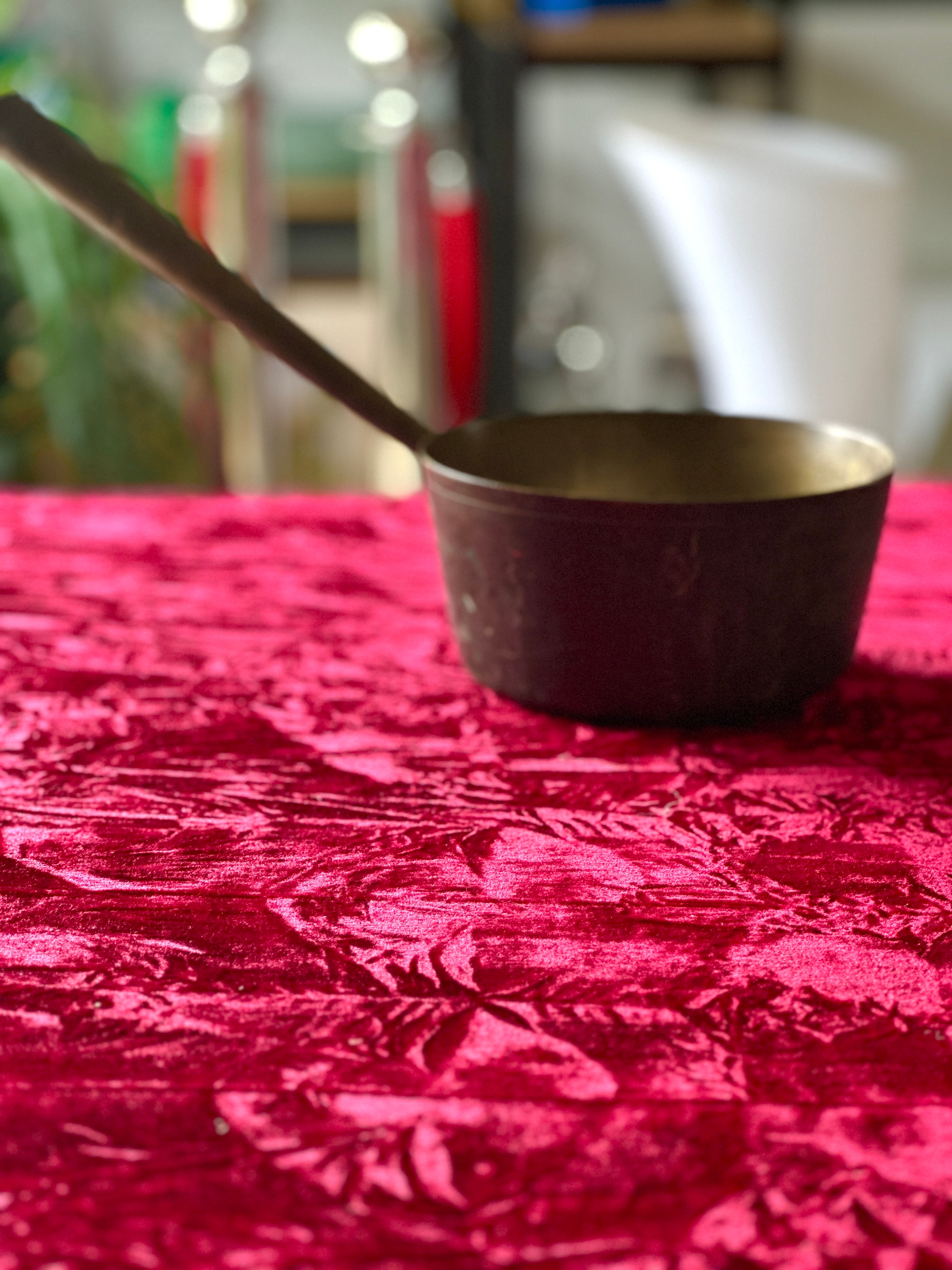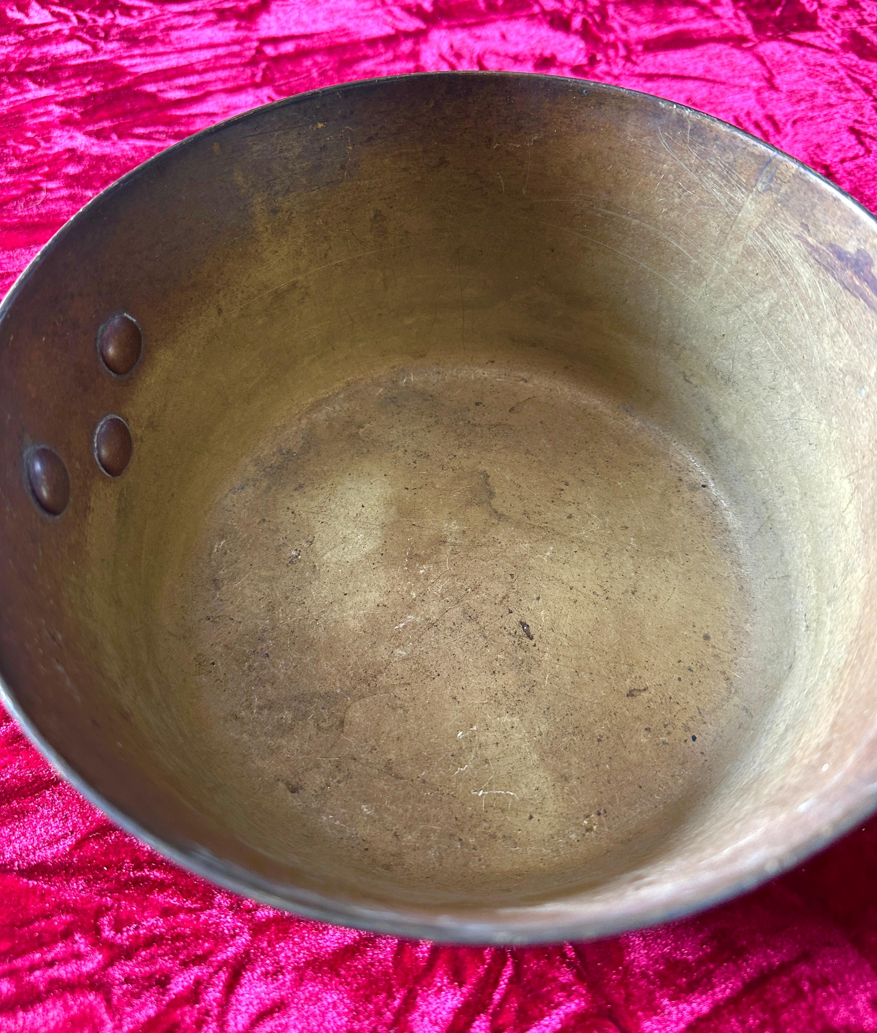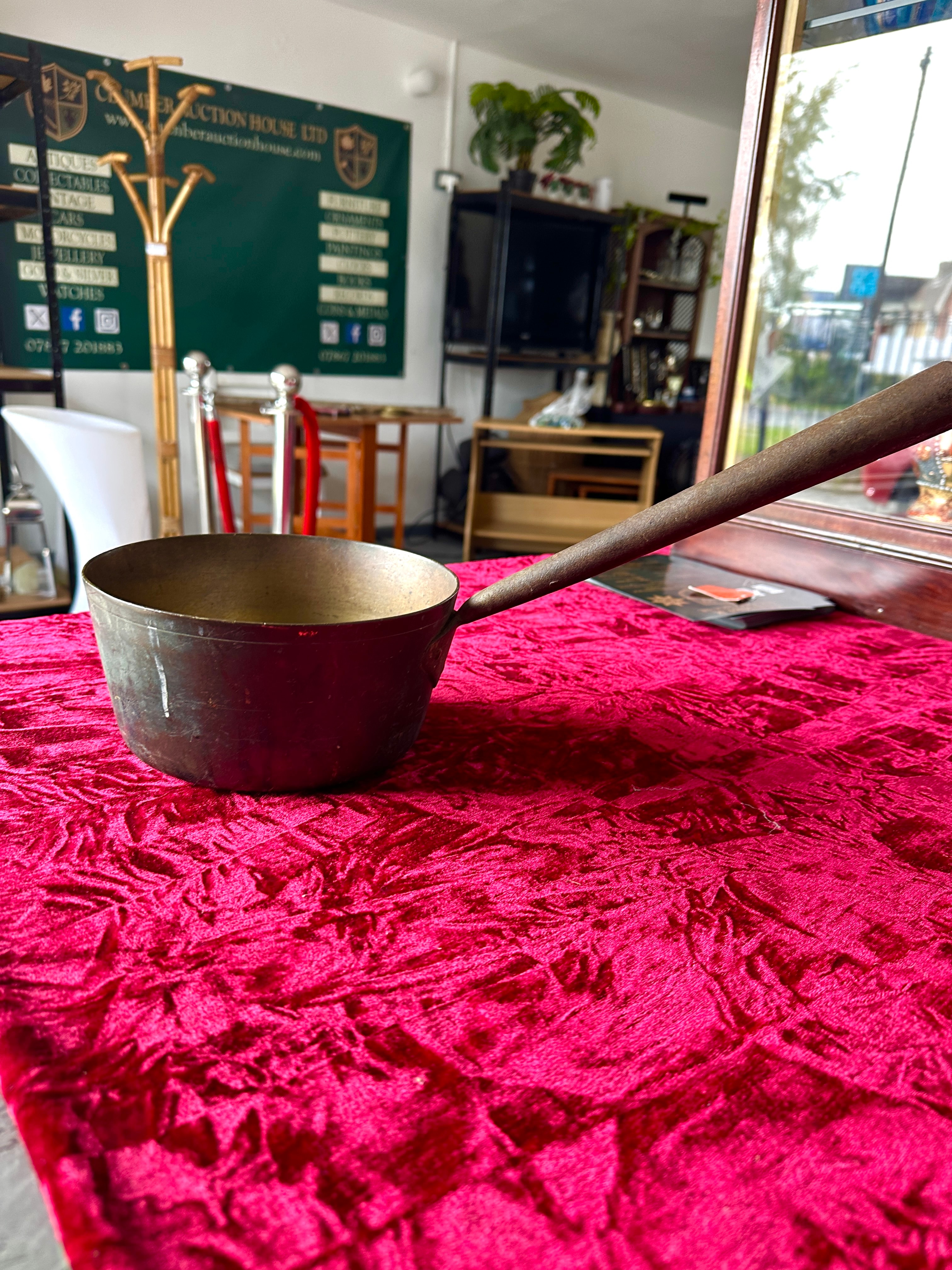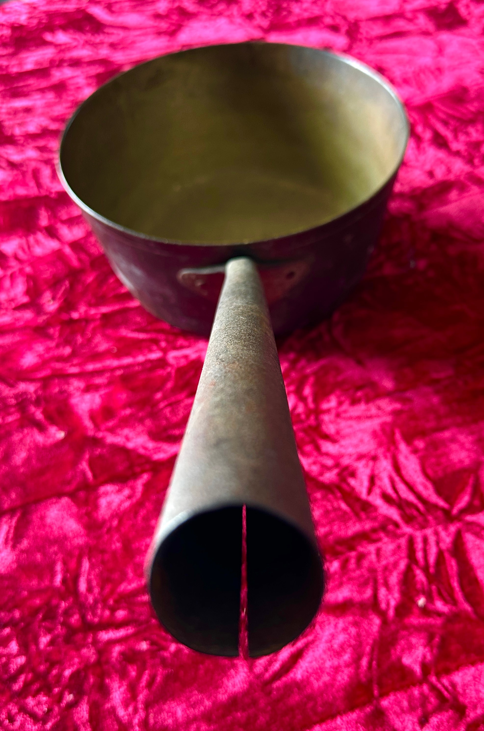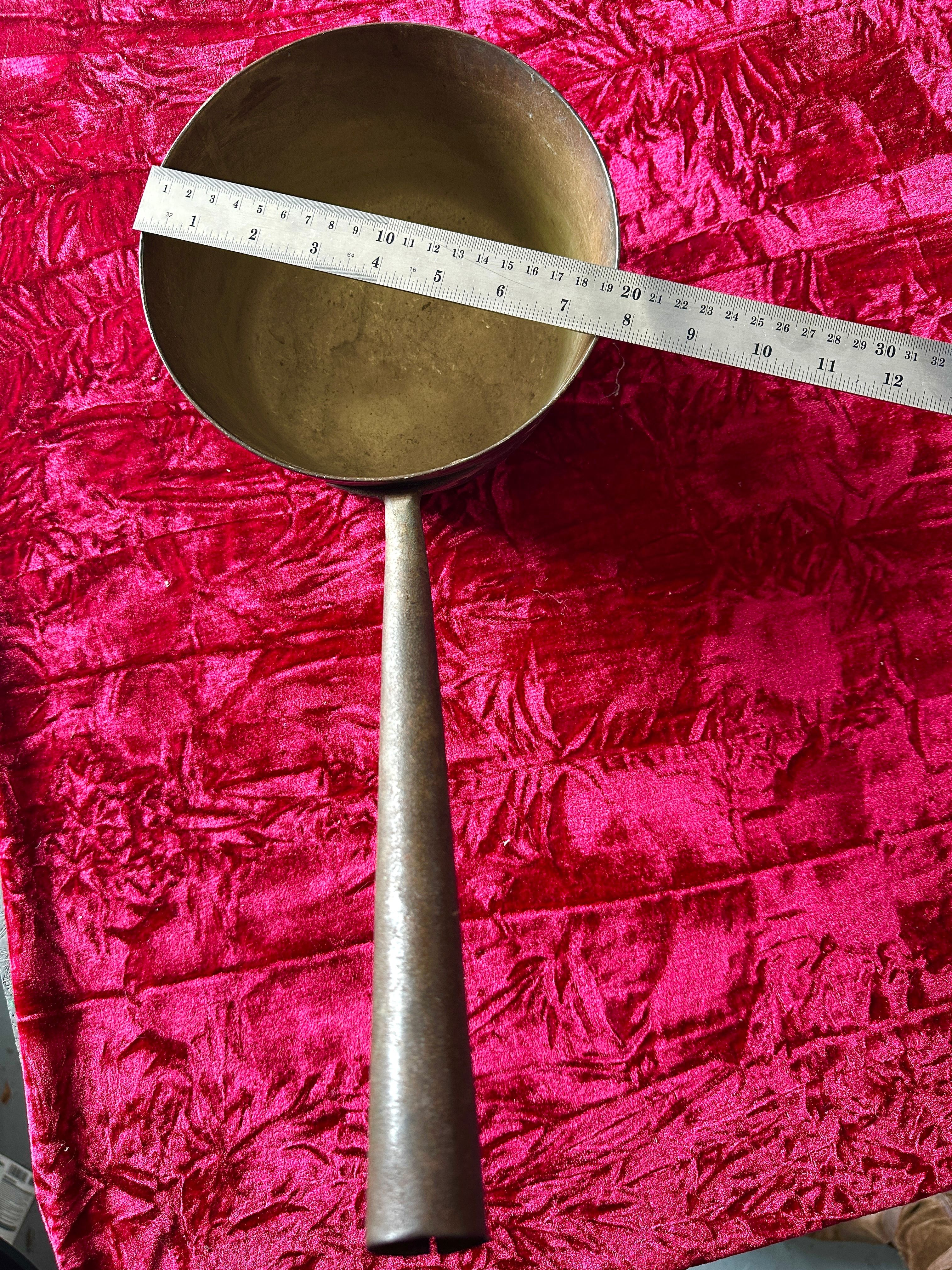 This long-handled pan or dipper is crafted from a brass or bronze alloy, featuring a simple, utilitarian design. The conical handle, which appears hollow with a visible seam at its tip, is securely attached to the pan body with three rivets. No discernible maker’s marks or decorative engravings are apparent.