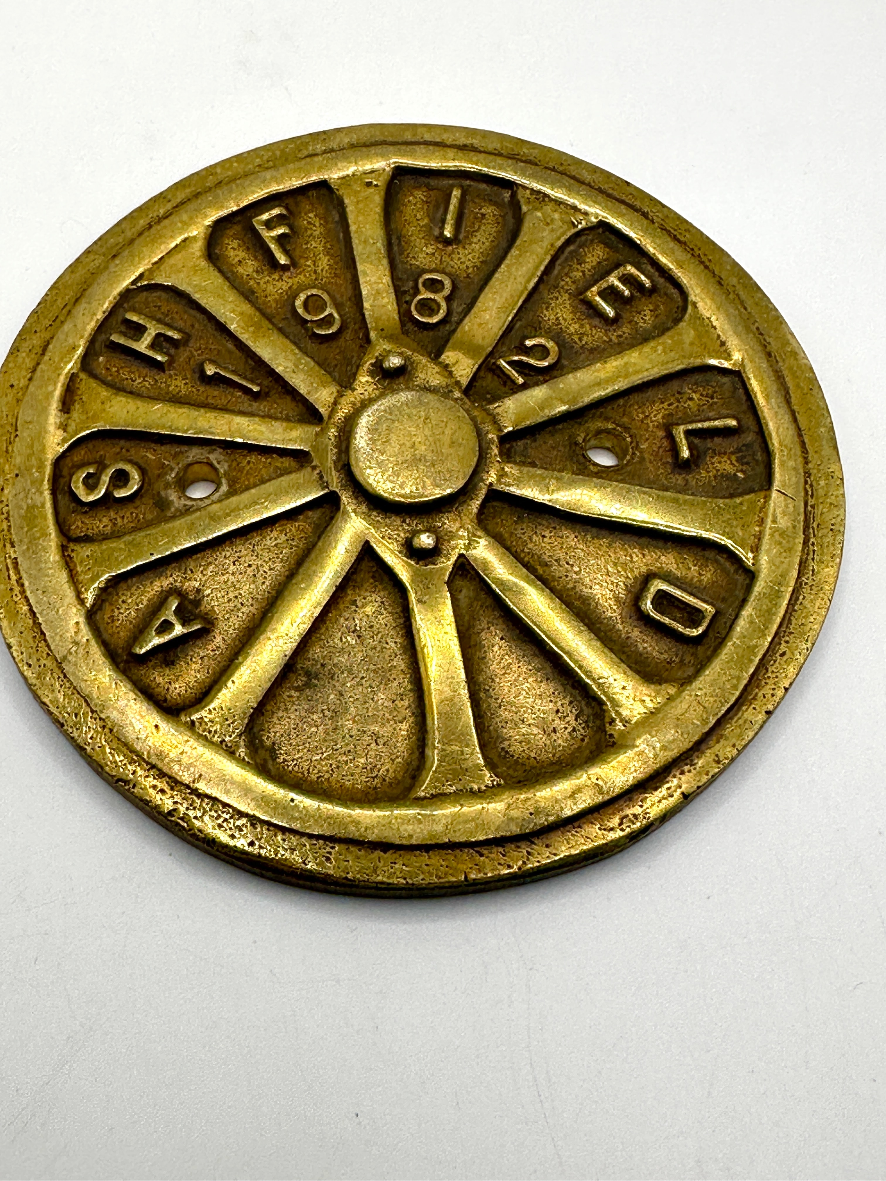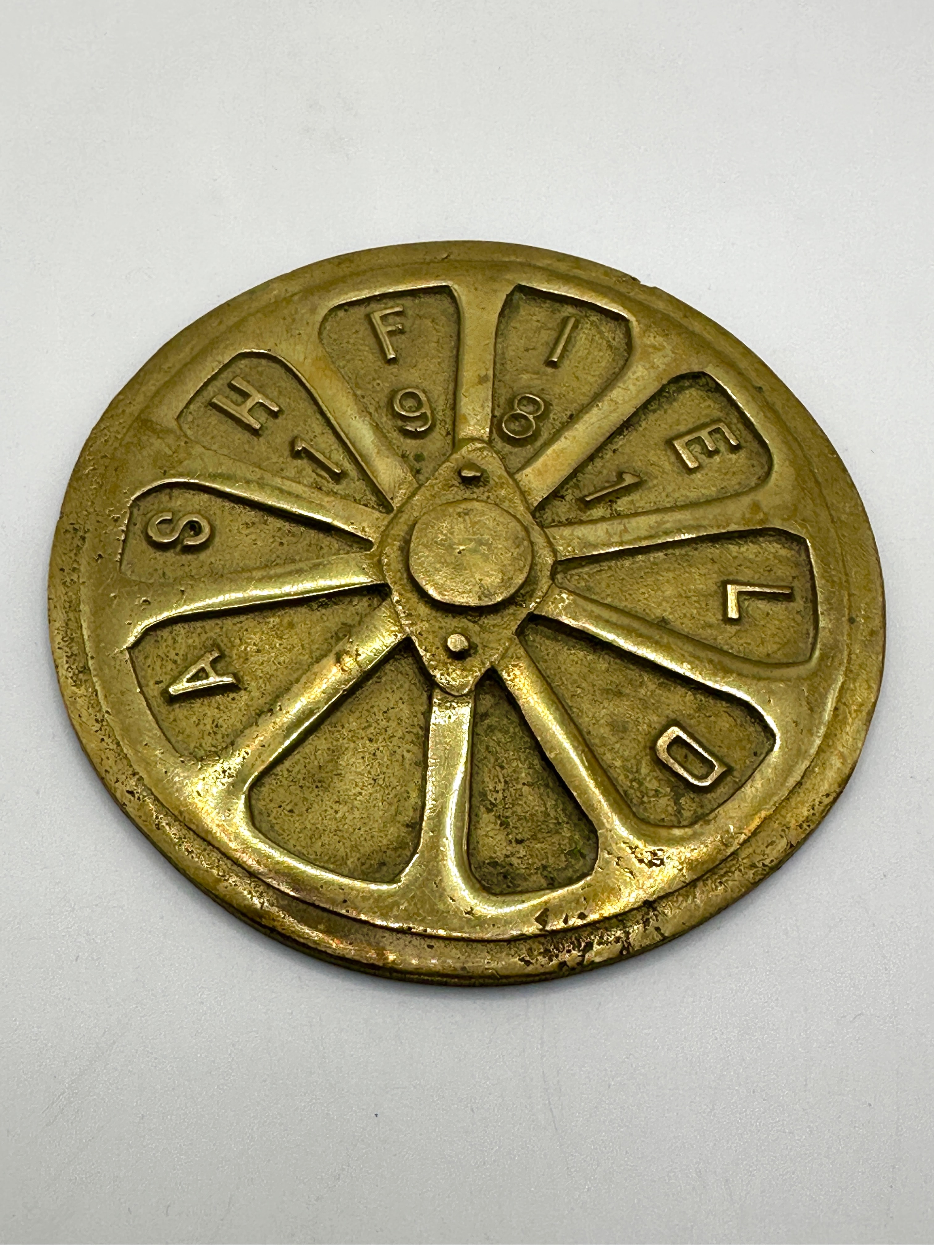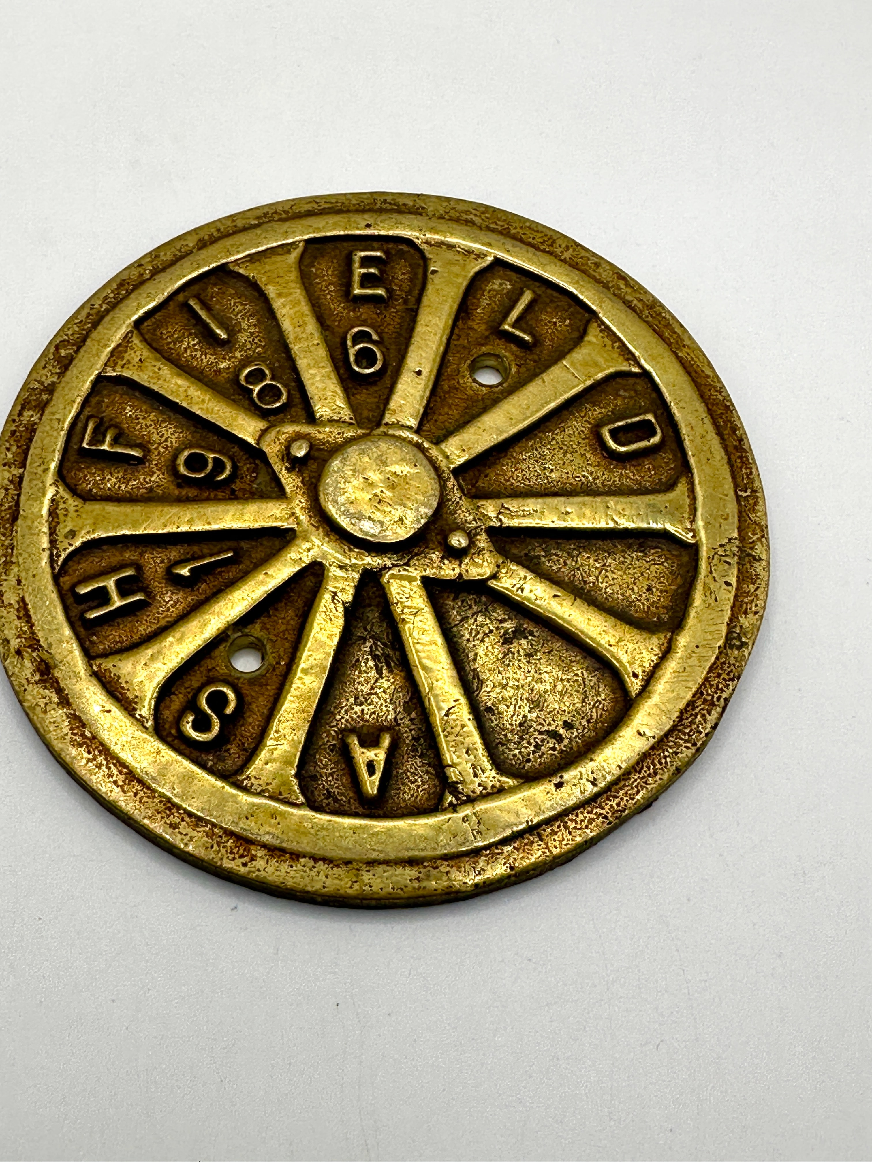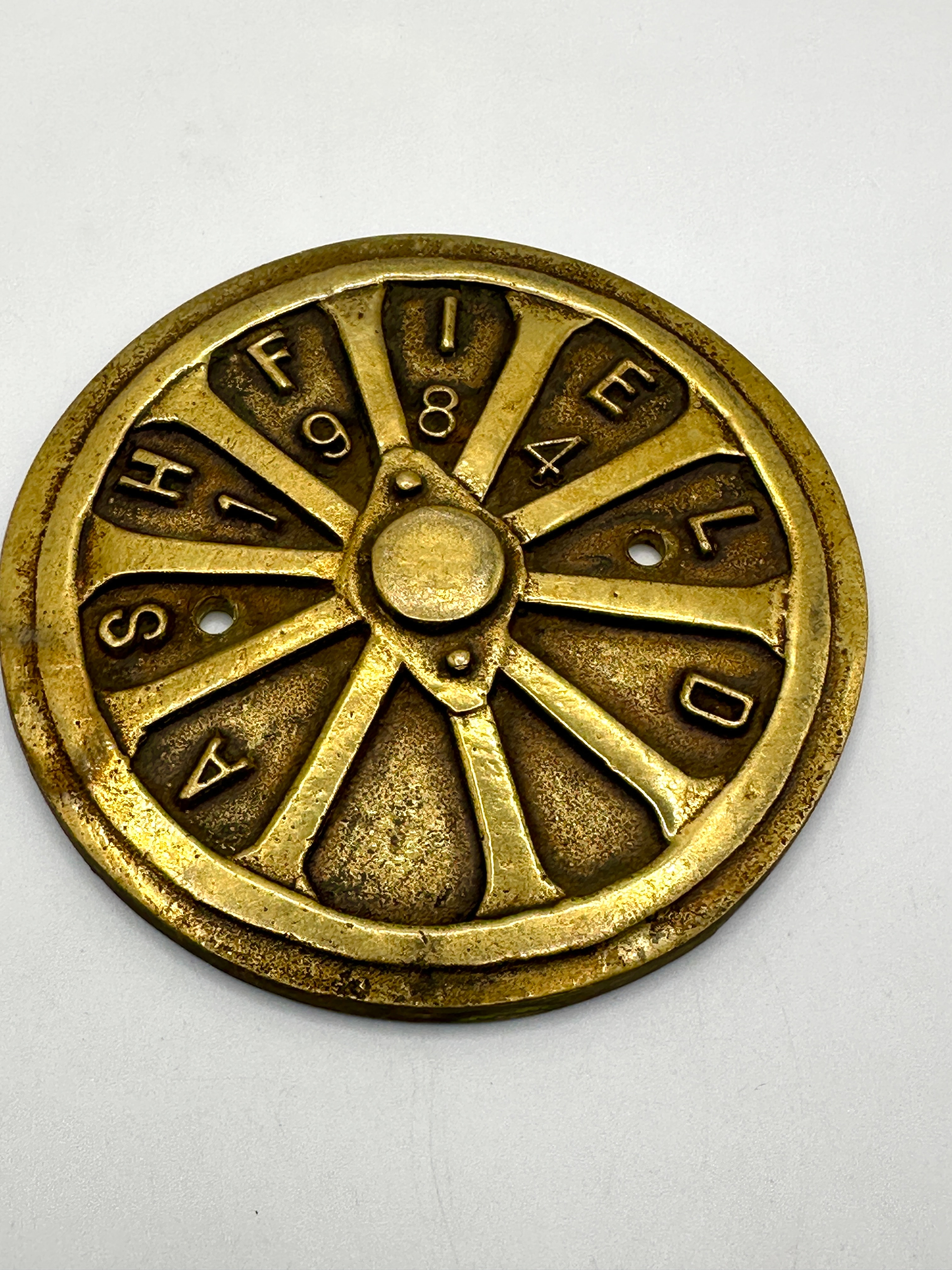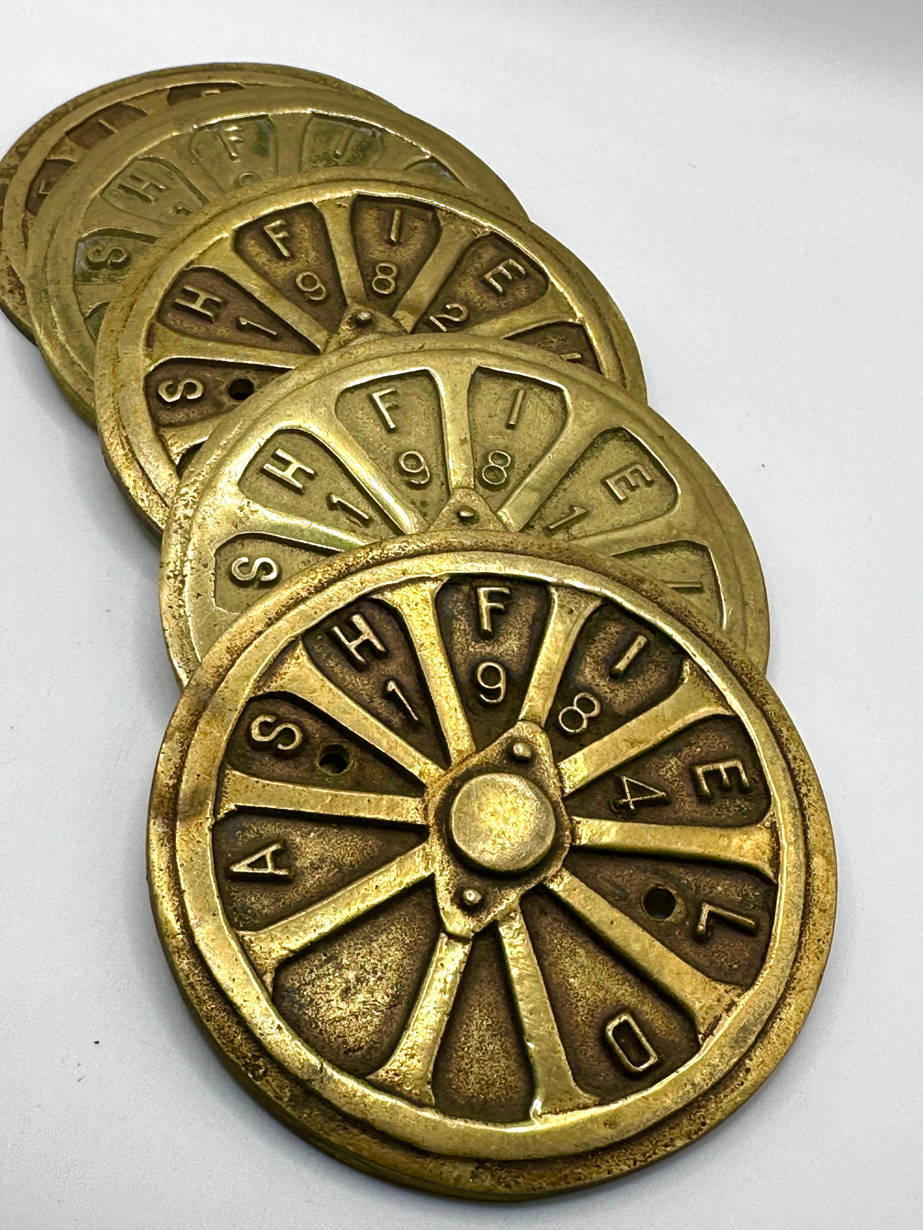 A set of five brass ‘Ashfield’ show plaques. Each circular, wheel-like cast metal disc features a central raised hub and ten radial segments enclosed by an outer rim. Around the perimeter, each segment is permanently inscribed with a raised letter, spelling out “A S H I F F I E L D” clockwise from the bottom-left segment. Within certain segments, there are punched or recessed numbers, such as ‘1’, ‘9’, ‘8’, ‘7’, and ‘0’ visible on the top disc, or small circular holes; these numbers appear to vary among the individual discs within the set, likely indicating specific dates or codes. The inscription ‘SHIFFIELD’ is a known misspelling of ‘Sheffield’ or a variant of ‘Ashfield’, consistent with the item’s likely origin or association with an industrial region.