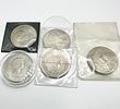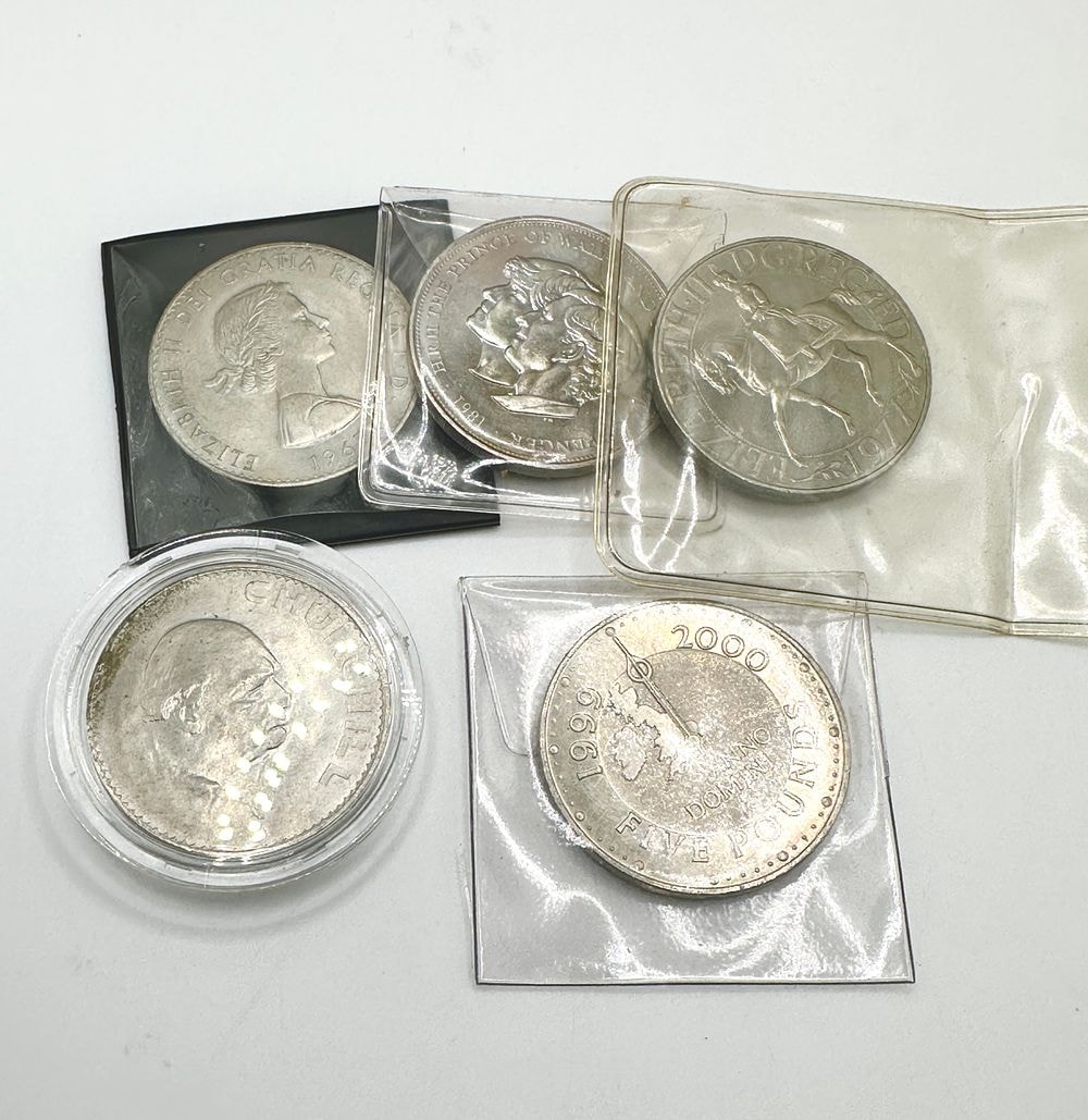 A collection of five silver-toned metal commemorative coins or medallions, each presented in individual clear plastic capsules or pouches. The lot includes a 1961 coin featuring a young Queen Elizabeth II with the legend “ELIZABETH II DEI GRATIA REGINA F.D.” A pair of coins from 1981 depict “H.R.H. THE PRINCE OF WALES” and “H.R.H. THE PRINCESS OF WALES” respectively. Another coin displays a figure on horseback and the denomination “ONE CROWN”. A distinct coin dated 1965 shows a portrait identified as “CHURCHILL”. The final piece, dated 2000 and also bearing “1955”, features a stylized map and clock with “FIVE POUNDS” inscribed.