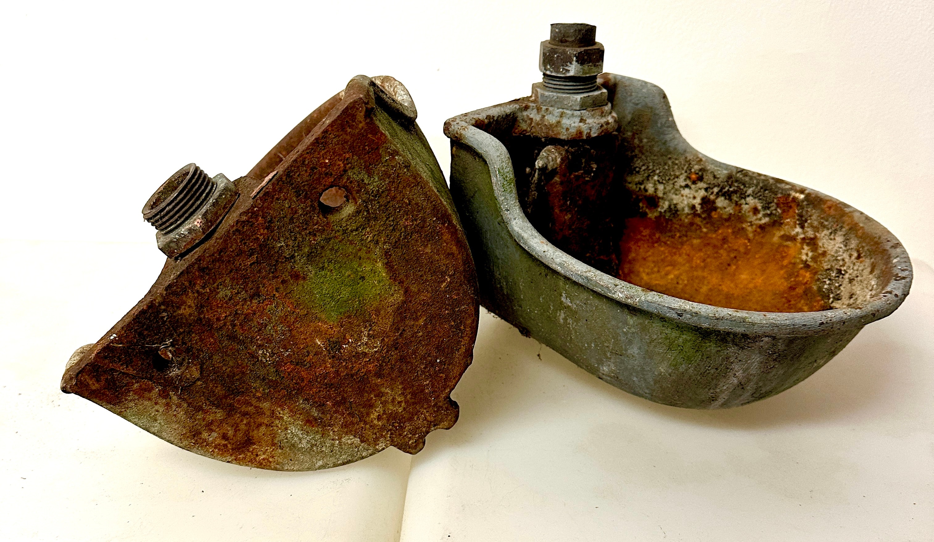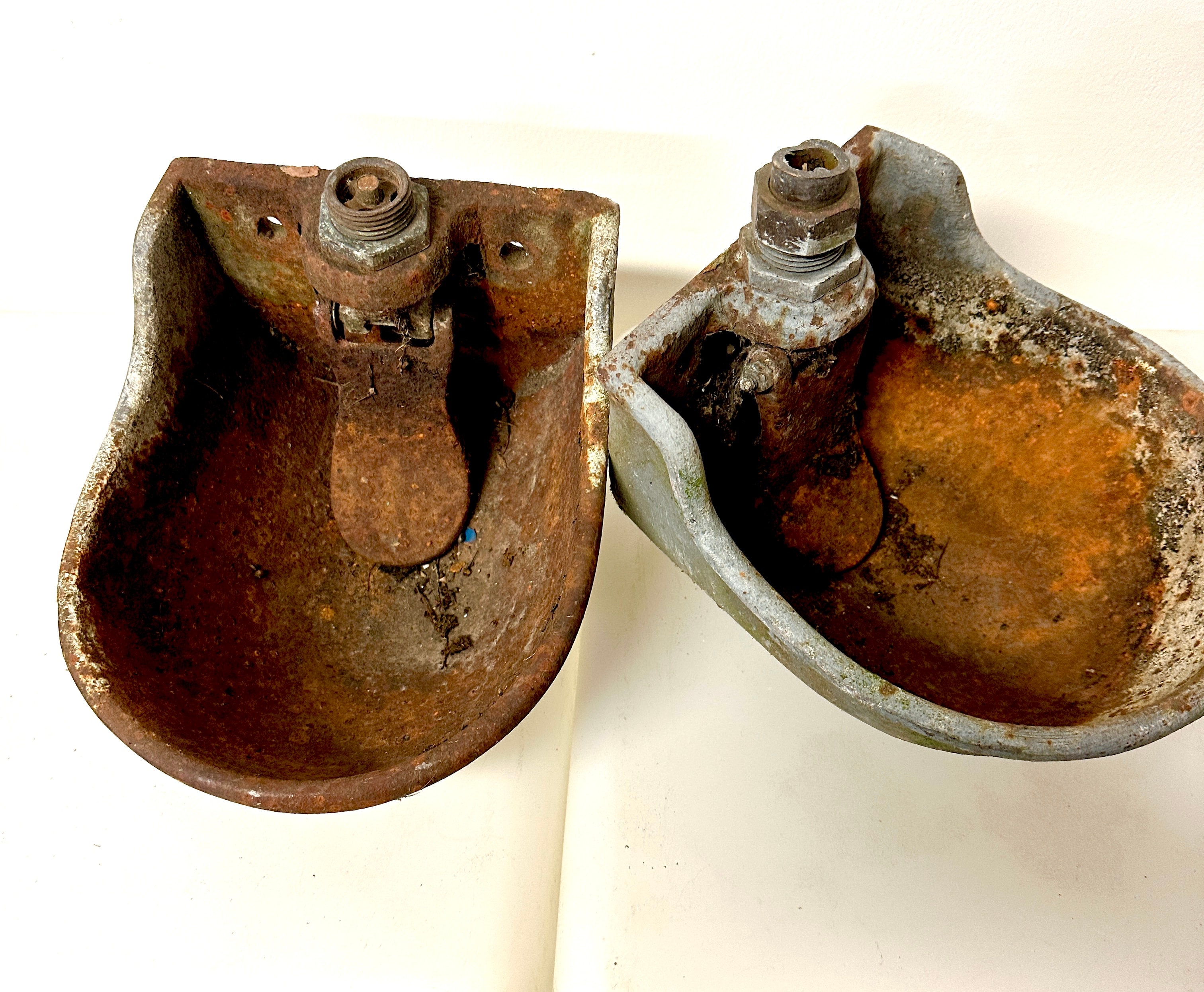 A pair of weathered, utilitarian automatic animal watering bowls, likely for livestock, constructed from heavy, ferrous metal consistent with cast iron. Each bowl features threaded brass or bronze fittings at the top for water connection and a paddle-style valve mechanism within the basin. No discernible manufacturer’s marks or text are visible.
