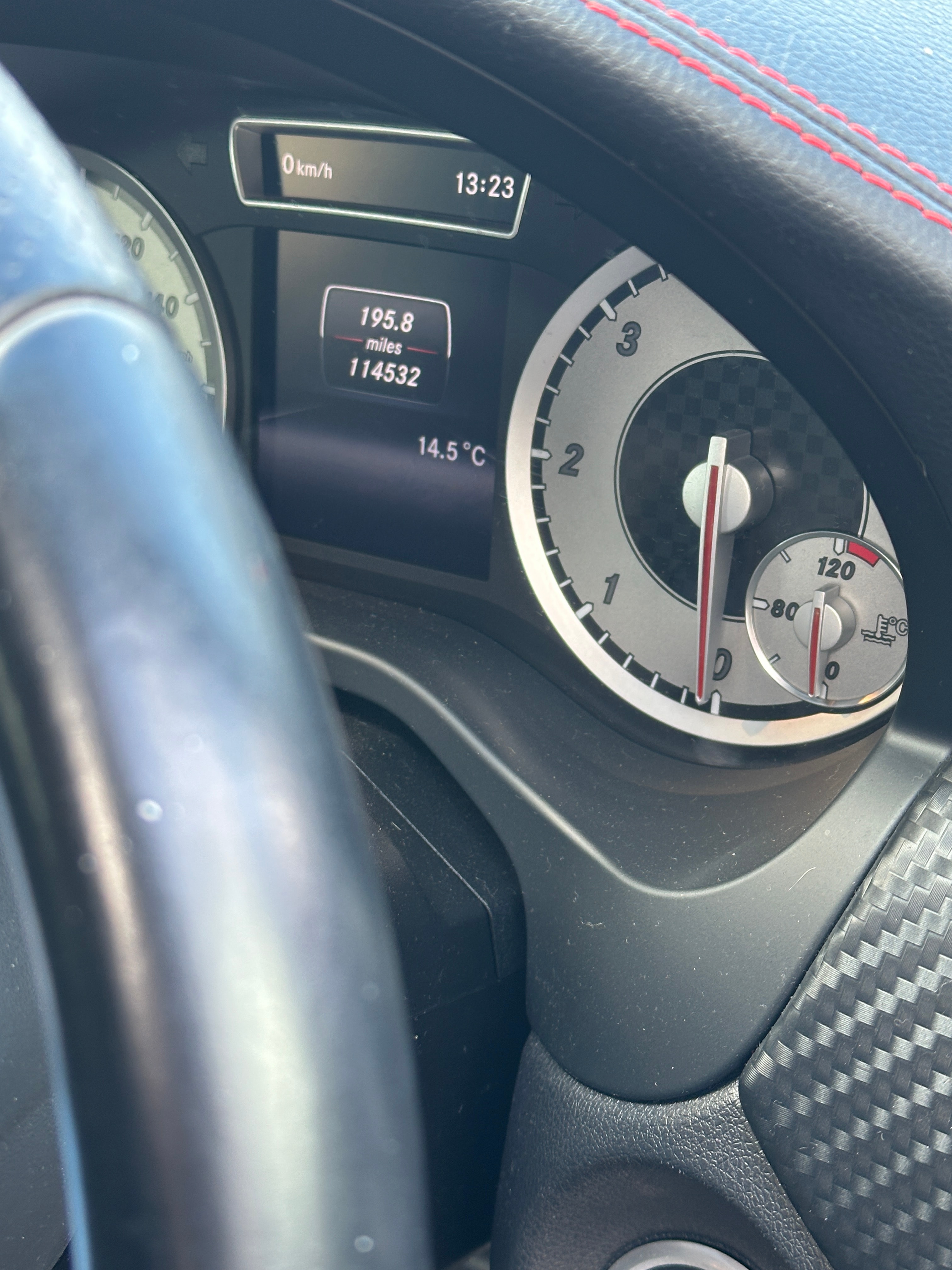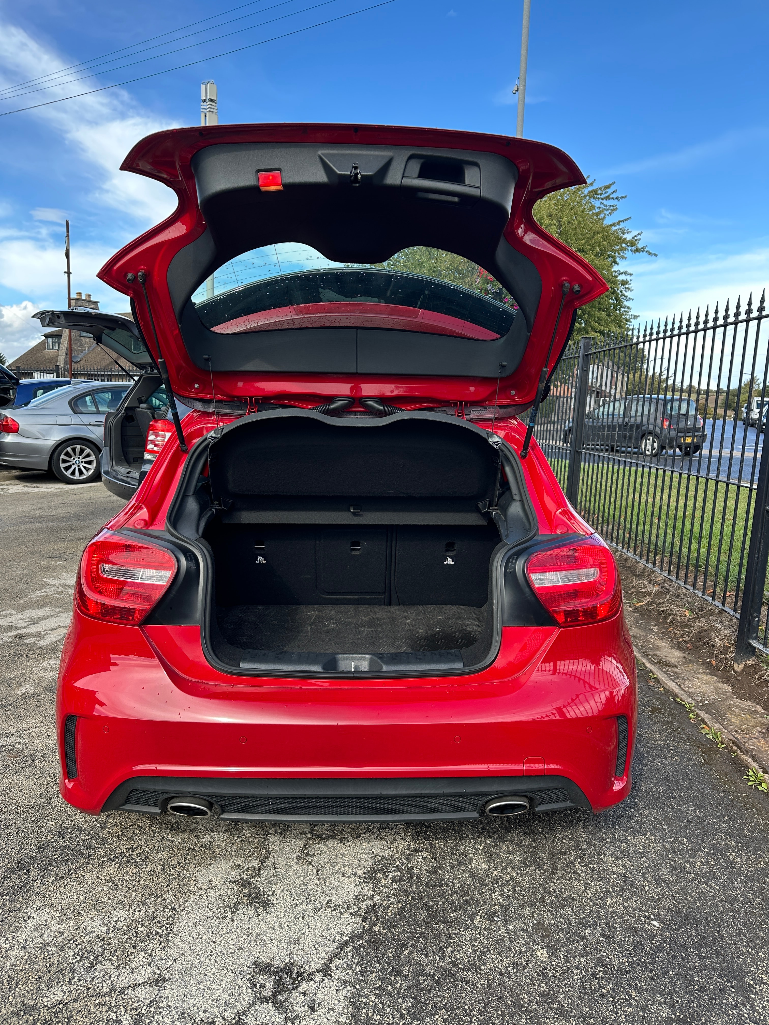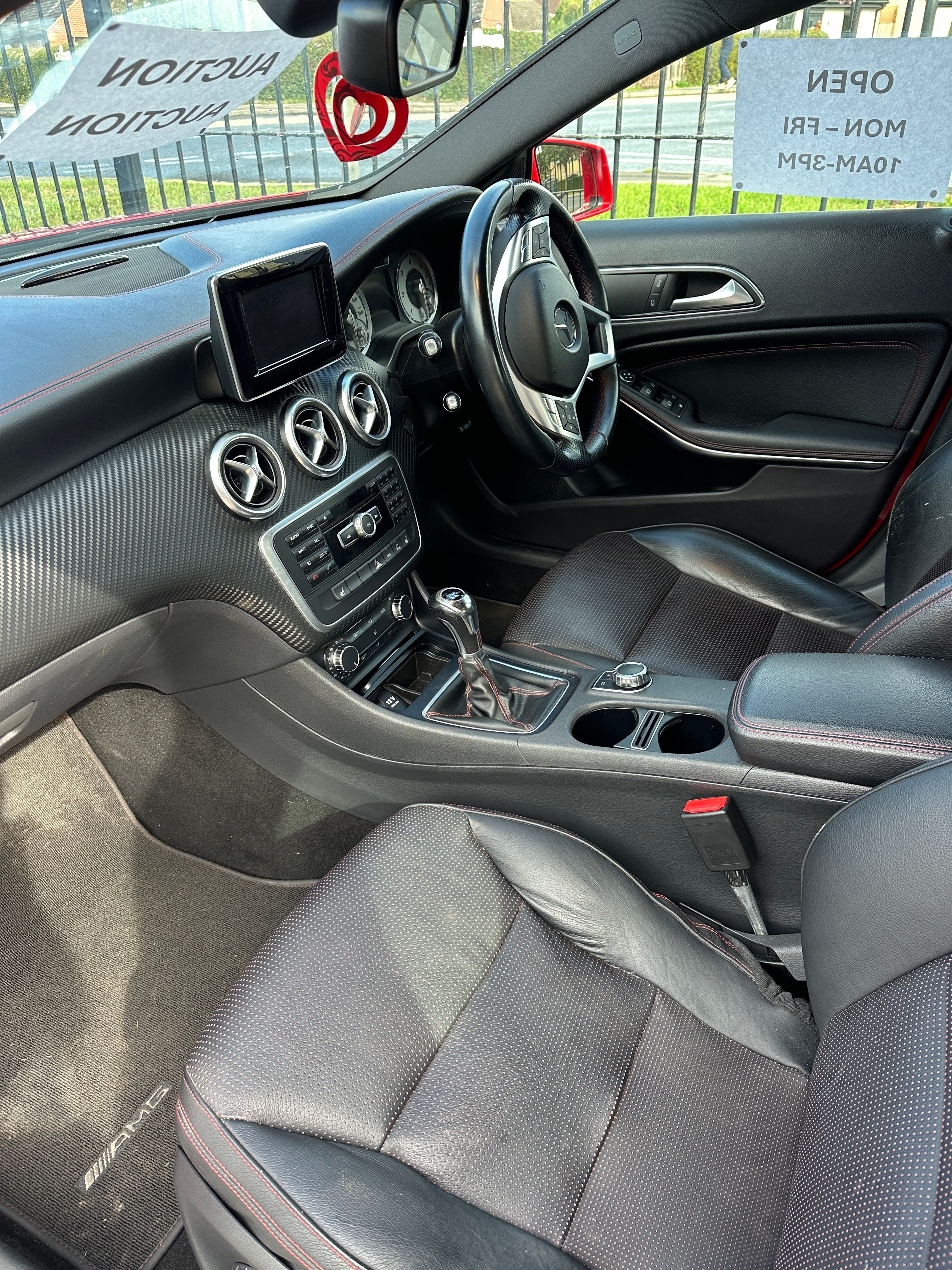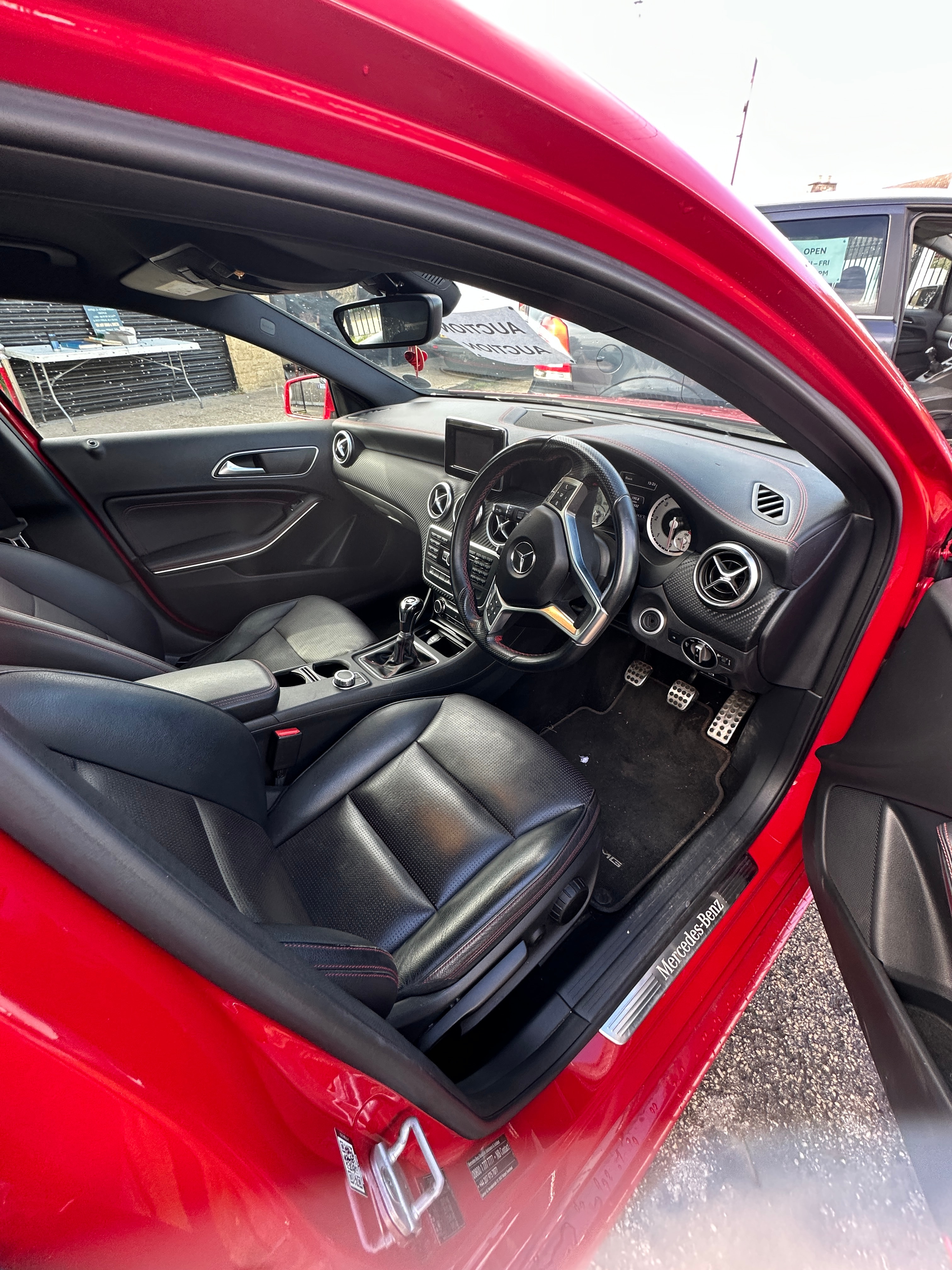 A Mercedes-Benz A200 AMG Line hatchback, finished in red with a five-door configuration. The vehicle is identified by visible rear badging as an A 200 CDI model. It features black multi-spoke alloy wheels and a black rear spoiler. The UK license plate displays “FJ63”, indicative of a 2013-2014 registration period. The interior is appointed with black leather seats featuring red contrast stitching, “AMG” branded floor mats, and a dashboard with carbon-fiber look trim. The odometer reads 114,532 miles. Comes with 2 Keys.