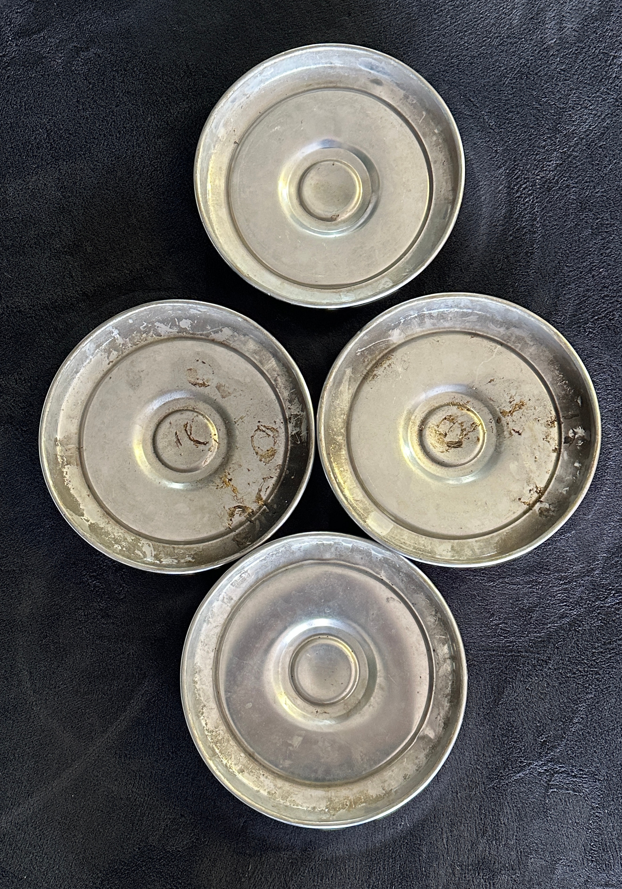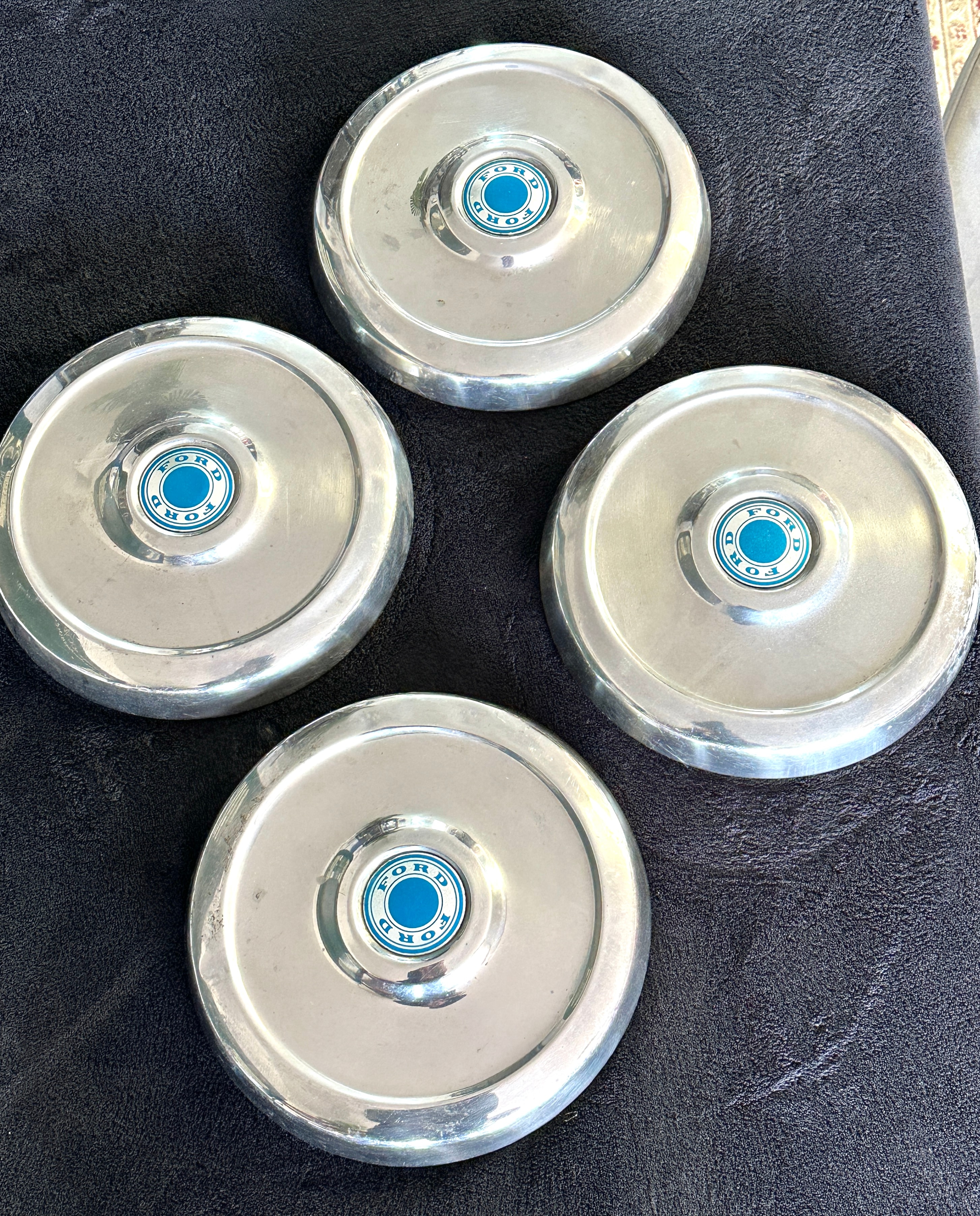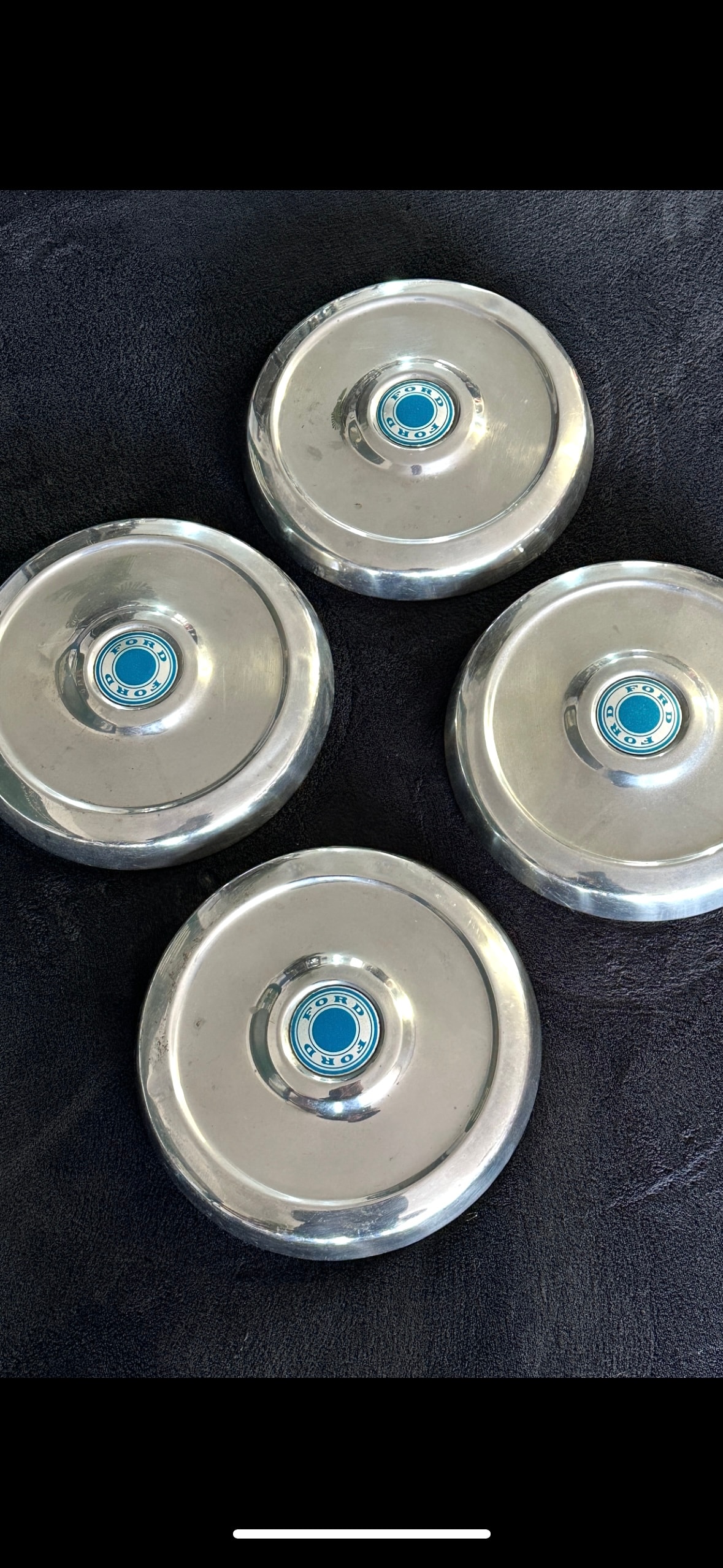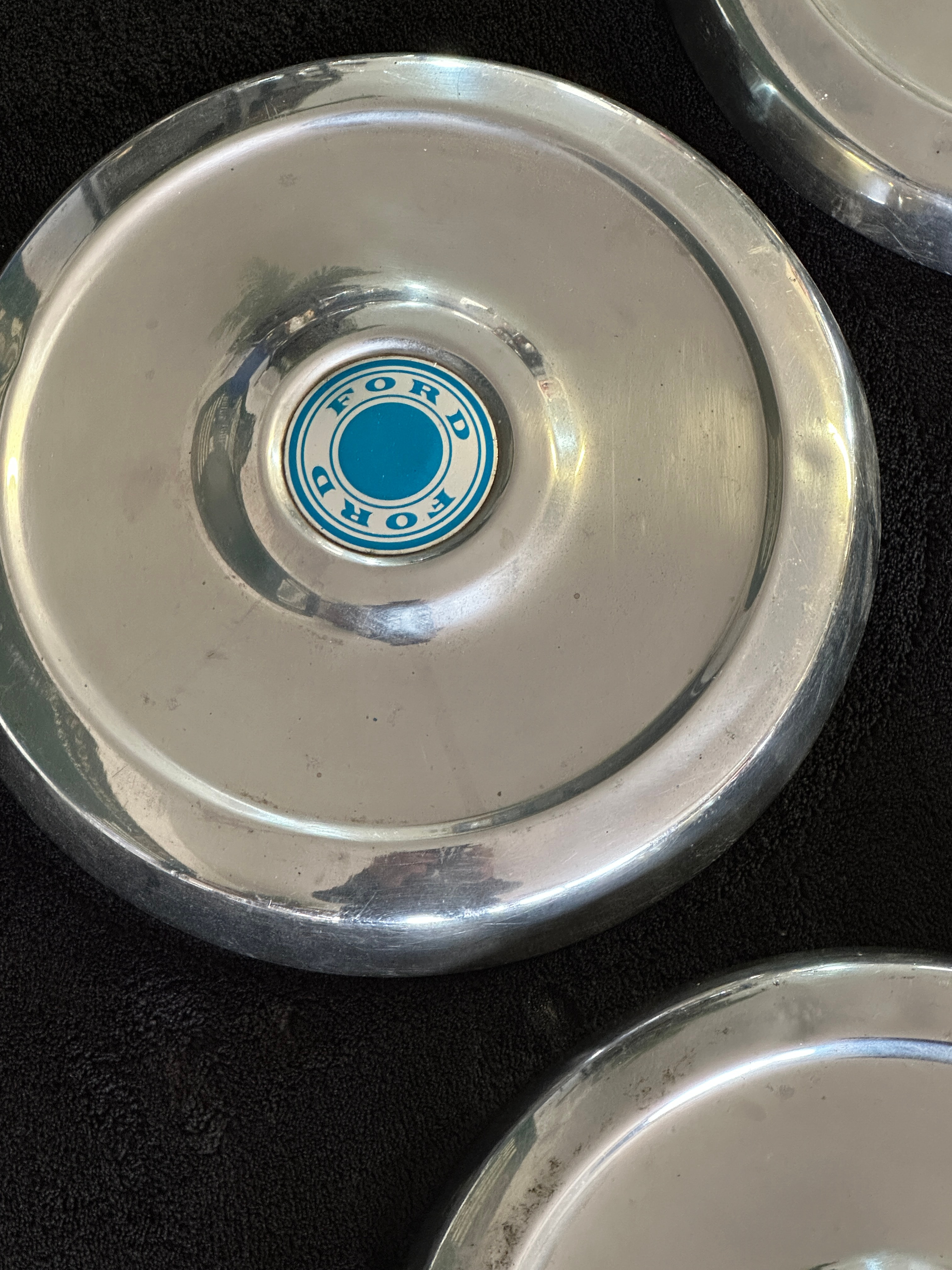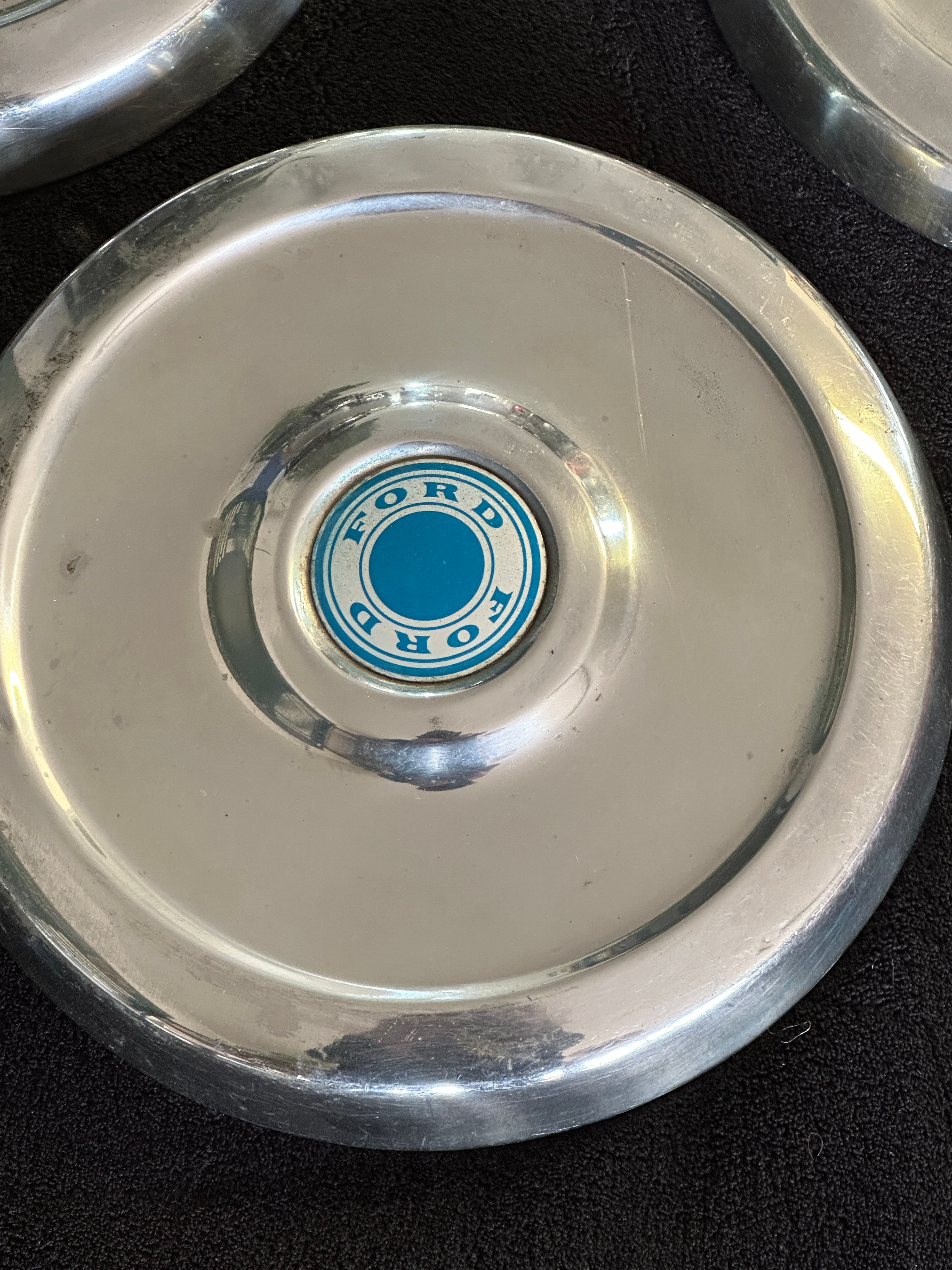A set of four Ford Escort MK1 wheel trim hub caps. These are circular automotive hubcaps, presented in a “dog dish” style, crafted from polished metal, likely chrome-plated steel or stainless steel. Each hubcap features a plain, convex design with a central domed area containing a blue circular emblem. This emblem displays the word “FORD” in white capitalized letters, encircled within the blue field.