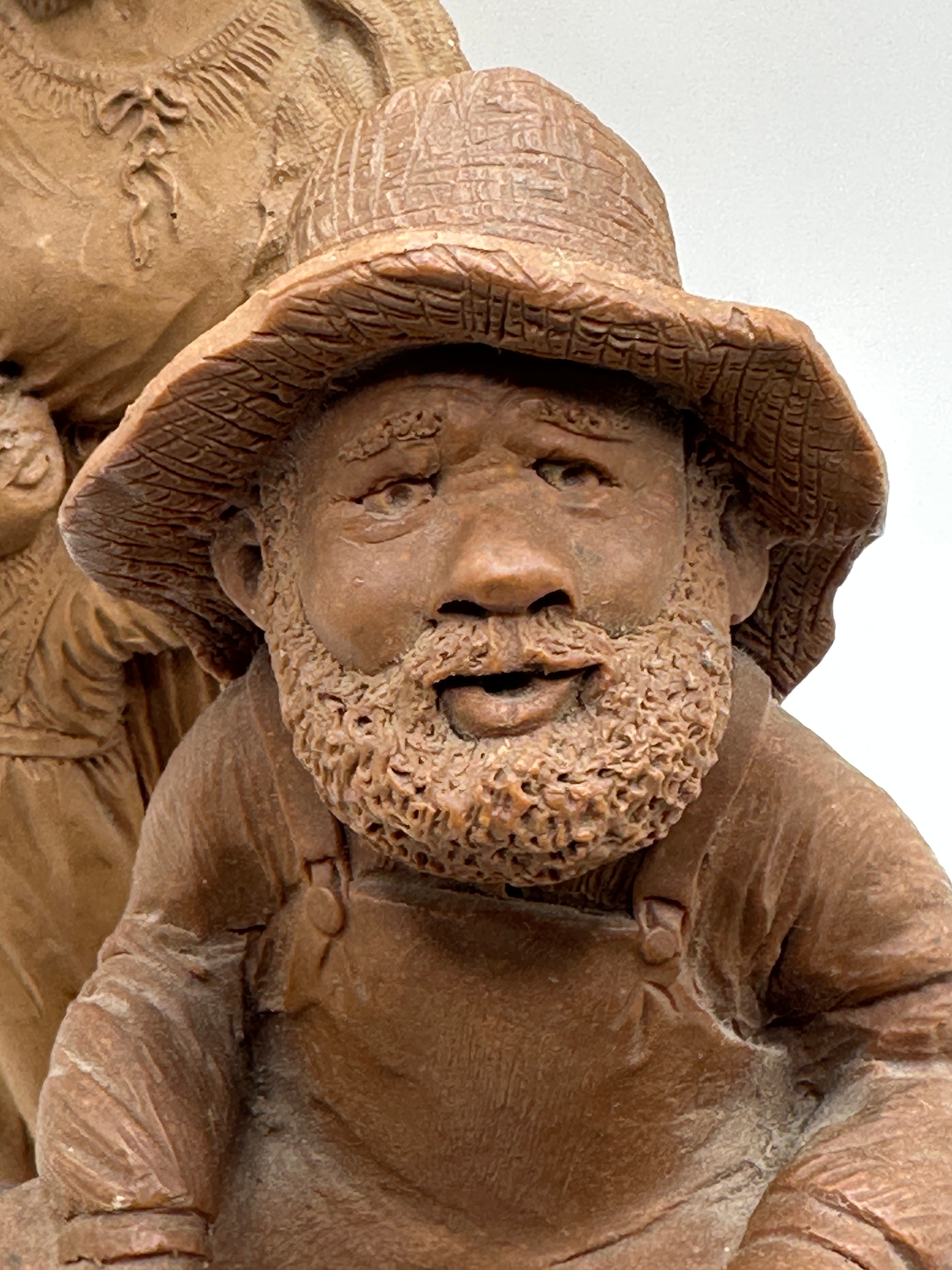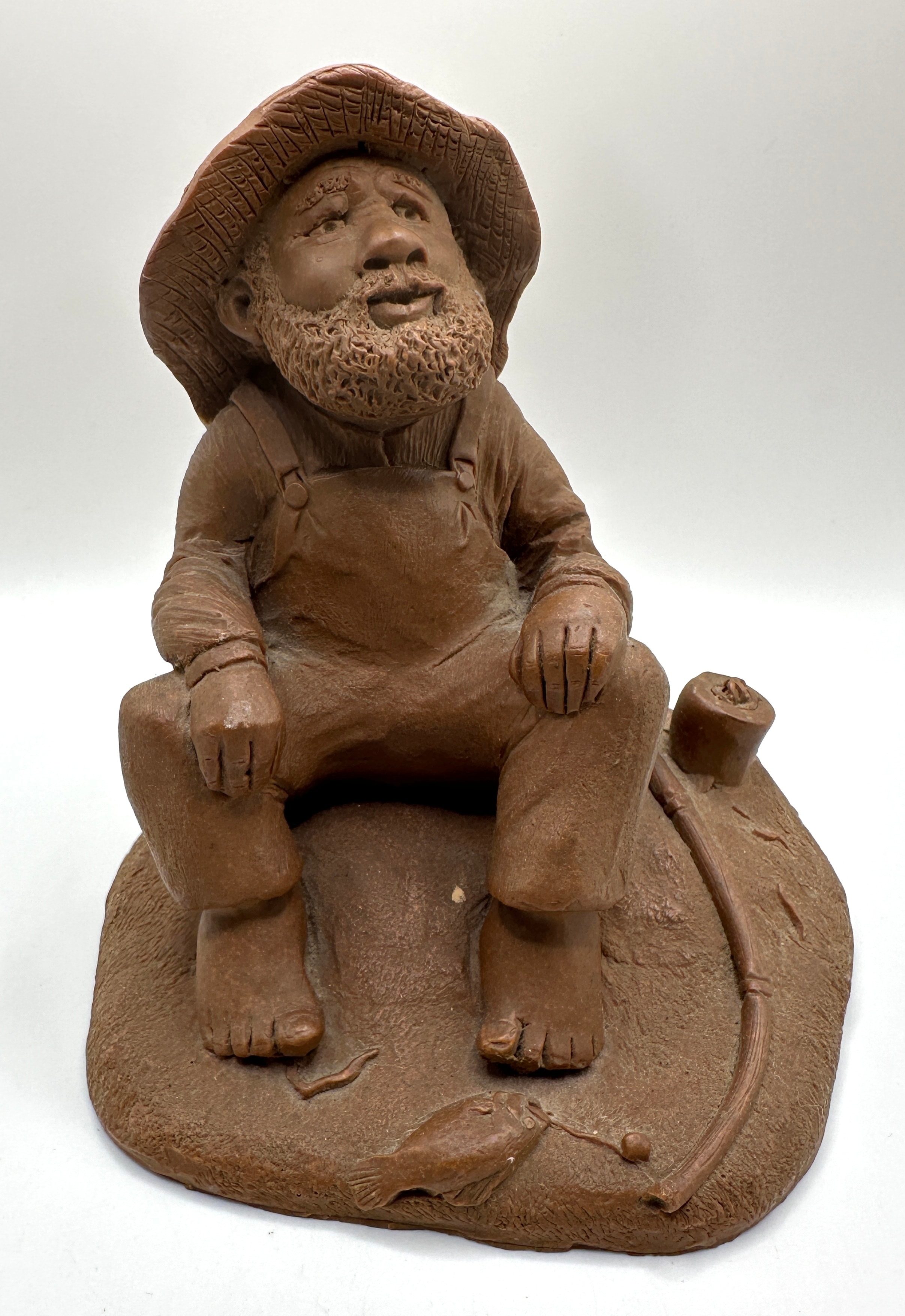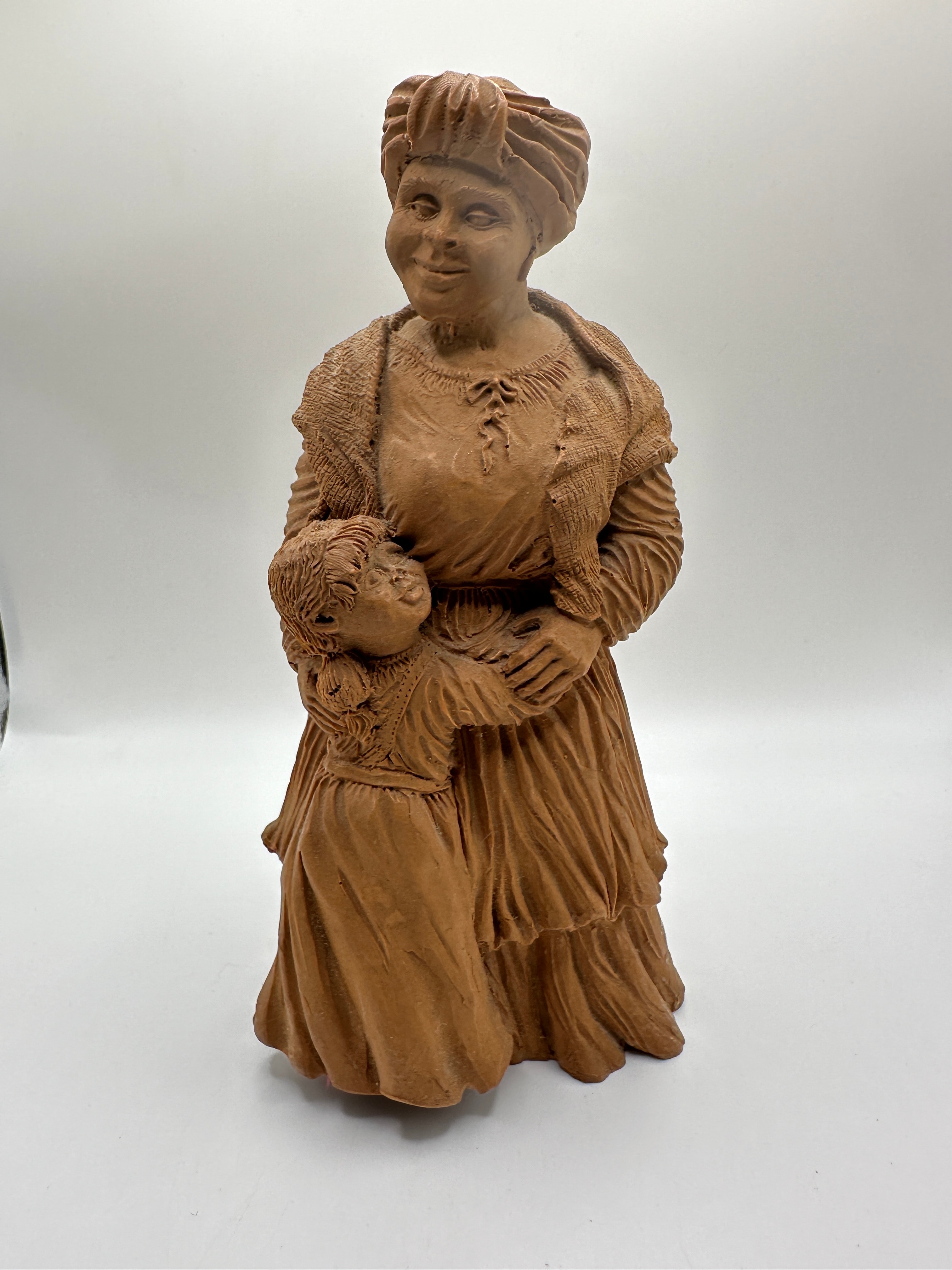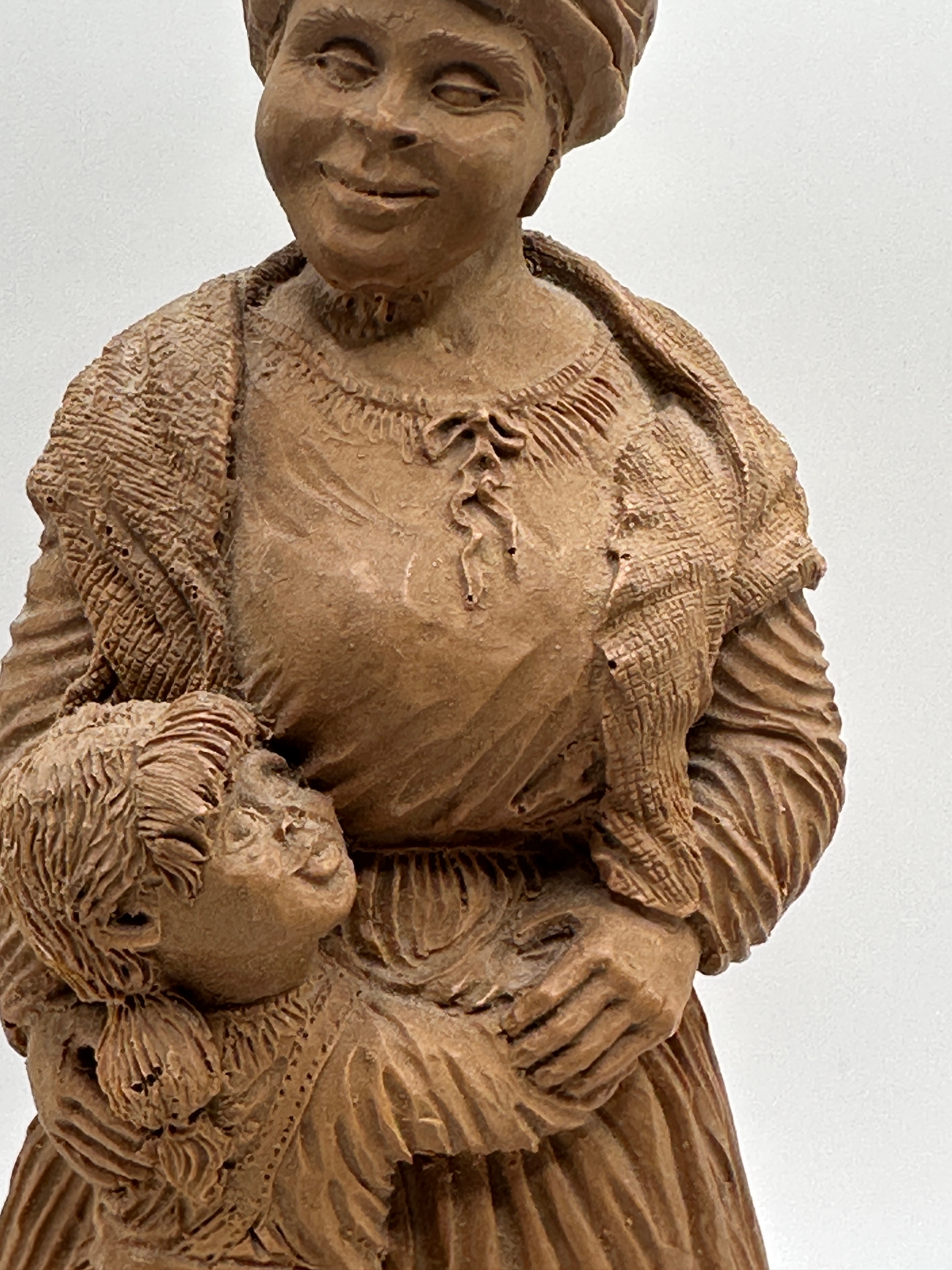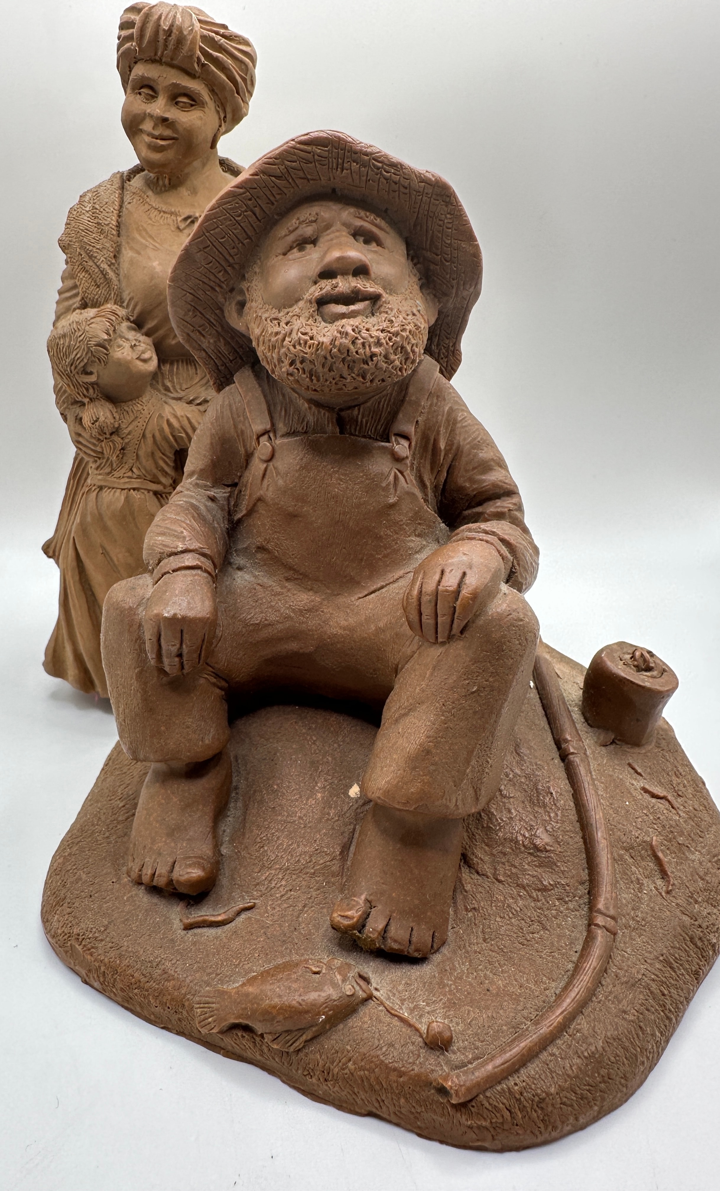 A pair of pecan resin figurines, rendered in a folk art or Black Americana style. One sculpture depicts a standing woman adorned in a headwrap and period-style dress with a shawl, embracing a young child looking upwards. The second sculpture portrays a seated, barefoot, bearded man in overalls and a wide-brimmed hat, posed on a textured base beside a fishing rod and a small fish. Both pieces exhibit a matte, reddish-brown textured finish, with detailed textures on clothing, hair, and facial features. No visible text, signatures, or maker’s marks are apparent.