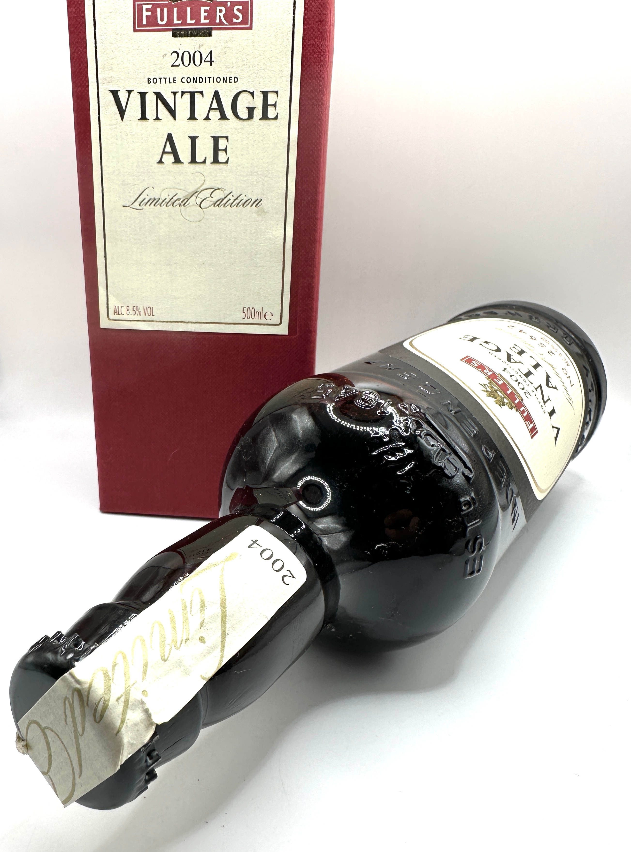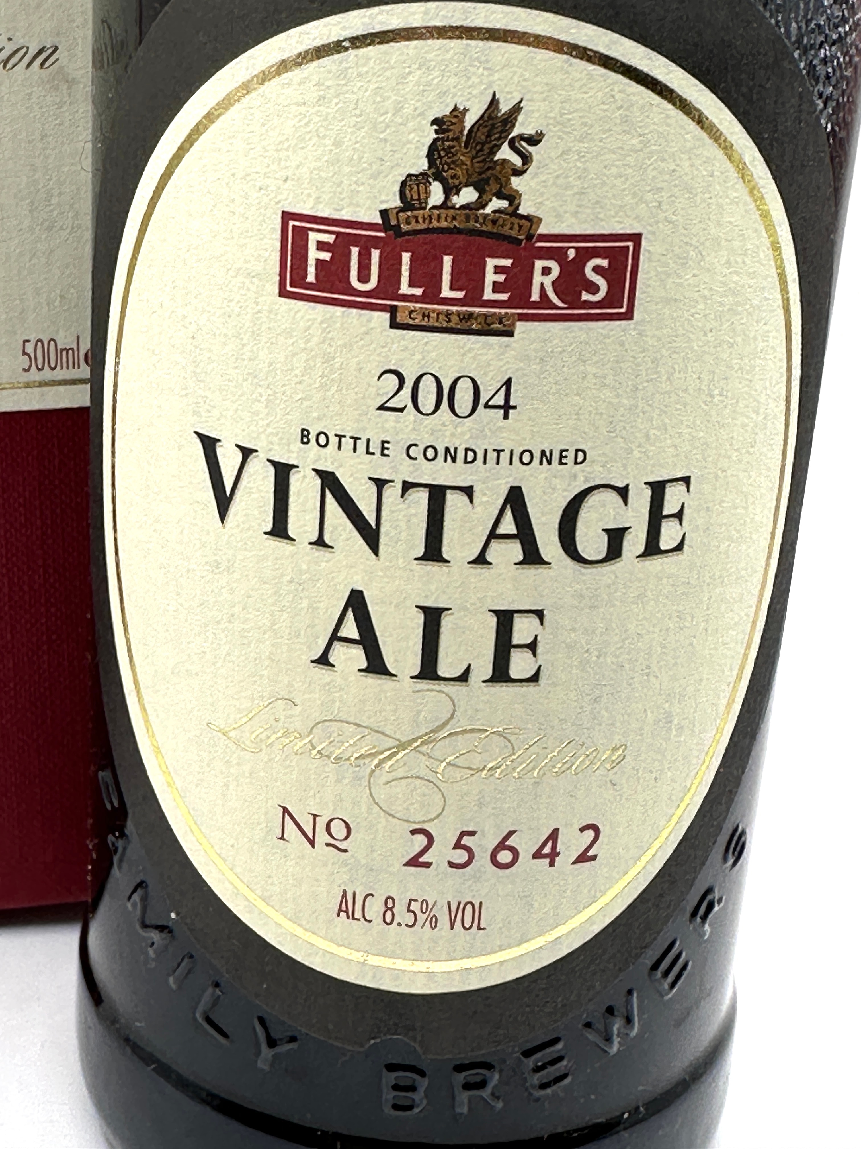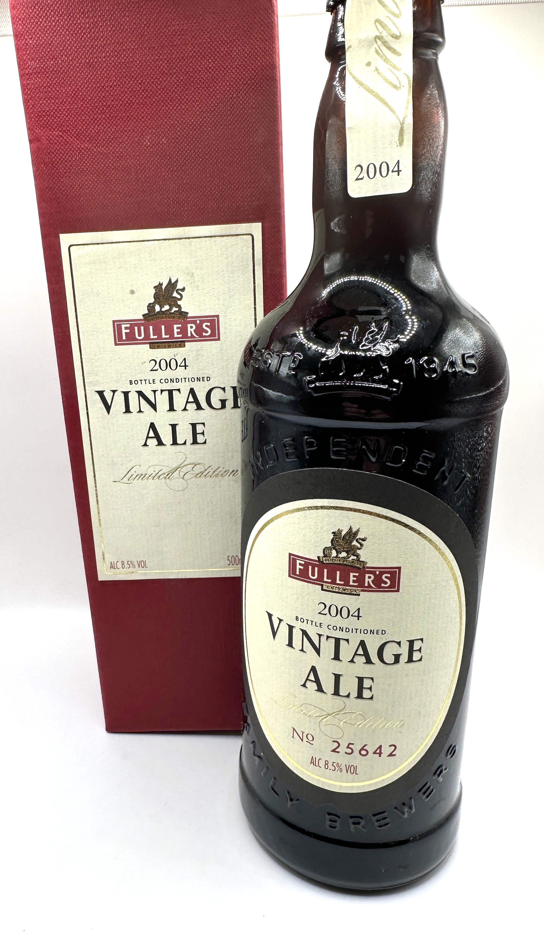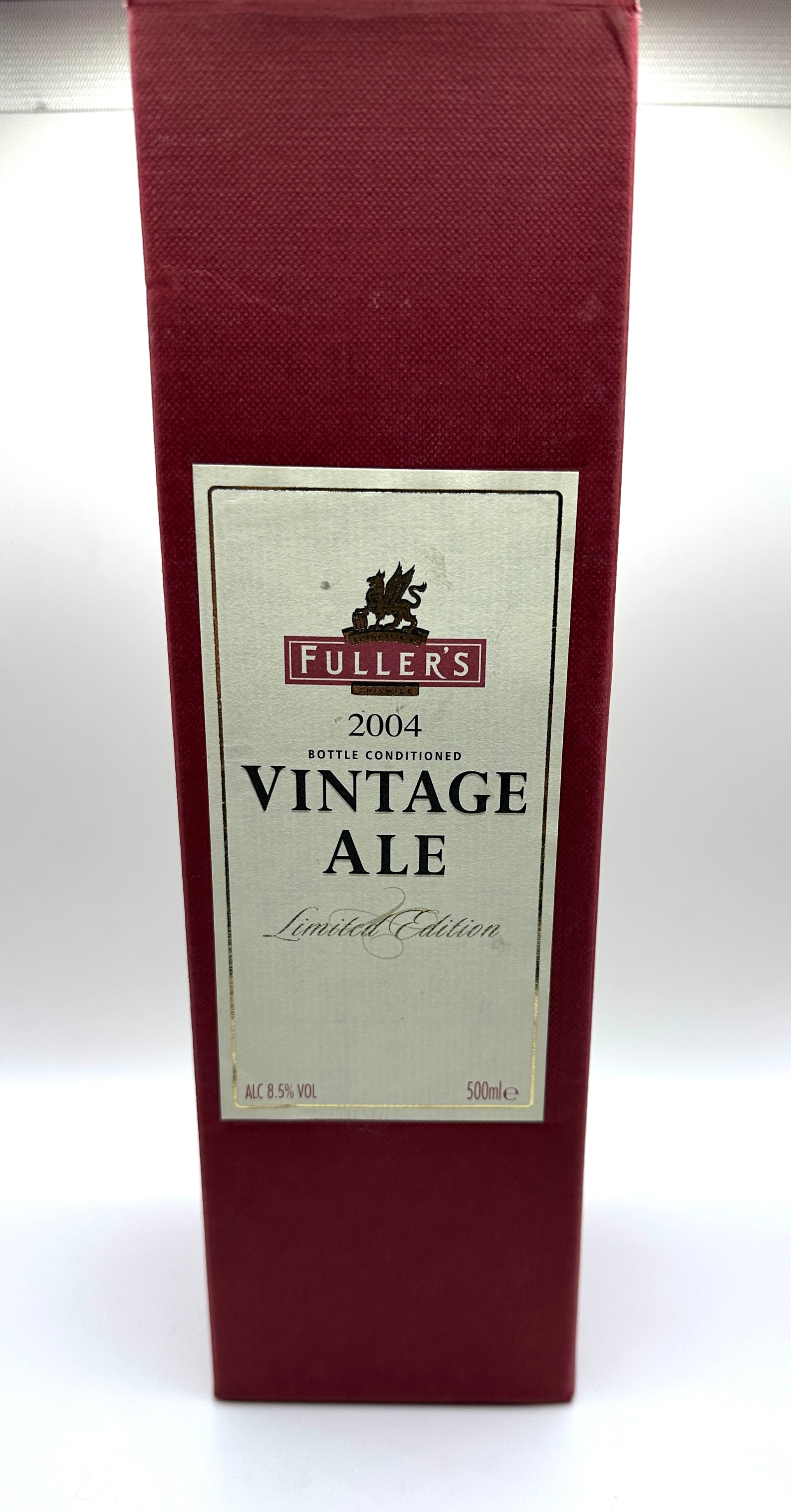 A bottle of Fuller’s 2004 Vintage Ale, Limited Edition, presented in its original dark red cardboard presentation box. The dark glass bottle and box feature cream and gold labels with a griffin emblem, ‘FULLER’S, ‘ ‘CHISWICK, ‘ ‘2004,’ ‘VINTAGE ALE, ‘ ‘BOTTLE CONDITIONED, ‘ and ‘Limited Edition.’ The bottle’s main label is numbered ‘No 25642’ and indicates ‘ALC 8.5% VOL’ and ‘500ml e.’ Embossed text on the glass reads ‘EST. 1845,’ ‘INDEPENDENT, ‘ and ‘FAMILY BREWERS.’ A neck label also specifies ‘2004’ and ‘Limited Edition.’ The bottle is secured with a crown cap.