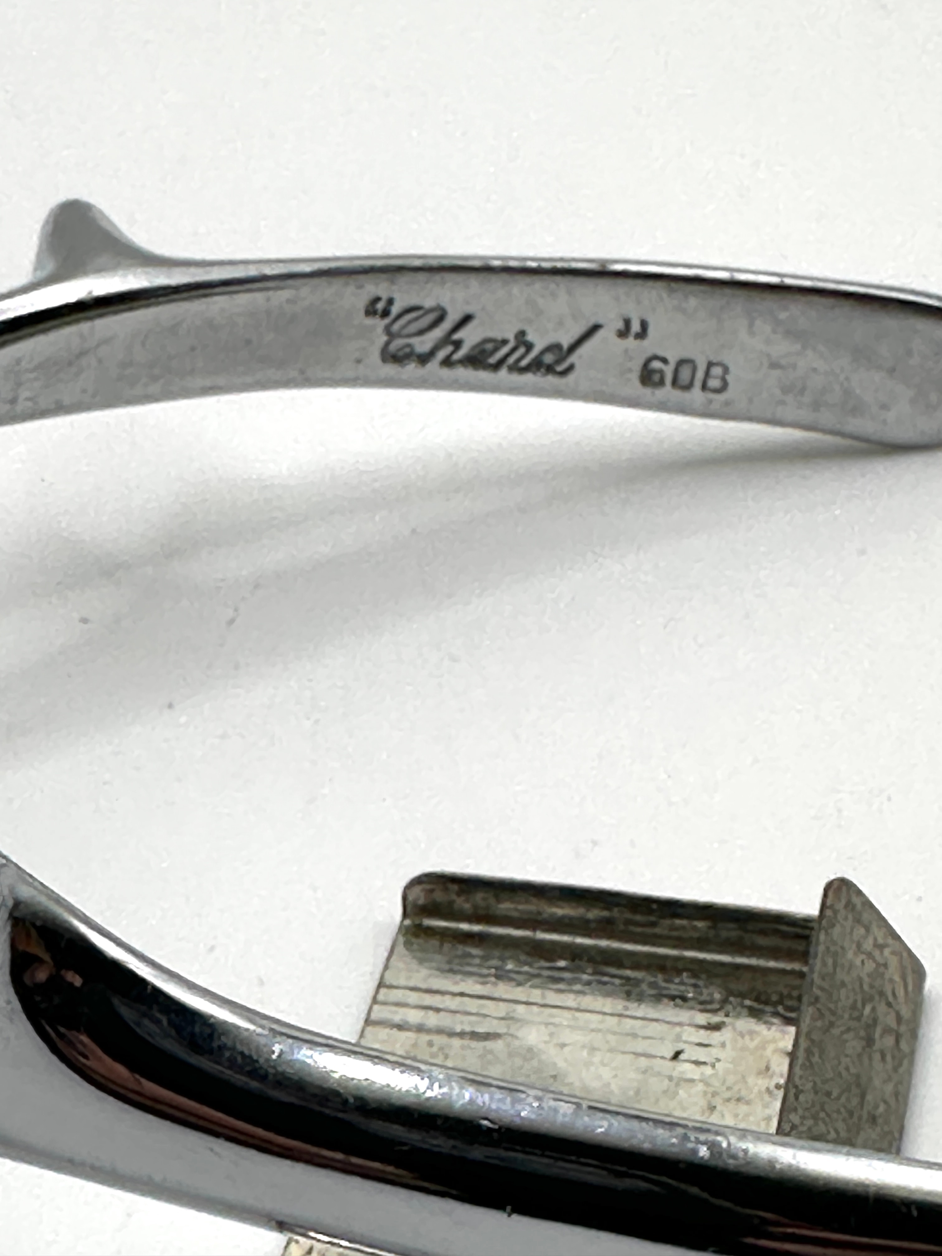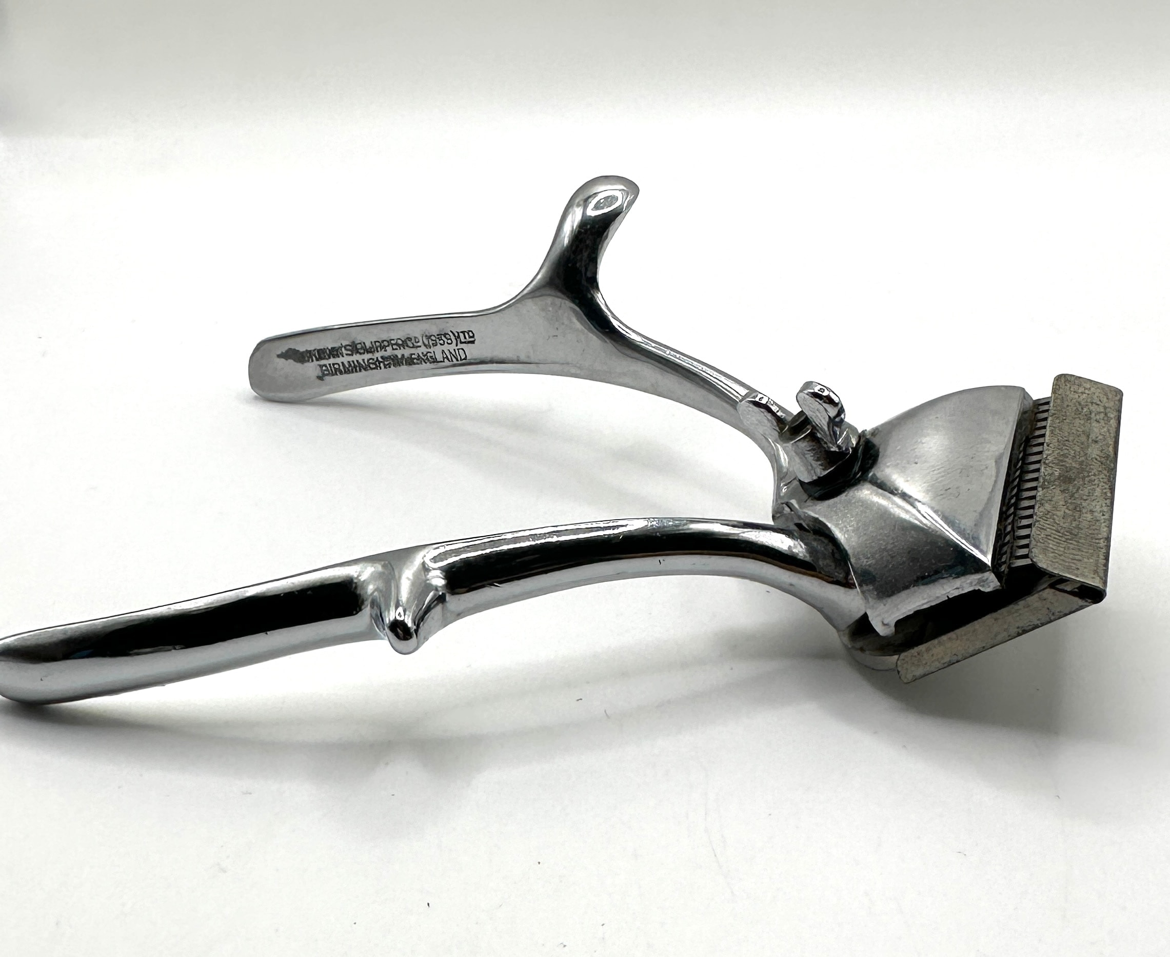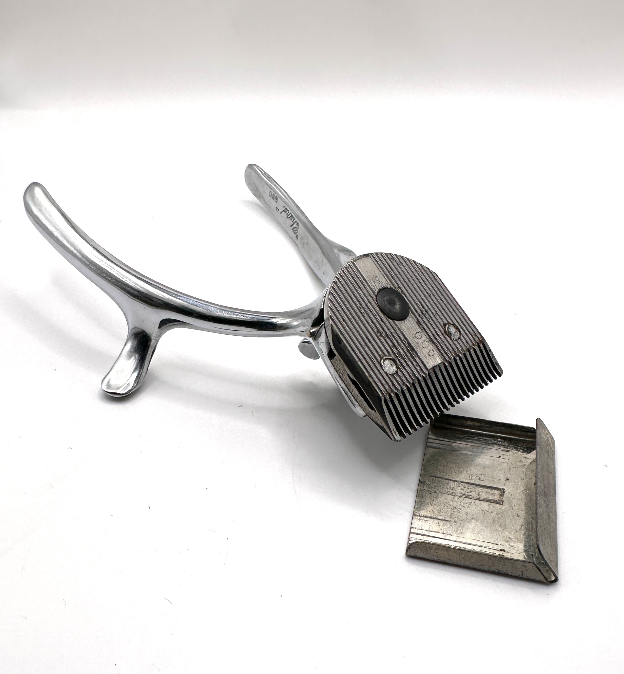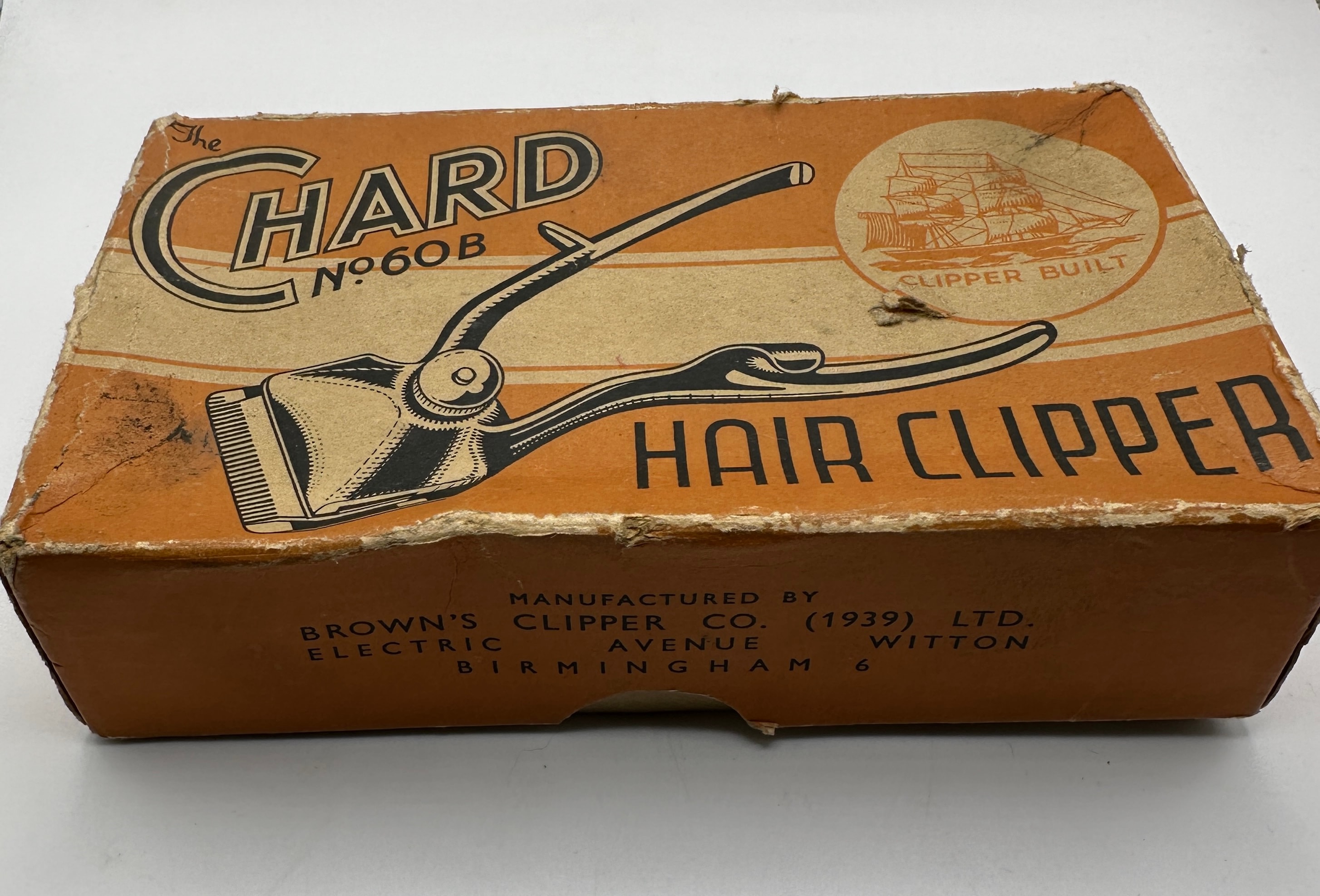 A vintage ‘Chard’ No. 60B manual hair clipper, manufactured by Brown’s Clipper Co. (1939) Ltd. of Electric Avenue, Witton, Birmingham, England. The clipper is primarily constructed from polished metal, likely chrome-plated steel, featuring a two-handled, pincer-style design with a comb-like cutting head. It is presented in its original orange cardboard box, which is branded ‘The CHARD N°60B HAIR CLIPPER’ and reiterates the manufacturer details. The box also features an illustration of a clipper and a sailing ship with the text ‘CLIPPER BUILT’. An instruction sheet, printed in English and French and marked ‘AVIS’ and ‘IMPRIMÉ EN ANGLETERRE’, is partially visible within the box.