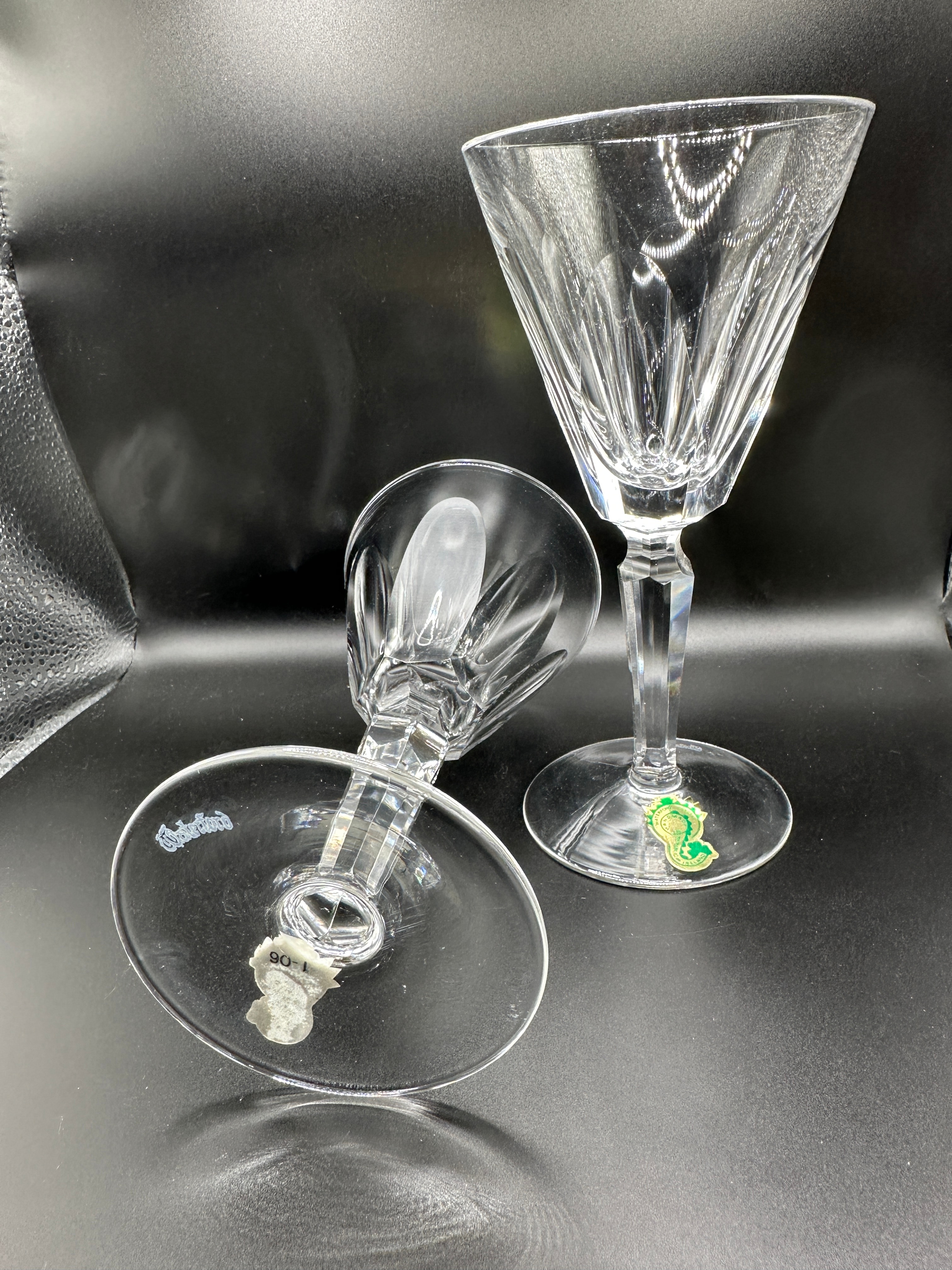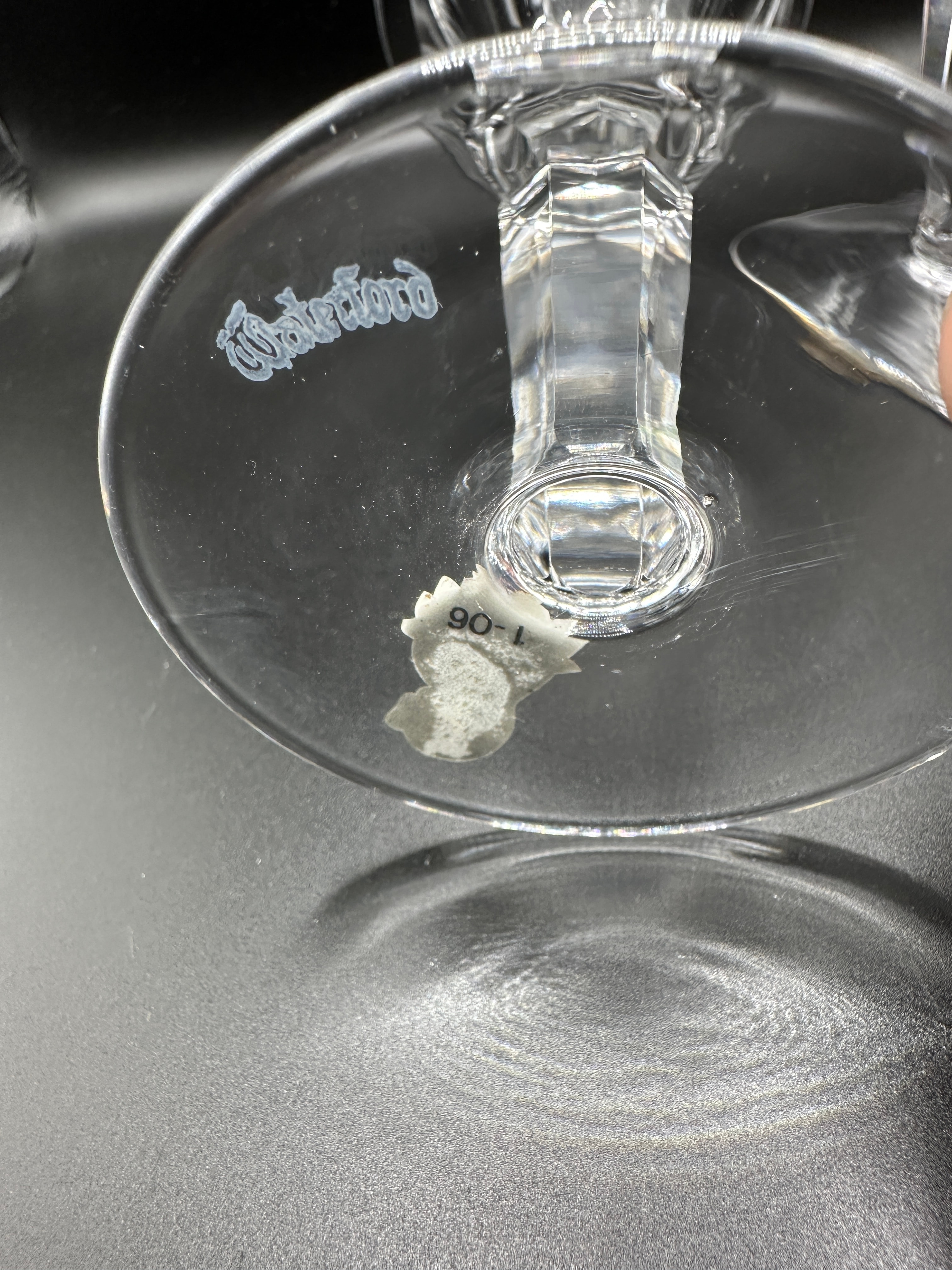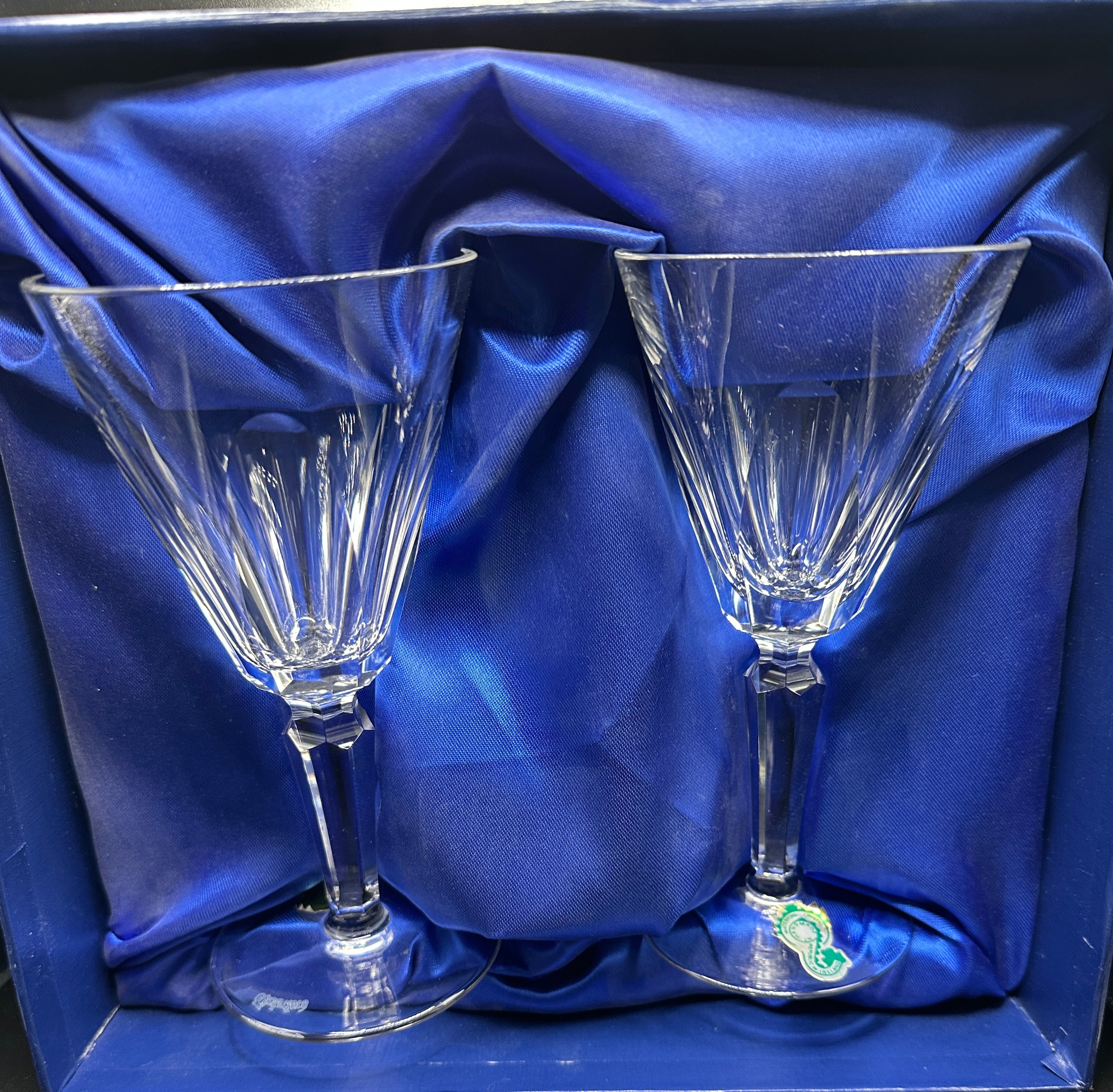A pair of Waterford ‘Sheila’ pattern cut crystal claret wine glasses. Each glass features a faceted bowl with vertical cuts and a hexagonal faceted stem, resting on a round base. The word “Waterford” is etched in a stylized script onto the base of each glass, accompanied by a partial sticker marked “90-L”. A green foil sticker with a gold design is also present on the base of each glass. The glasses are presented in their original blue storage box lined with blue fabric, the exterior of which identifies the brand as “Waterford Crystal.”