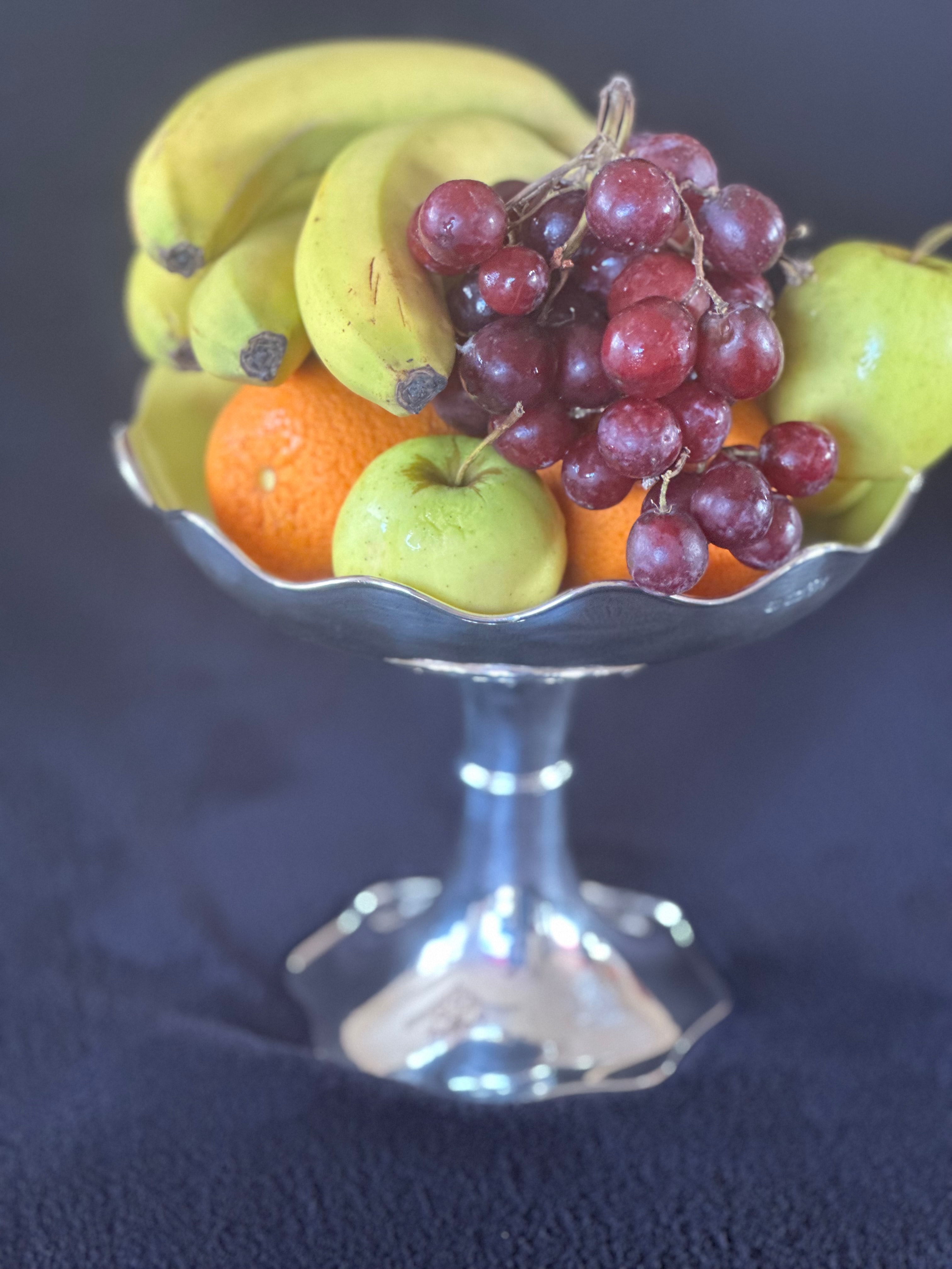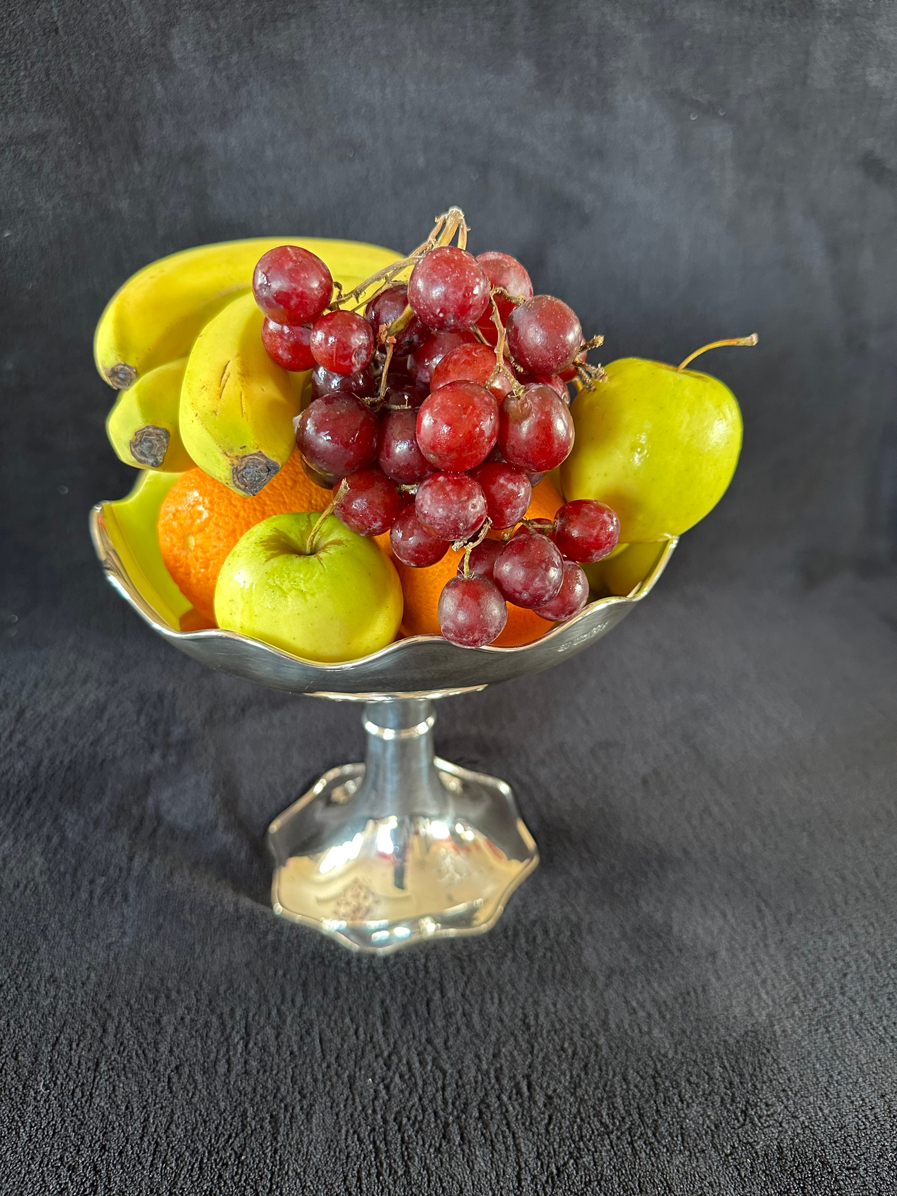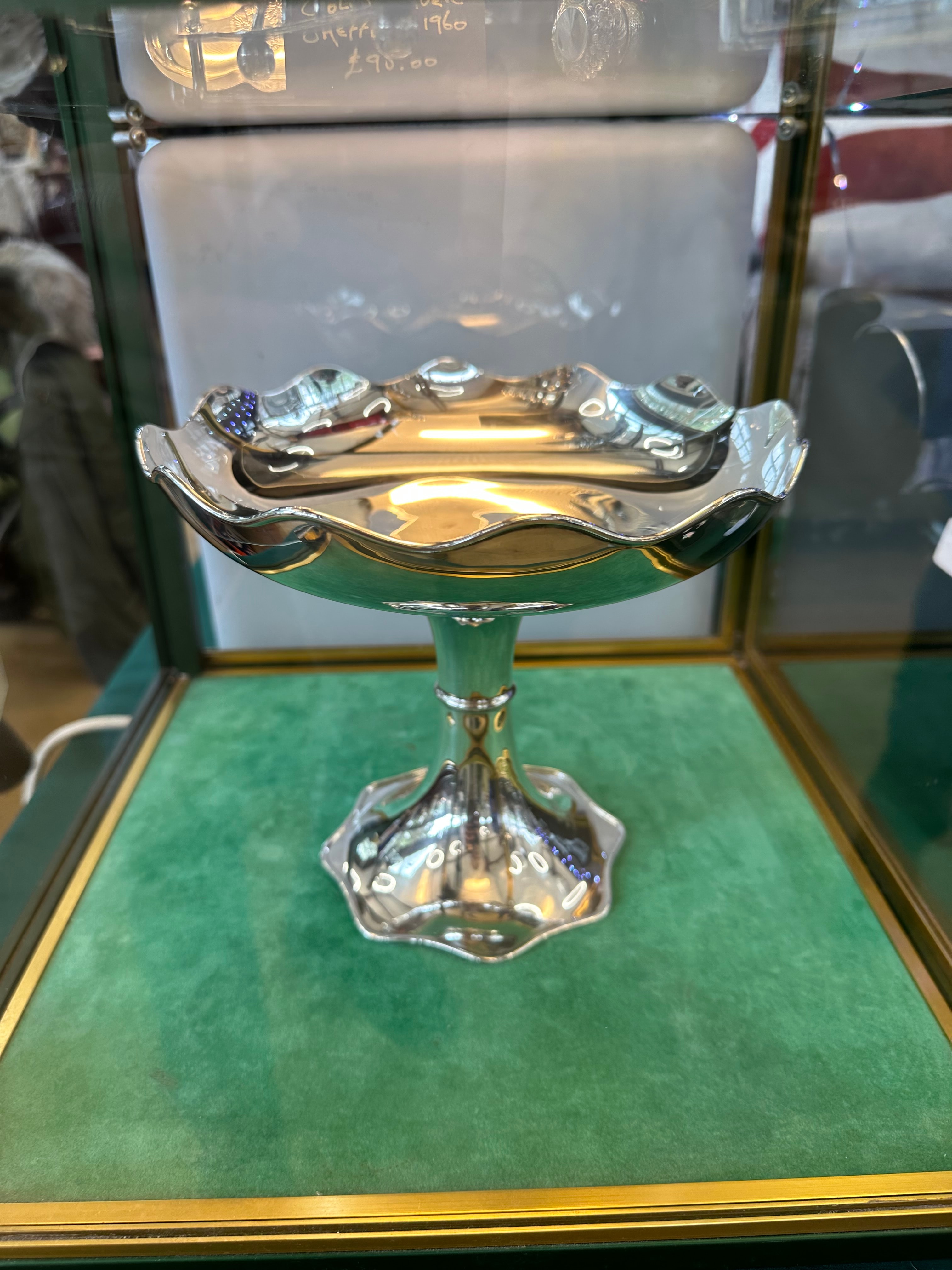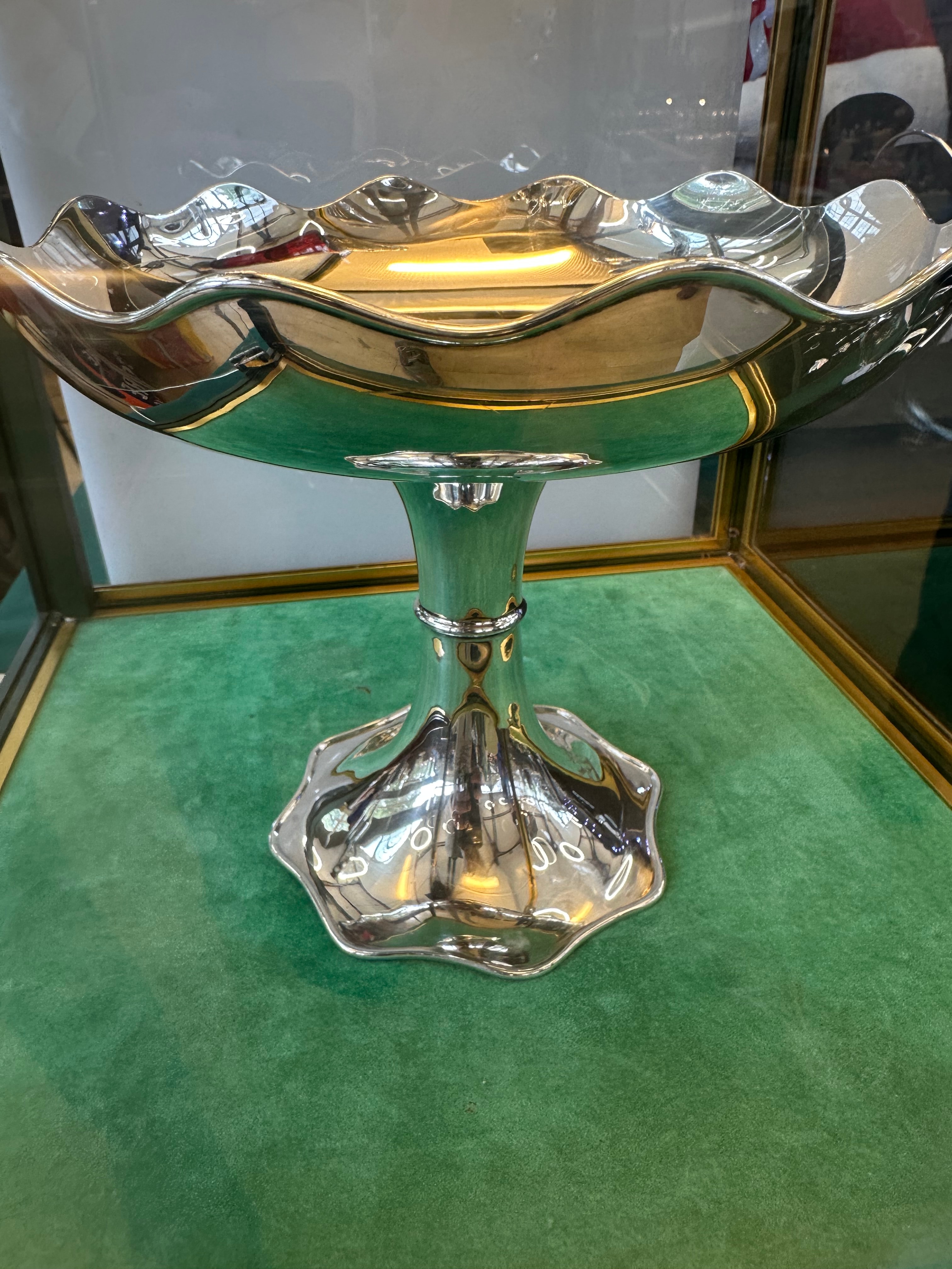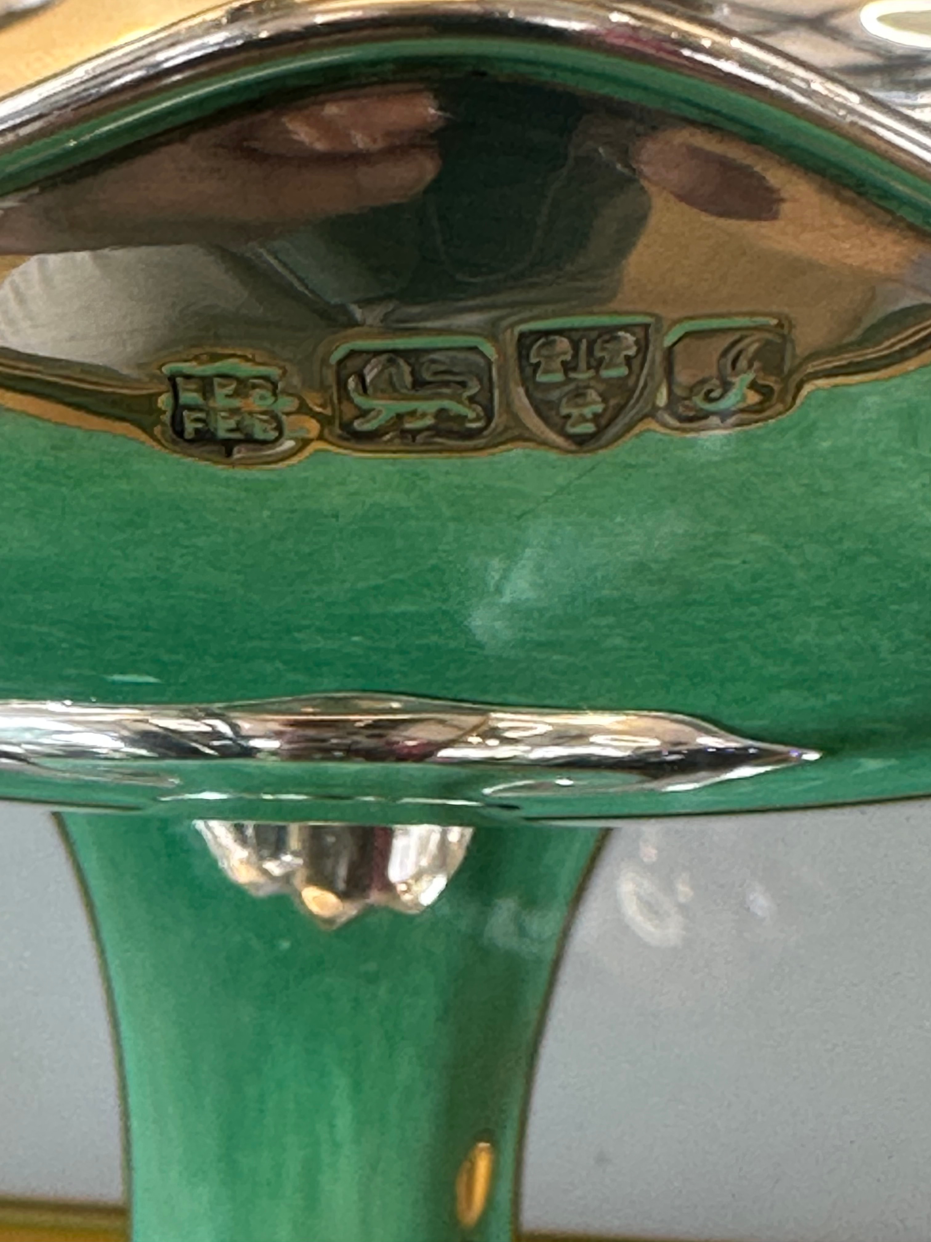An early 20th Century sterling silver footed compote by F. E. Betts, assayed in Birmingham in 1906-1907. The piece features a scalloped and fluted rim and a matching pedestal base. Hallmarks visible on the rim include ‘FEB’ for F. E. Betts, a lion passant confirming sterling silver standard, an anchor symbol for the Birmingham assay office, and a lowercase ‘g’ date letter for 1906-1907. A decorative rampant lion motif is present on the stem.
