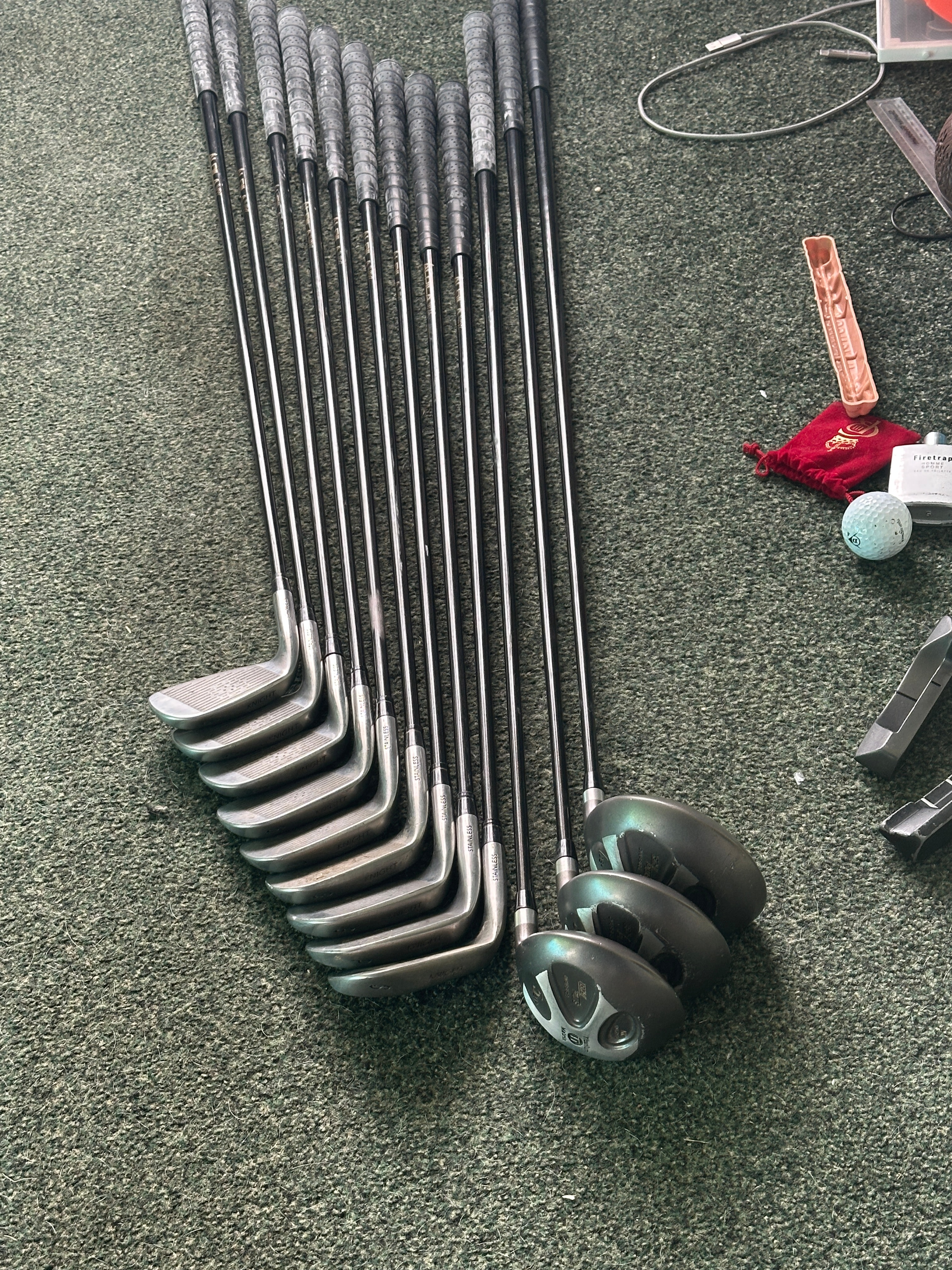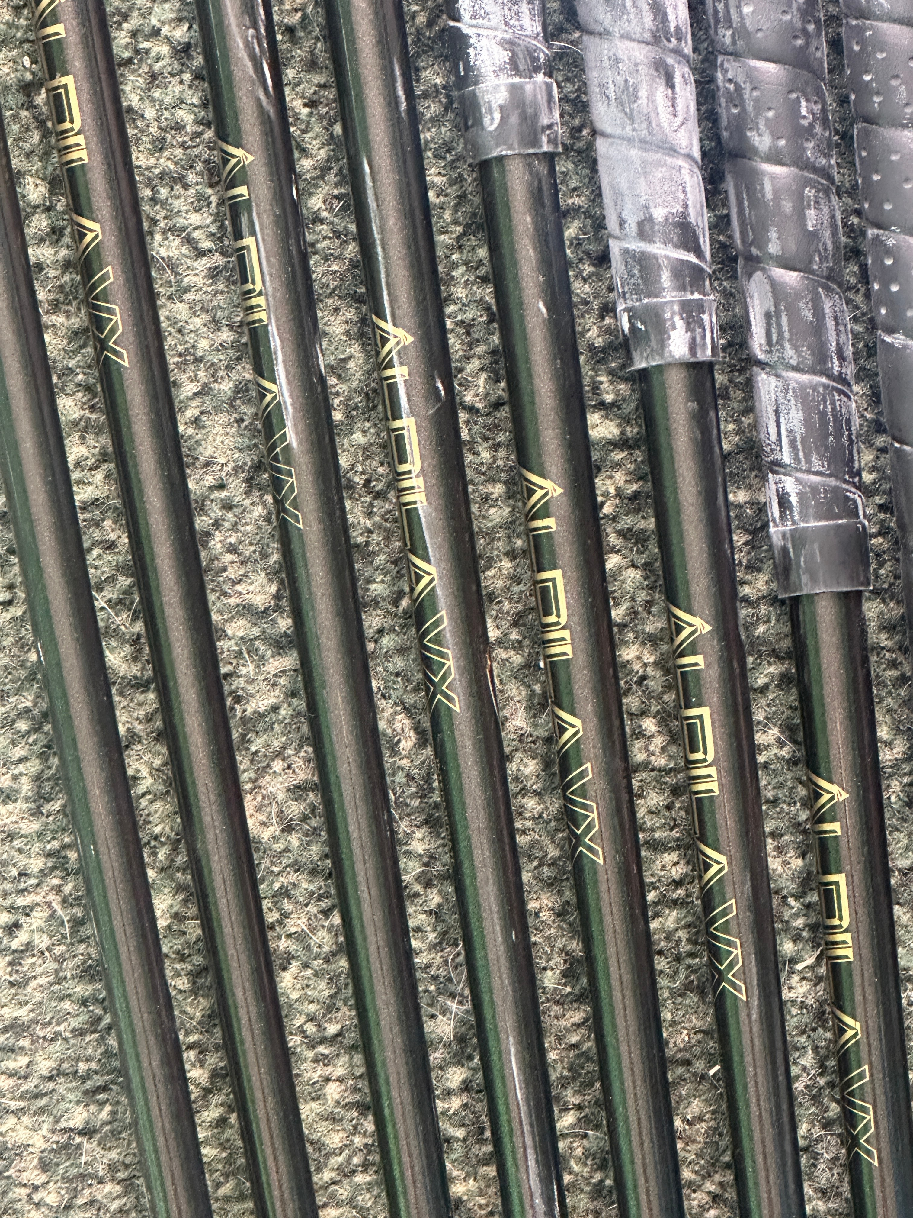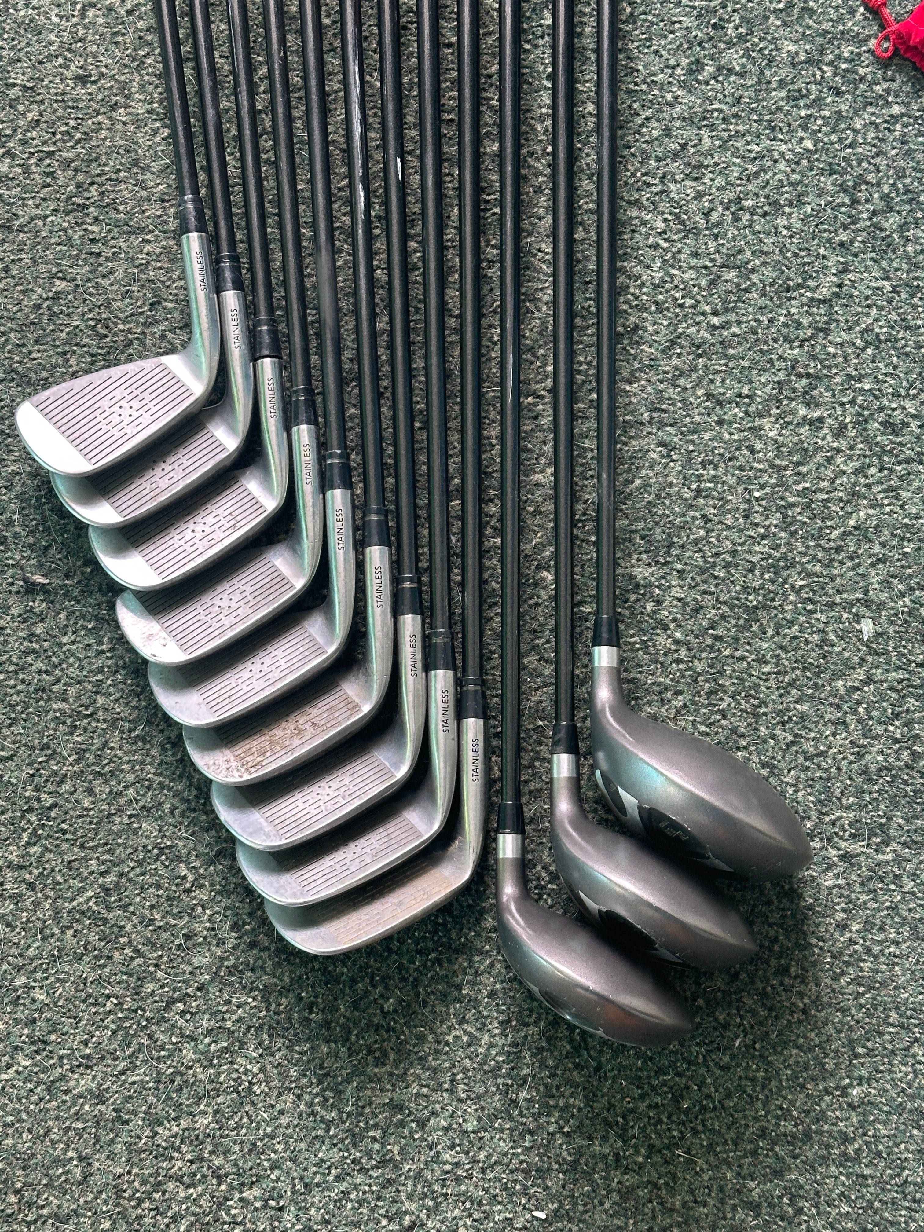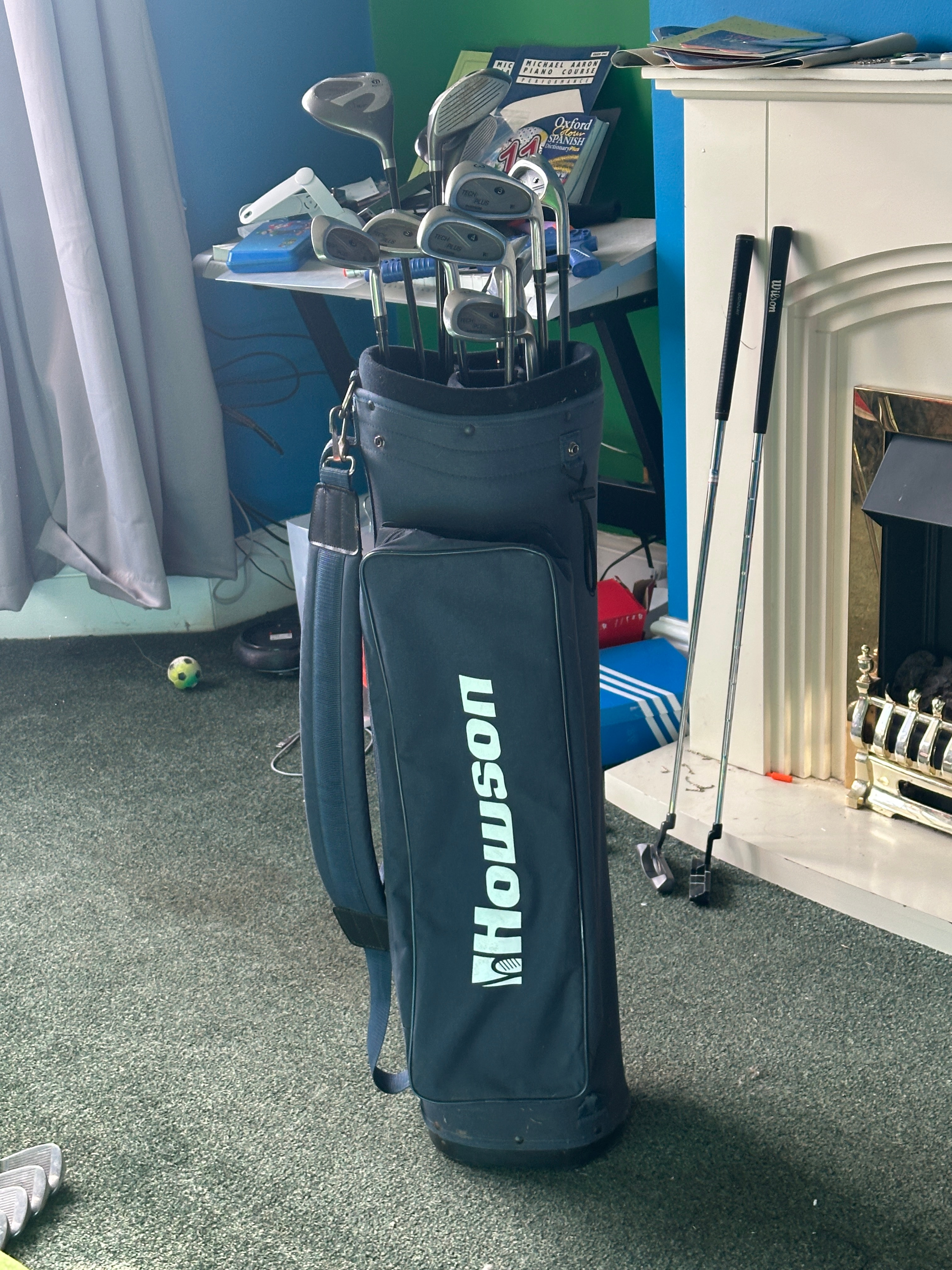 A set of approximately twelve modern golf clubs, comprising ten irons with stainless steel heads marked ‘STAINLESS’ and dark shafts emblazoned with ‘ALBIA VX’ in gold lettering, and three woods/hybrids with dark grey-toned metal heads. The clubs are accompanied by a coordinating dark blue textile stand bag prominently displaying the ‘Howson’ brand name in white.