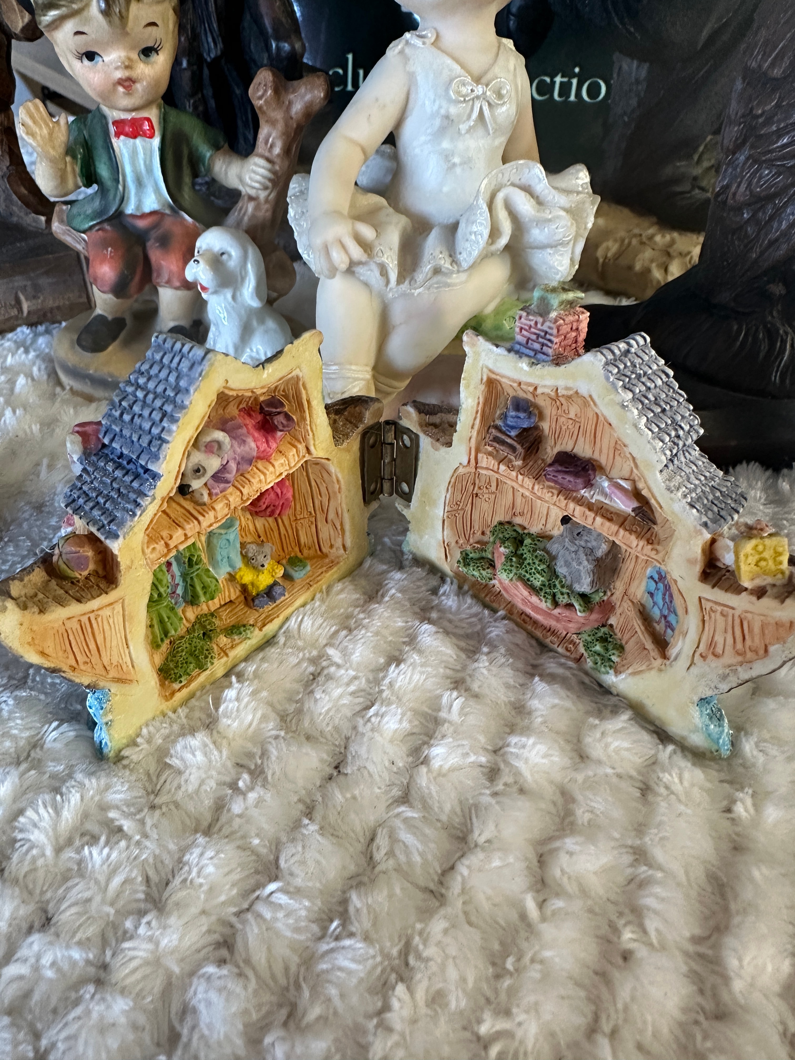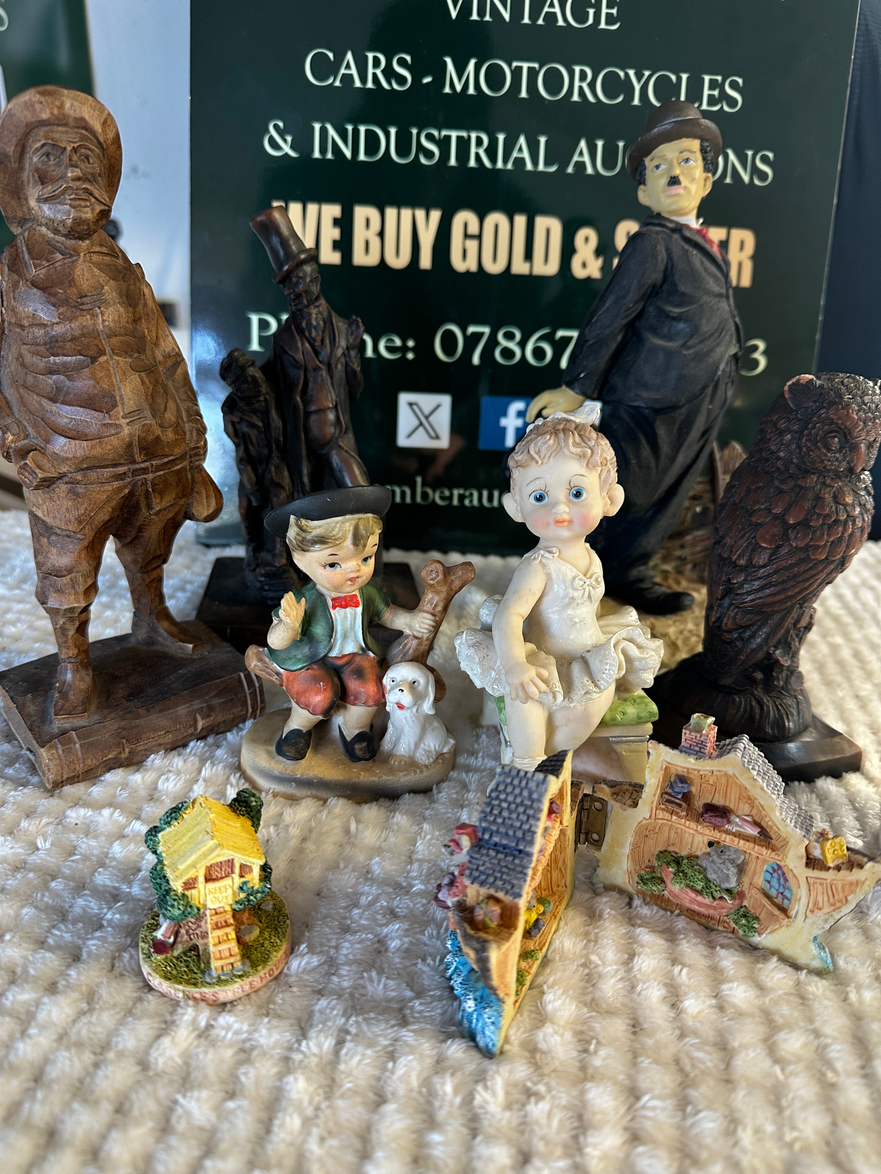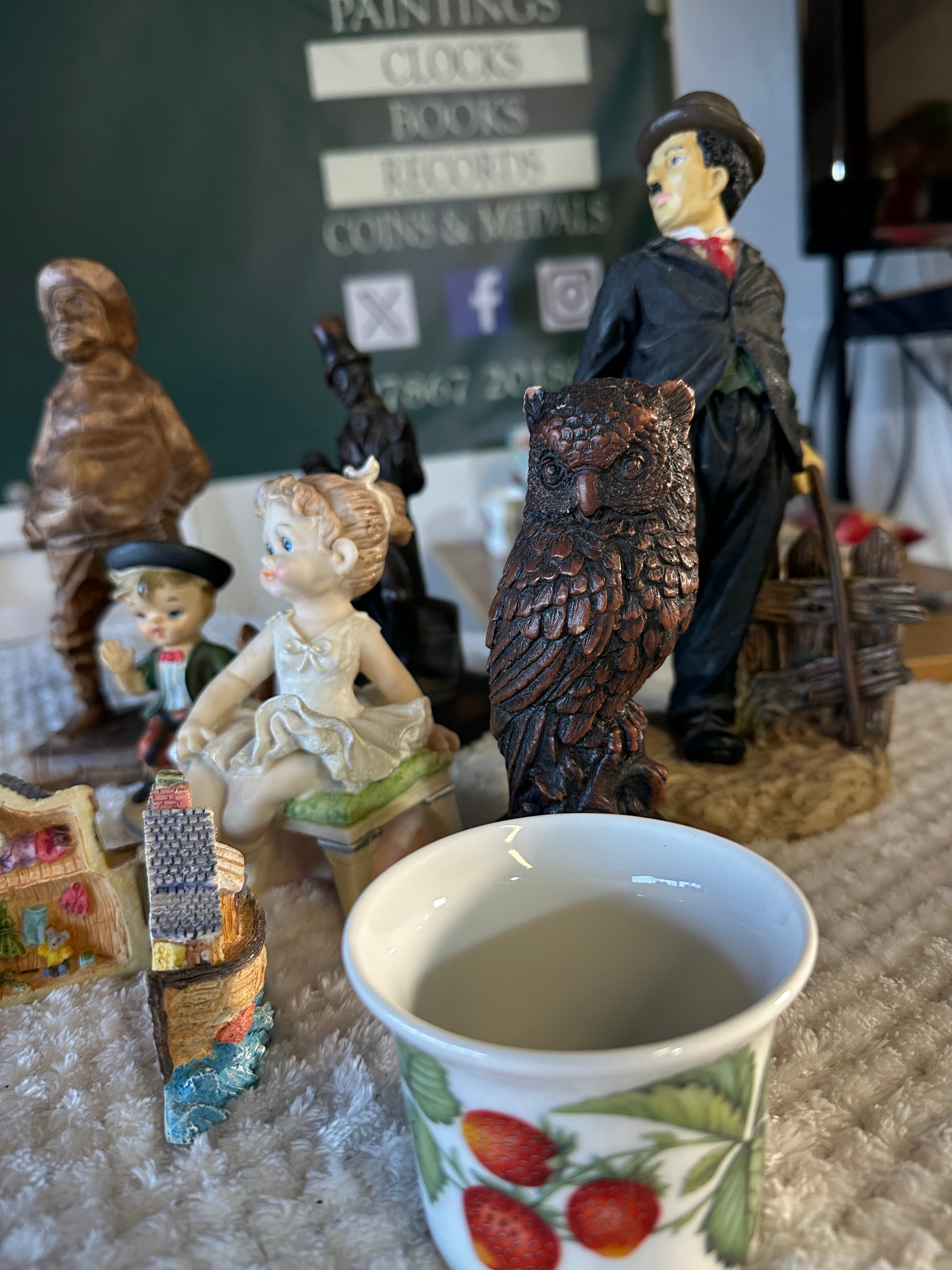 A diverse collection of ten decorative items, comprising nine figurines and one ceramic cup, generally appearing to be of modern manufacture. The figurines include a carved dark wood male figure, several painted resin or ceramic figures depicting a Charlie Chaplin-esque character, a boy with a dog, and a ballerina, some of which are in the style of Giuseppe Armani. Also present are two whimsical miniature house figurines designed to open, revealing detailed interiors. Another figure, with a faux bronze patina finish, depicts a Dickensian character and is visibly marked “David Copperfield” on its base. An owl figurine also features a textured faux wood/bronze finish. The ceramic cup is white with a strawberry and leaf motif.