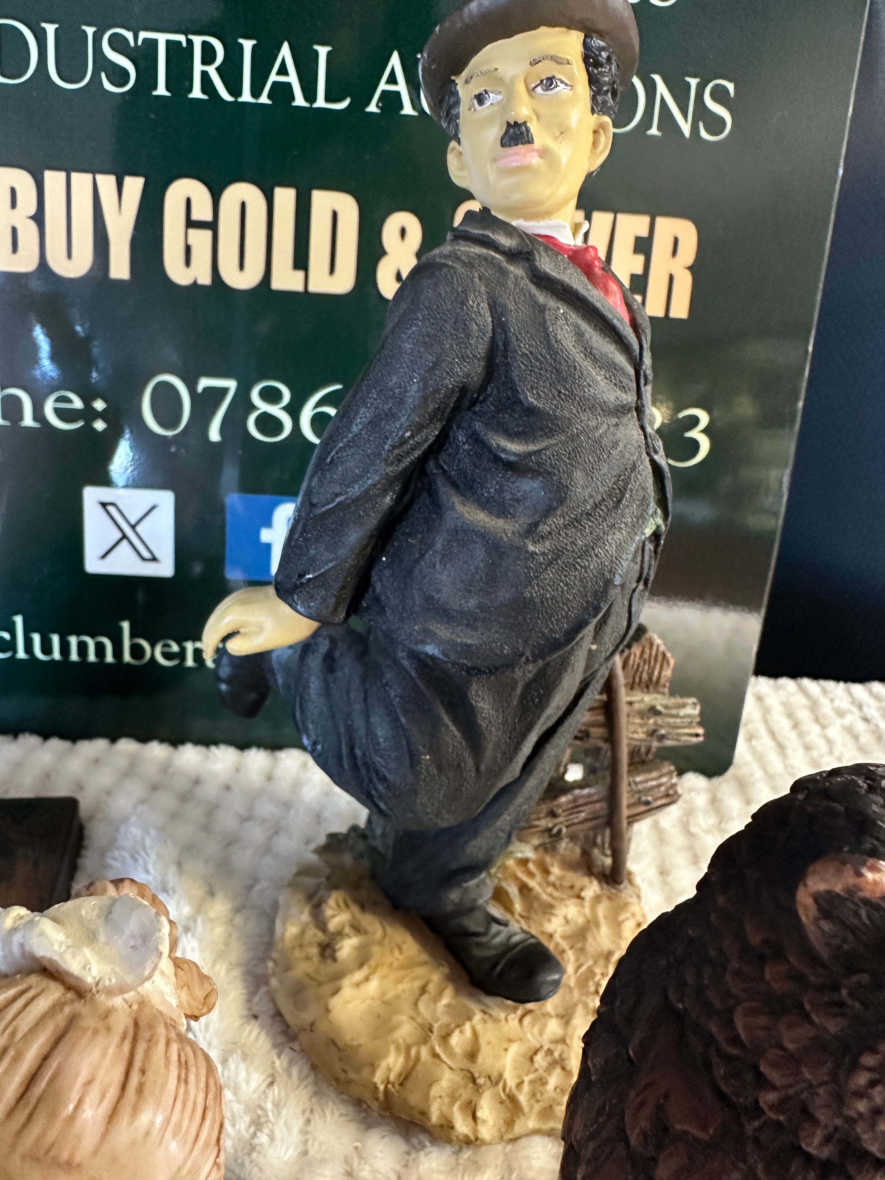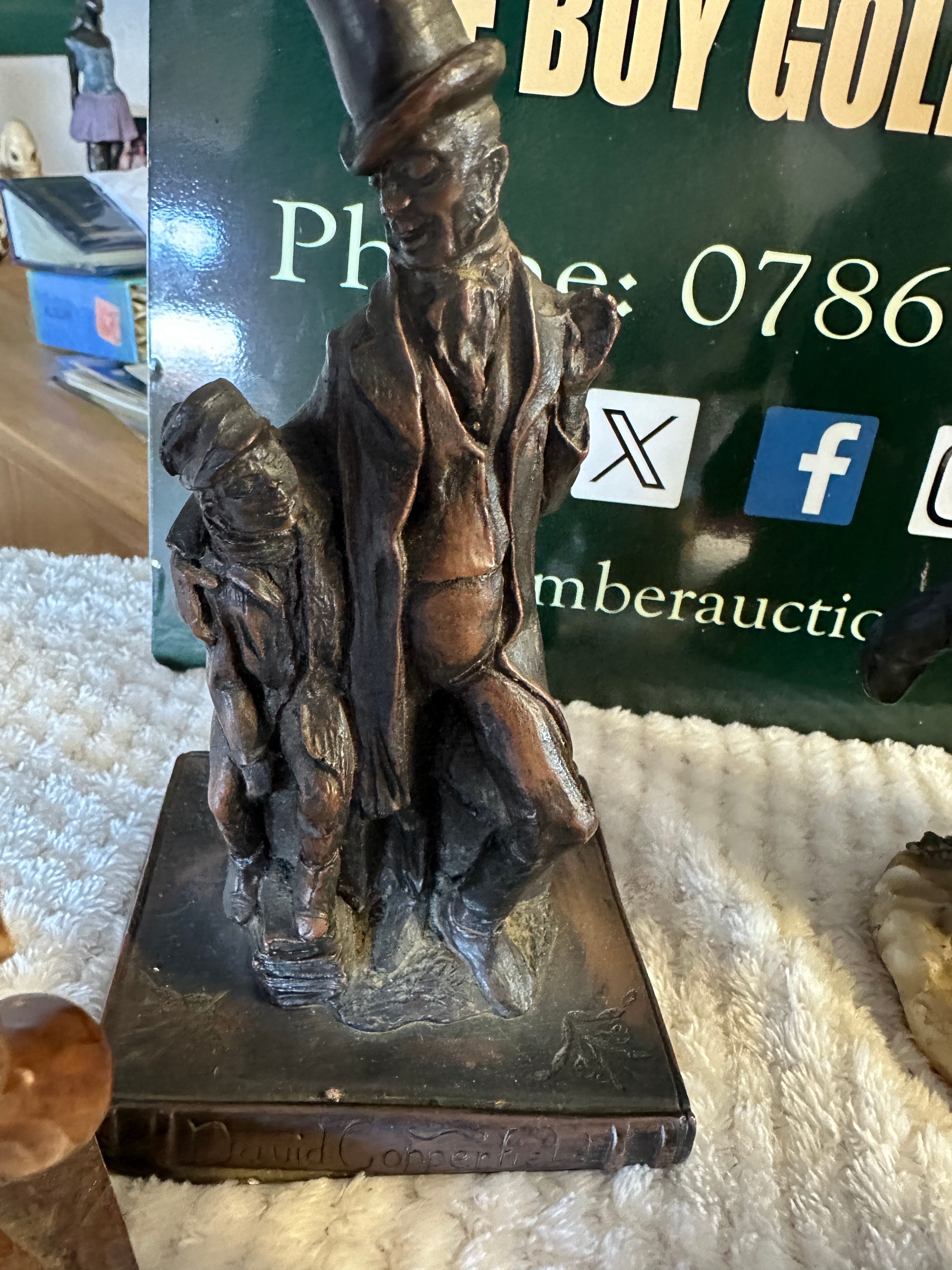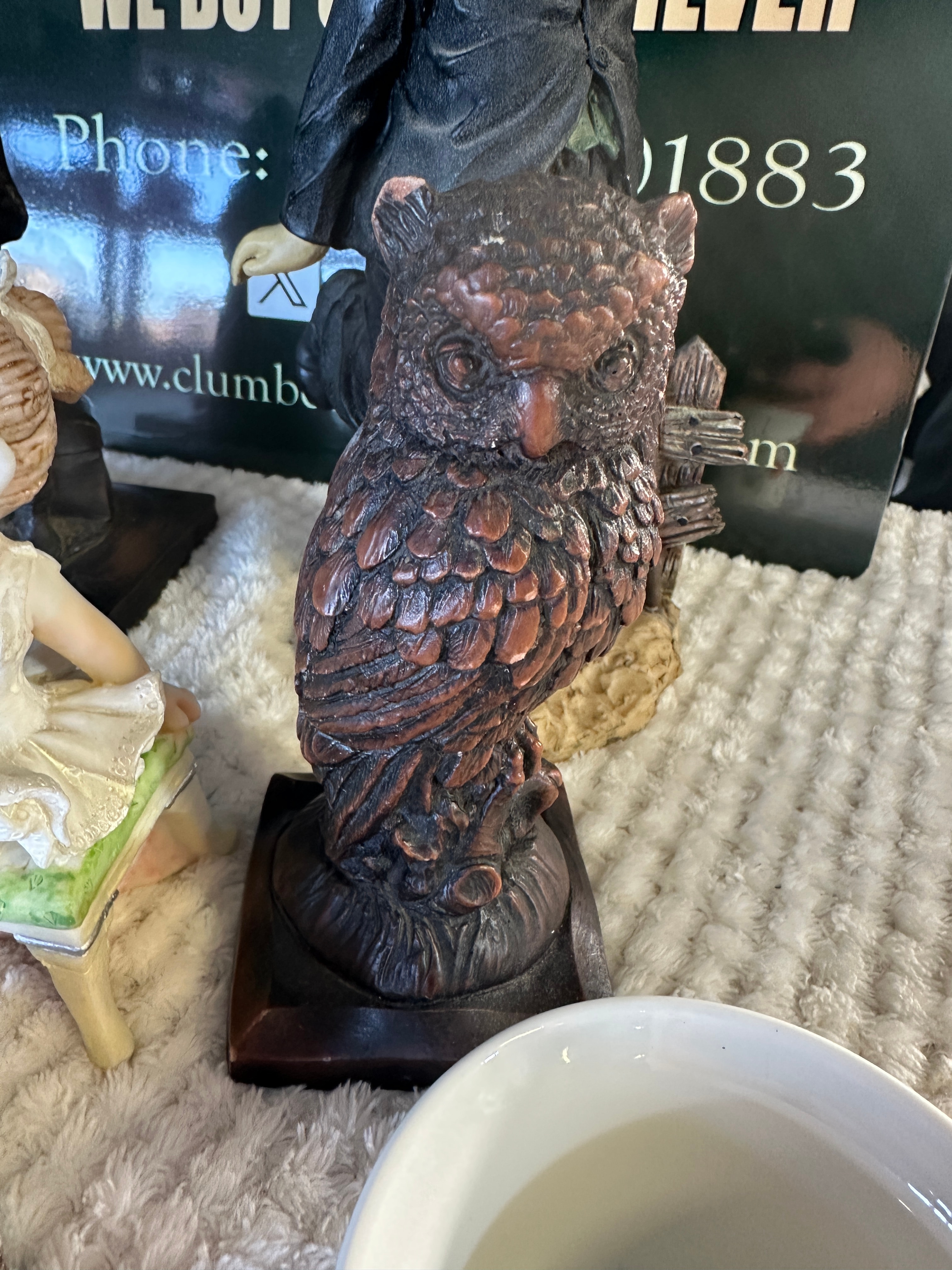 A diverse collection of ten decorative items, comprising nine figurines and one ceramic cup, generally appearing to be of modern manufacture. The figurines include a carved dark wood male figure, several painted resin or ceramic figures depicting a Charlie Chaplin-esque character, a boy with a dog, and a ballerina, some of which are in the style of Giuseppe Armani. Also present are two whimsical miniature house figurines designed to open, revealing detailed interiors. Another figure, with a faux bronze patina finish, depicts a Dickensian character and is visibly marked “David Copperfield” on its base. An owl figurine also features a textured faux wood/bronze finish. The ceramic cup is white with a strawberry and leaf motif.