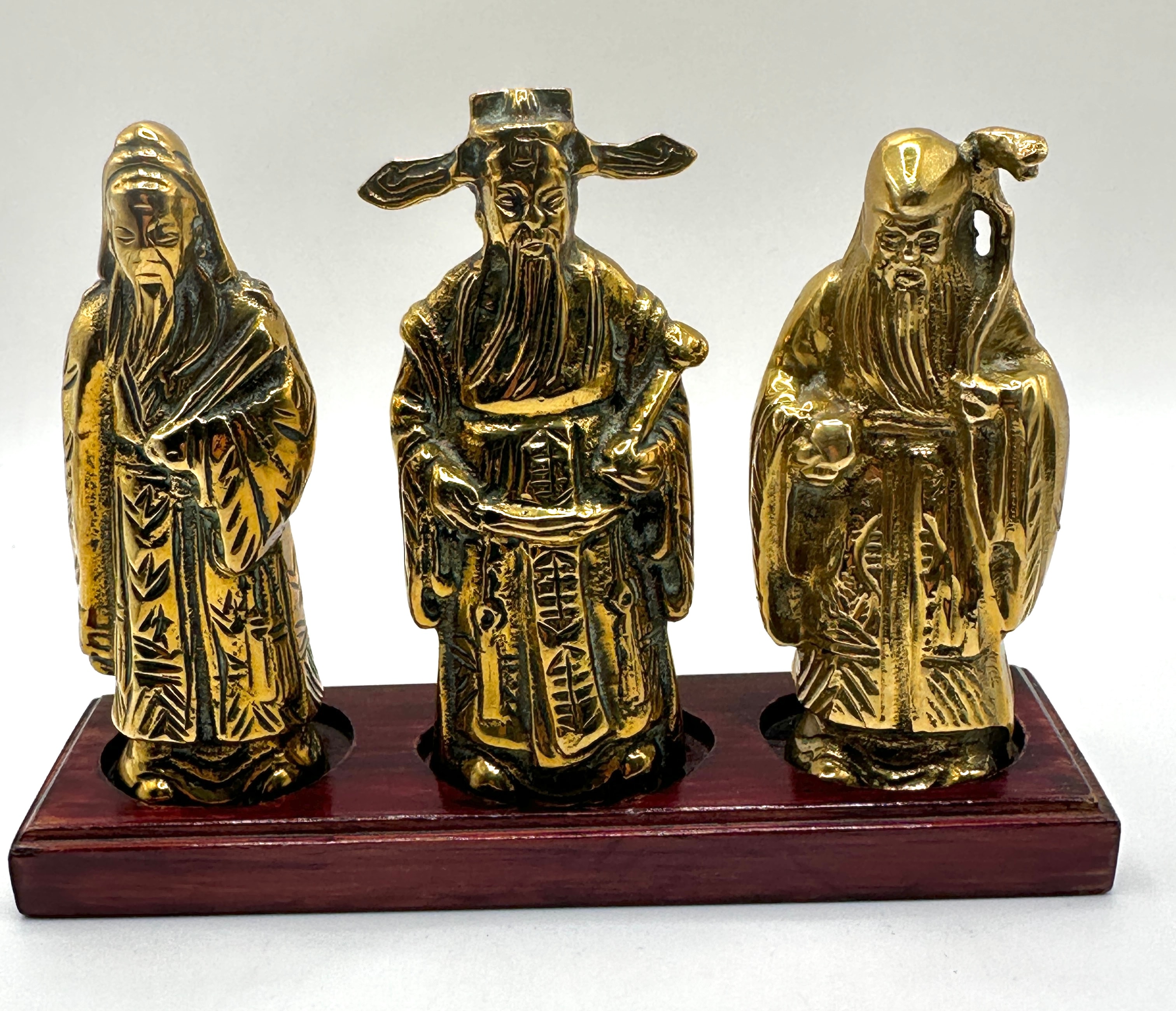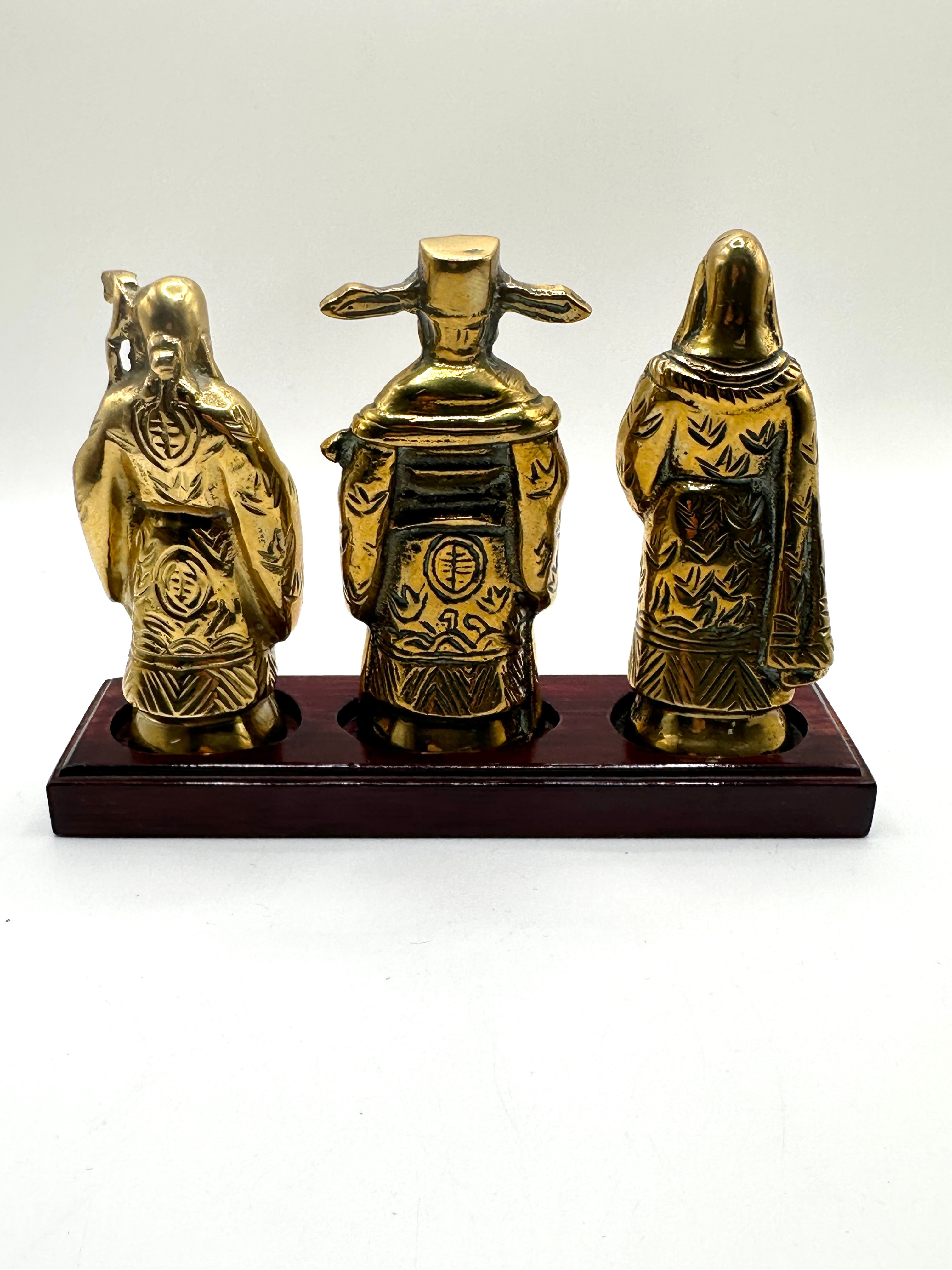 Three Brass Chinese Fu Lu Shou Figures on a Wooden Base