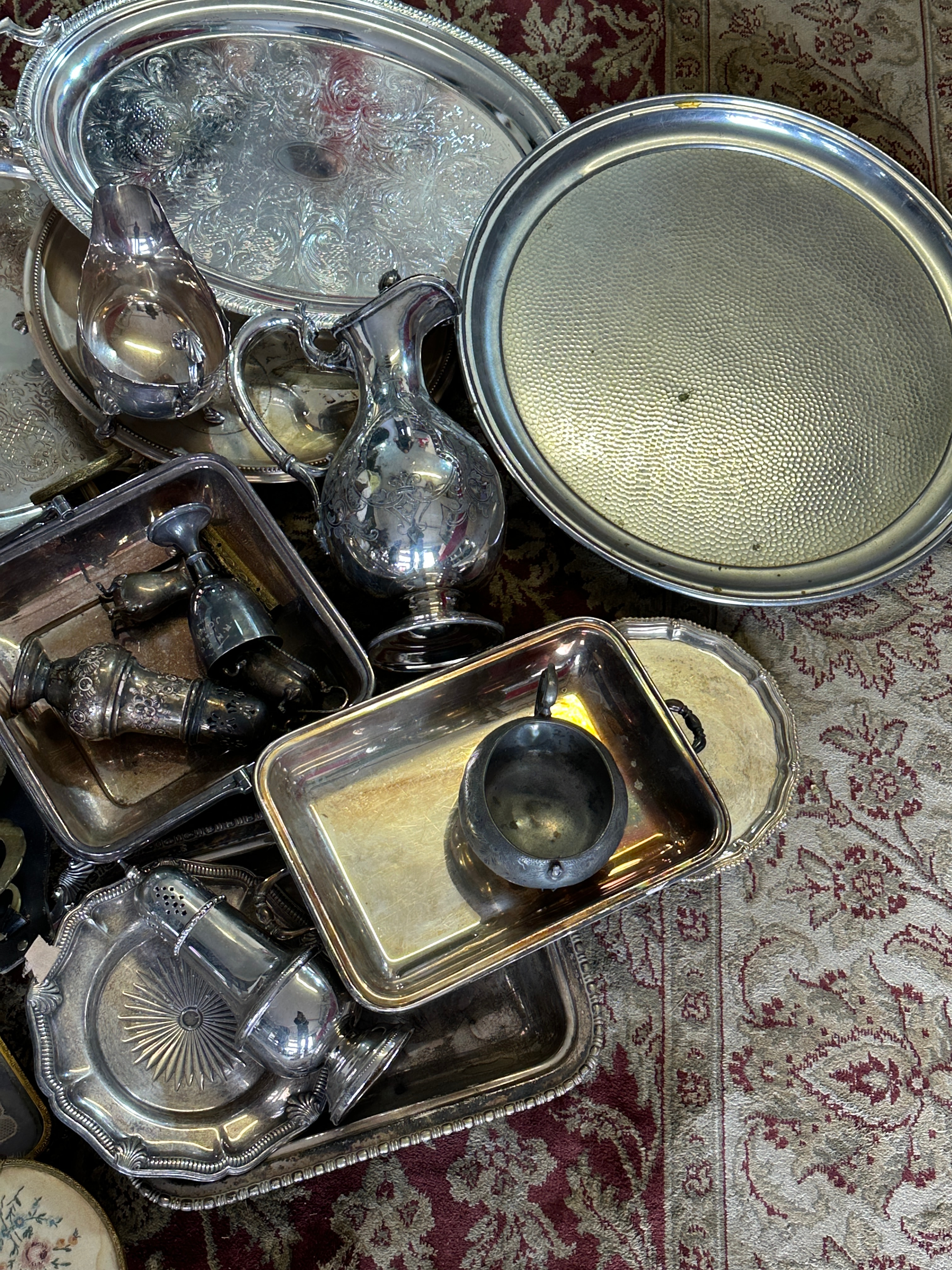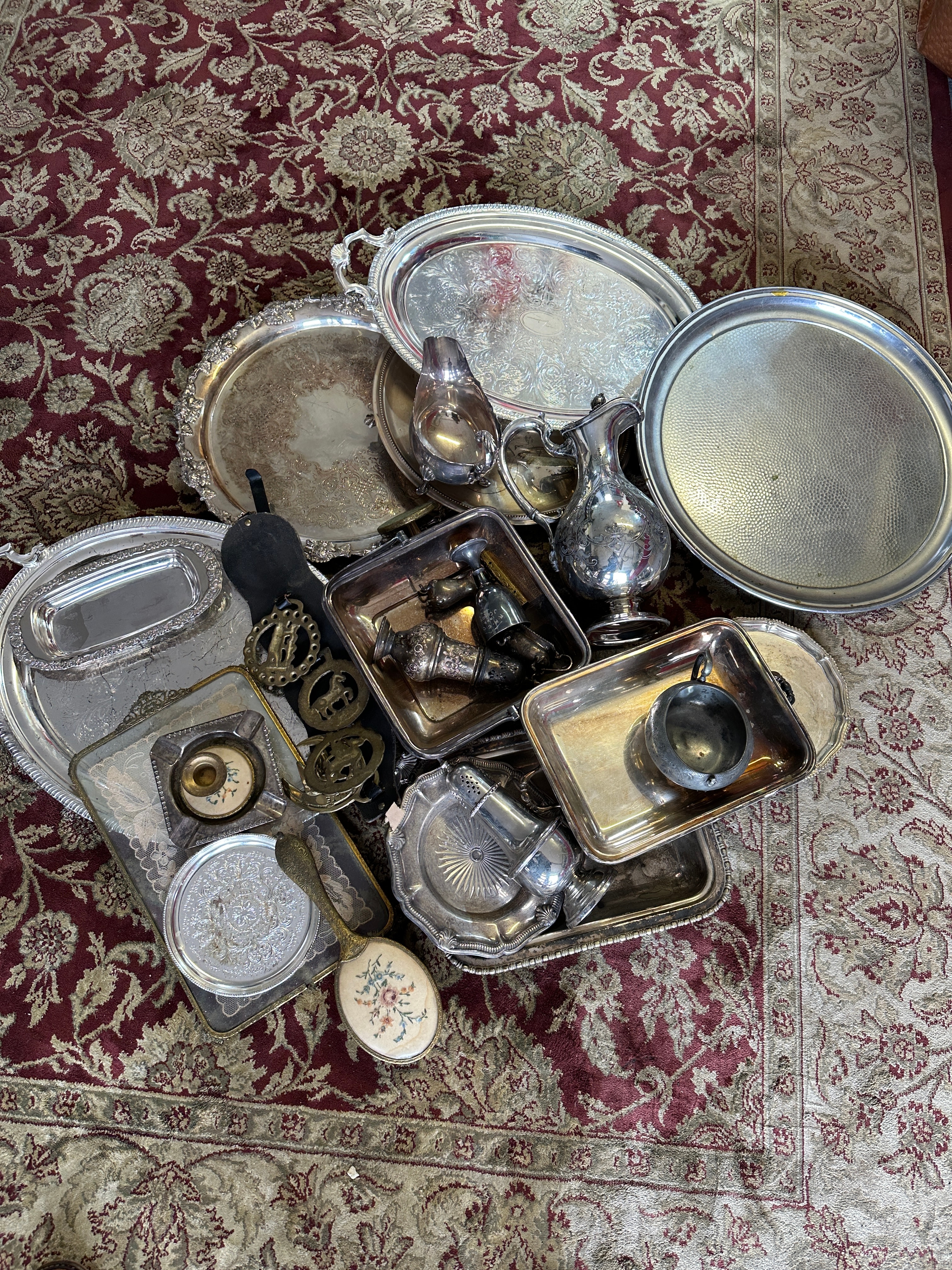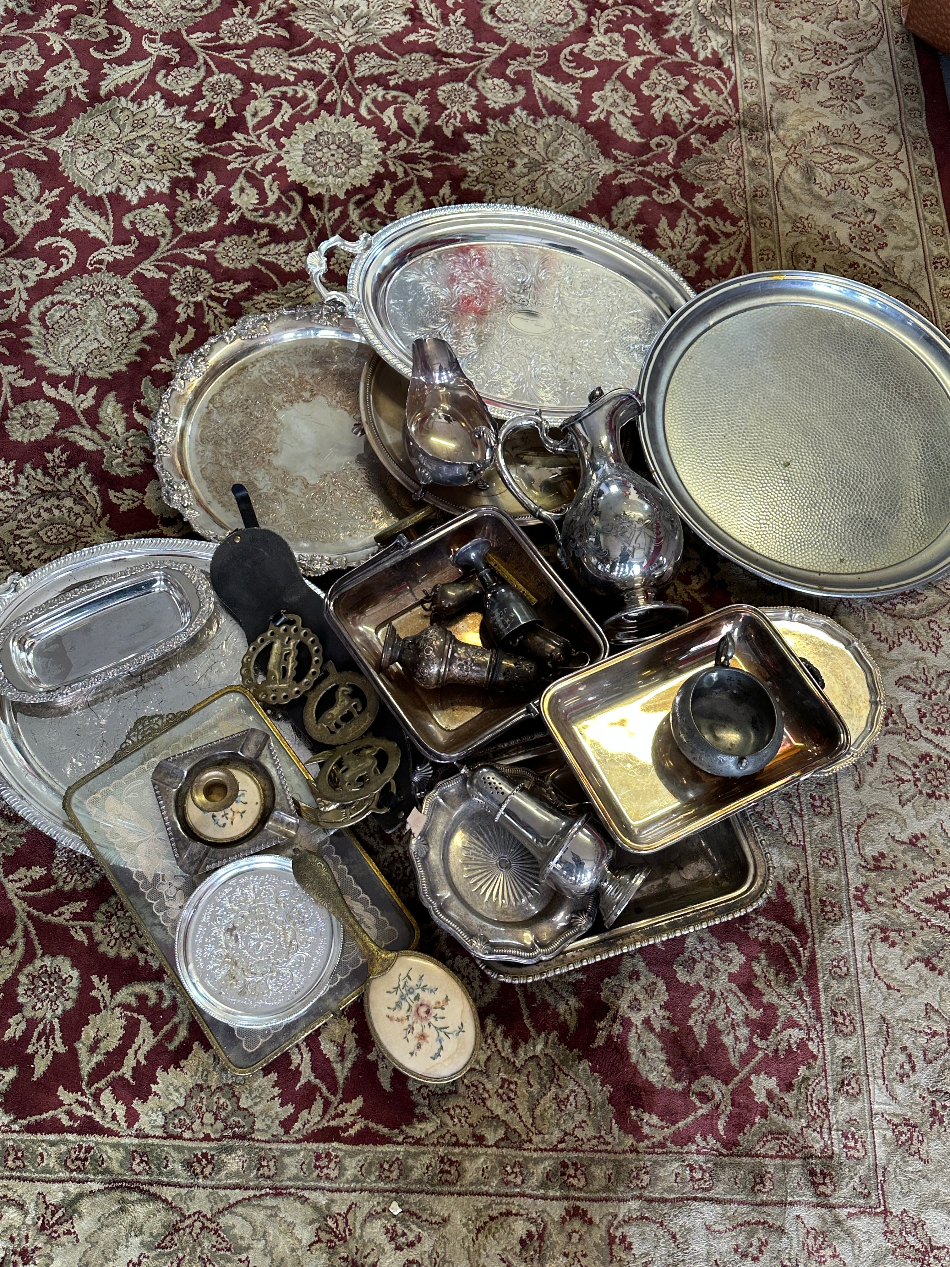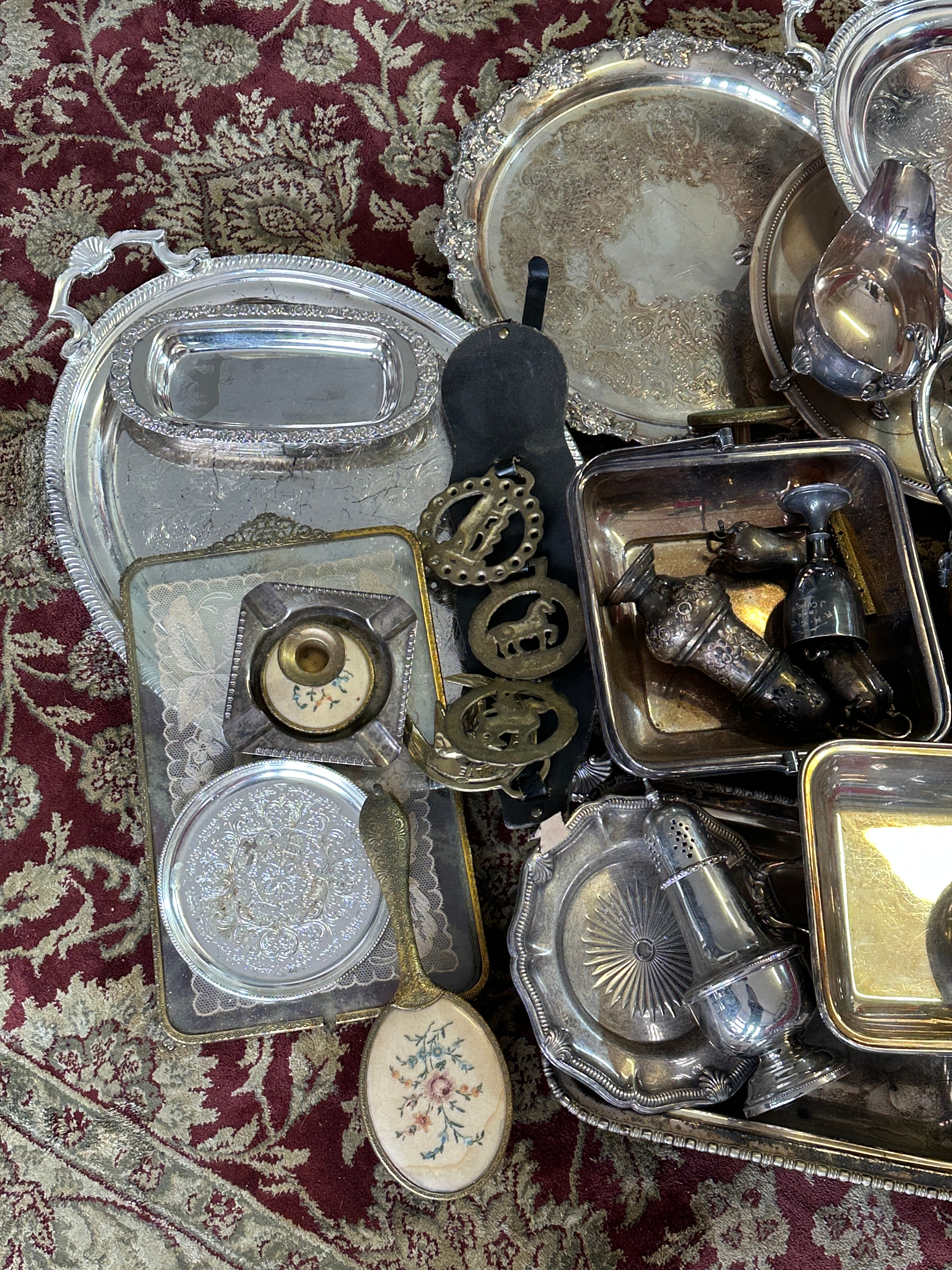 A collection of silver-colored metallic and brass items, primarily comprising numerous serving trays of various shapes and sizes, exhibiting both ornate chased or embossed patterns and simpler hammered or plain finishes. The assortment also features pitchers, small dishes, shakers, several goblet-like items, an ashtray, and a hand mirror with an embroidered floral reverse. Four brass horse-themed medallions are present on a dark strap. The collective style is largely traditional.