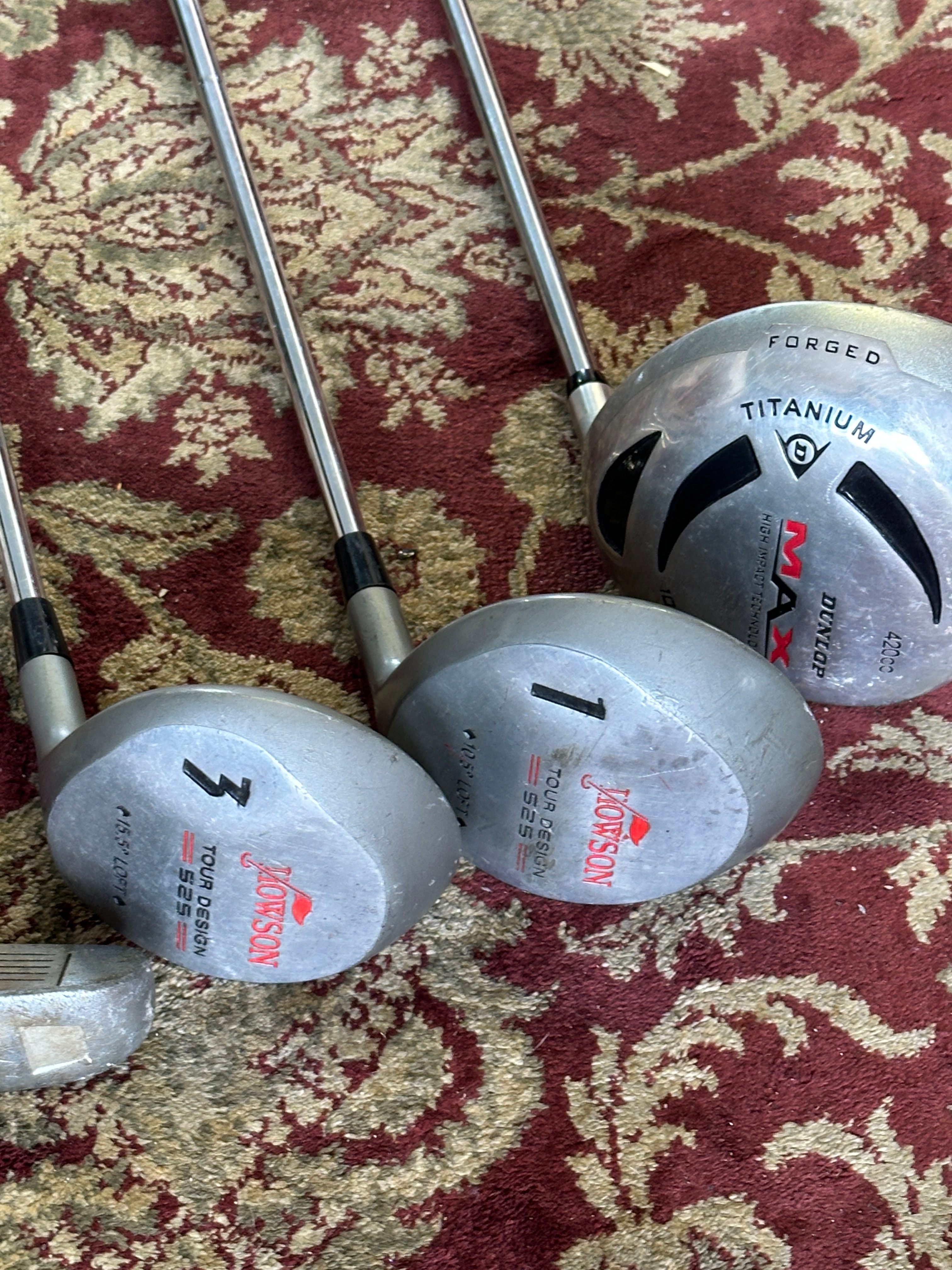 A set of eight contemporary right-handed golf clubs. The set includes a putter, two irons (one marked “9”), and five wood-style clubs. Each club features metal shafts, black rubberized grips, and metal heads. One large driver/wood head is marked “FORGED TITANIUM, ” “MAX, ” “HIGH REBOUND, ” and “460cc.” Two smaller wood-style clubs are labeled “TOWSON TOUR DESIGN 525” and numbered “1” and “3,” with one also indicating “16.5° LOFT.” One iron is marked “RH.”