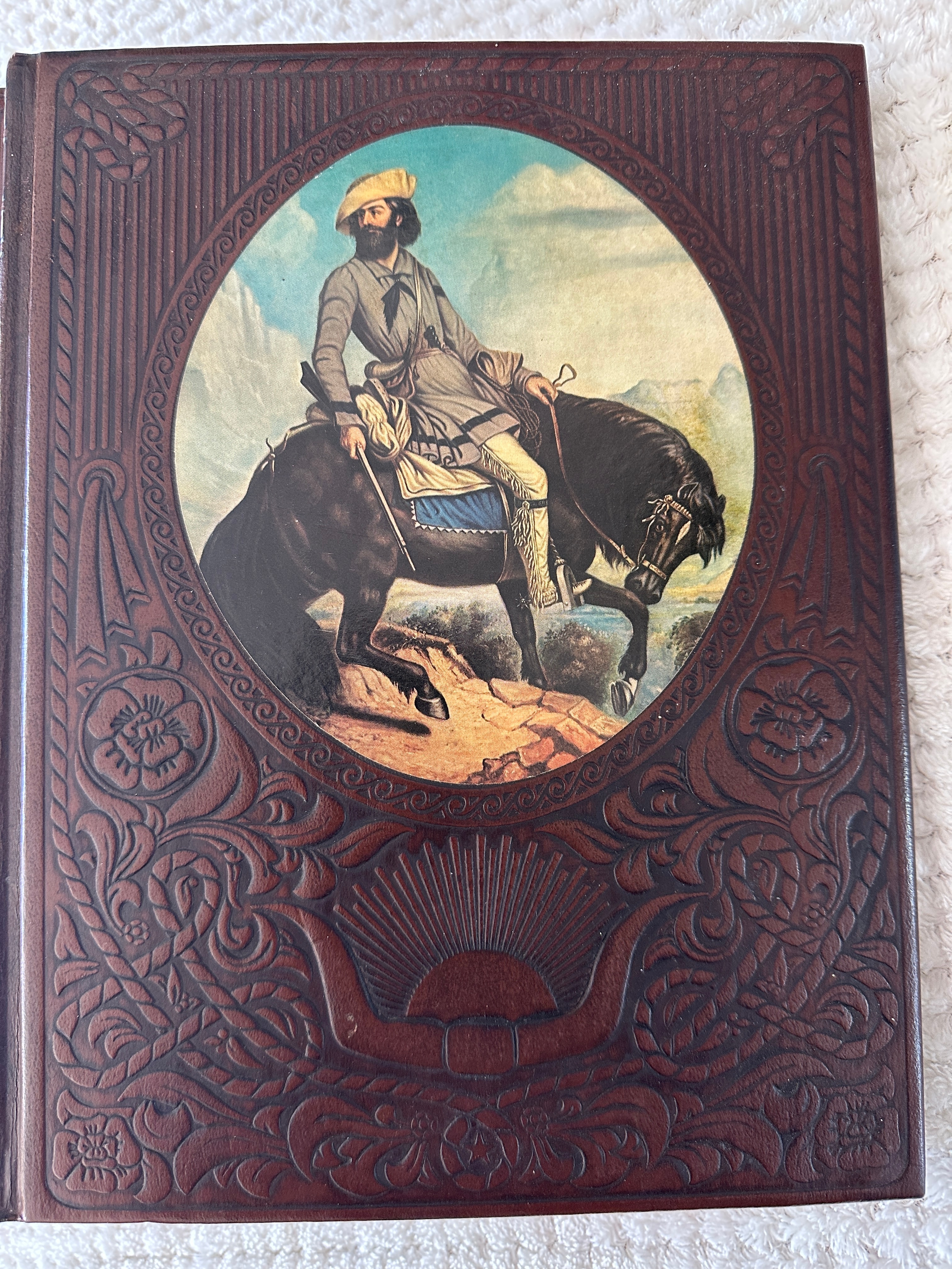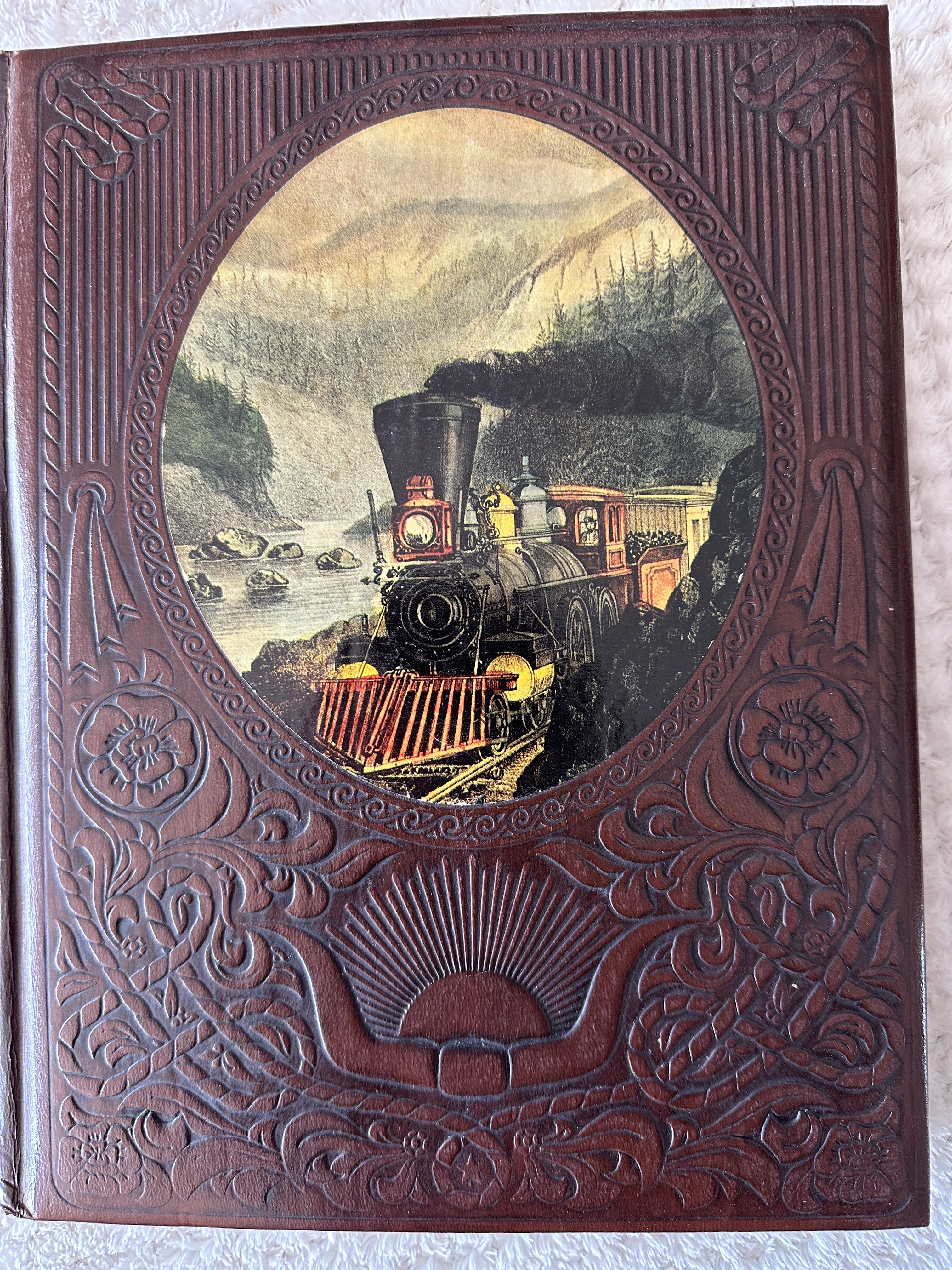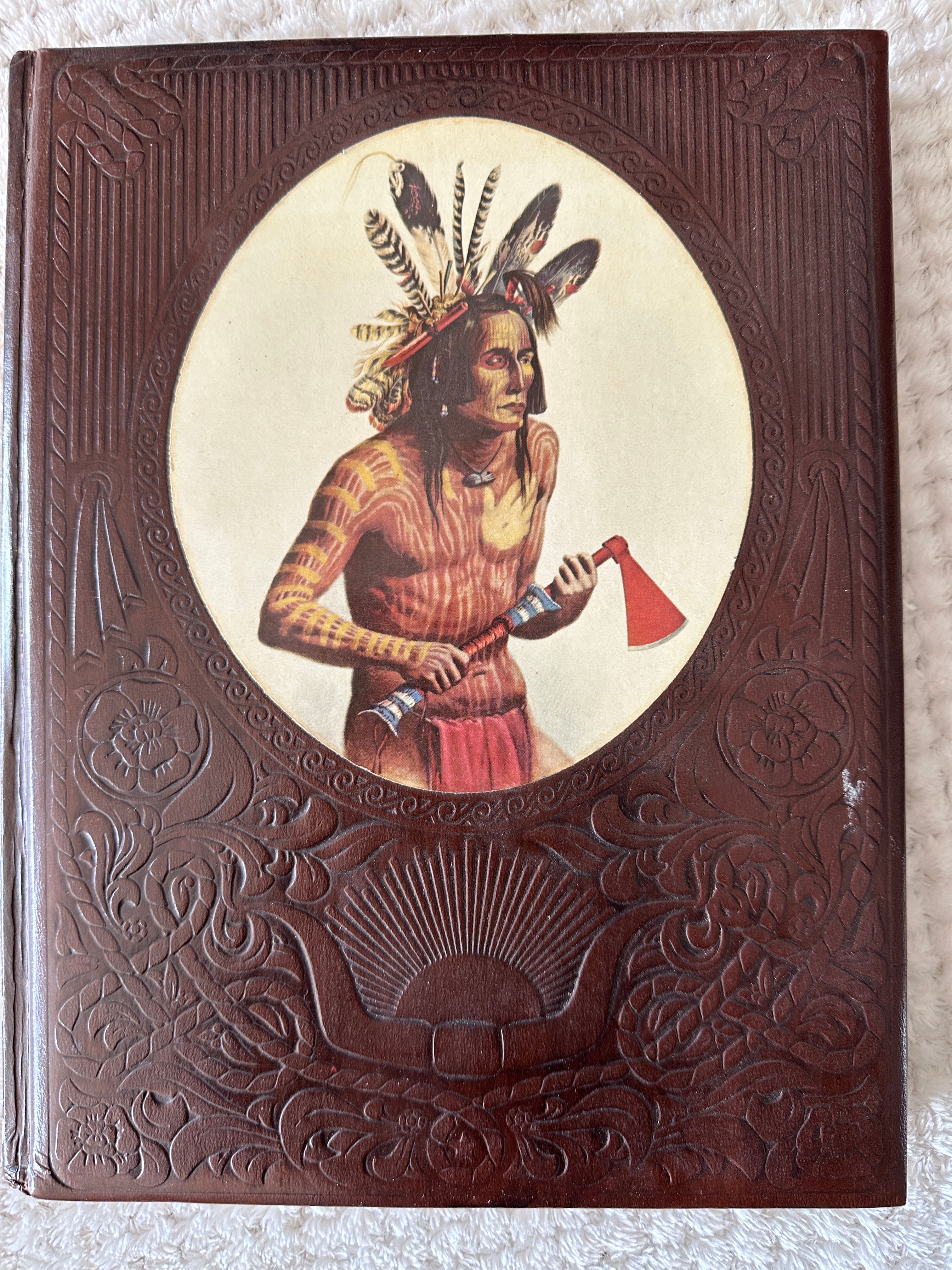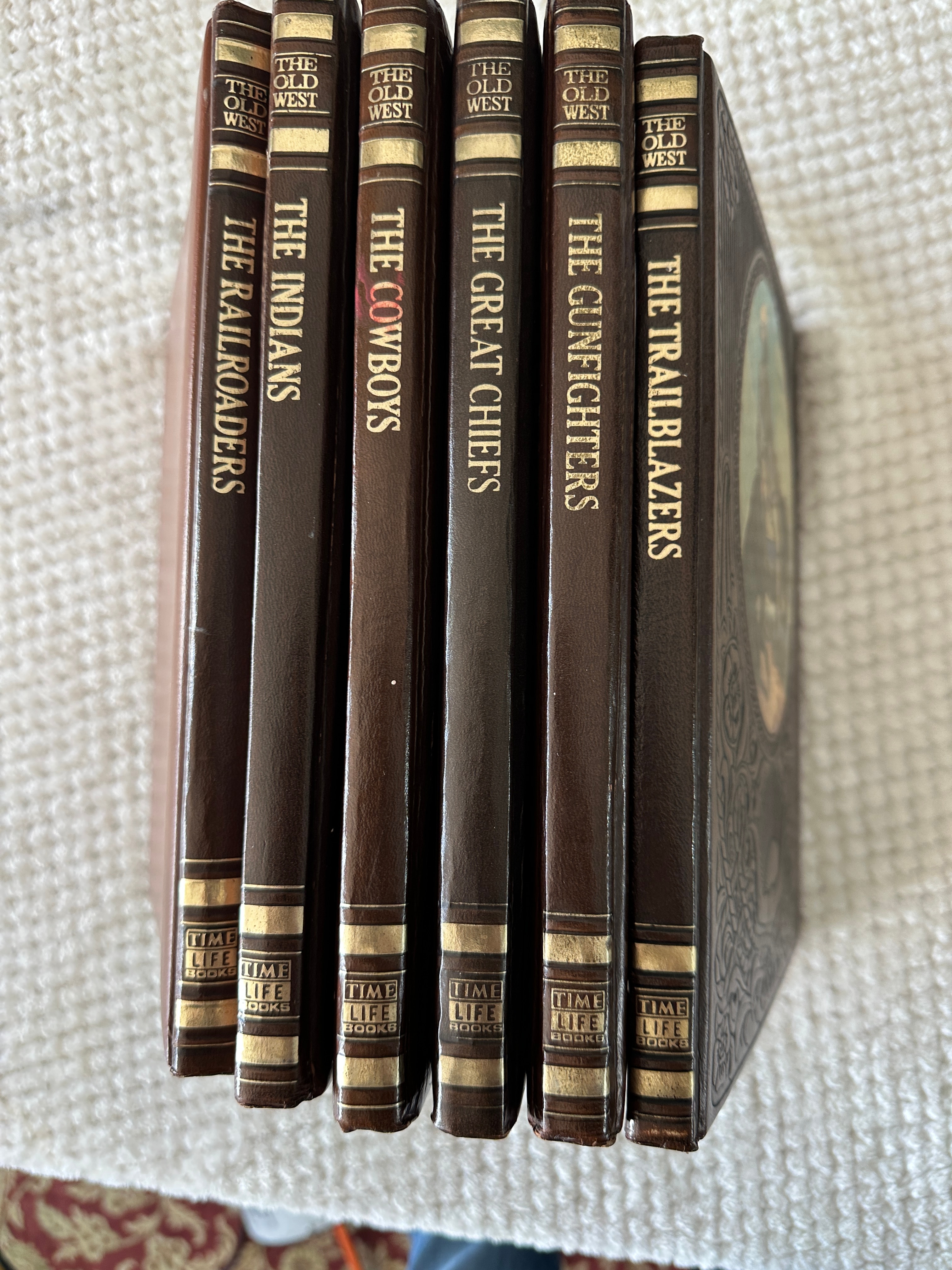 A set of six hardcover volumes from the ‘The Old West’ series, published by Time Life Books, circa 1970s. Each volume features a dark brown, faux leather-like cover with gold lettering on the spine and decorative embossed motifs. A central oval illustration relevant to its subject adorns each front cover. Titles included in this set are ‘THE RAILROADERS’, ‘THE INDIANS’, ‘THE COWBOYS’, ‘THE GREAT CHIEFS’, ‘THE GUNFIGHTERS’, and ‘THE TRAILBLAZERS’. Individual front covers display distinct, detailed color illustrations such as a steam train, a Native American figure, a cowboy, a Native American warrior on horseback, a gunfighter, and a pioneer, all framed within the embossed design.