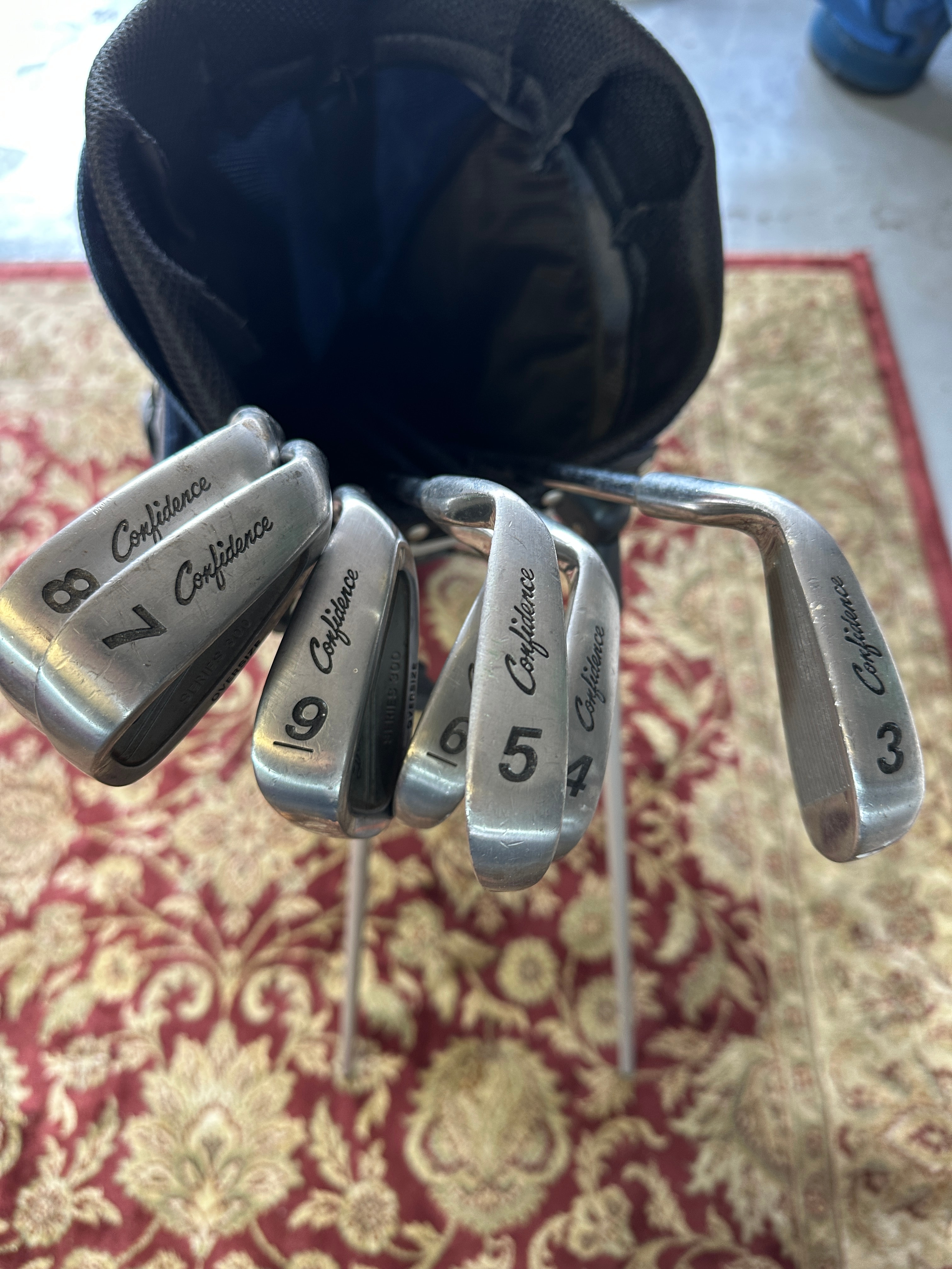 A Hippo Stand Golf Bag with a Set of Confidence Golf Irons