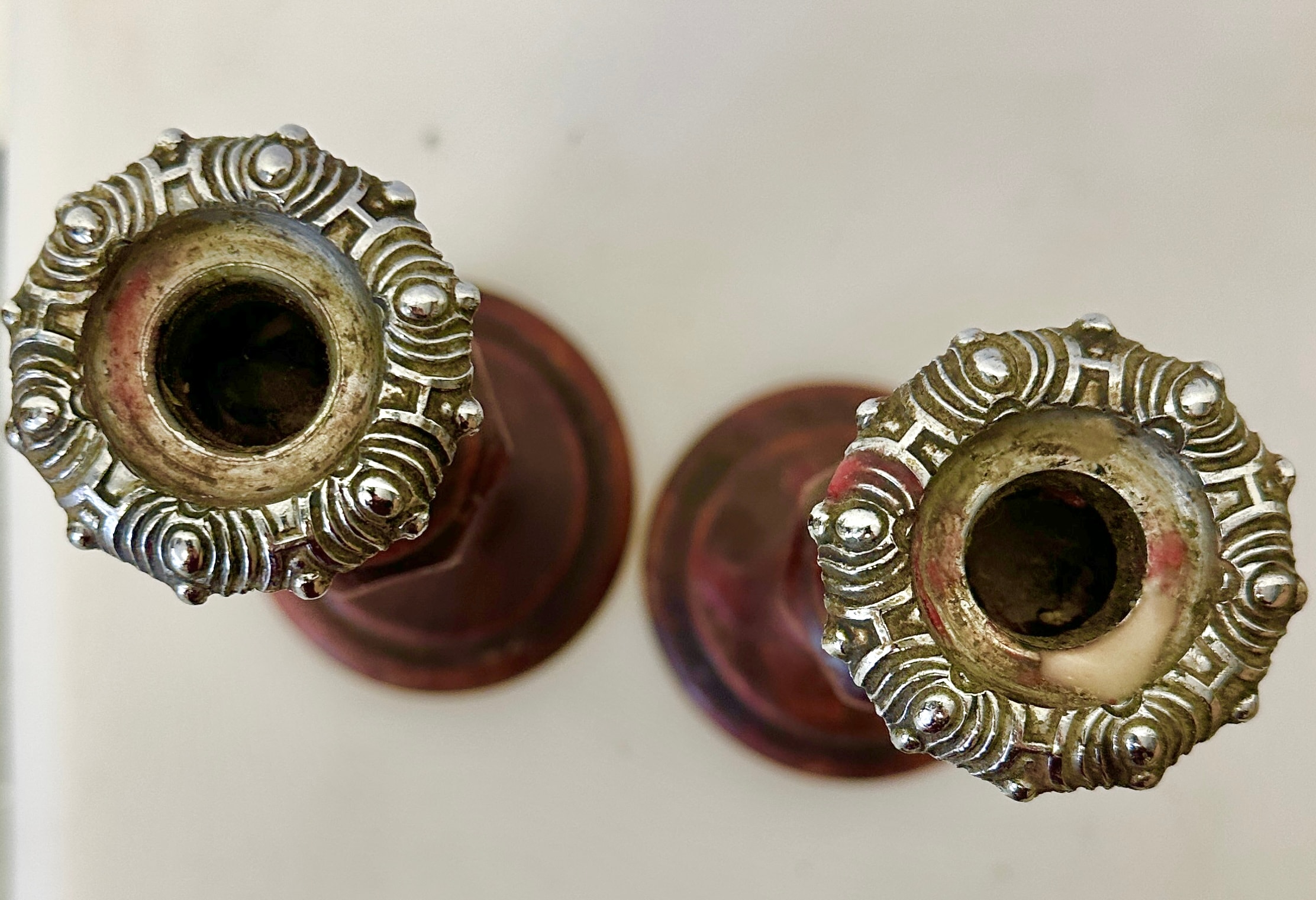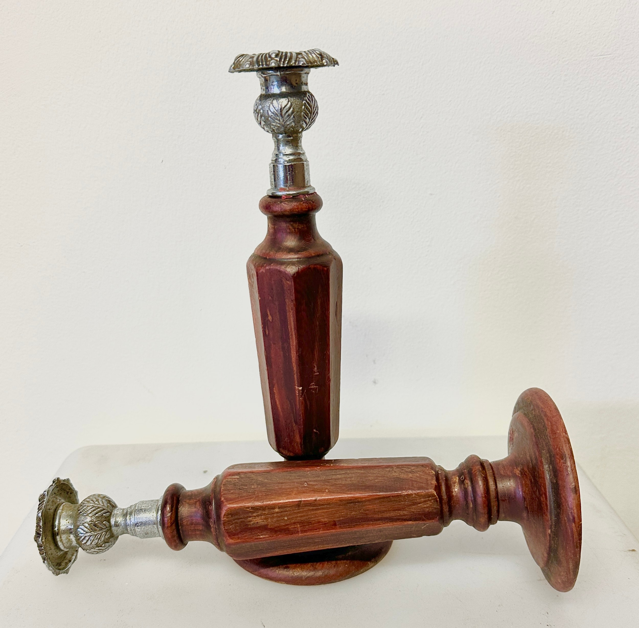 A pair of decorative candlesticks, each constructed from dark reddish-brown stained wood for the turned base and faceted central shaft. Each candlestick is capped with an ornate silver-toned metal candle cup, featuring a relief design comprising stylized foliate or scroll motifs and a beaded border.