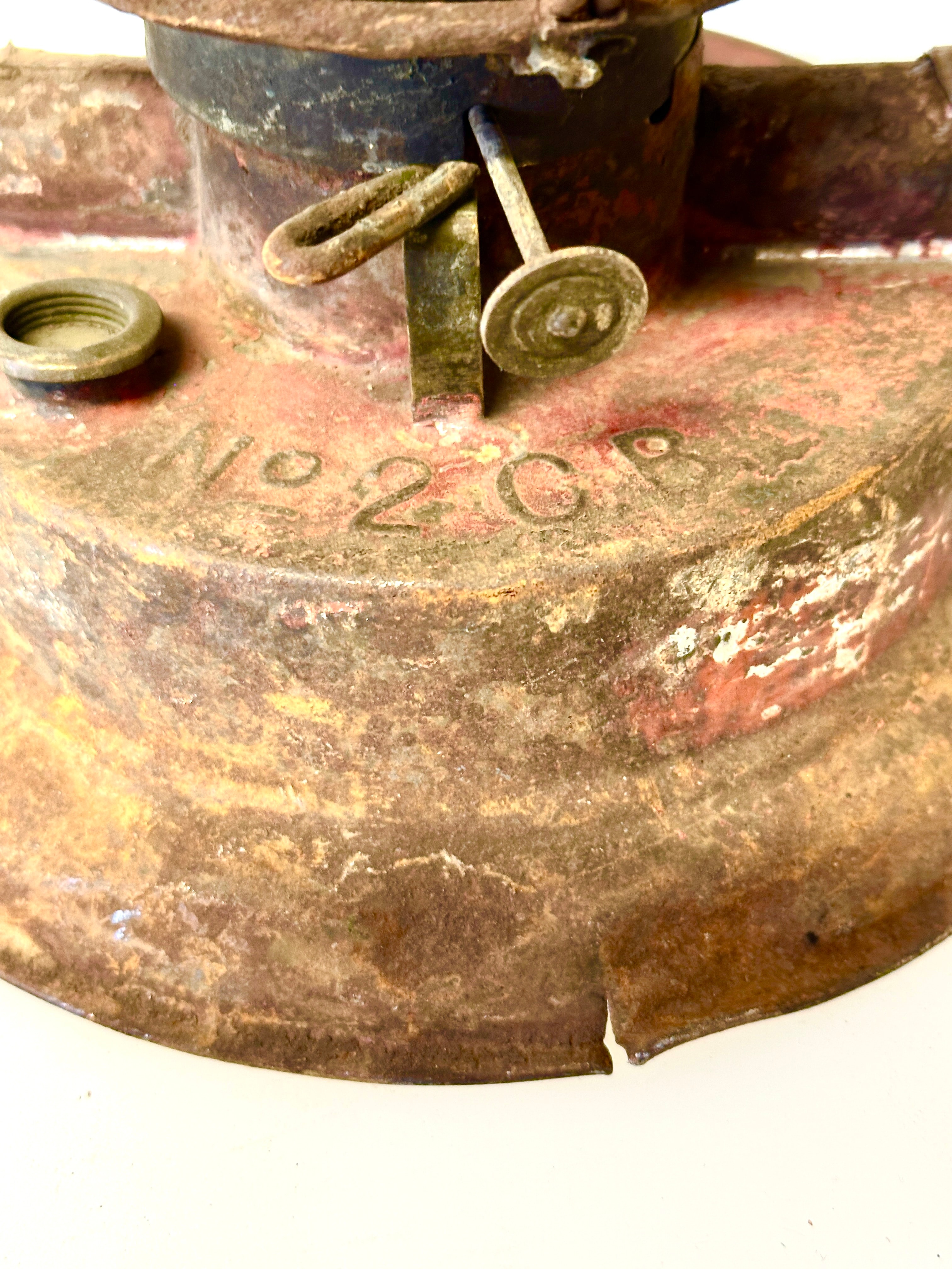 A vintage hurricane-style kerosene lantern by T. Wright & Co., marked ‘Nº 2 C.O.’ on the base. Constructed from red-painted metal, it features a clear glass globe embossed with a prominent ‘V’-shaped emblem and the text ‘BRITISH MADE’. A wire bail handle is present at the top.