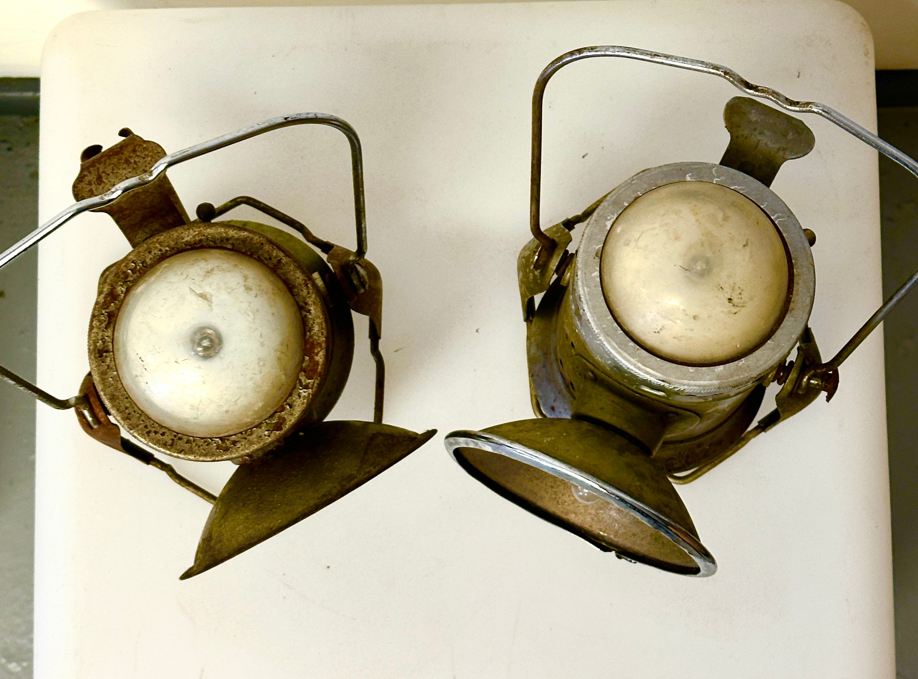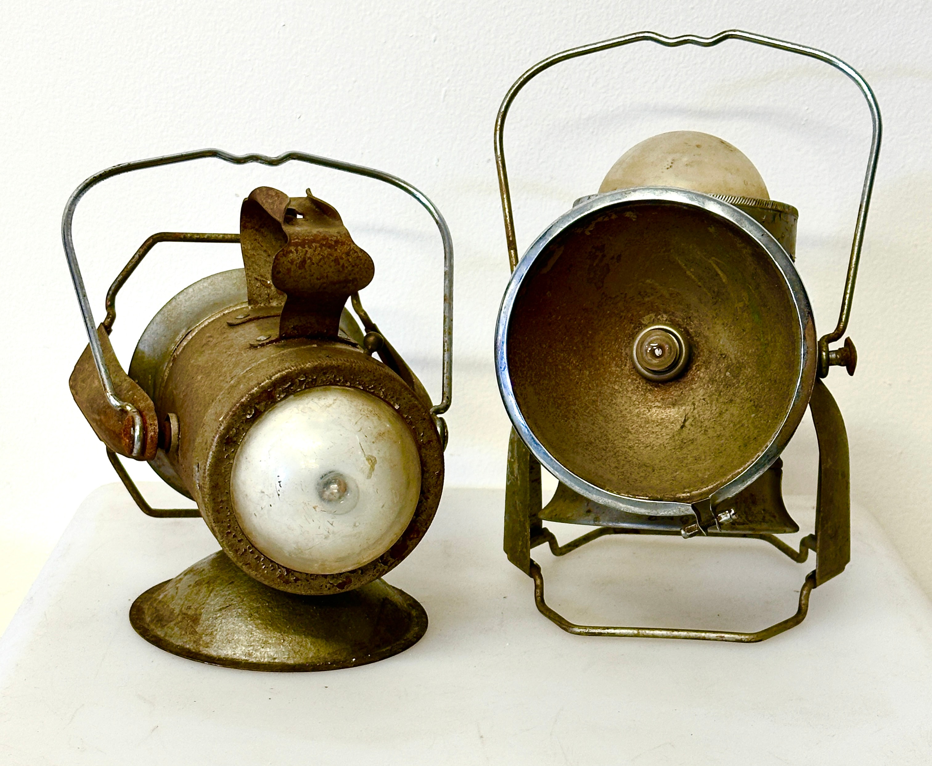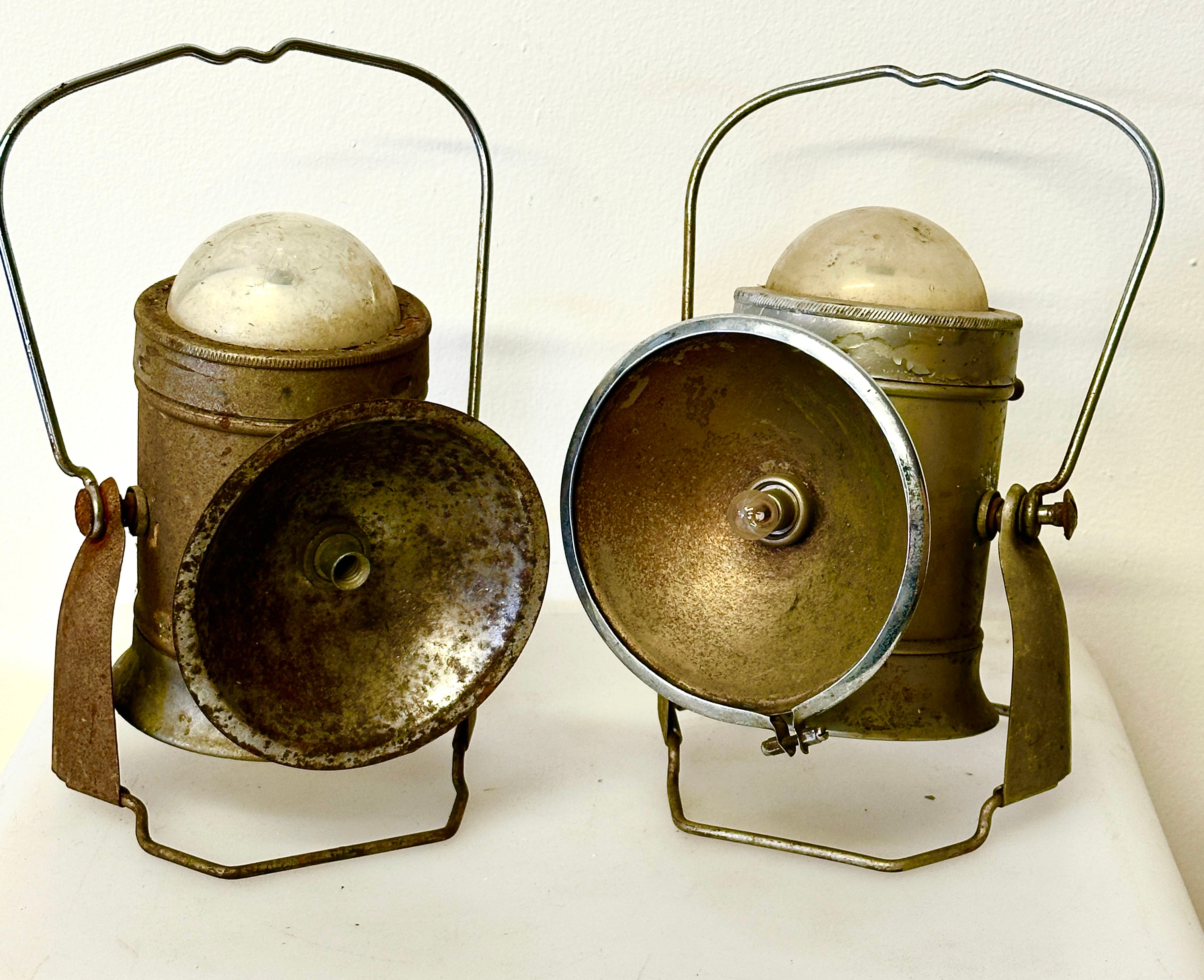 This lot features a pair of vintage industrial-style portable carbide lamps, primarily constructed from oxidized metal, likely steel or tinplate. Both lamps are fitted with wire handles and translucent domed glass or enamel elements. The lamp on the left features faint embossed text “JUWEL” on its rear reflector. These items are presented as unrestored antique pieces.