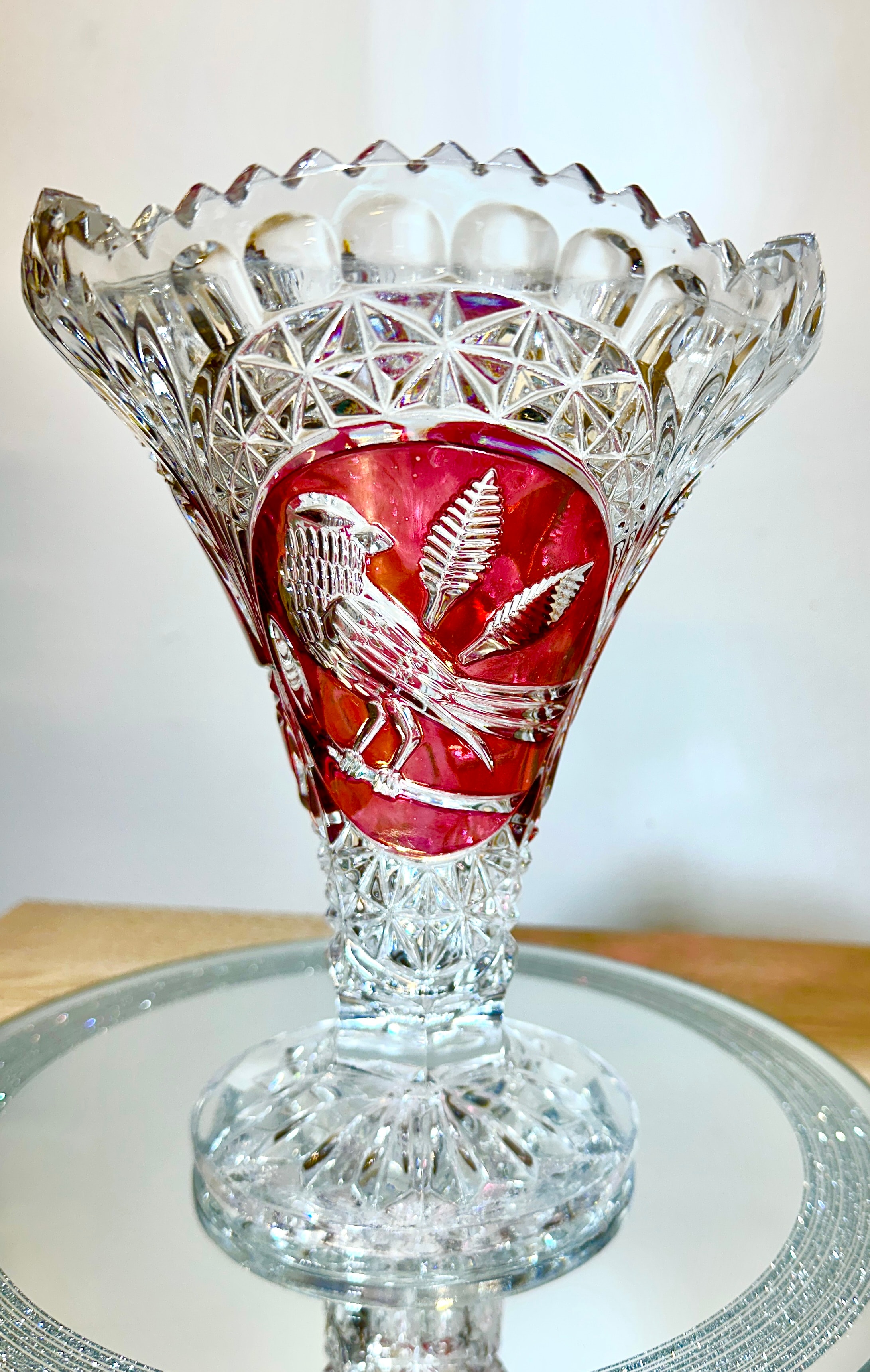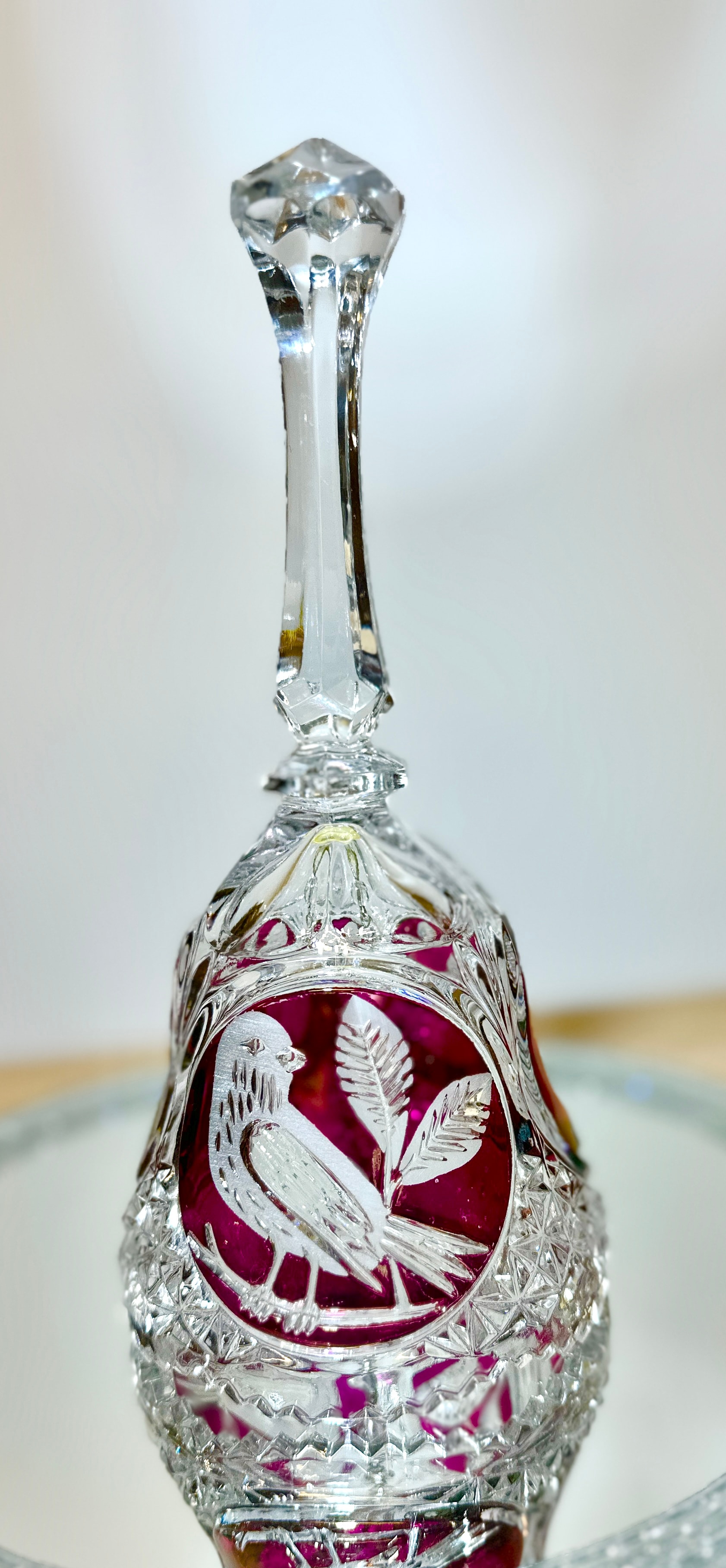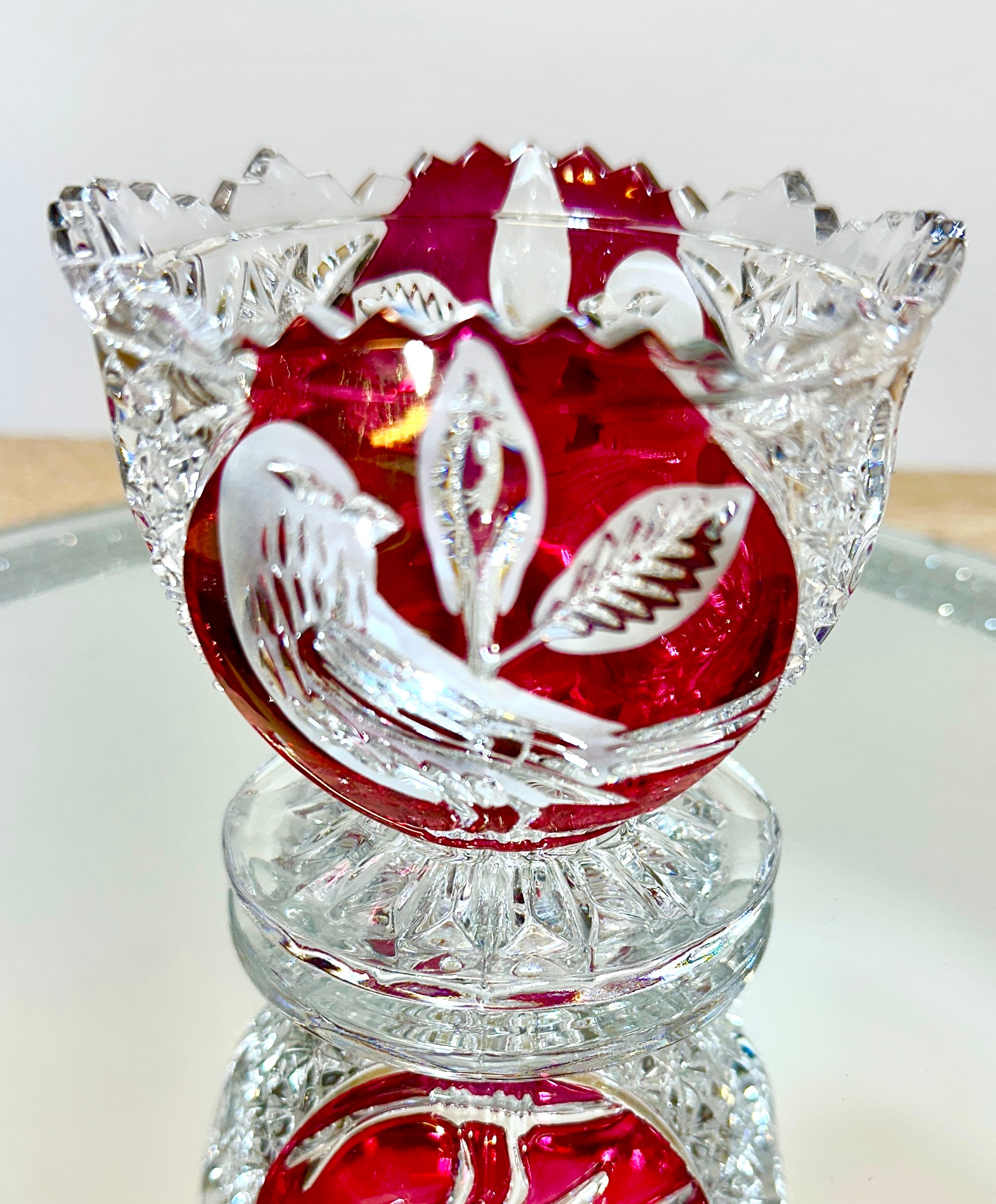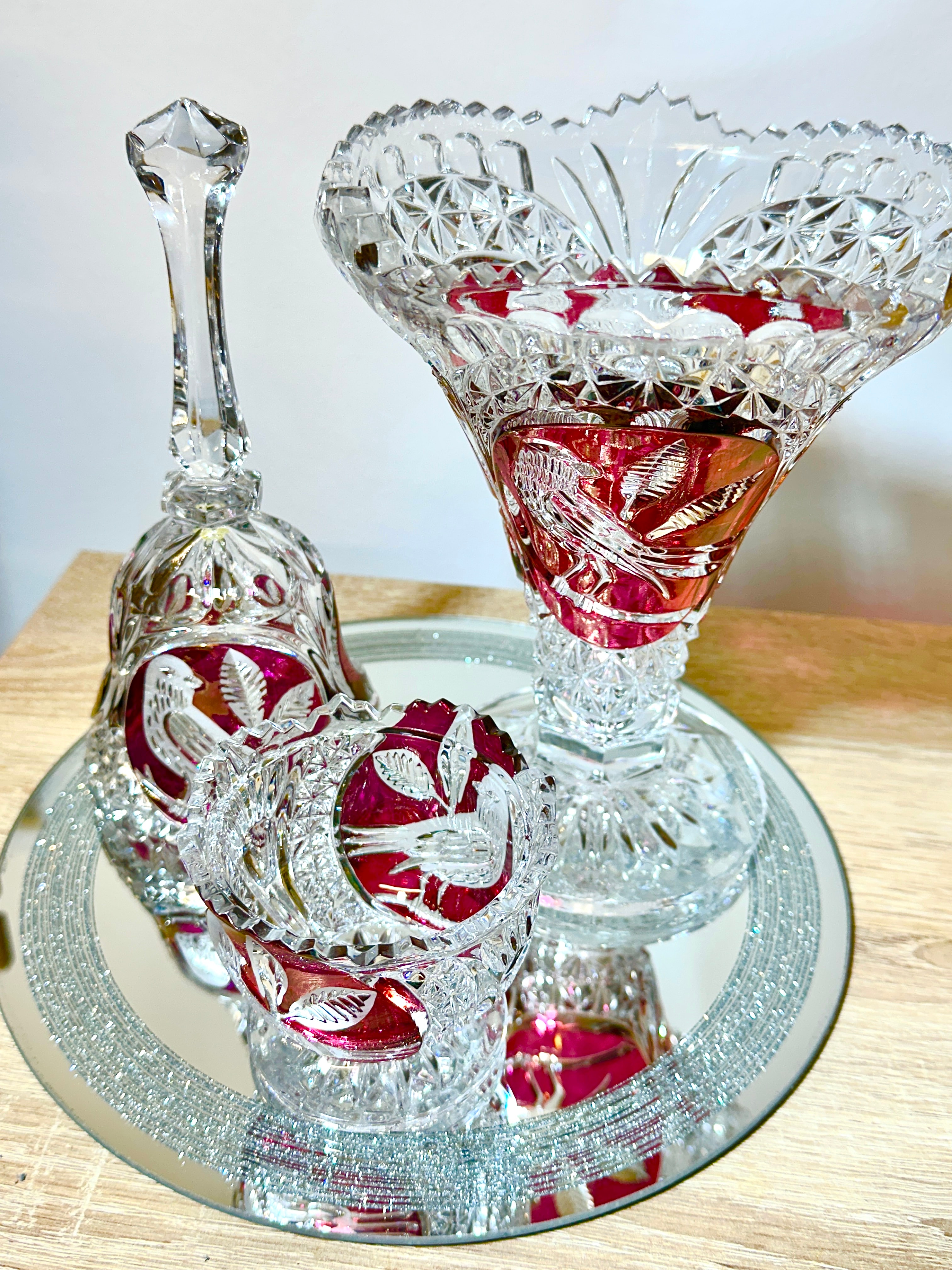 A Hofbauer Byrdes Collection three-piece ruby flashed lead crystal set, comprising a substantial footed bowl, a decorative bell, and a smaller stemmed cup. Each item features extensive geometric cutting, including diamond-point and fan patterns, which contrasts with deeply carved ruby-red panels depicting detailed birds perched on leafy branches. The rims exhibit scalloped and serrated edges. The material is high-quality lead crystal, employing a flashed or overlay technique. No visible text or manufacturer’s marks are present.
