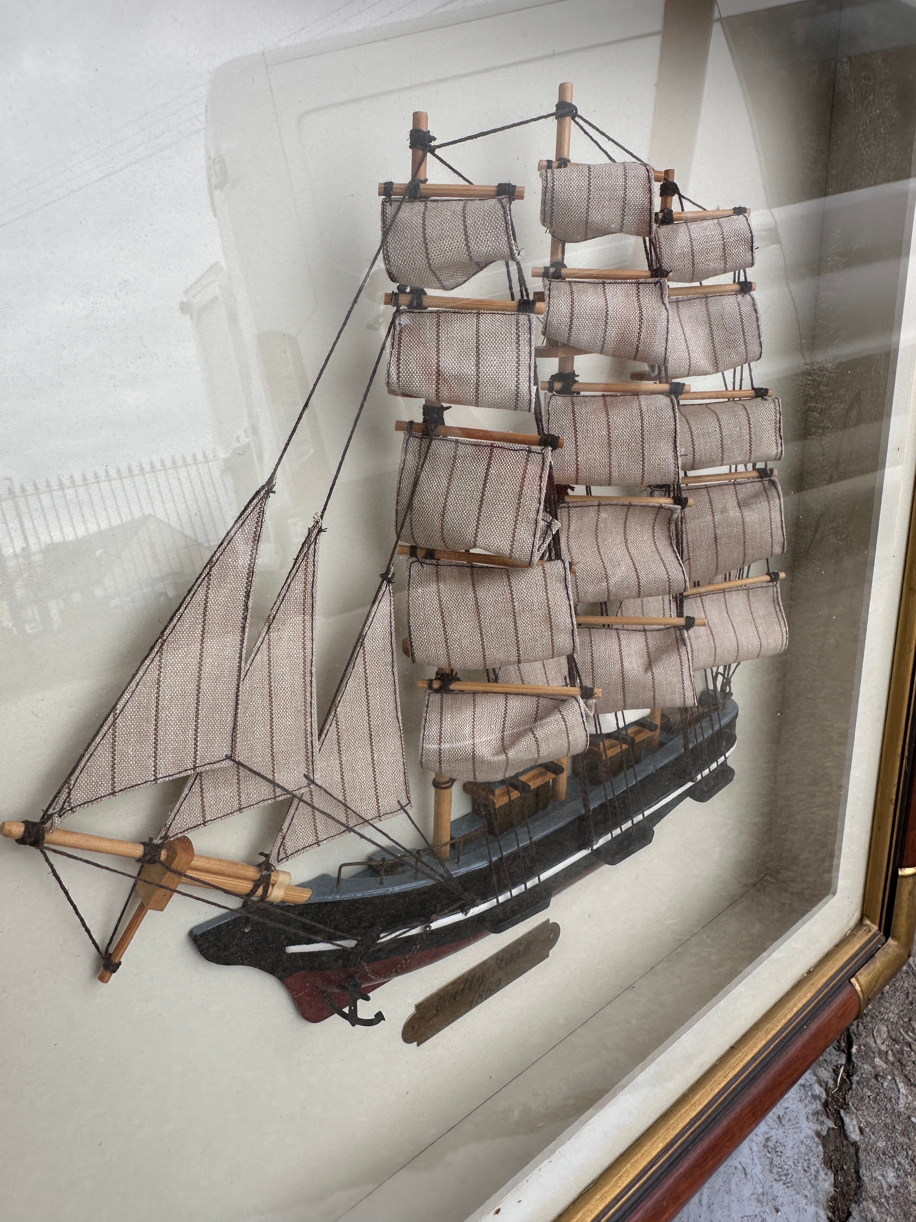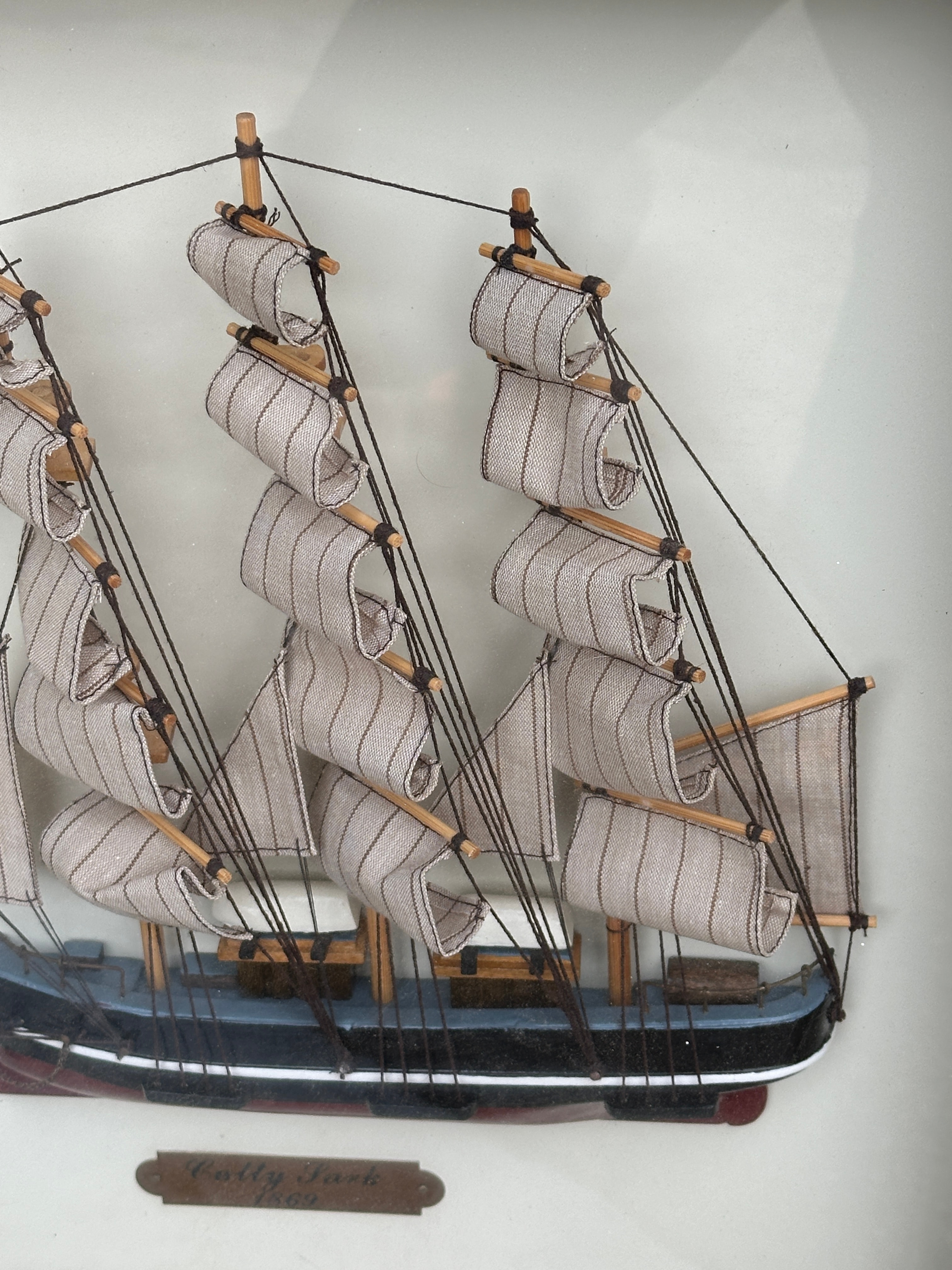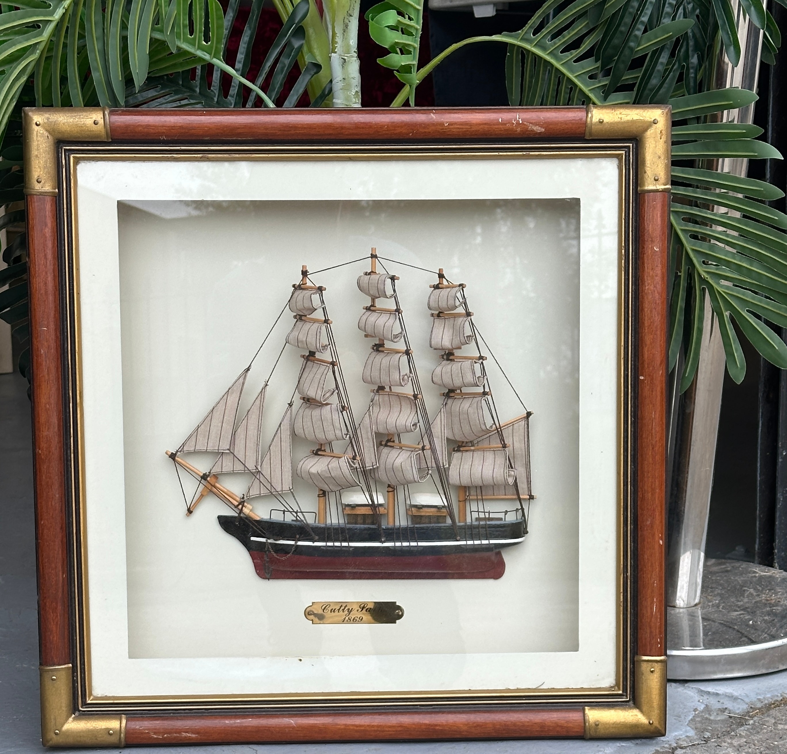 A framed three-dimensional model of the clipper ship ‘Cutty Sark’, presented in a shadow box format. The piece features a dark brown wooden frame with gold-tone metal trim and a glass front, enclosing a detailed model of the historical vessel. The ship model is constructed from wood for the hull, masts, and spars, with textile sails displaying a subtle striped pattern, and dark string rigging, set against a light-colored background. A small plaque affixed to the foreground identifies the ship as “Cutty Sark / 1869.” The reverse is covered with a fiberboard backing and fitted with two metal sawtooth hangers.