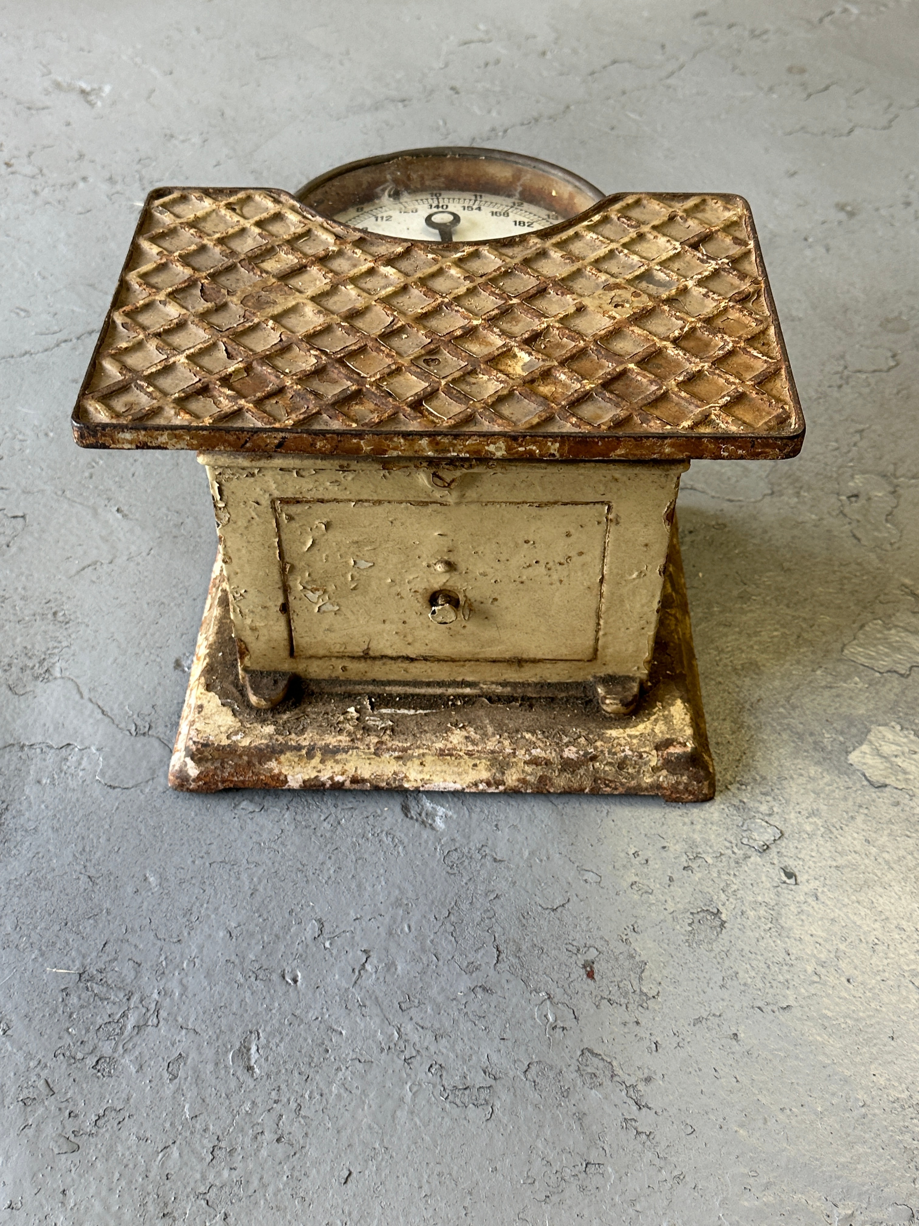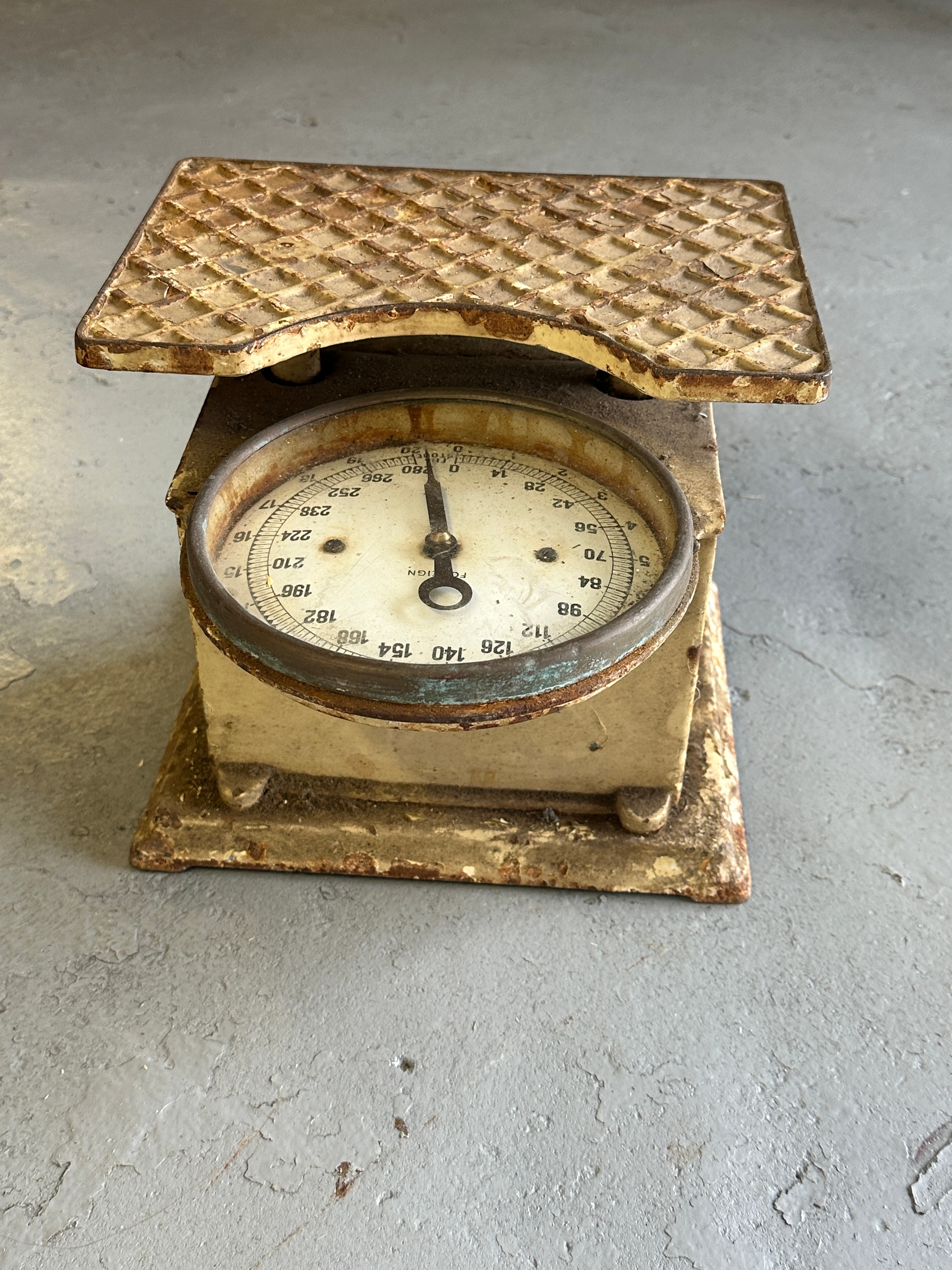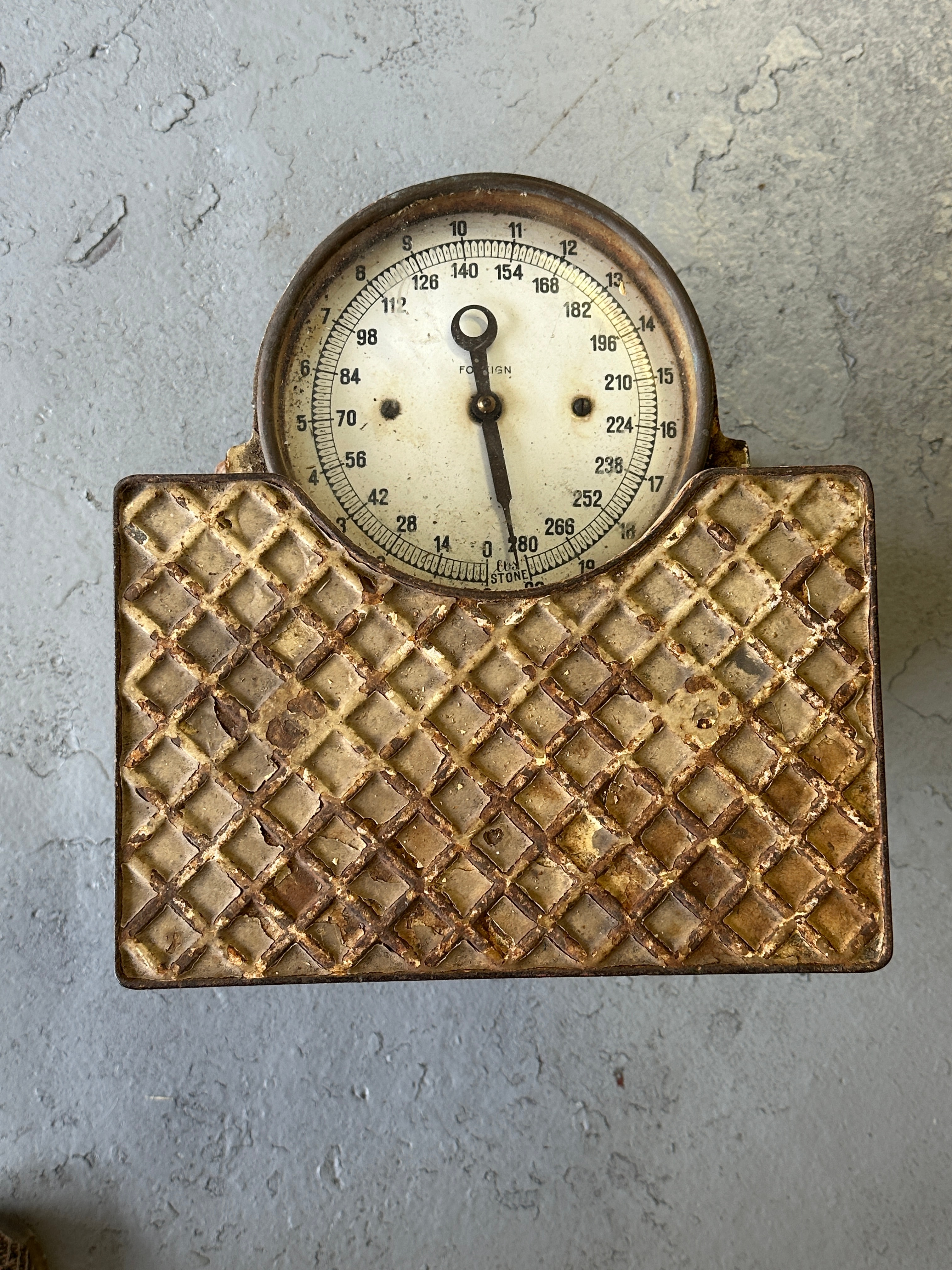 A vintage Detecto cast iron mechanical dial scale. Constructed from painted cast iron, featuring a heavily rusted, diamond-patterned weighing platform. The base and stand, originally a cream or off-white color, show significant paint loss and chipping. The circular dial face, which appears discolored and possibly missing its protective cover, displays numerical markings ranging from 0 to 280, with a central pointer. Clearly visible text on the dial reads “FOREIGN,” indicating its probable origin outside the country of sale.