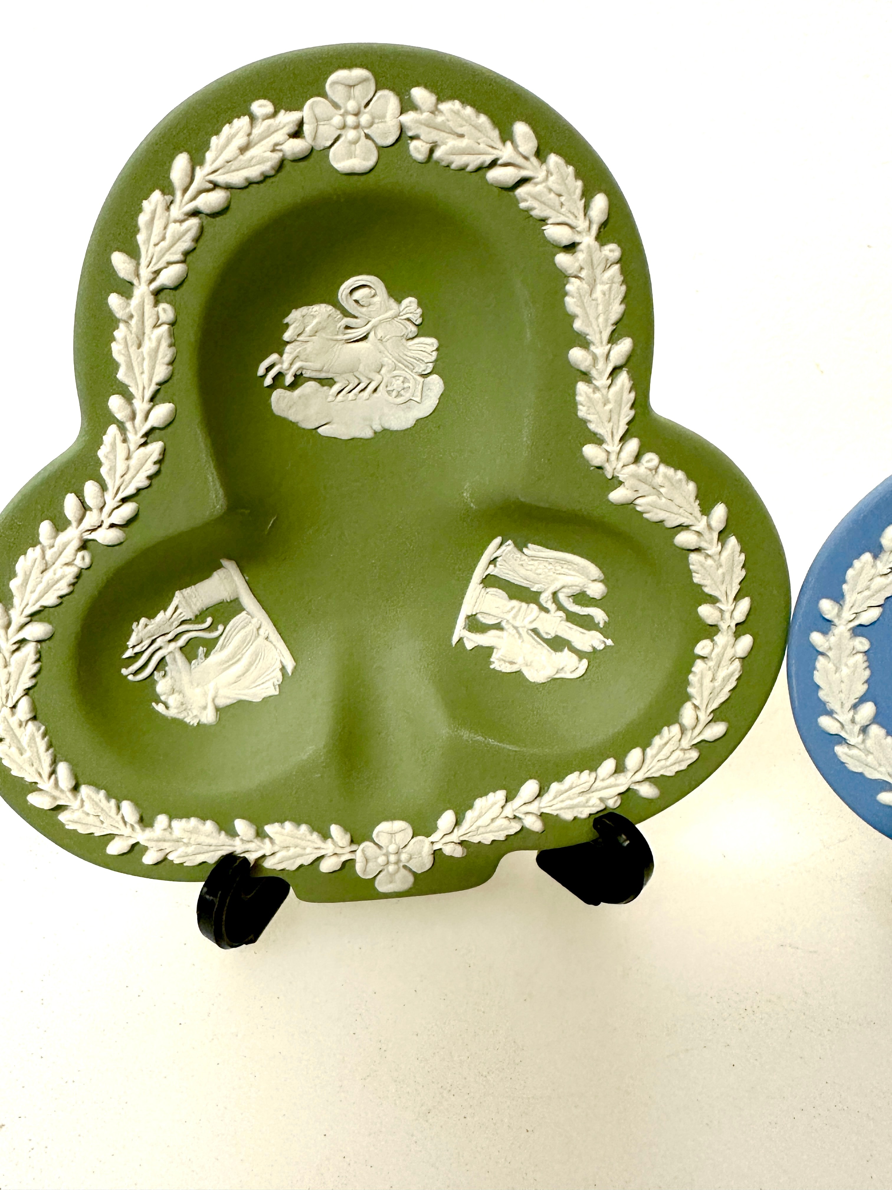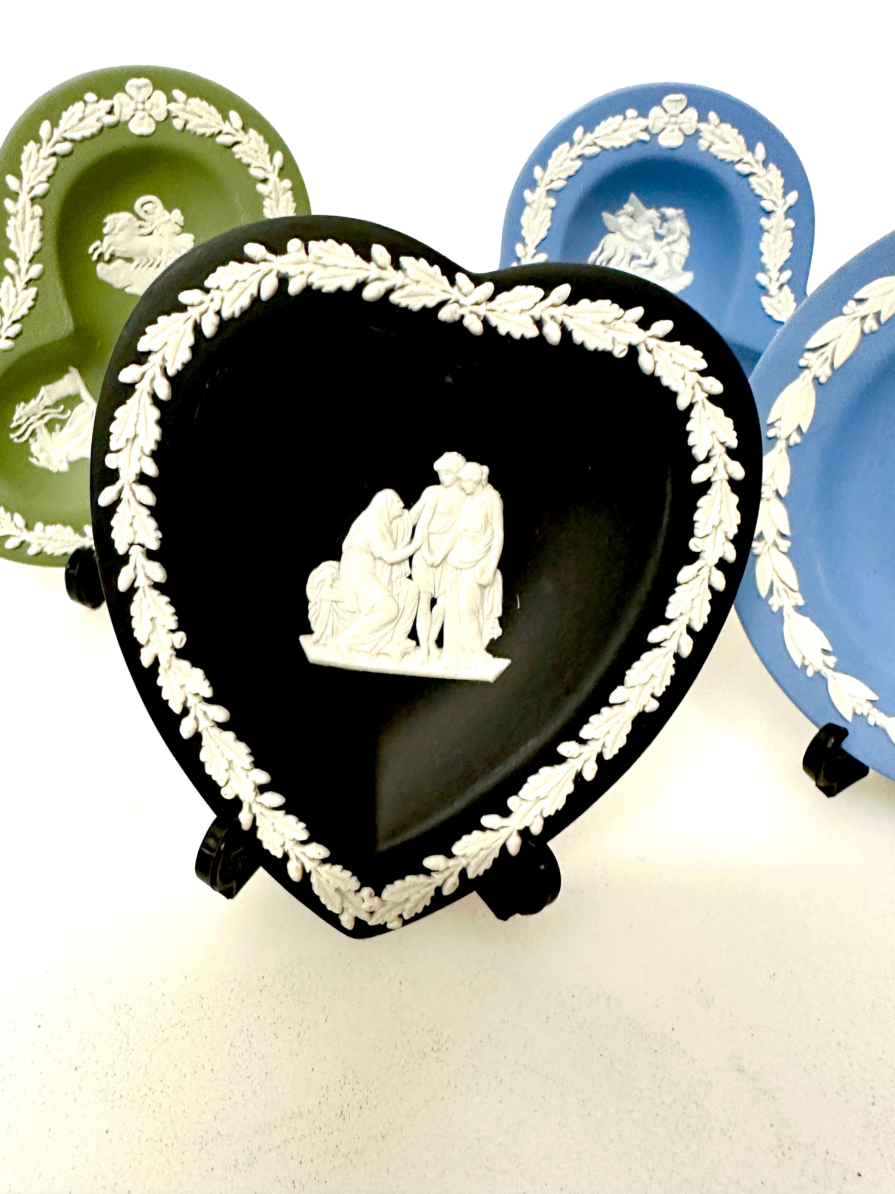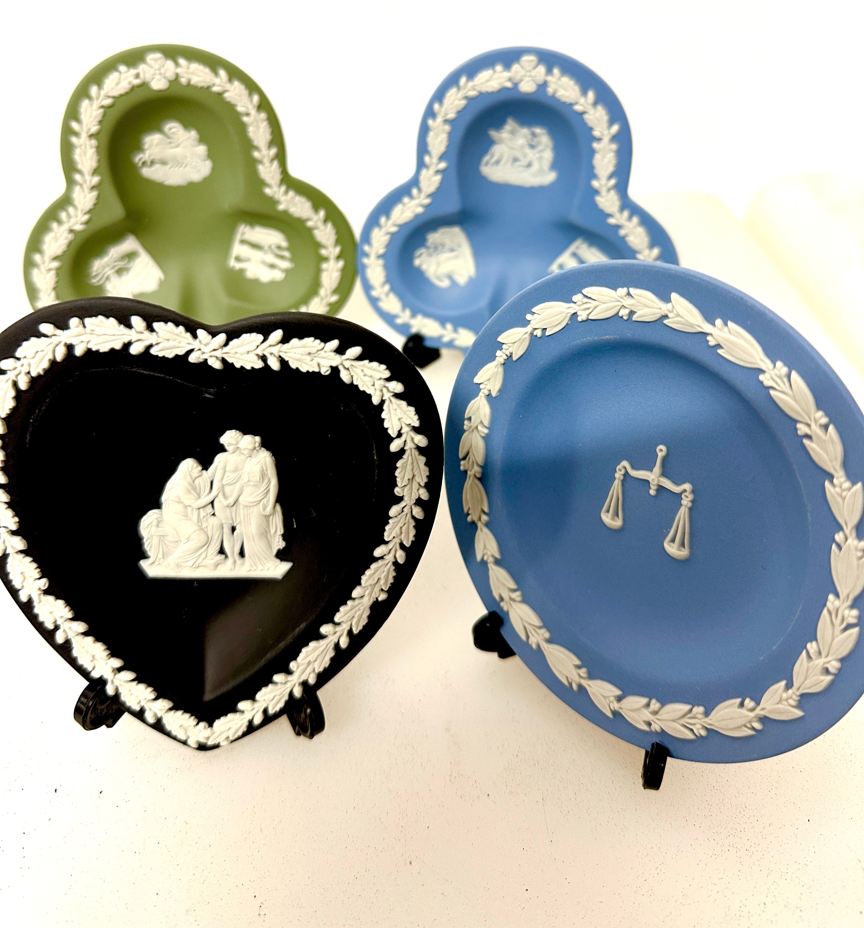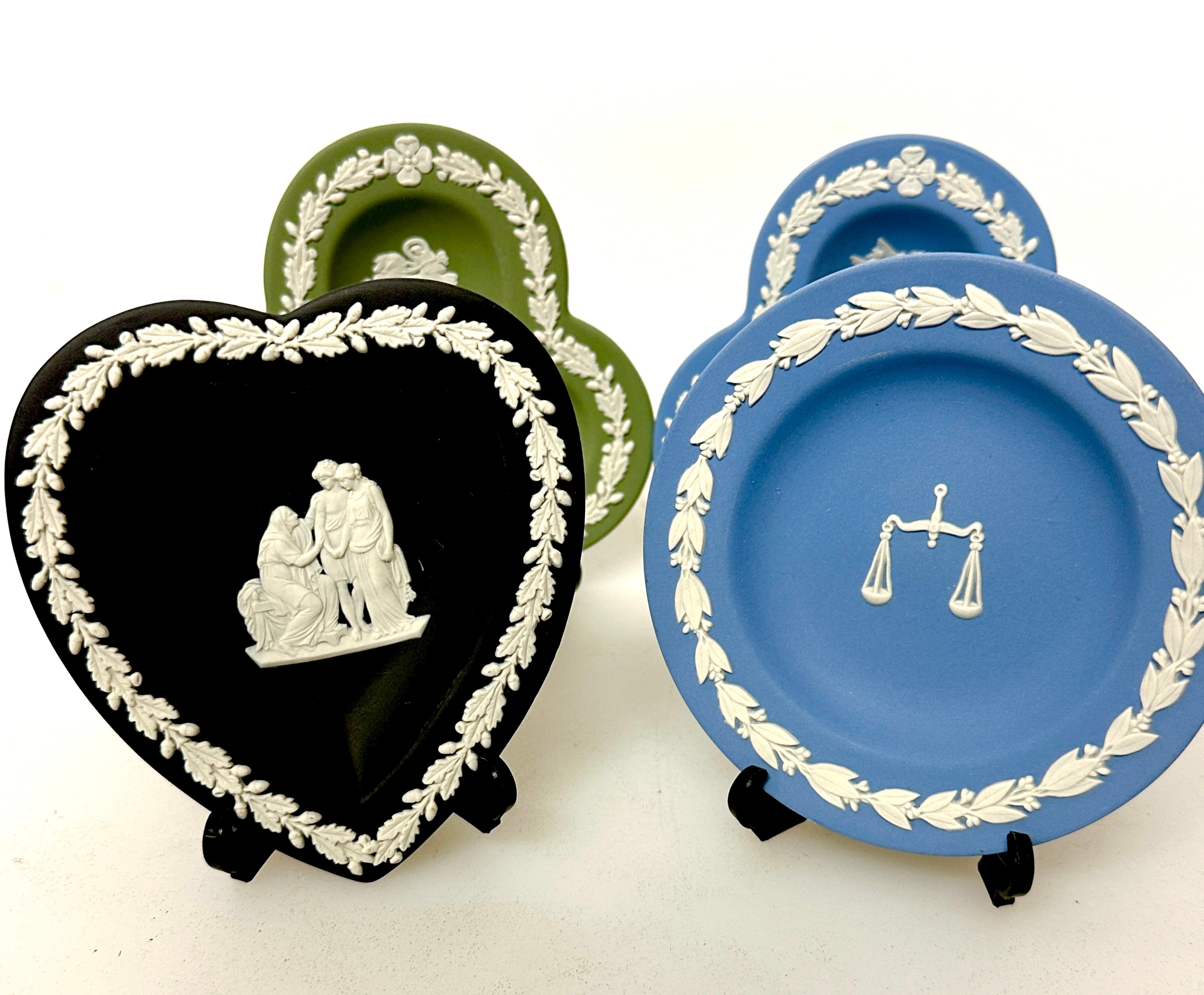 A group of four Wedgwood Jasperware decorative dishes, crafted from unglazed ceramic with a matte finish. The collection includes one heart-shaped dish in black, two lobed/trefoil dishes in olive green and light blue, and one oval dish in light blue. Each dish features white raised relief decorations in a Neoclassical style, bordered by laurel wreath or similar botanical motifs. Central scenes depict classical figures on the black heart-shaped dish and the olive green lobed dish, a mounted figure on the light blue lobed dish, and a set of scales on the light blue oval dish, which is identified as the ‘Libra’ Zodiac series. An impressed mark “WEDGWOOD MADE IN ENGLAND” is present on the reverse of one item.