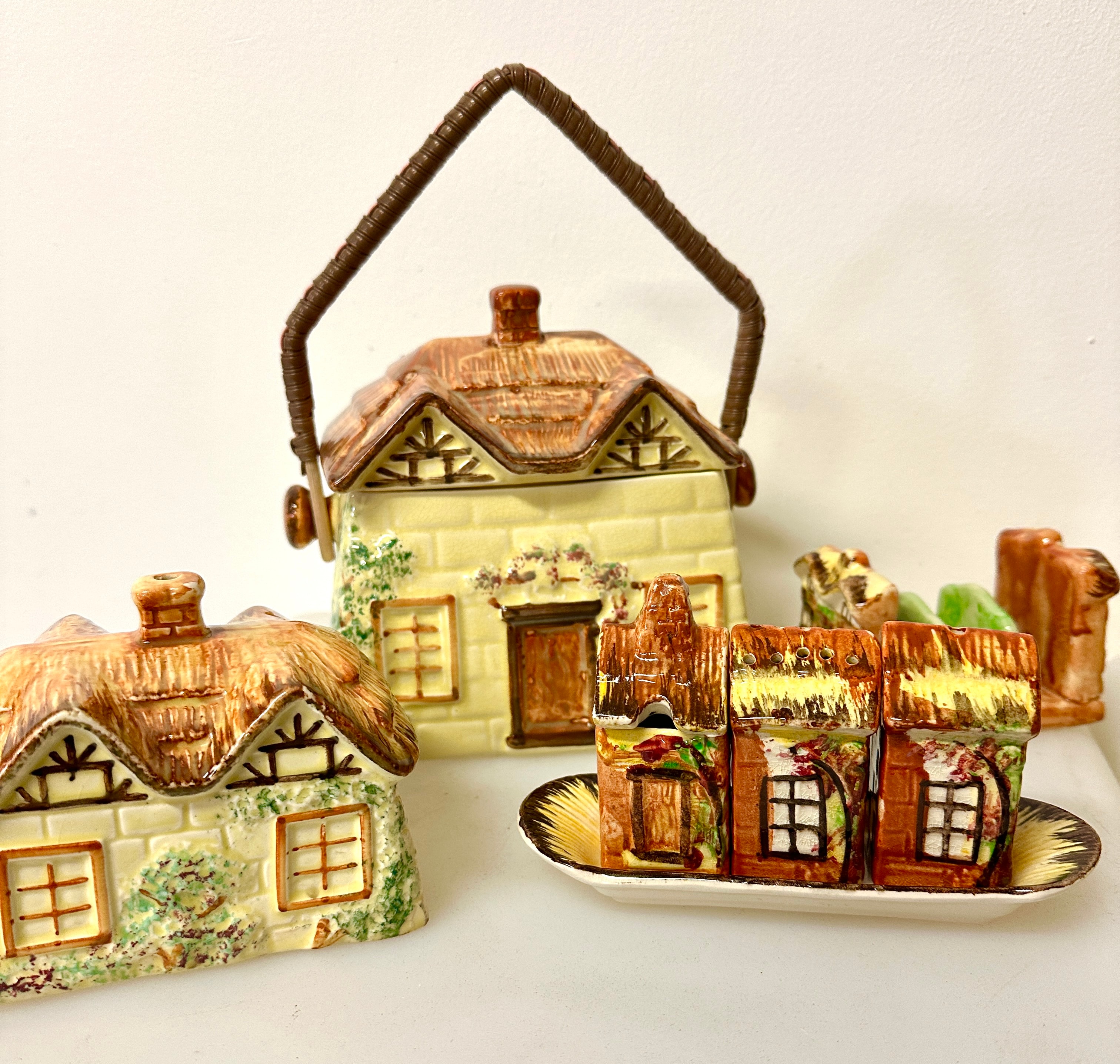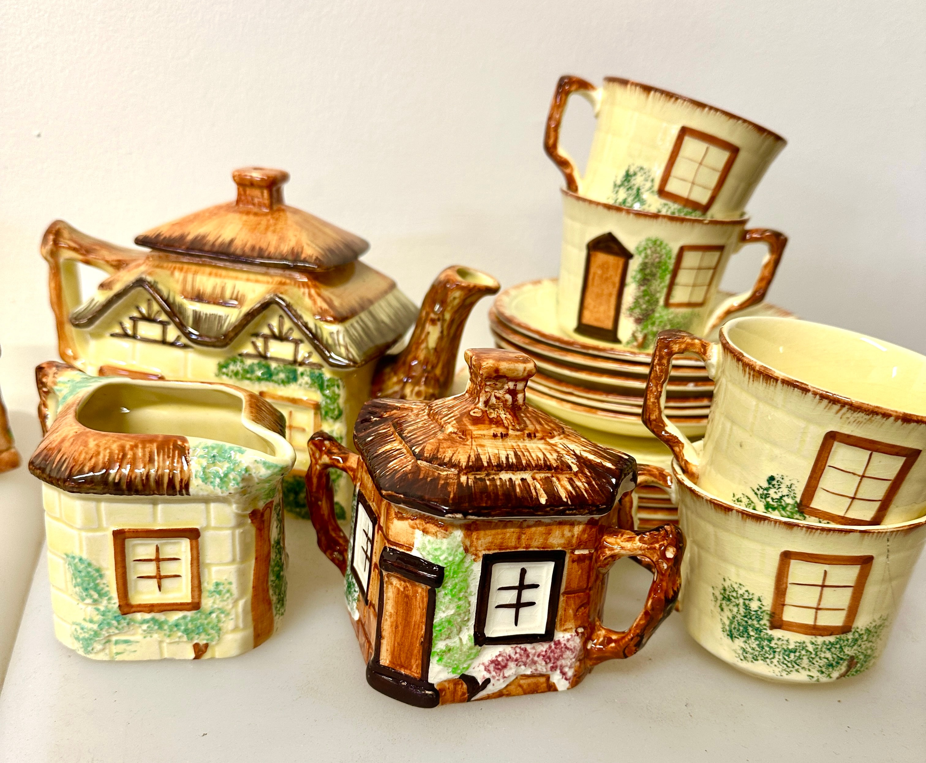 A collection of Keele Street Pottery Co. Ltd. Cottage Ware tableware, comprising glazed ceramic pieces hand-painted with details resembling quaint English cottages. The assortment includes a lidded biscuit barrel with a woven-look handle, a teapot, a creamer, a lidded sugar bowl, three shakers presented on a matching tray, and multiple teacups with coordinating saucers. Each item features a distinct cottage design with thatched roofs, exposed timber-effect beams, and textured walls in various shades of cream, brown, green, and pink. A clear circular green stamp on the base of one piece reads “KEELE ST POTTERY CO. LTD ENGLAND Handpainted,” with additional raised text “ENGLAND.”