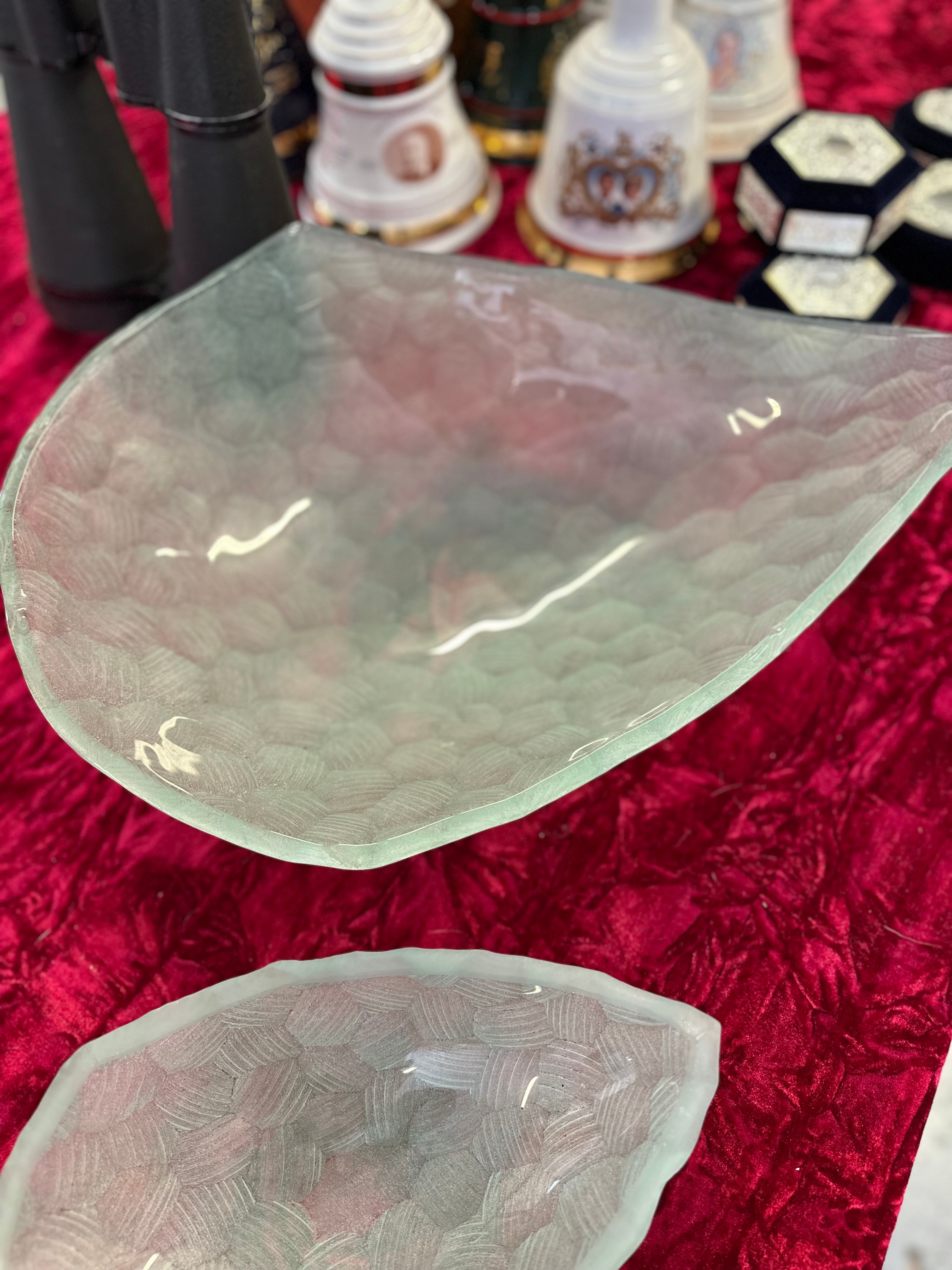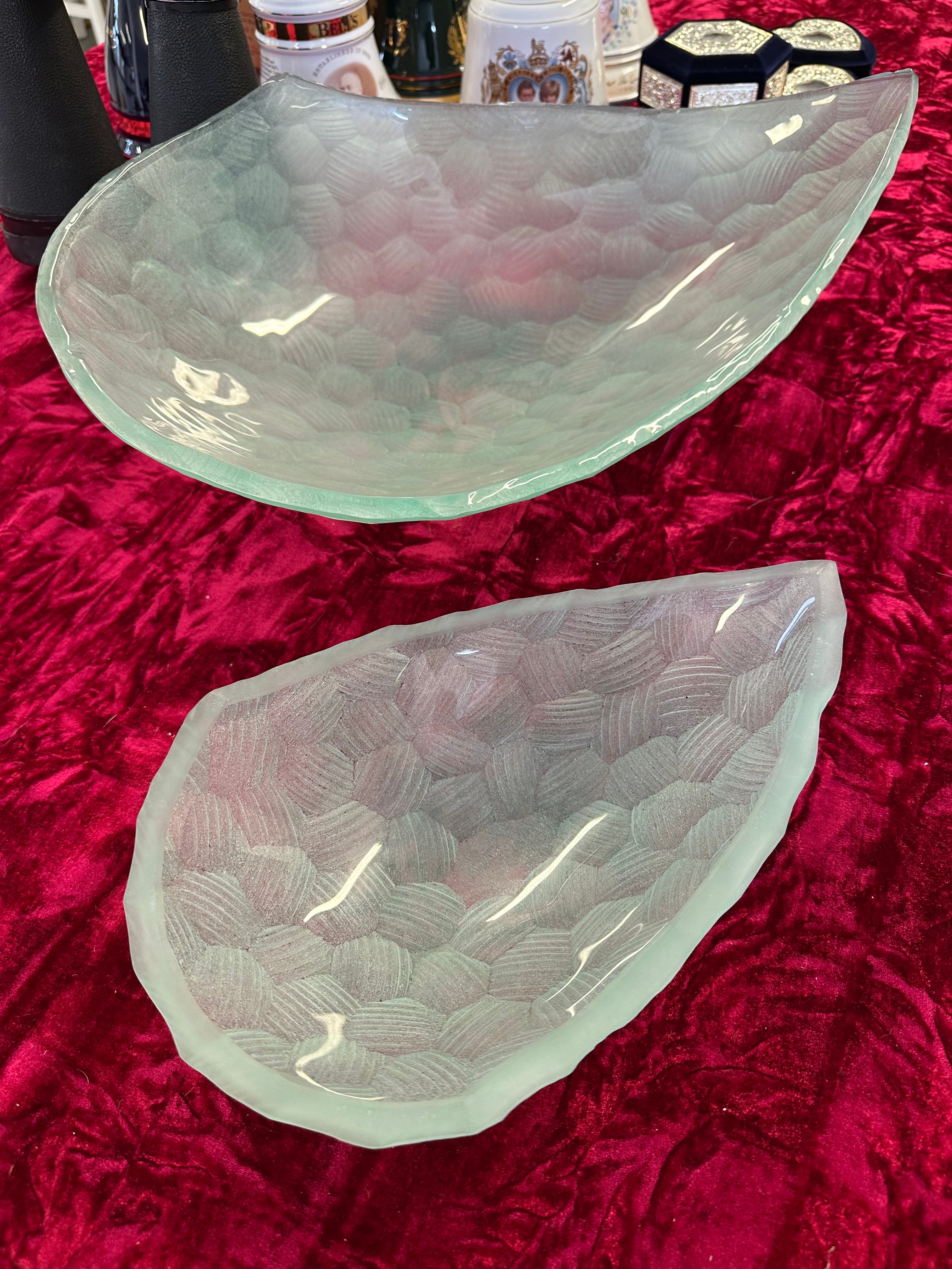 A pair of contemporary-style glass dishes, each of irregular, organic, or leaf-like form, with one piece notably larger than the other. Crafted from translucent glass, the objects exhibit a subtle gradient of green-blue to pinkish hues. They feature a distinctive, textured, basketweave-like pattern across their exterior surfaces, while their interior bowls and rims appear smooth and polished. No visible text, maker’s marks, or inscriptions are discernible.