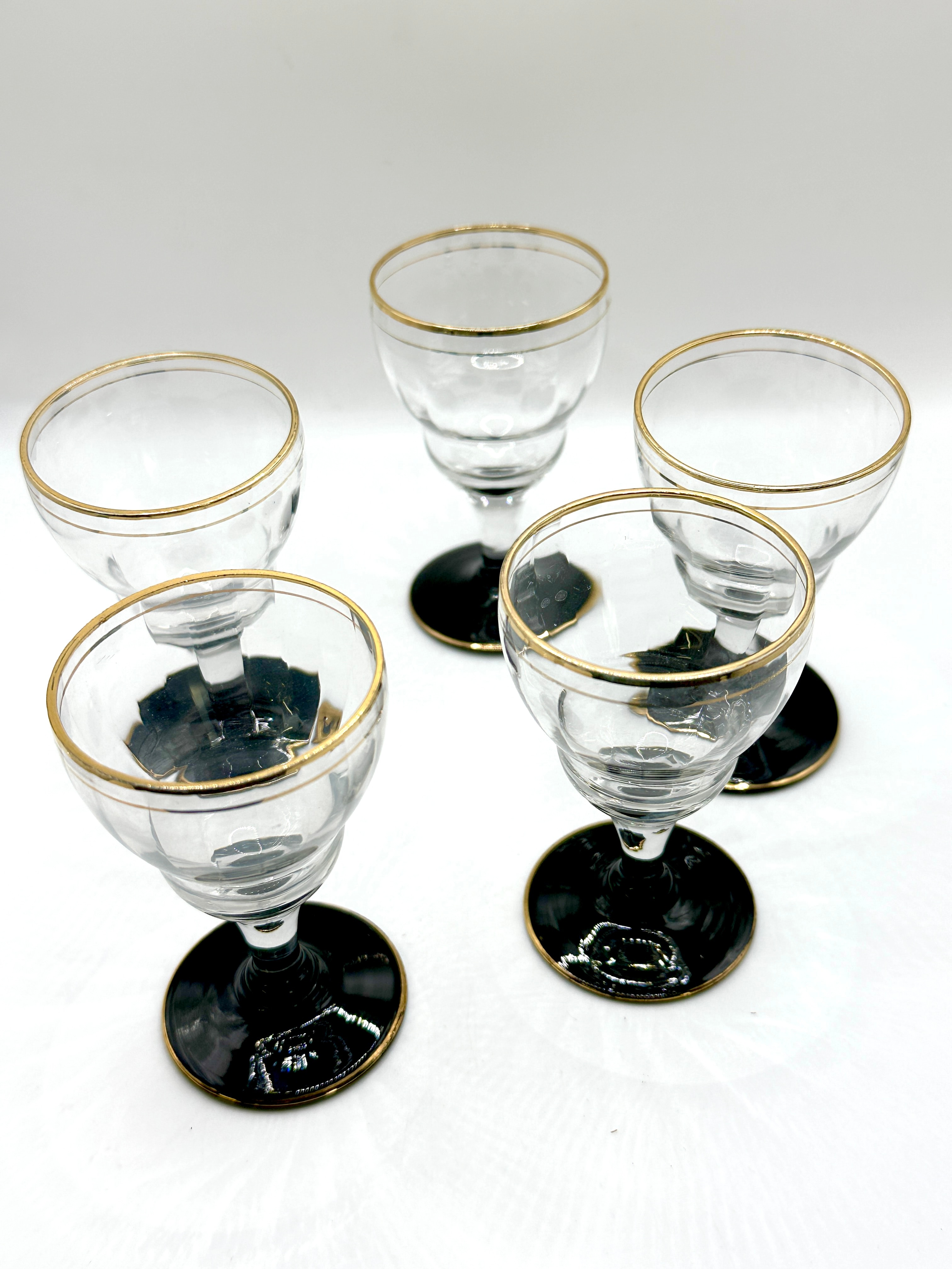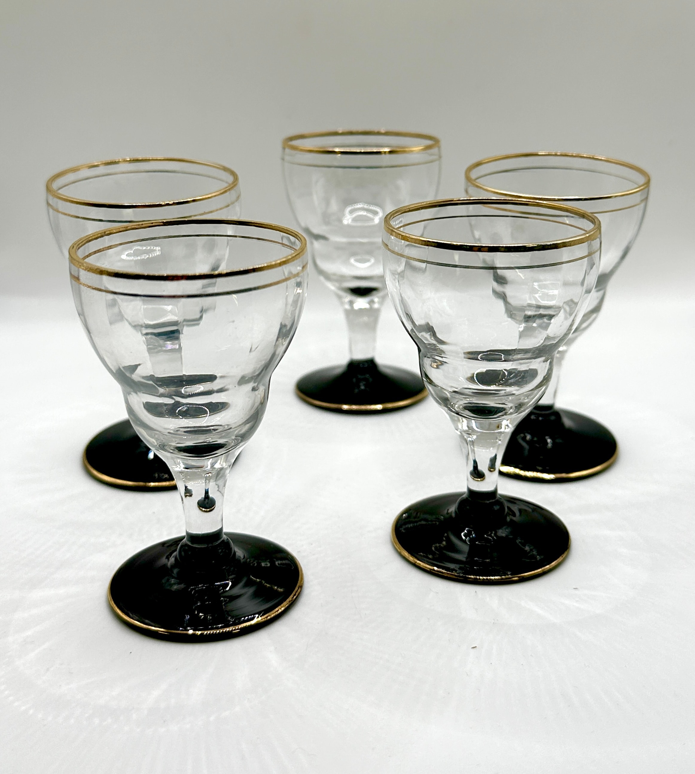 A set of five Fostoria Platinum Rim cordial or liqueur glasses. Each features a clear glass tapered bowl, a short stem, and a flat, circular opaque black base. All rims and the outer edges of the black bases are adorned with a thin gilt (gold-colored) band. The design evokes a mid-20th century aesthetic.