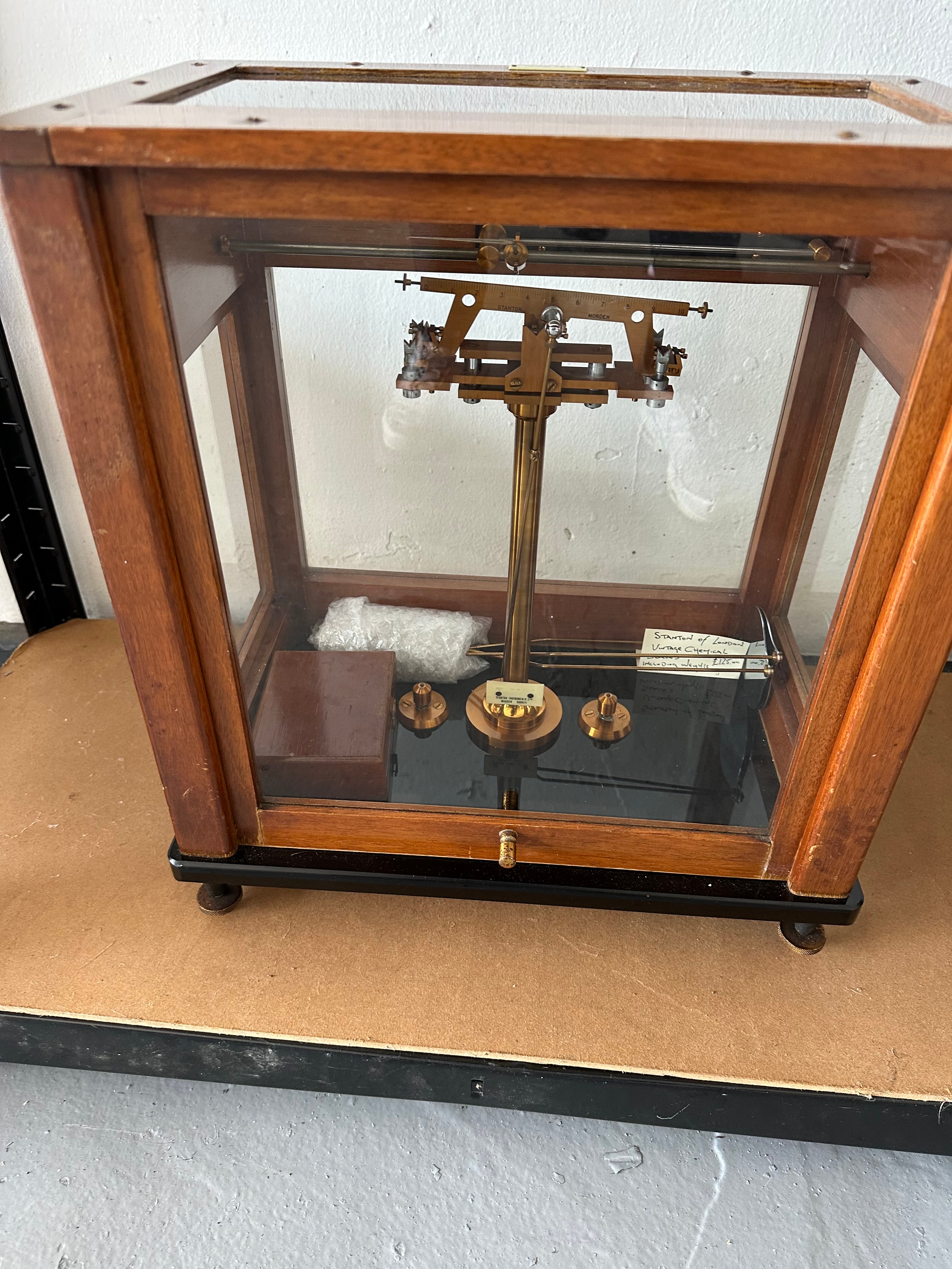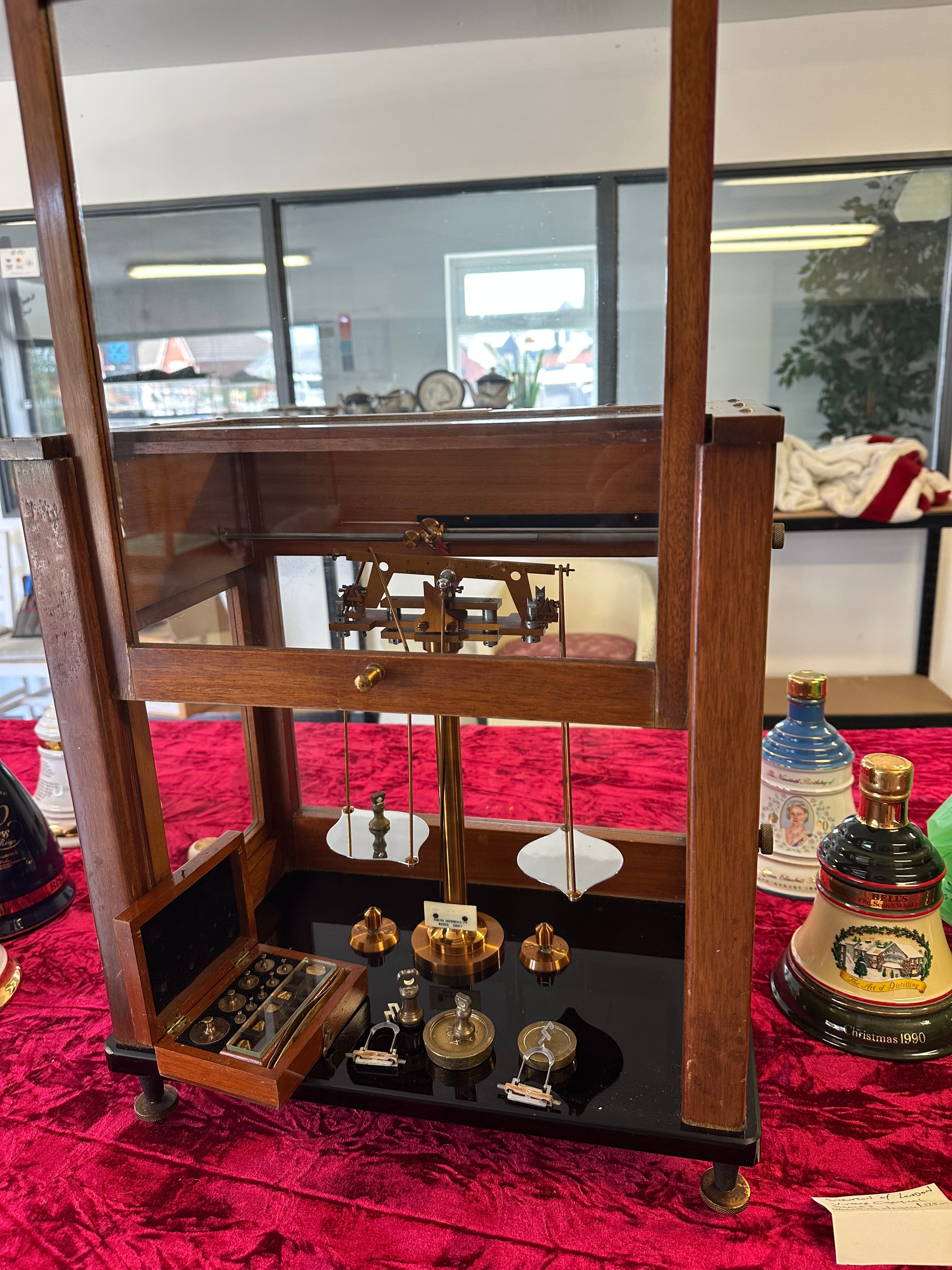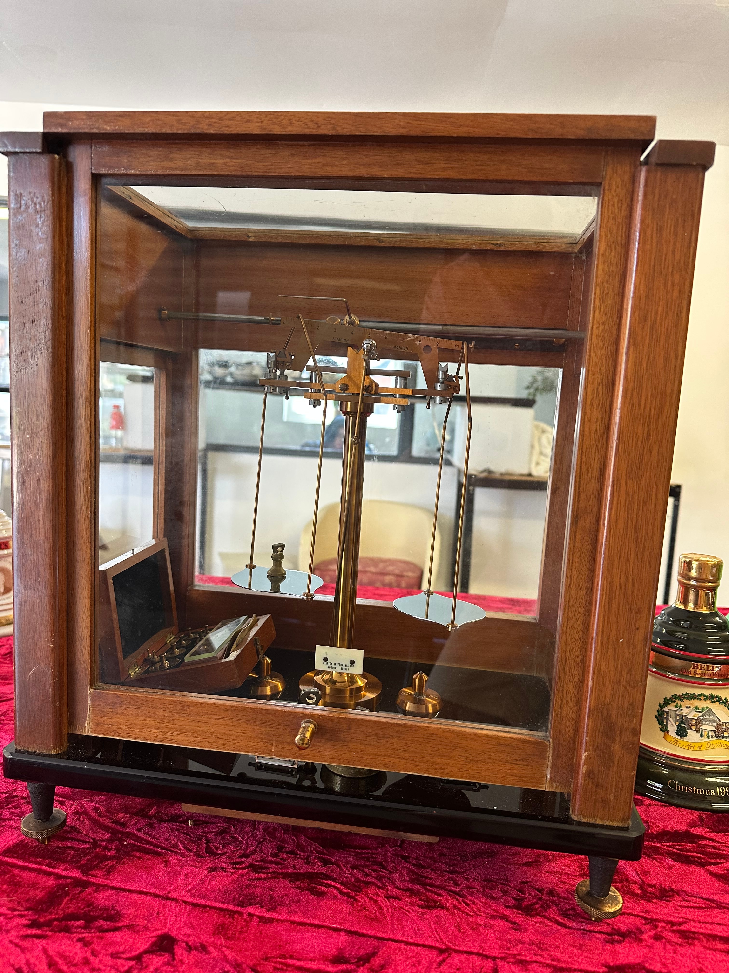 A precision analytical balance scale, enclosed within a polished dark wood and glass display case, set on a black base with brass leveling feet. The intricate balancing mechanism, central column, and two delicate weighing pans are constructed from brass-toned metal. The scale is accompanied by a comprehensive set of brass weights, including larger cylindrical weights, some marked “10g”, “20g”, and “50g”. Additionally, a velvet-lined wooden box contains numerous smaller, precision weights, some appearing gold-plated or gilded, with visible milligram denominations. A white label inside the case reads: “OHAUS (OVERWEIGHT) 160g CAPACITY 0.1mg SENSITIVITY.”