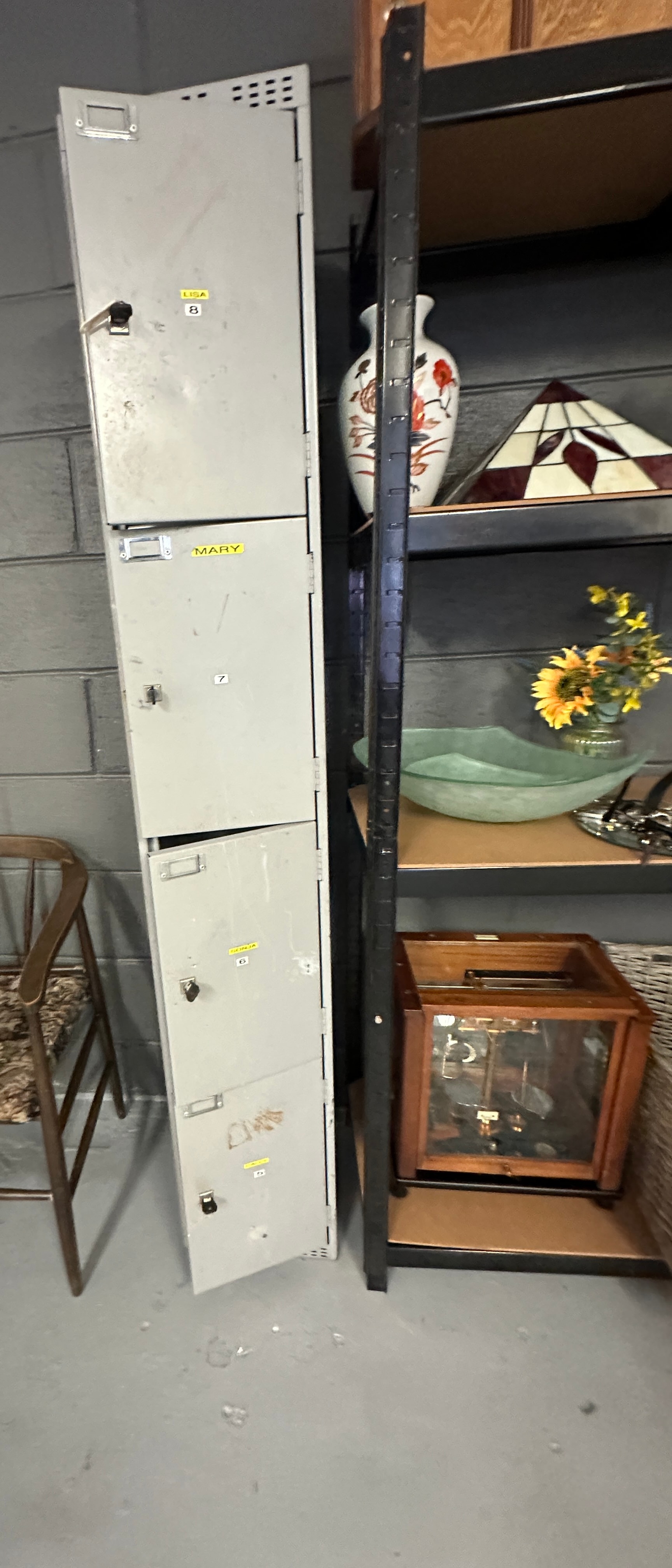 A tall, utilitarian industrial-style locker unit constructed from painted light grey sheet metal, likely steel. It features five vertically stacked individual compartments, each equipped with a recessed handle and keyhole, and ventilation slats visible at the top and bottom. Four of the doors bear yellow adhesive labels: the top door is marked “LISA B”, the second from the top “MARY 7”, the third “DONNA G”, and the bottom “SALLY B”.