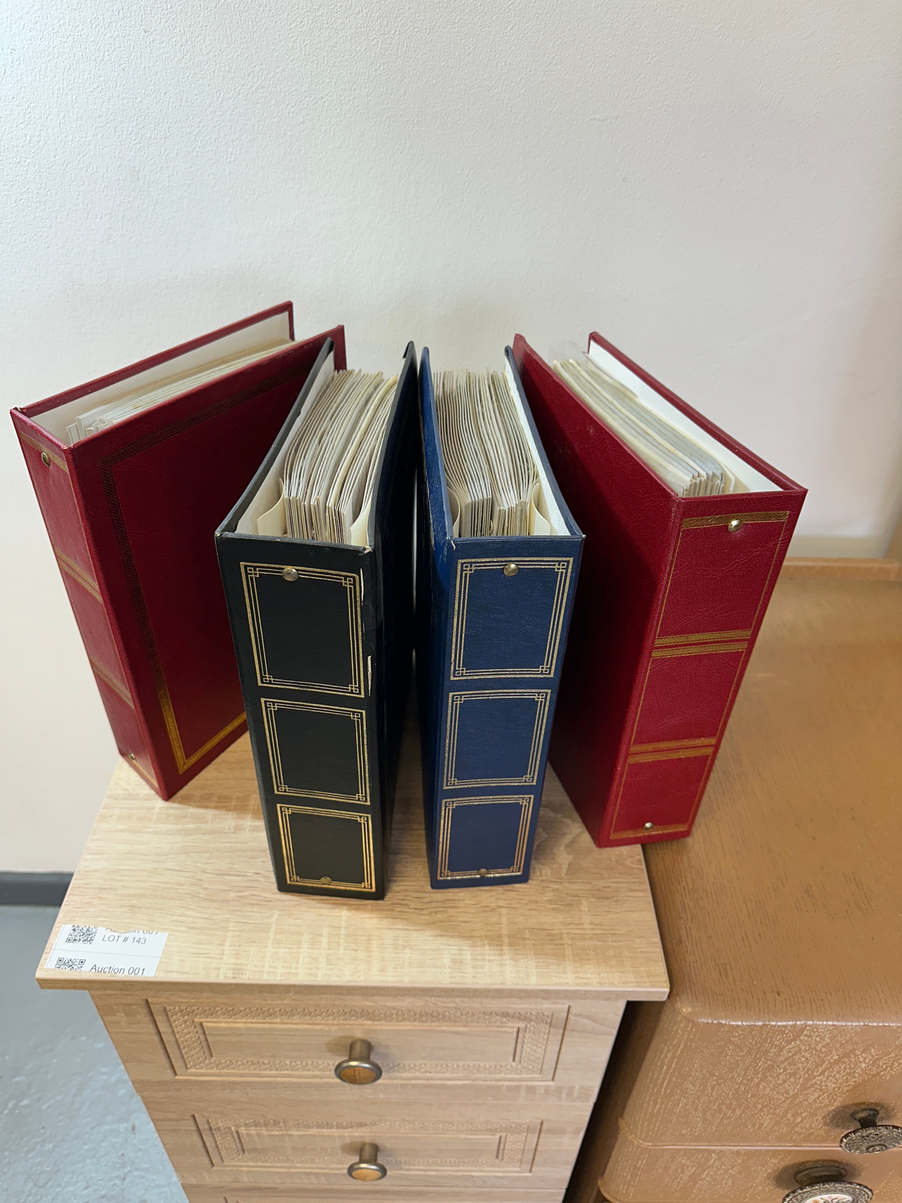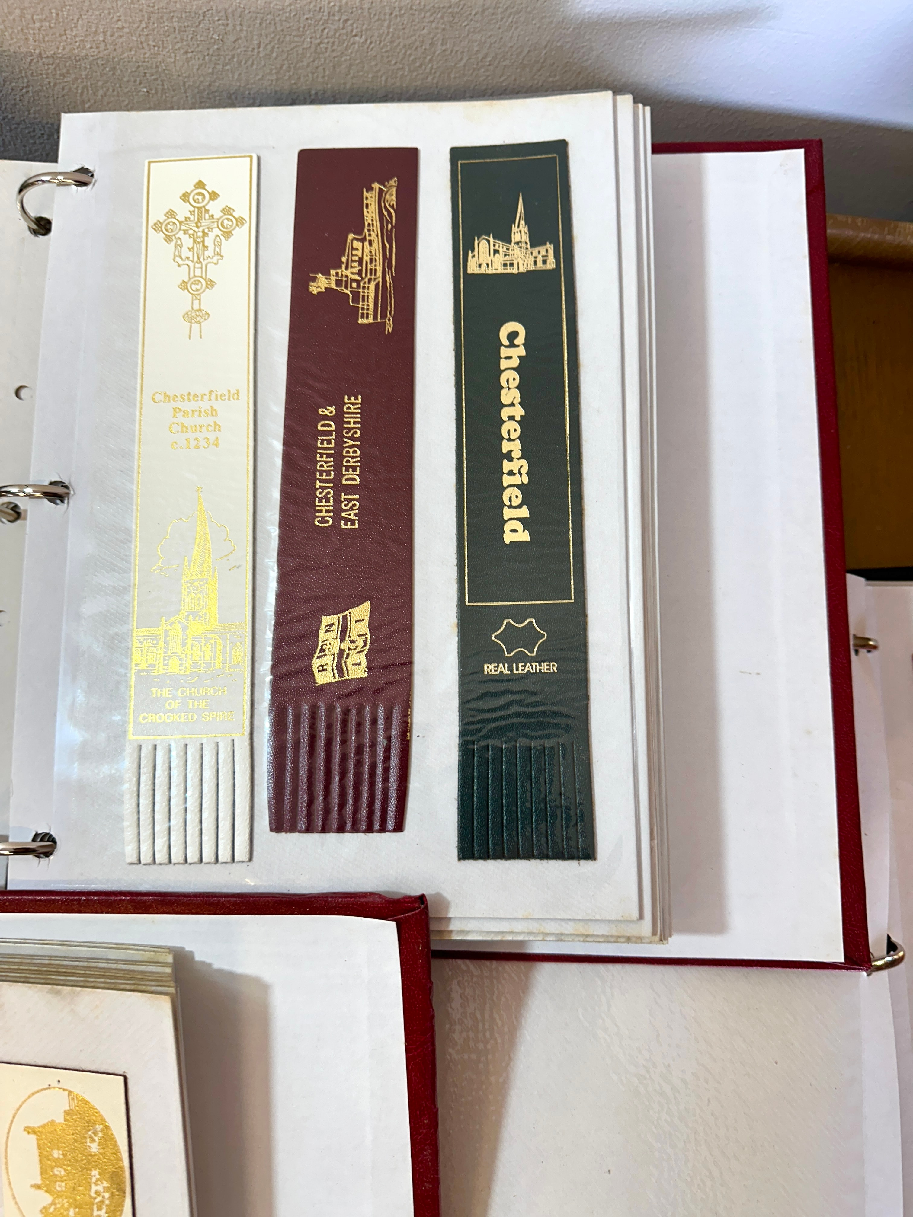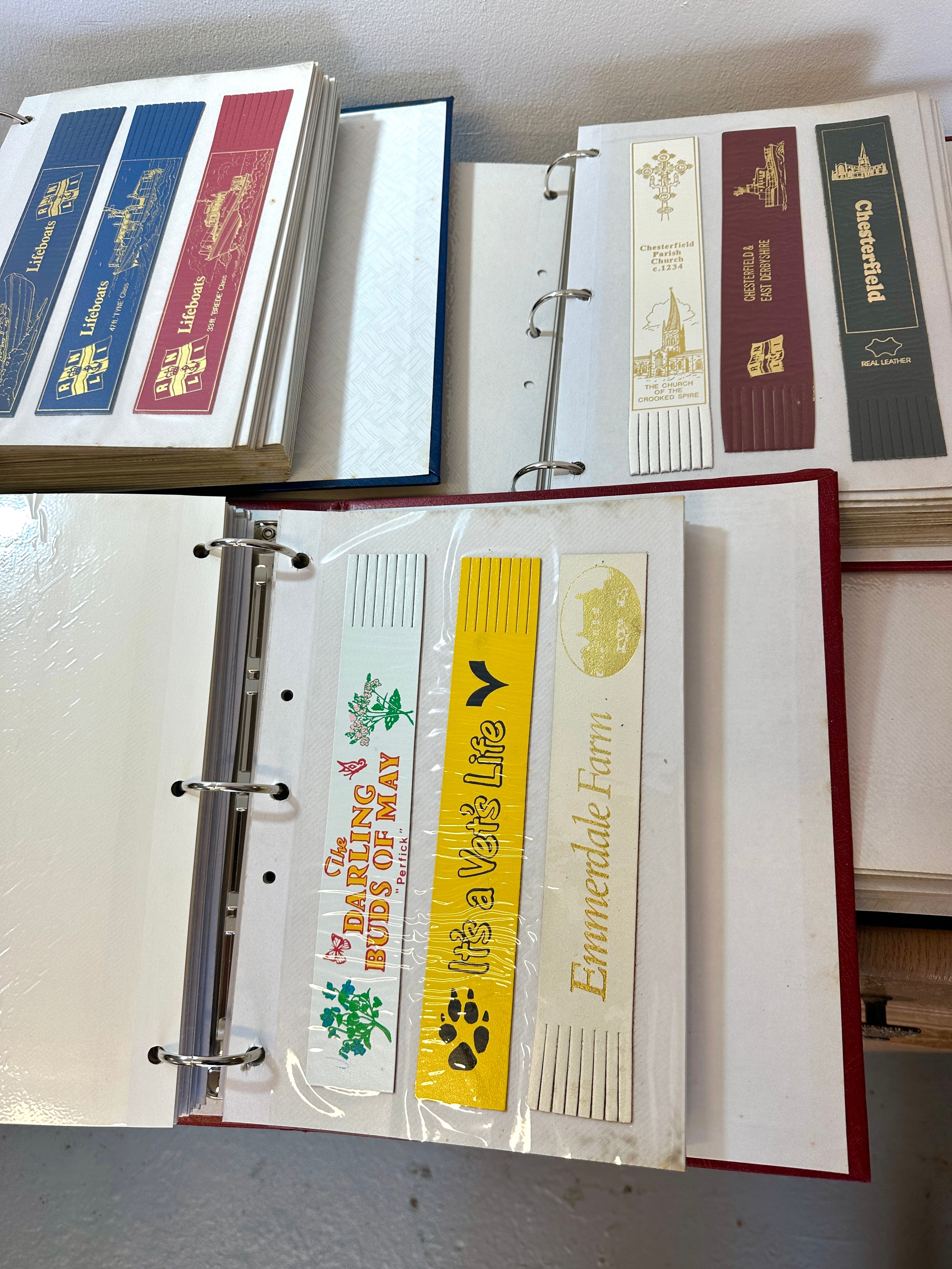 This lot comprises a substantial collection of souvenir and commemorative bookmarks housed in four ring-bound albums. The albums include two in red, one in blue, and one in black, all featuring gold-tooled borders and accents. Each binder is filled with clear plastic sleeves, meticulously organizing a comprehensive array of bookmarks. These bookmarks are crafted from various materials, including paper, cardstock, and some explicitly labeled as “REAL LEATHER.” The collection predominantly features British themes, such as RNLI lifeboats, specific towns and landmarks including Chesterfield, the Iron Bridge, Kingsbury Water Mill Museum, and Kelham Island Industrial Museum Sheffield. Additionally, there are bookmarks related to popular British television series, including *Emmerdale*, *Heartbeat*, and *Last of the Summer Wine*. The assemblage suggests a modern to late 20th or early 21st-century origin.