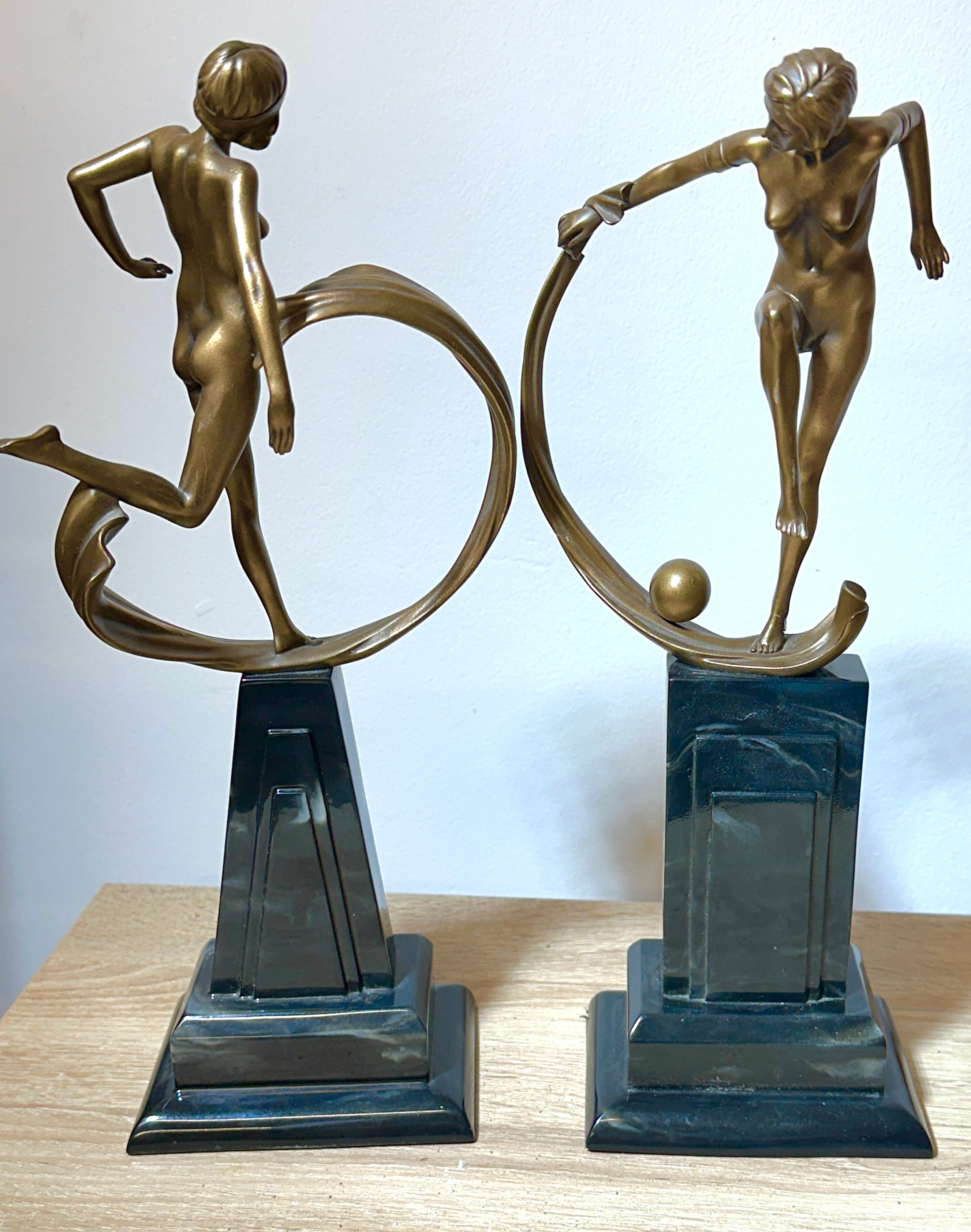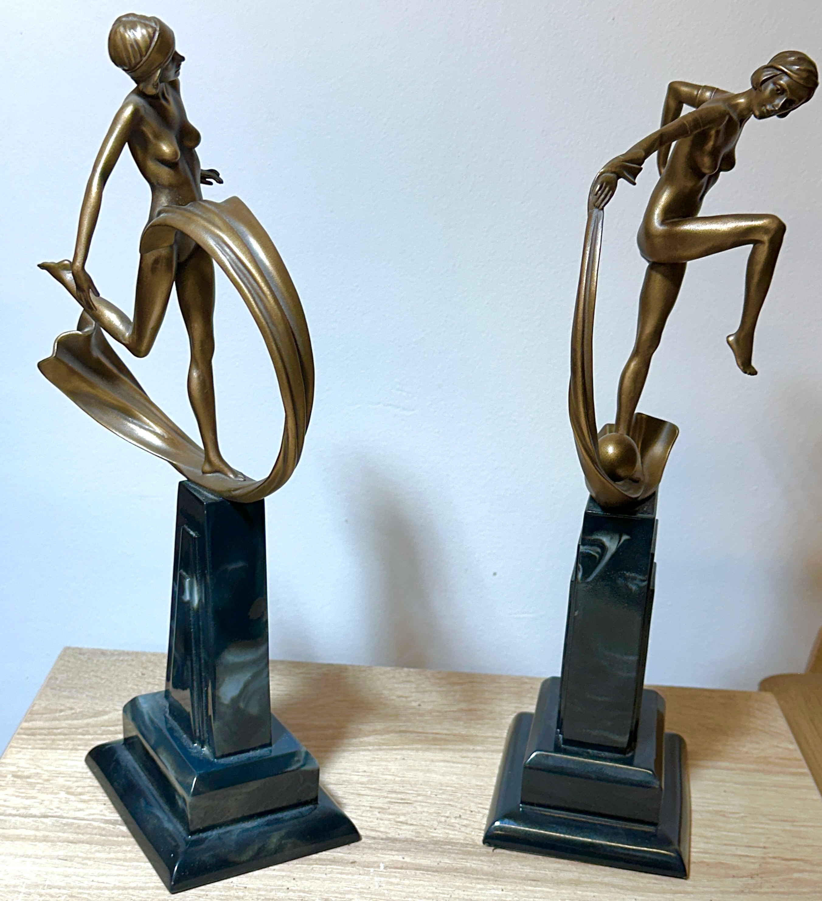 A Pair of Coalport Art Deco Style figures, ‘Dance at Dawn’ and ‘Ring of Hope’, designed by Carl Payne. Each depicts a stylized, nude female figure in a dynamic pose, rendered in patinated metal, likely bronze or spelter with a bronze finish, exhibiting a warm brown patina. Each figure gracefully interacts with an arching element, possibly representing draped fabric. The ‘Ring of Hope’ figure also engages with a spherical object. Both statuettes are mounted on multi-tiered, geometric plinths crafted from dark, variegated marble or alabaster.